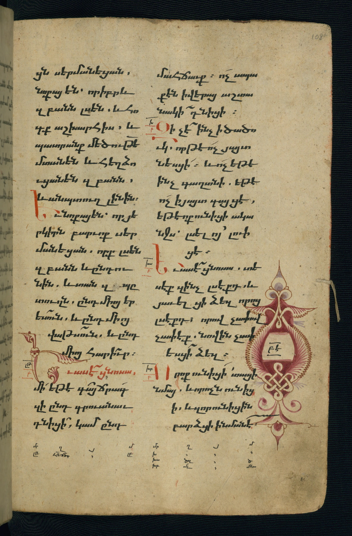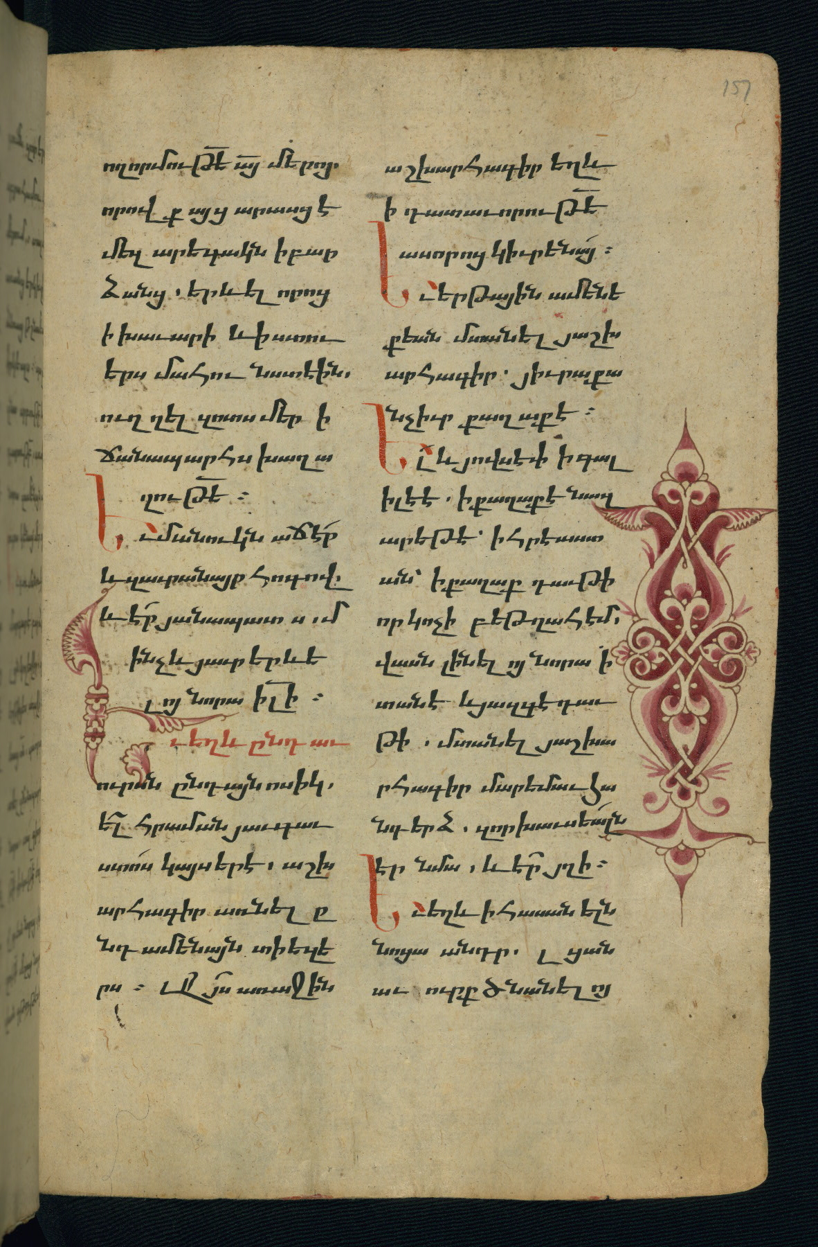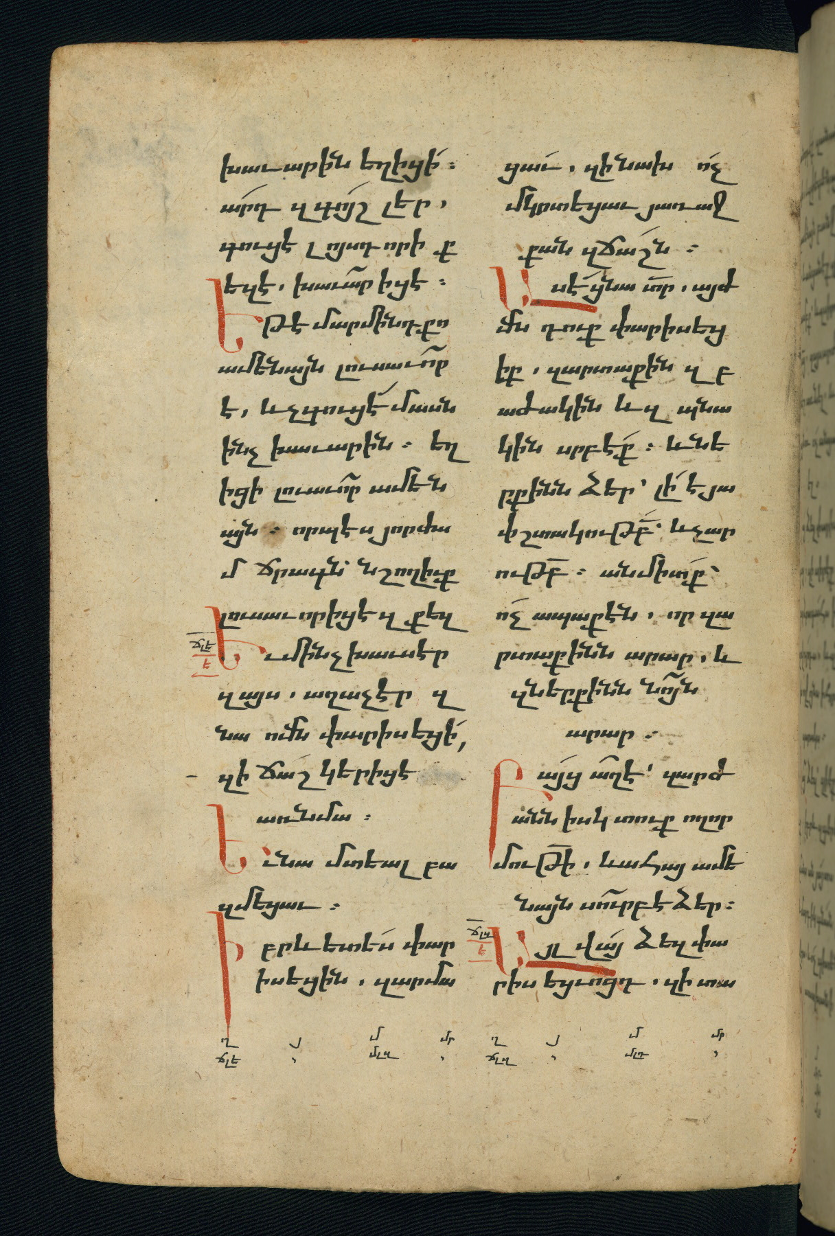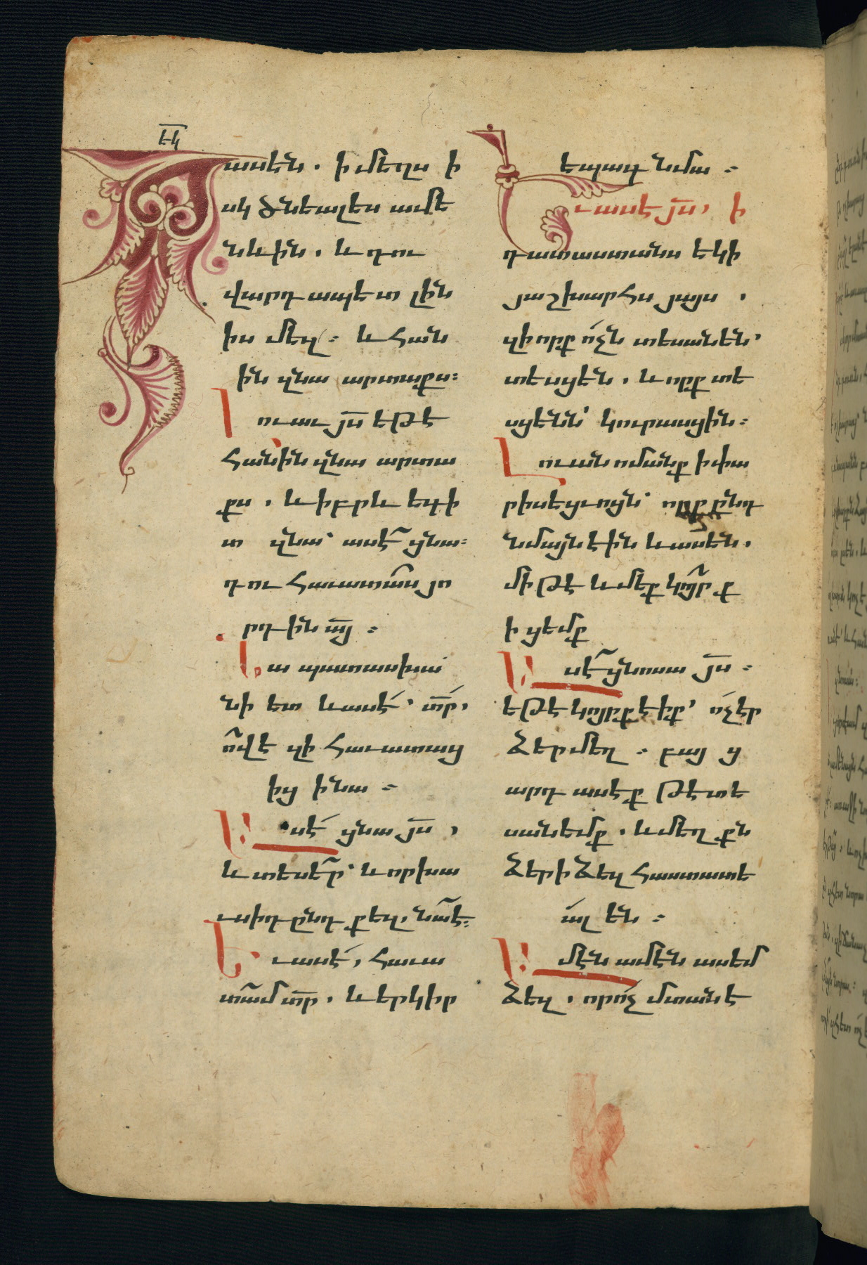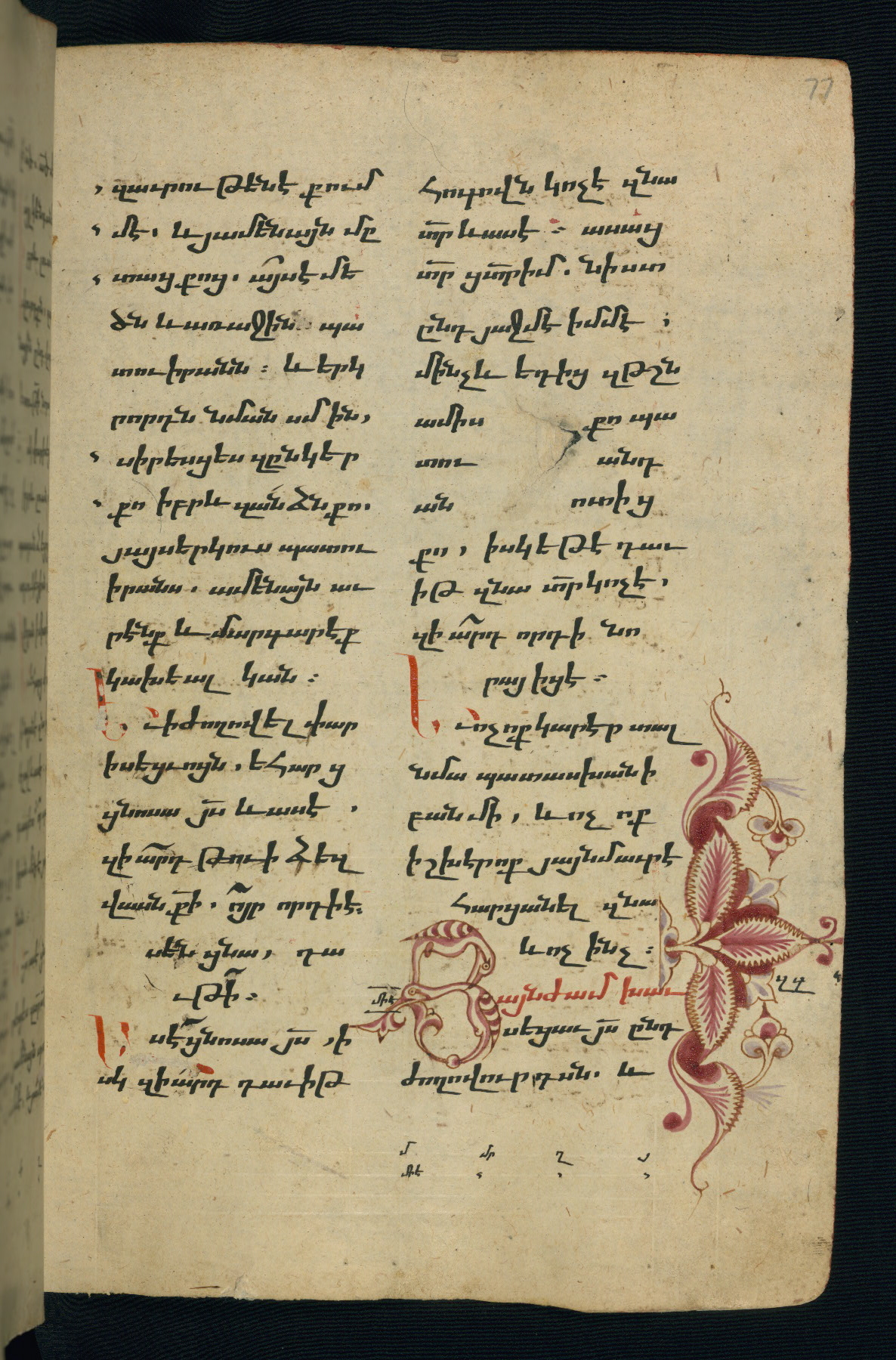 This Armenian Gospel book was produced in 904 of the Armenian era (1455 CE) at the monastery of Gamałiēl in Xizan by the scribe Yohannēs Vardapet, son of Vardan and Dilšat, and was illuminated by the priest Xačʿatur. The priest Pʿilipos commissioned the manuscript as a memorial to himself, his parents Łazar and Xutʿlumēlikʿ, and other relatives listed in the colophon on fols. 300r to 301v. Pʿilipos is depicted on fol. 14v alongside his brothers Yusēpʿ and Sultanša, as they kneel before the Virgin and Child enthroned (Theotokos). The book contains twenty-six full-page polychrome miniatures, including four Evangelist portraits; ornately designed canon tables; four decorated incipit pages; numerous marginal miniatures of floral and faunal motifs; and nineteen marginal miniatures of biblical characters or allusions to biblical narratives.