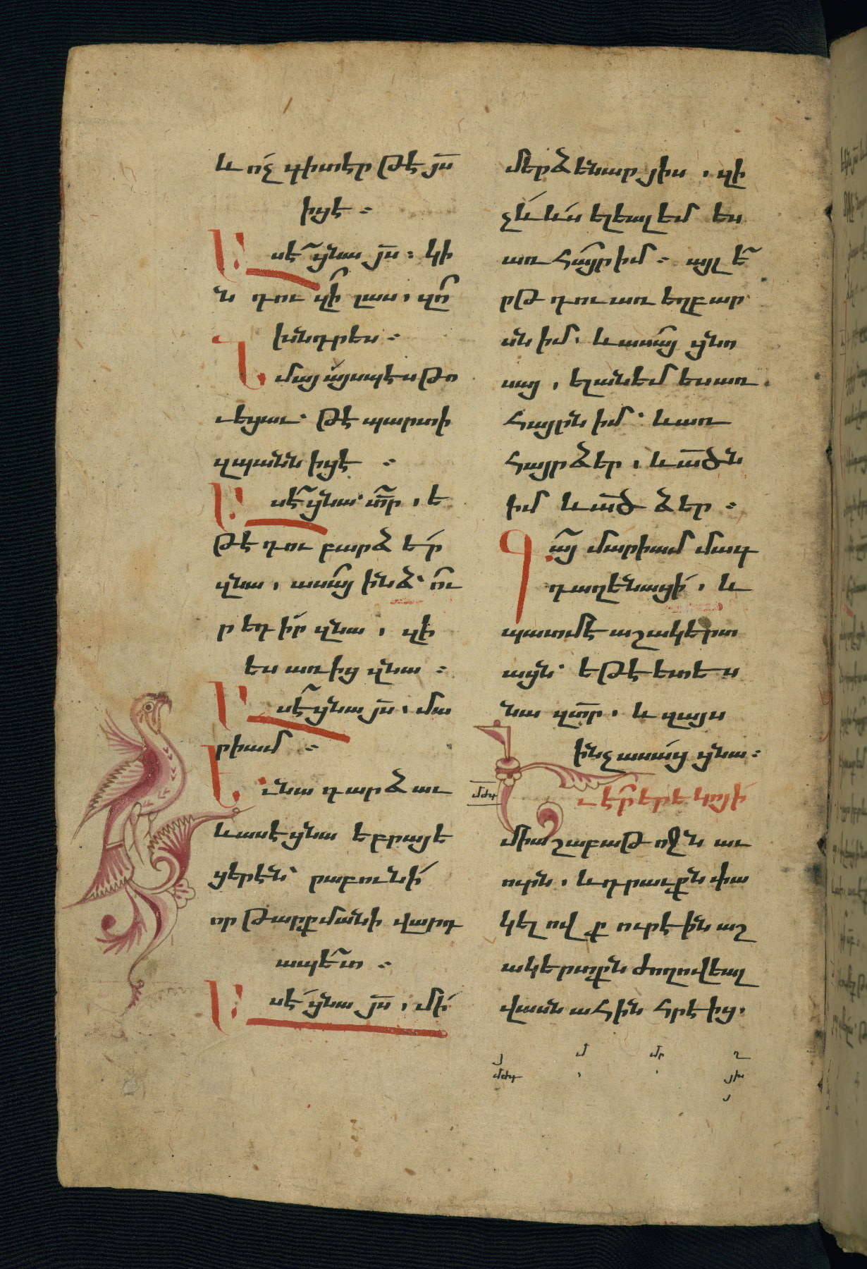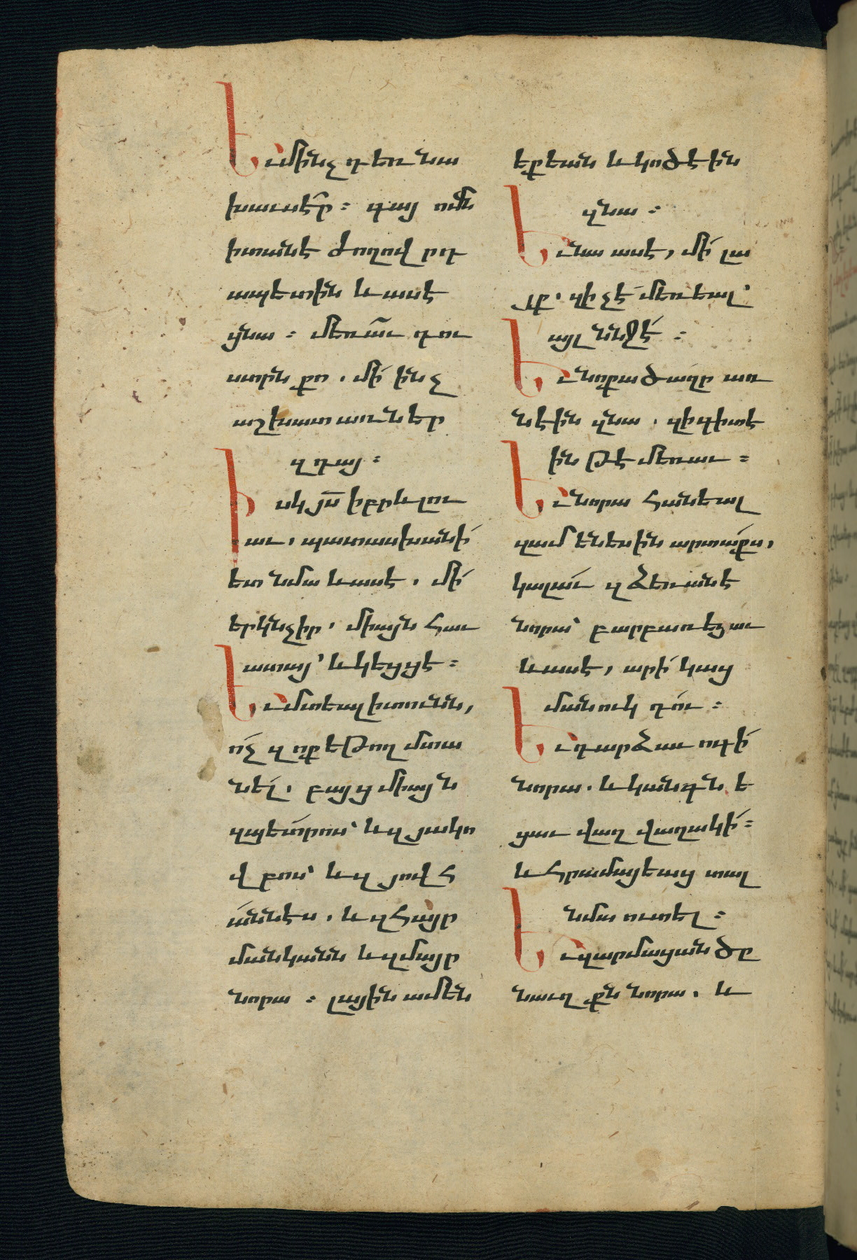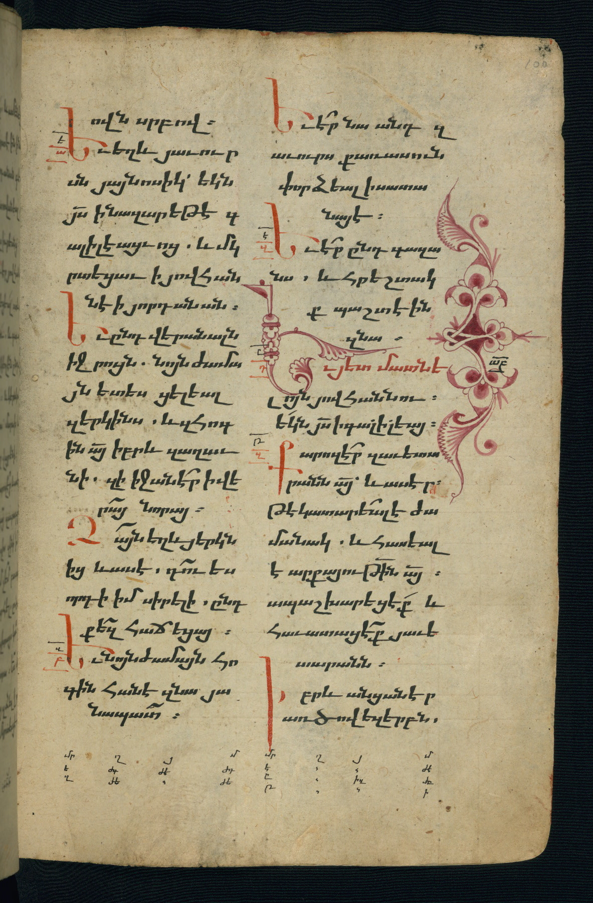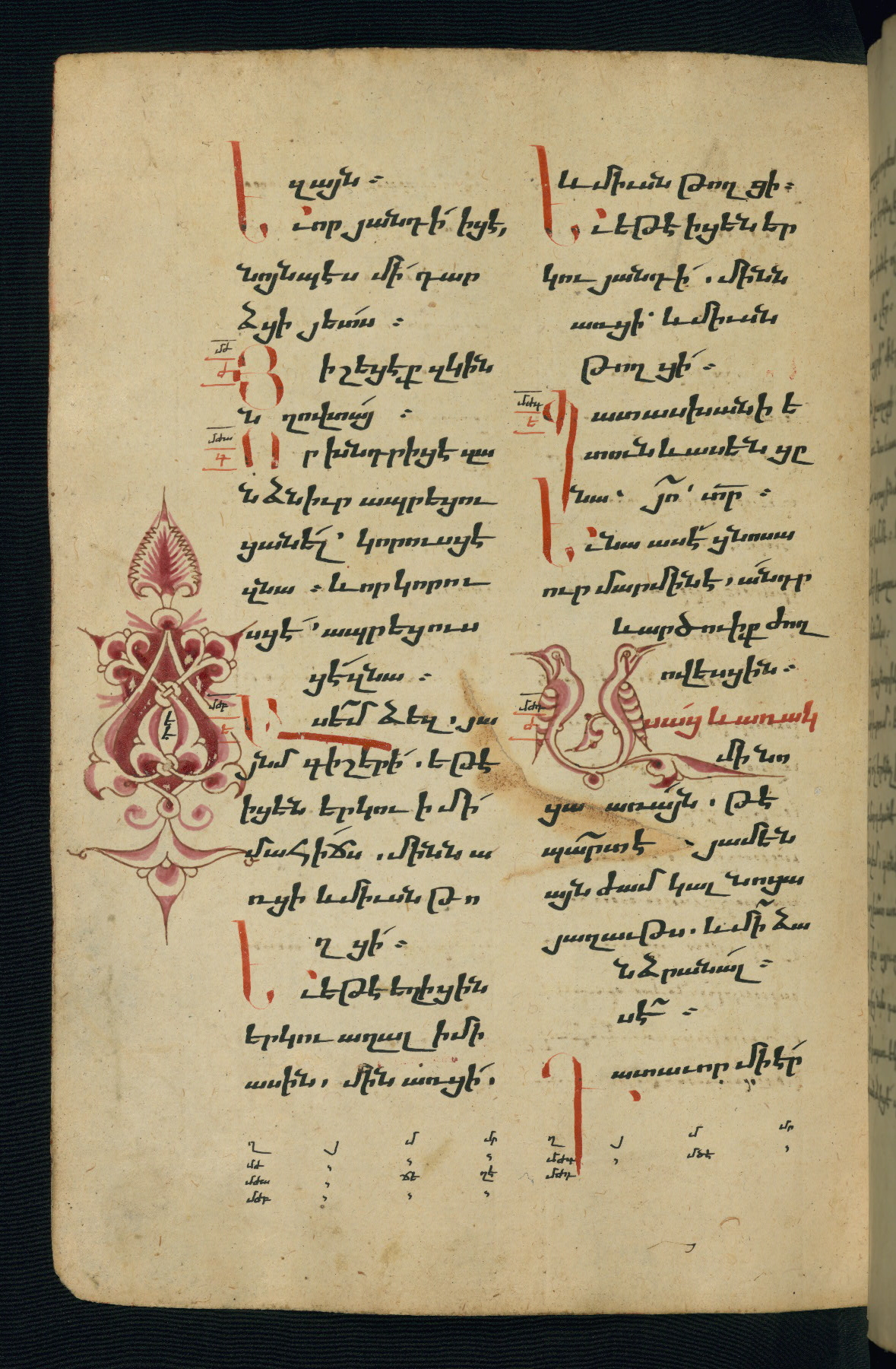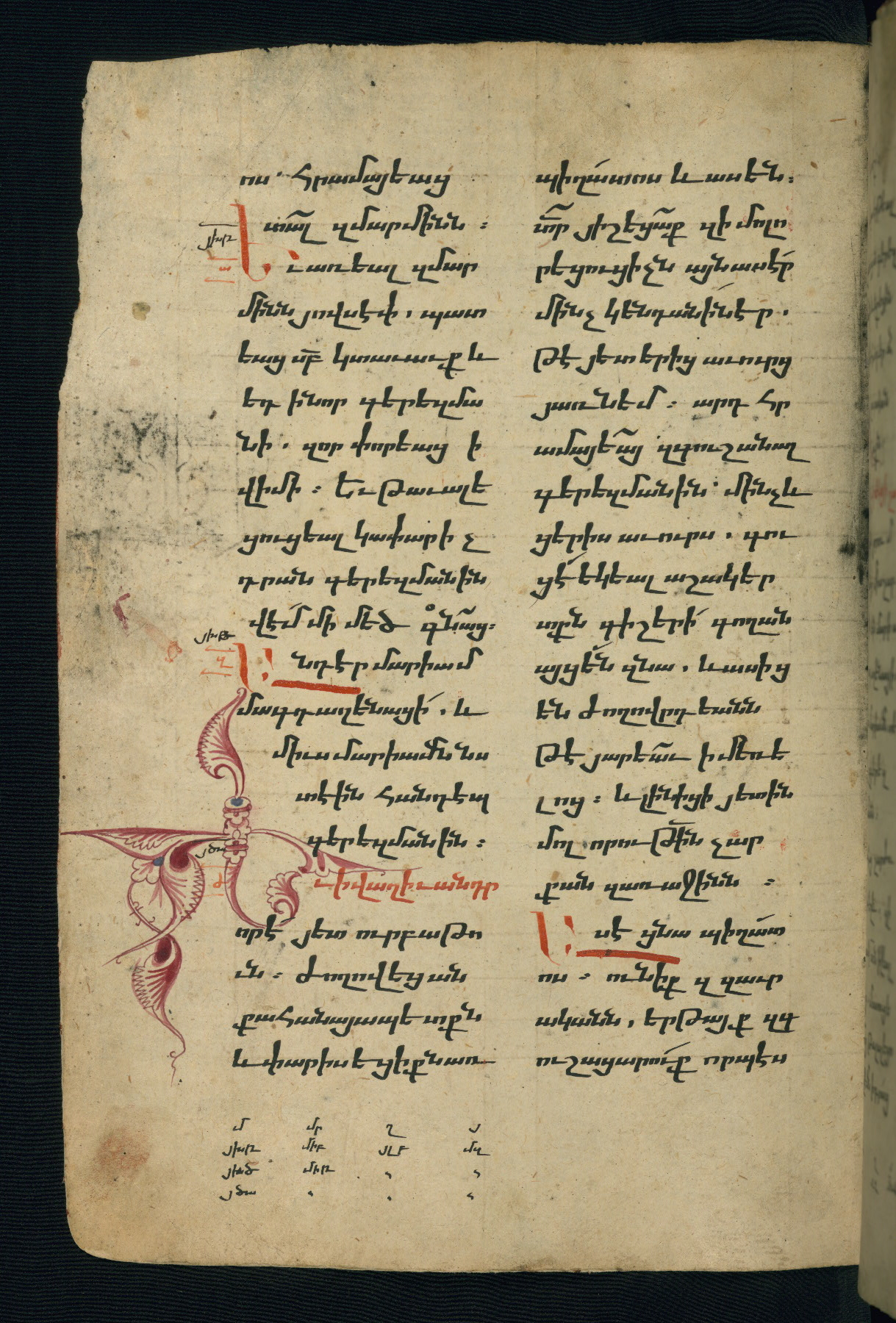 This Armenian Gospel book was produced in 904 of the Armenian era (1455 CE) at the monastery of Gamałiēl in Xizan by the scribe Yohannēs Vardapet, son of Vardan and Dilšat, and was illuminated by the priest Xačʿatur. The priest Pʿilipos commissioned the manuscript as a memorial to himself, his parents Łazar and Xutʿlumēlikʿ, and other relatives listed in the colophon on fols. 300r to 301v. Pʿilipos is depicted on fol. 14v alongside his brothers Yusēpʿ and Sultanša, as they kneel before the Virgin and Child enthroned (Theotokos). The book contains twenty-six full-page polychrome miniatures, including four Evangelist portraits; ornately designed canon tables; four decorated incipit pages; numerous marginal miniatures of floral and faunal motifs; and nineteen marginal miniatures of biblical characters or allusions to biblical narratives.