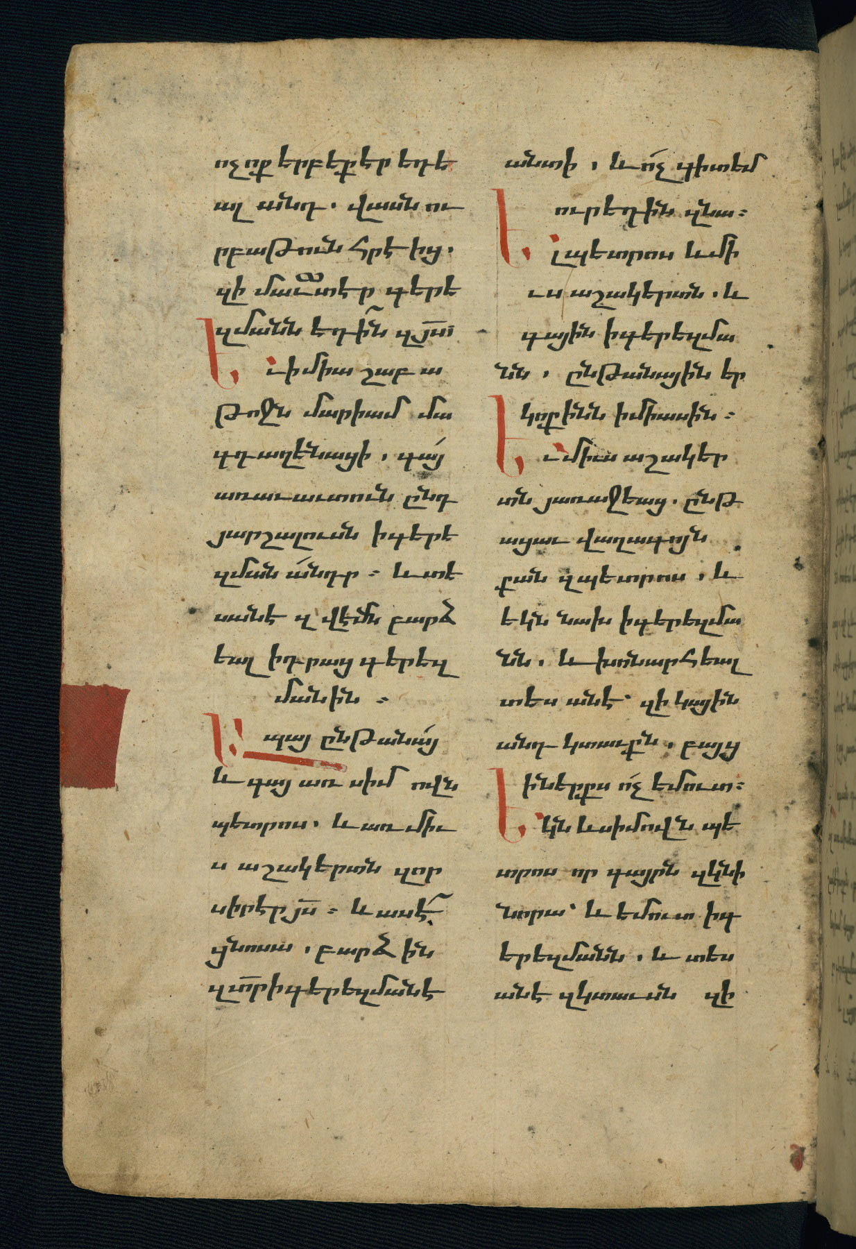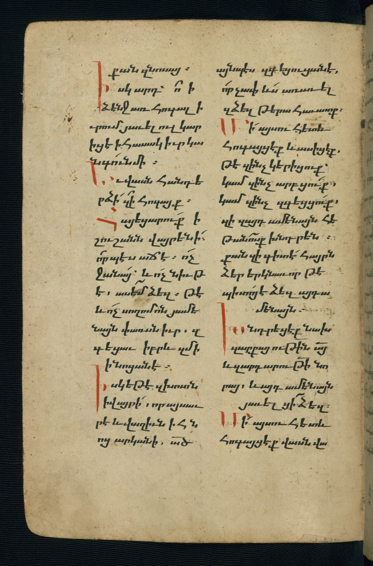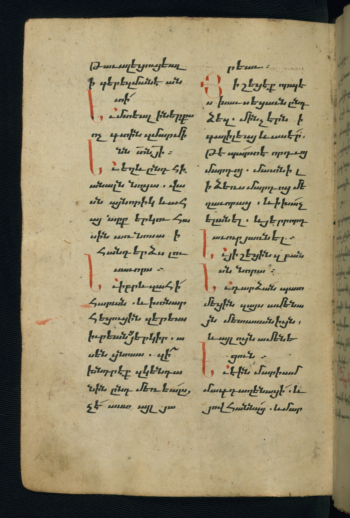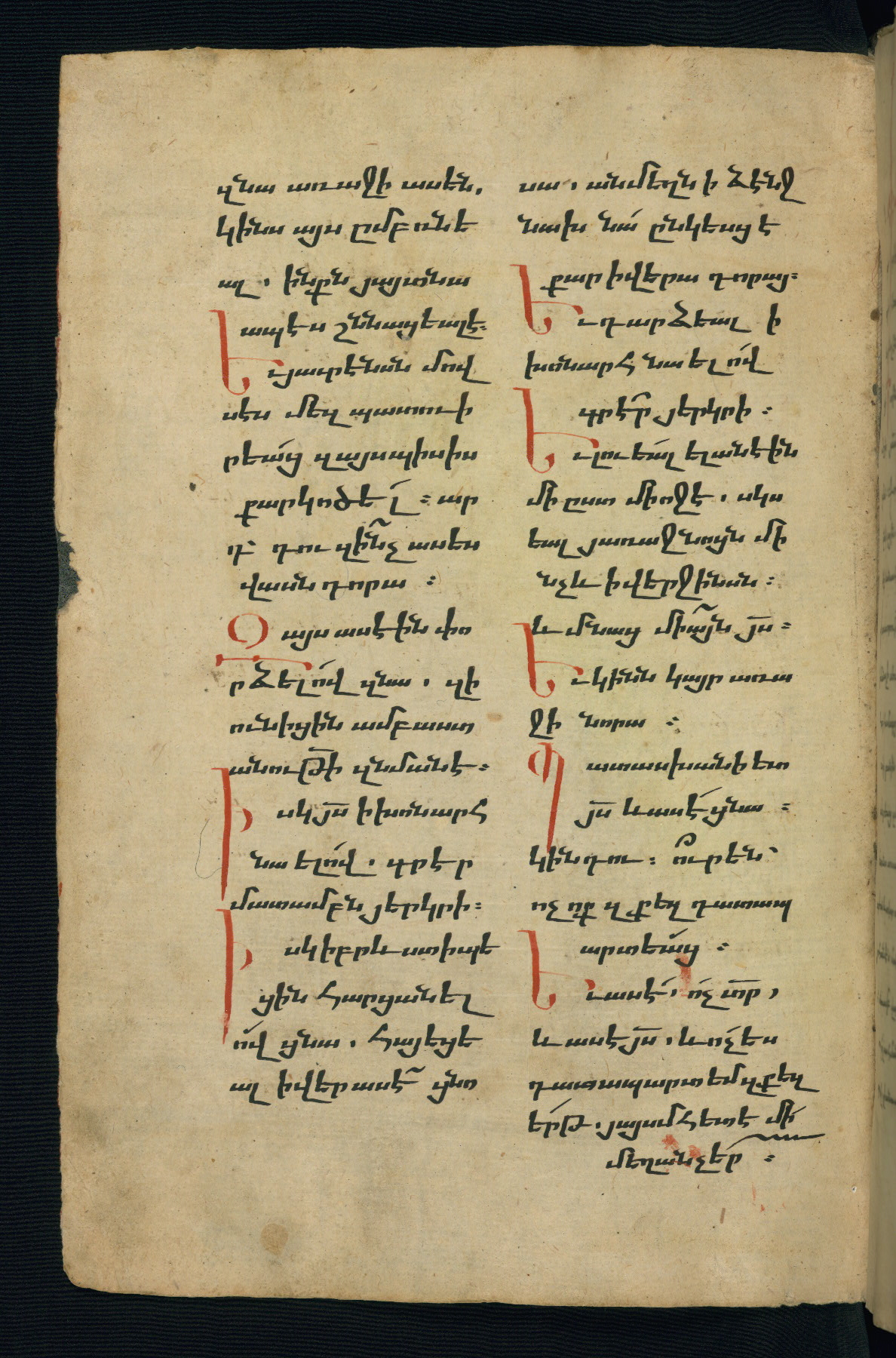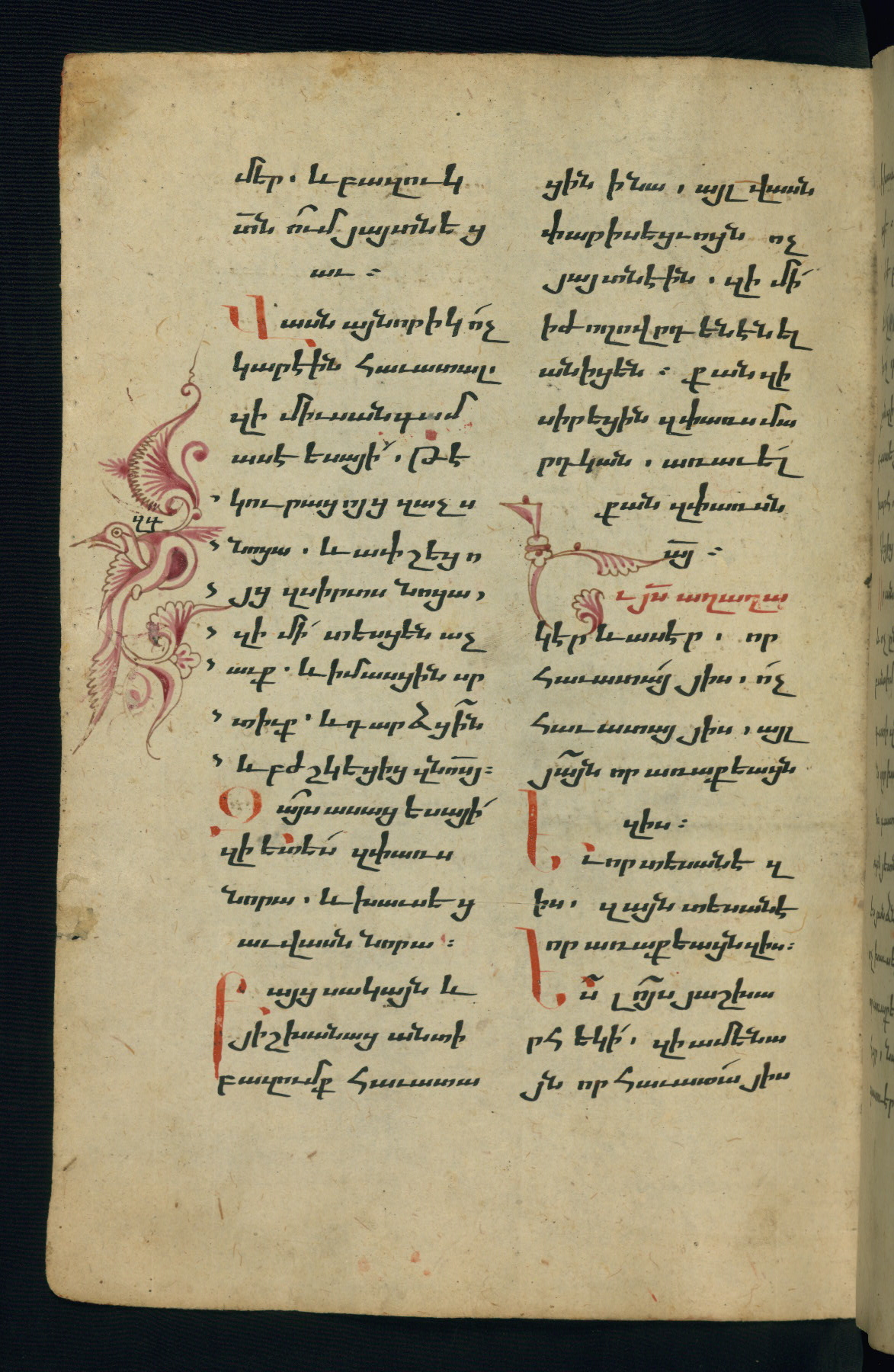 This Armenian Gospel book was produced in 904 of the Armenian era (1455 CE) at the monastery of Gamałiēl in Xizan by the scribe Yohannēs Vardapet, son of Vardan and Dilšat, and was illuminated by the priest Xačʿatur. The priest Pʿilipos commissioned the manuscript as a memorial to himself, his parents Łazar and Xutʿlumēlikʿ, and other relatives listed in the colophon on fols. 300r to 301v. Pʿilipos is depicted on fol. 14v alongside his brothers Yusēpʿ and Sultanša, as they kneel before the Virgin and Child enthroned (Theotokos). The book contains twenty-six full-page polychrome miniatures, including four Evangelist portraits; ornately designed canon tables; four decorated incipit pages; numerous marginal miniatures of floral and faunal motifs; and nineteen marginal miniatures of biblical characters or allusions to biblical narratives.