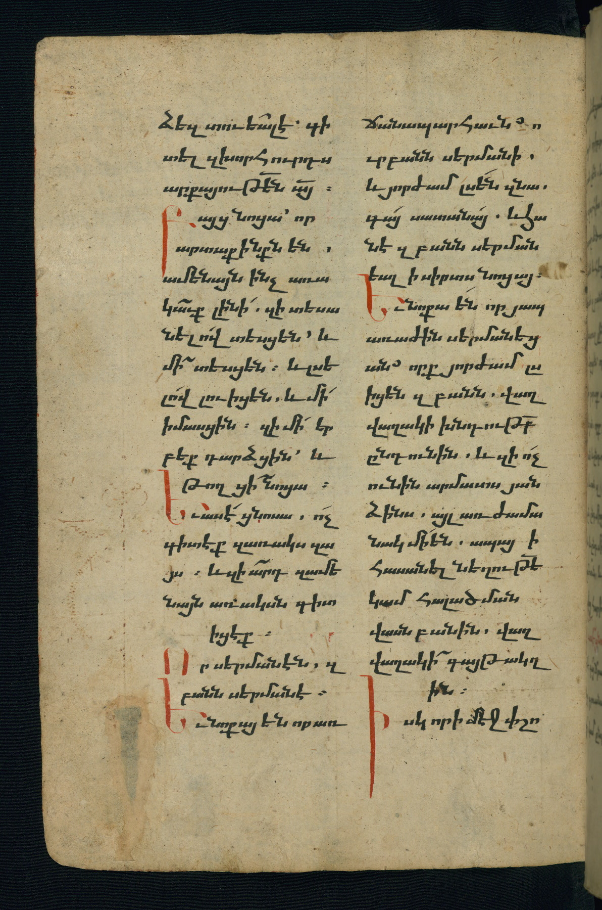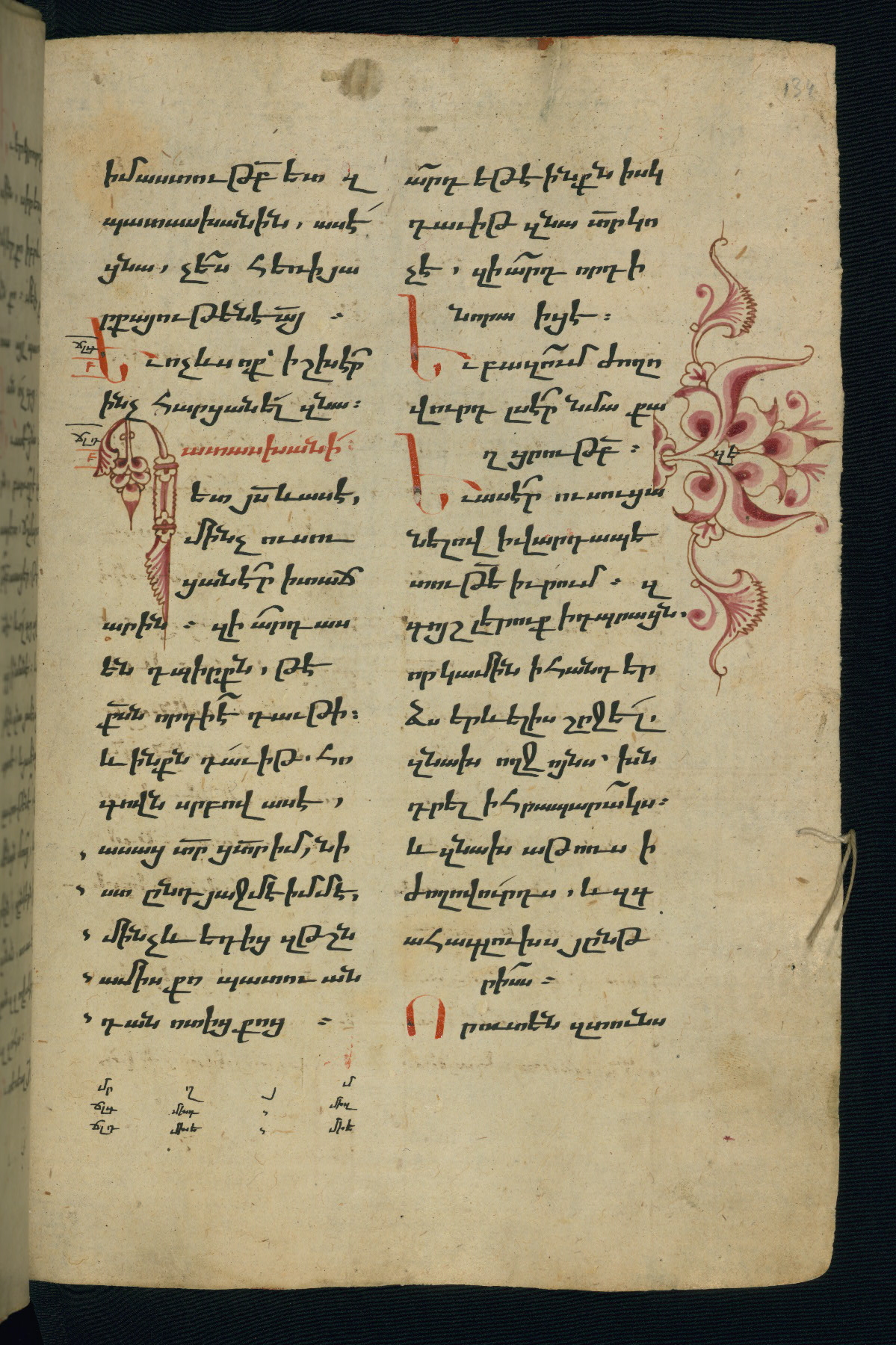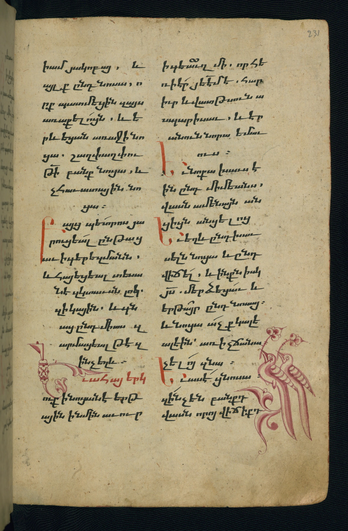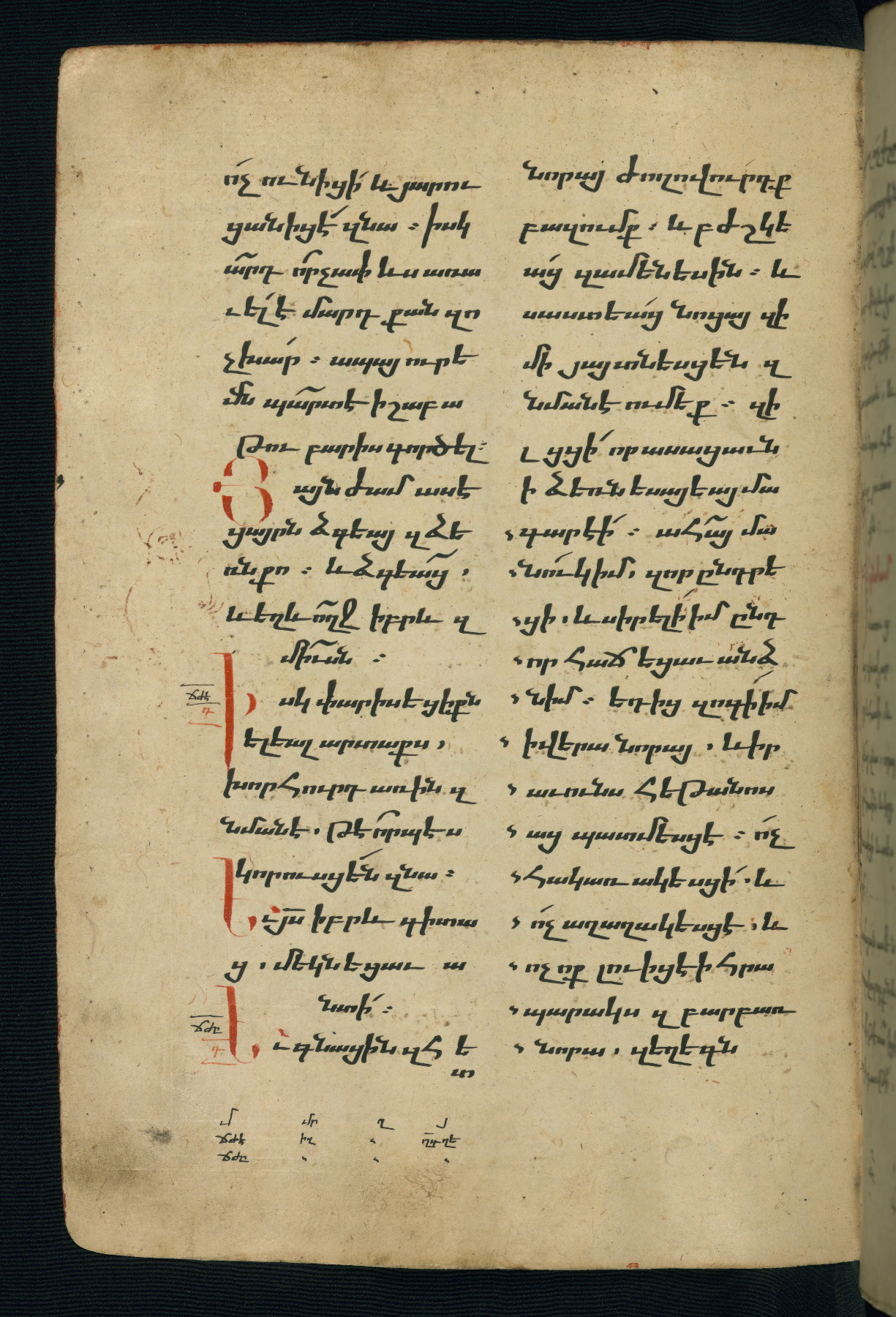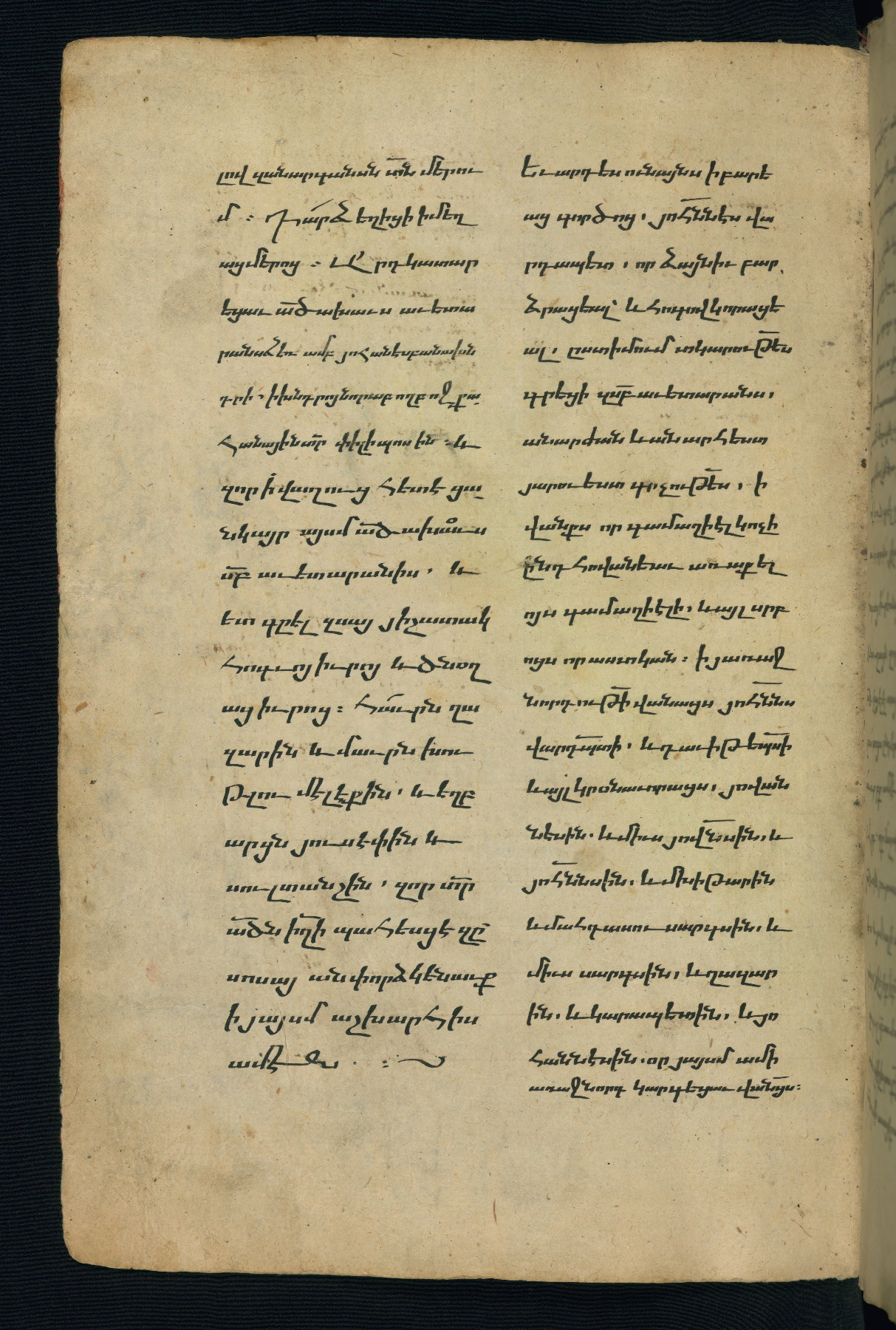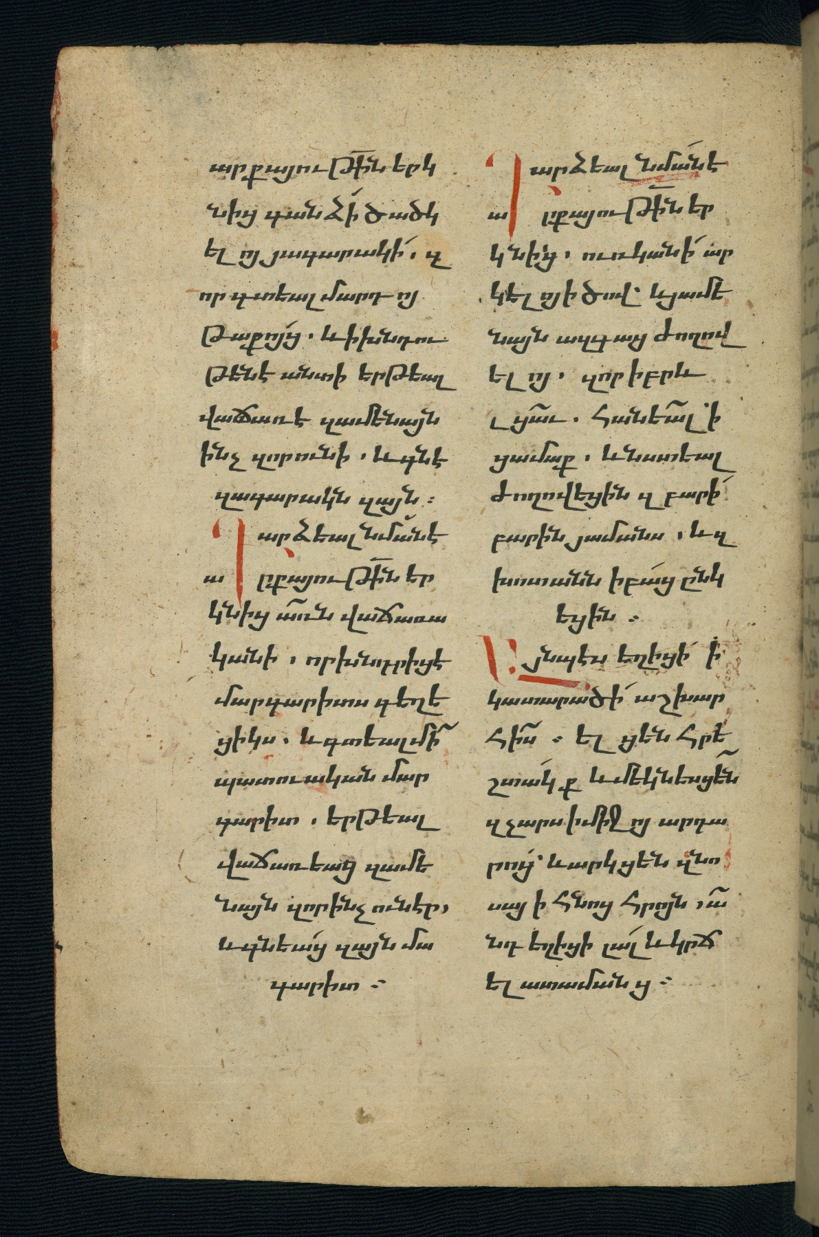 This Armenian Gospel book was produced in 904 of the Armenian era (1455 CE) at the monastery of Gamałiēl in Xizan by the scribe Yohannēs Vardapet, son of Vardan and Dilšat, and was illuminated by the priest Xačʿatur. The priest Pʿilipos commissioned the manuscript as a memorial to himself, his parents Łazar and Xutʿlumēlikʿ, and other relatives listed in the colophon on fols. 300r to 301v. Pʿilipos is depicted on fol. 14v alongside his brothers Yusēpʿ and Sultanša, as they kneel before the Virgin and Child enthroned (Theotokos). The book contains twenty-six full-page polychrome miniatures, including four Evangelist portraits; ornately designed canon tables; four decorated incipit pages; numerous marginal miniatures of floral and faunal motifs; and nineteen marginal miniatures of biblical characters or allusions to biblical narratives.