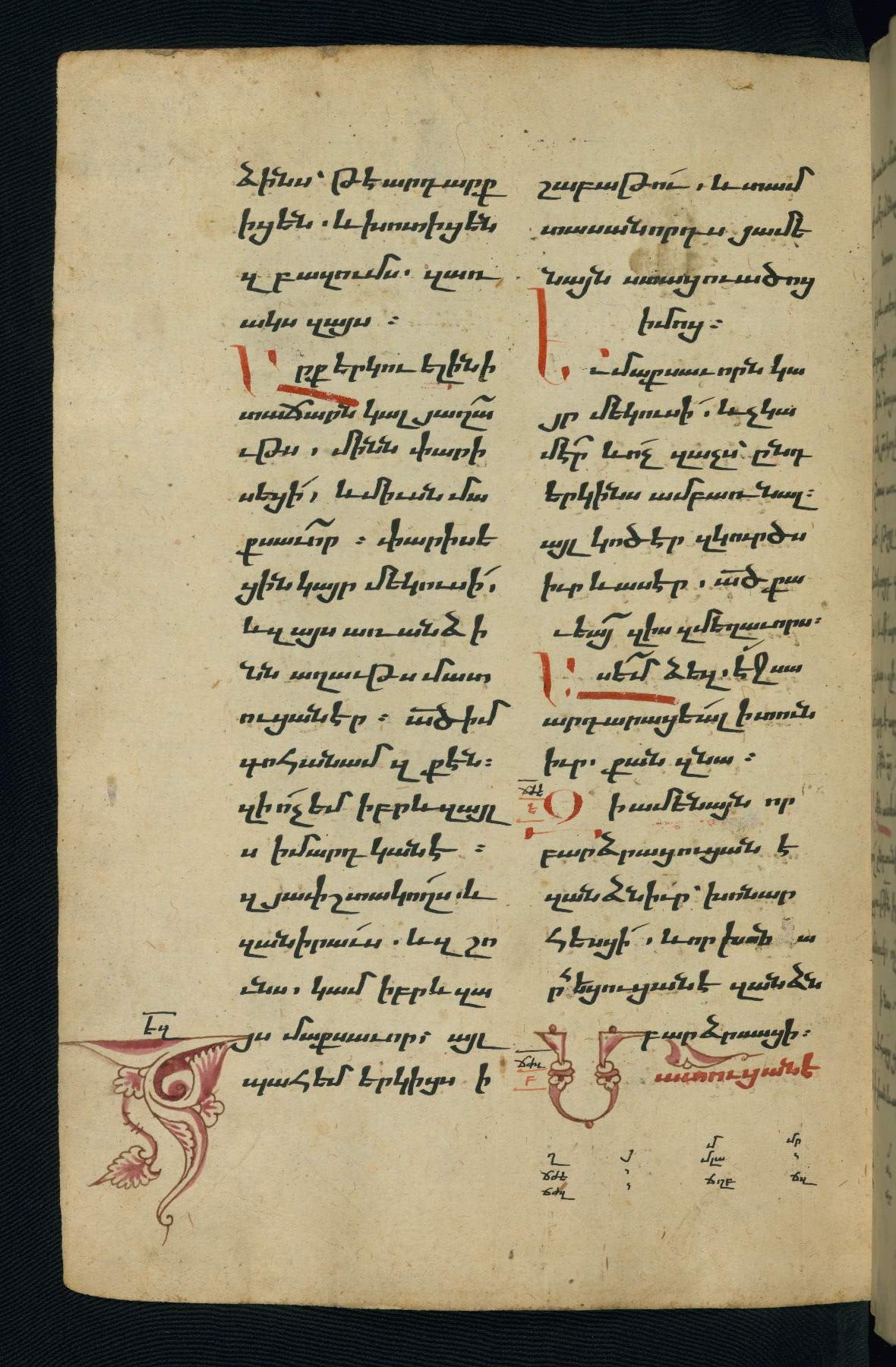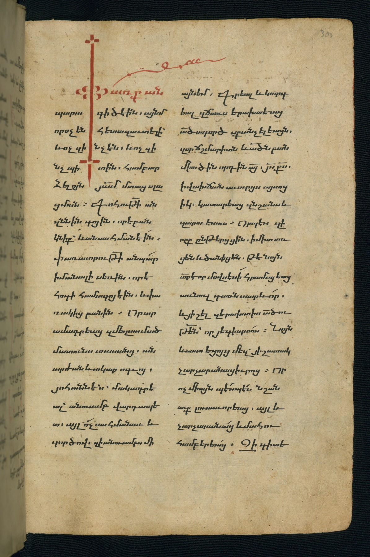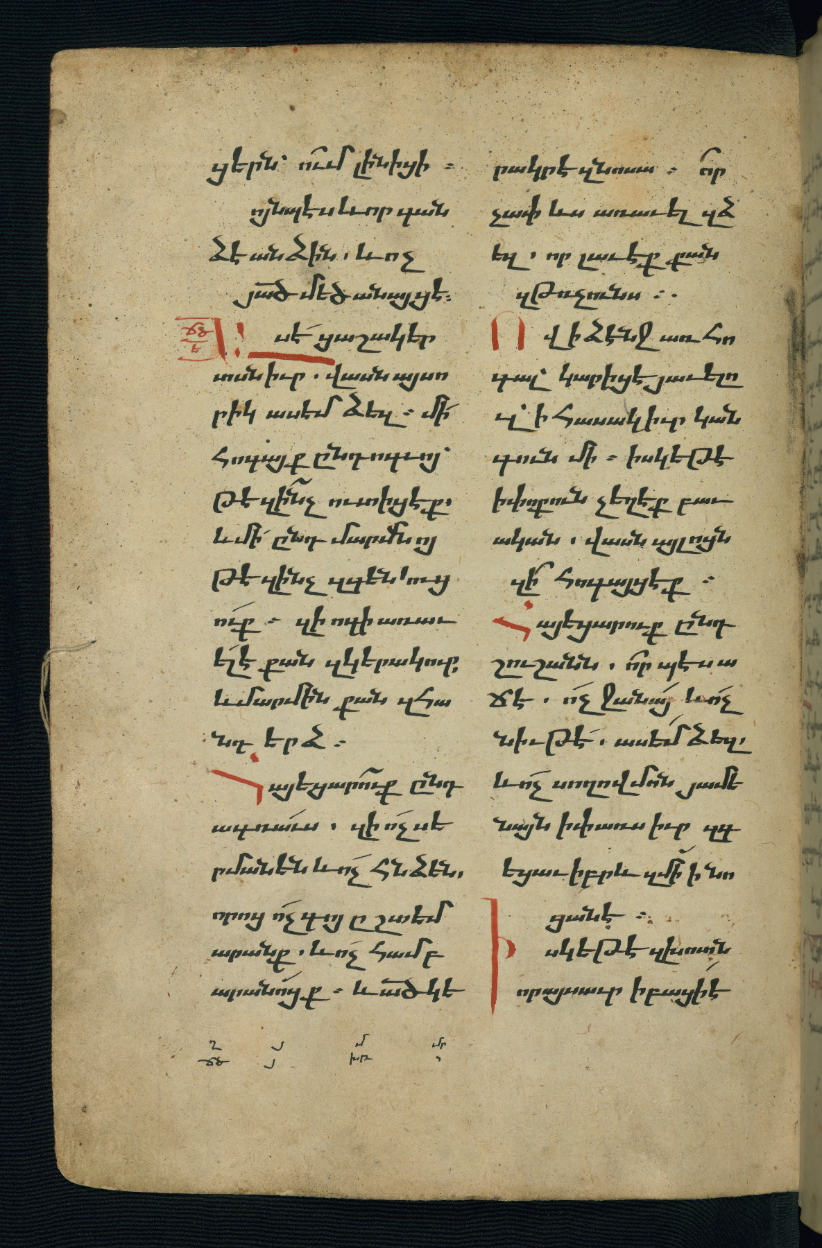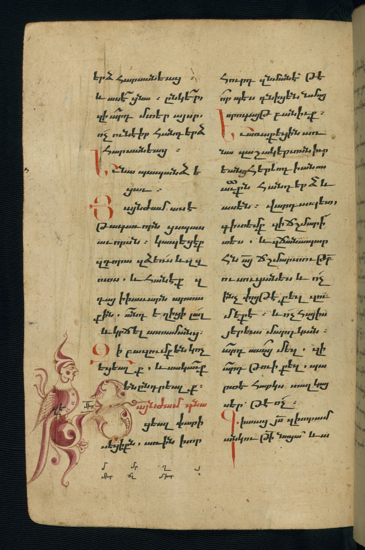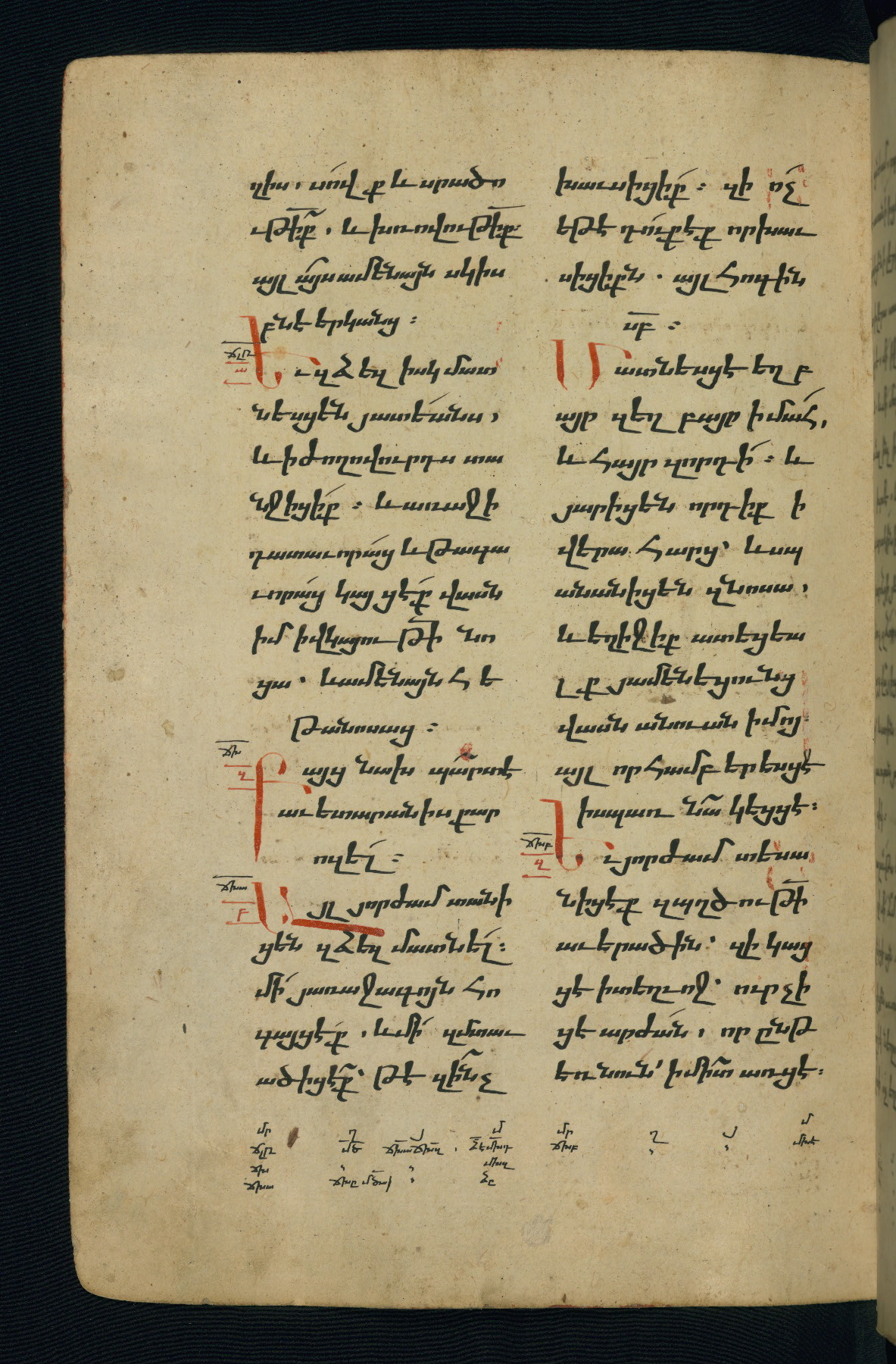 This Armenian Gospel book was produced in 904 of the Armenian era (1455 CE) at the monastery of Gamałiēl in Xizan by the scribe Yohannēs Vardapet, son of Vardan and Dilšat, and was illuminated by the priest Xačʿatur. The priest Pʿilipos commissioned the manuscript as a memorial to himself, his parents Łazar and Xutʿlumēlikʿ, and other relatives listed in the colophon on fols. 300r to 301v. Pʿilipos is depicted on fol. 14v alongside his brothers Yusēpʿ and Sultanša, as they kneel before the Virgin and Child enthroned (Theotokos). The book contains twenty-six full-page polychrome miniatures, including four Evangelist portraits; ornately designed canon tables; four decorated incipit pages; numerous marginal miniatures of floral and faunal motifs; and nineteen marginal miniatures of biblical characters or allusions to biblical narratives.