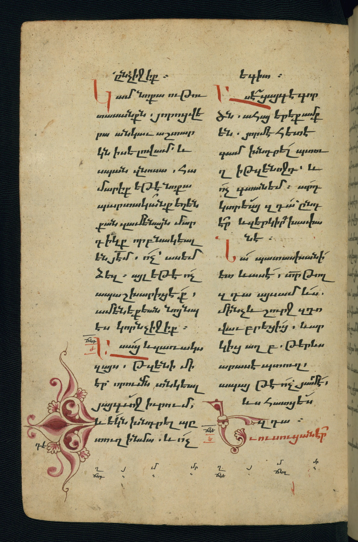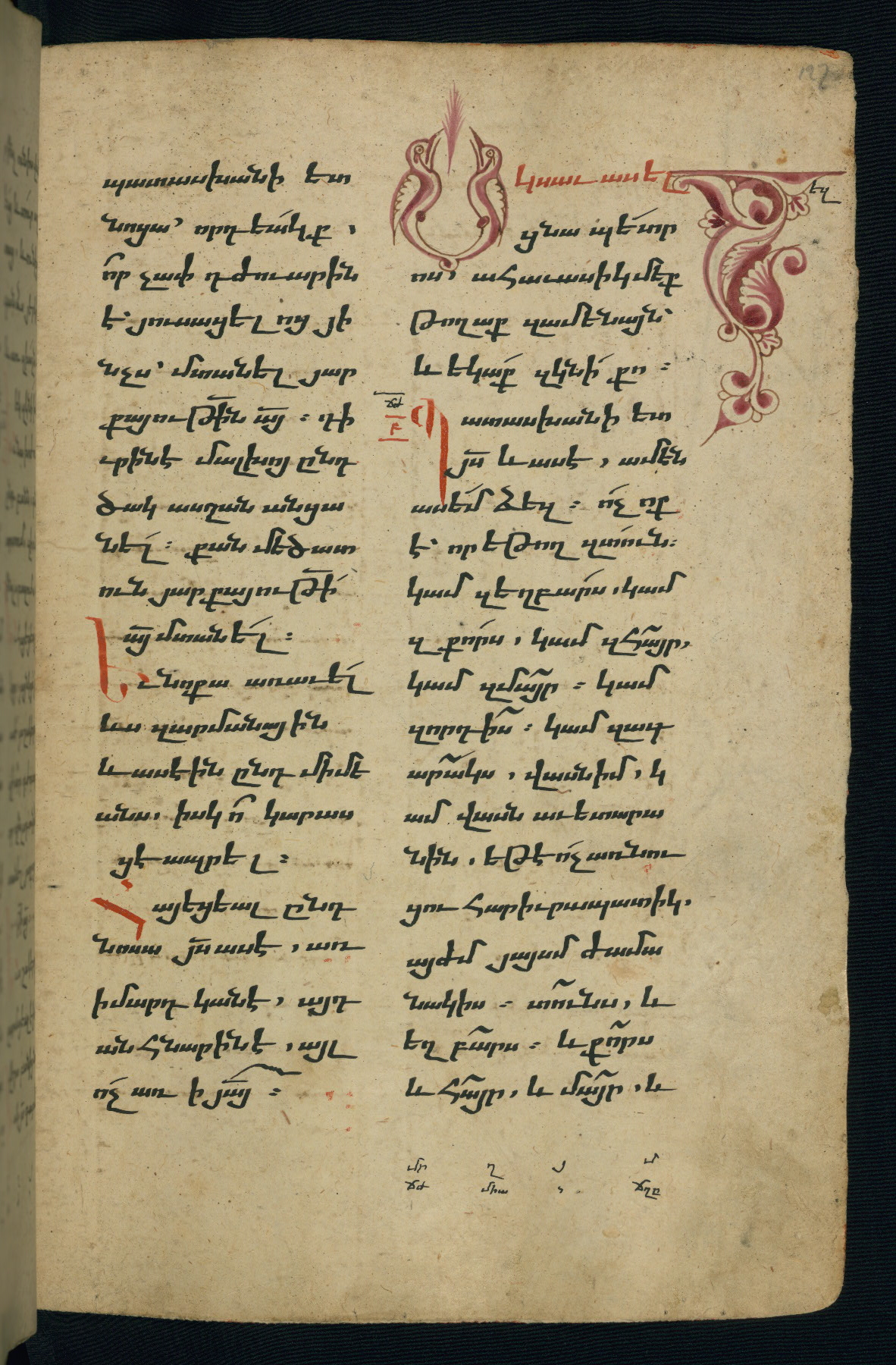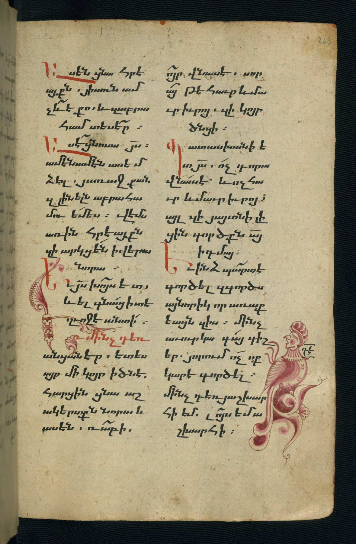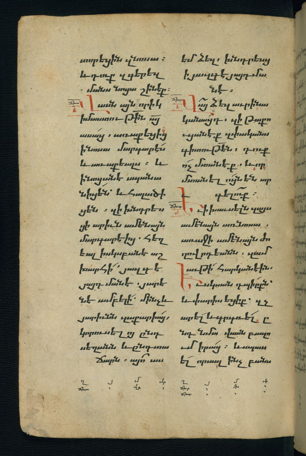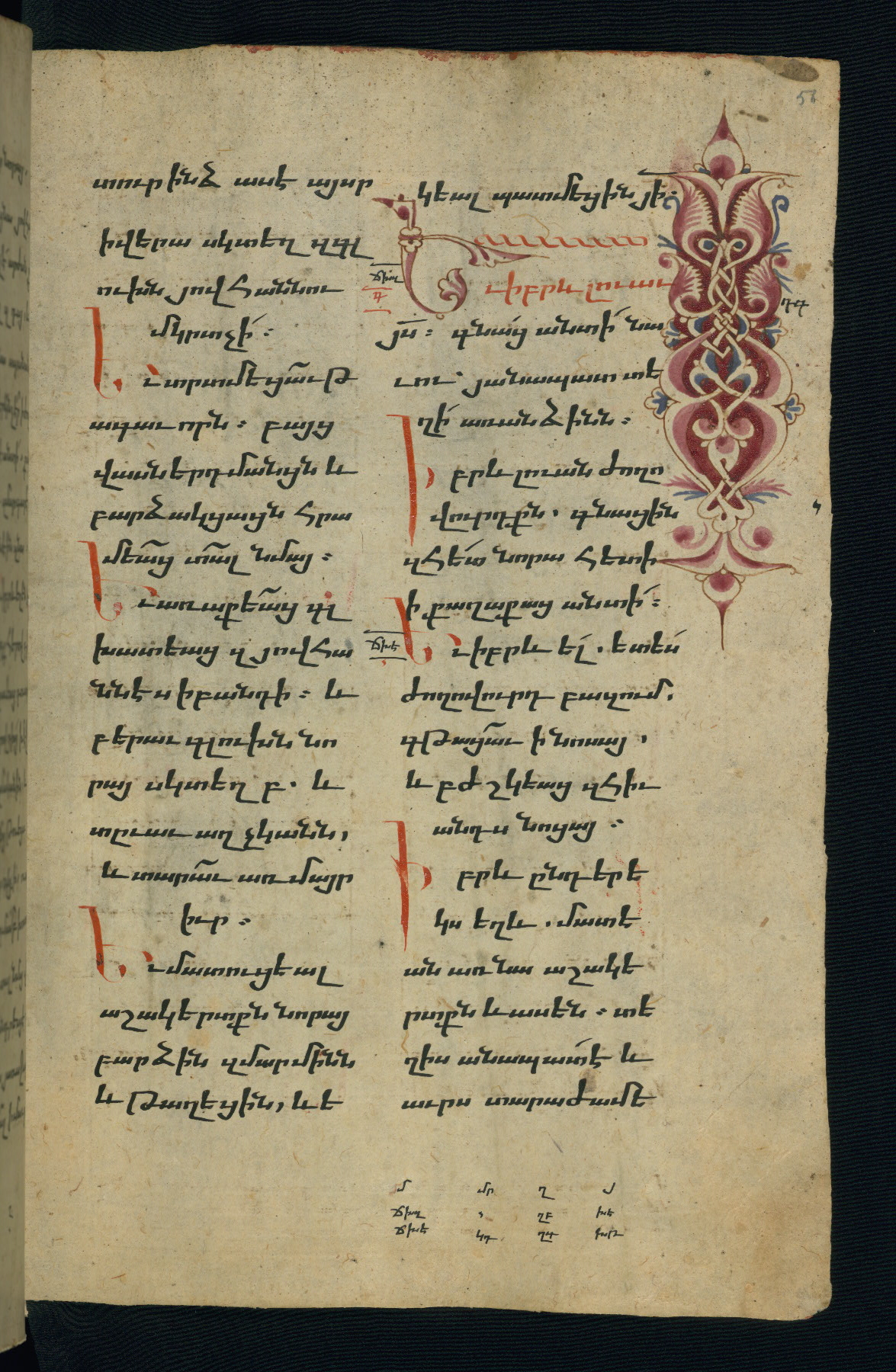 This Armenian Gospel book was produced in 904 of the Armenian era (1455 CE) at the monastery of Gamałiēl in Xizan by the scribe Yohannēs Vardapet, son of Vardan and Dilšat, and was illuminated by the priest Xačʿatur. The priest Pʿilipos commissioned the manuscript as a memorial to himself, his parents Łazar and Xutʿlumēlikʿ, and other relatives listed in the colophon on fols. 300r to 301v. Pʿilipos is depicted on fol. 14v alongside his brothers Yusēpʿ and Sultanša, as they kneel before the Virgin and Child enthroned (Theotokos). The book contains twenty-six full-page polychrome miniatures, including four Evangelist portraits; ornately designed canon tables; four decorated incipit pages; numerous marginal miniatures of floral and faunal motifs; and nineteen marginal miniatures of biblical characters or allusions to biblical narratives.