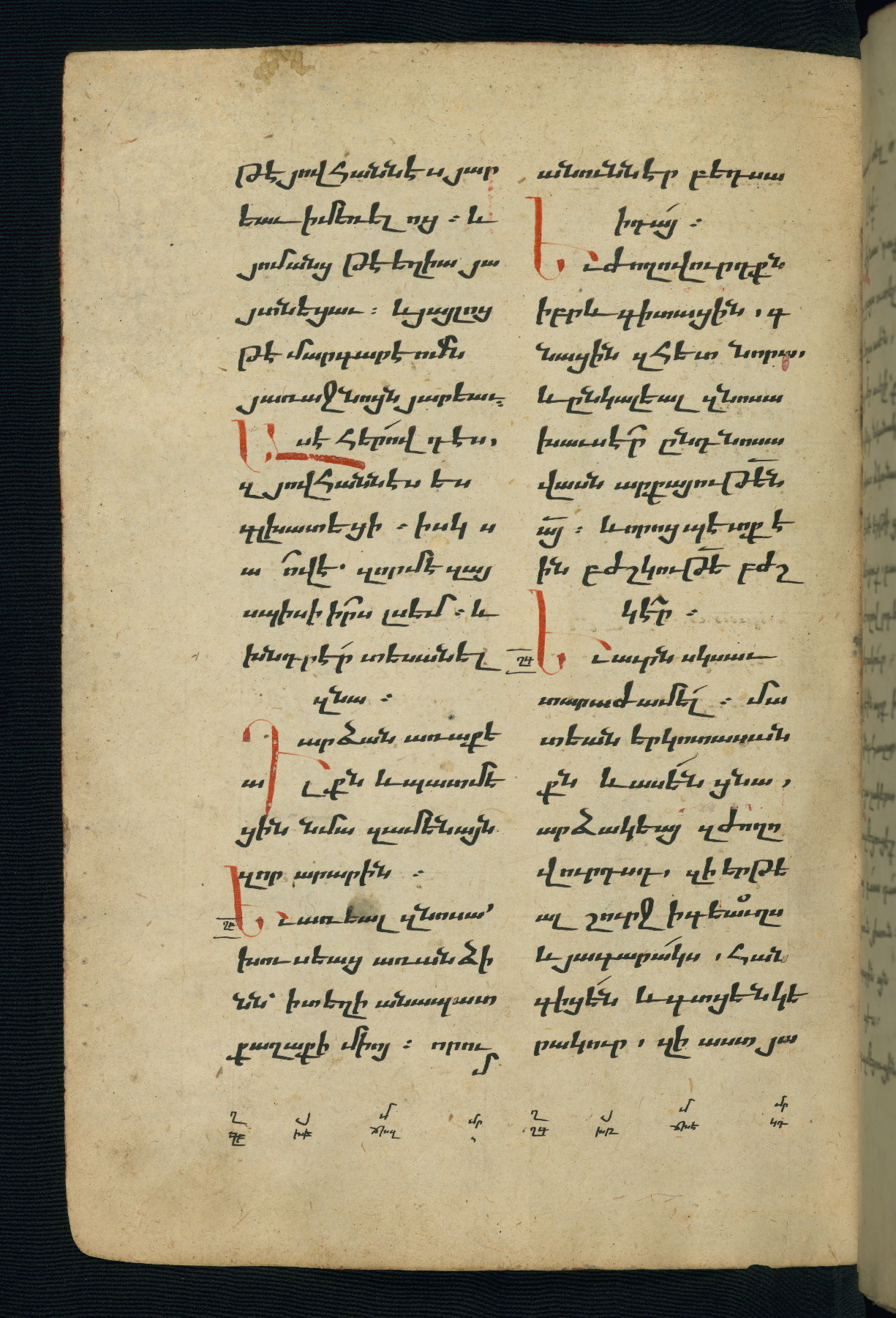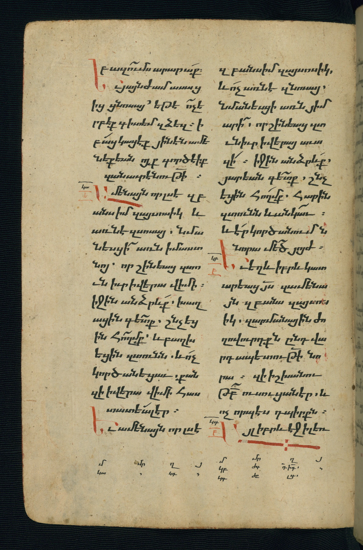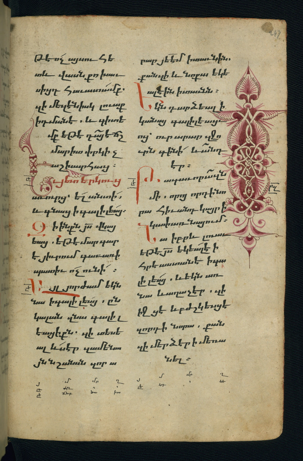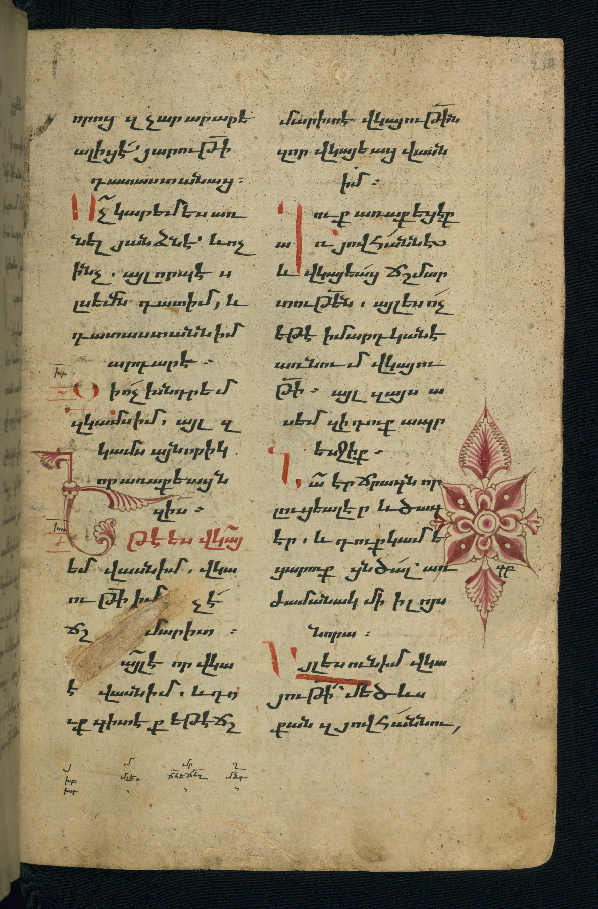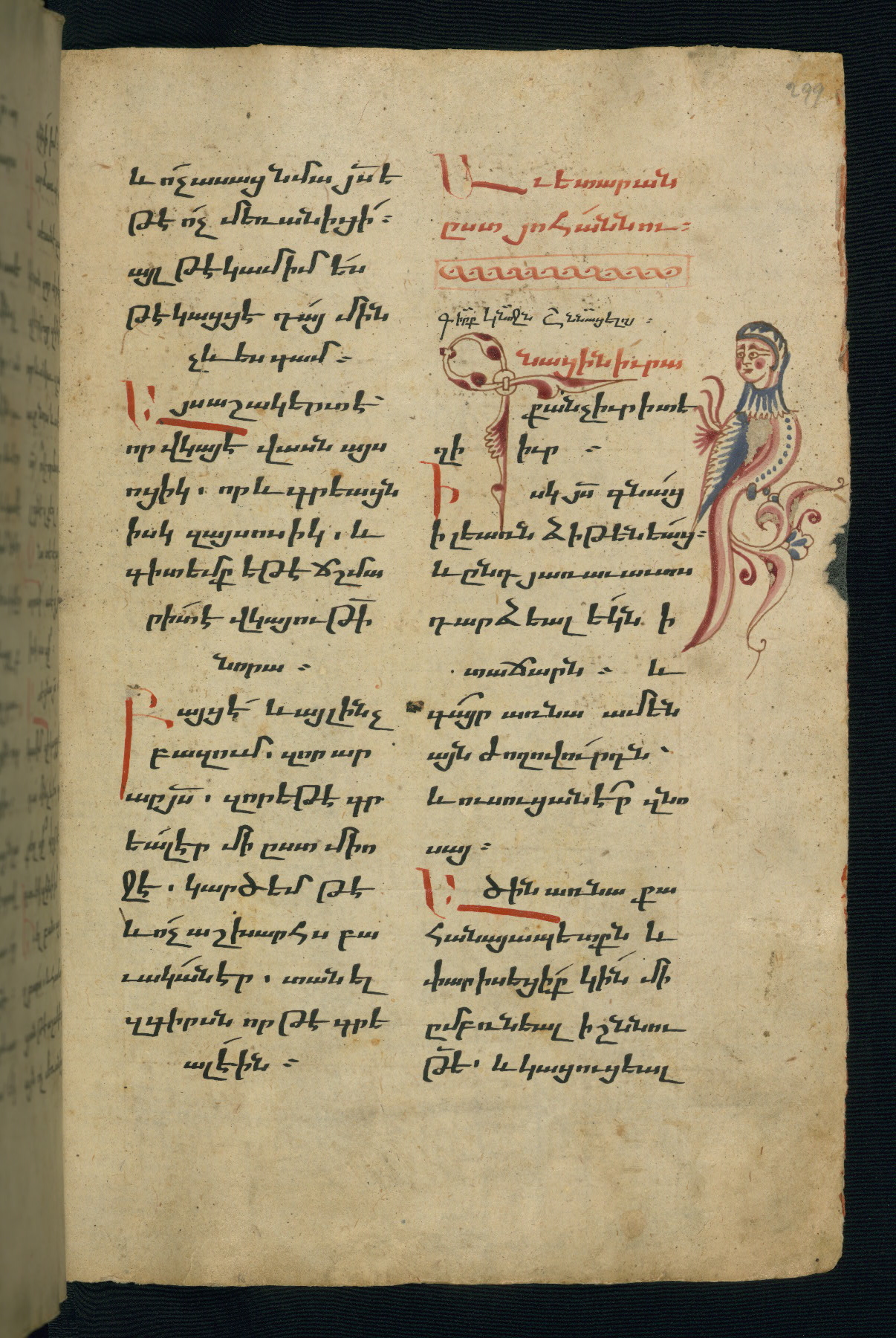 This Armenian Gospel book was produced in 904 of the Armenian era (1455 CE) at the monastery of Gamałiēl in Xizan by the scribe Yohannēs Vardapet, son of Vardan and Dilšat, and was illuminated by the priest Xačʿatur. The priest Pʿilipos commissioned the manuscript as a memorial to himself, his parents Łazar and Xutʿlumēlikʿ, and other relatives listed in the colophon on fols. 300r to 301v. Pʿilipos is depicted on fol. 14v alongside his brothers Yusēpʿ and Sultanša, as they kneel before the Virgin and Child enthroned (Theotokos). The book contains twenty-six full-page polychrome miniatures, including four Evangelist portraits; ornately designed canon tables; four decorated incipit pages; numerous marginal miniatures of floral and faunal motifs; and nineteen marginal miniatures of biblical characters or allusions to biblical narratives.