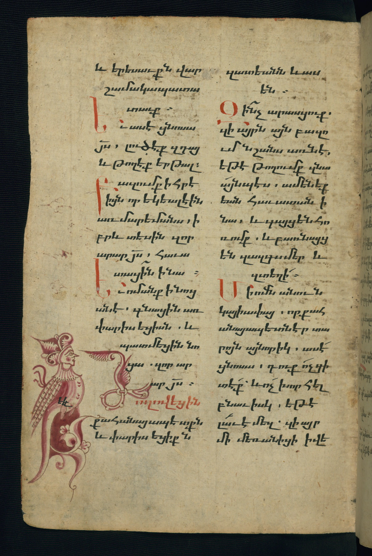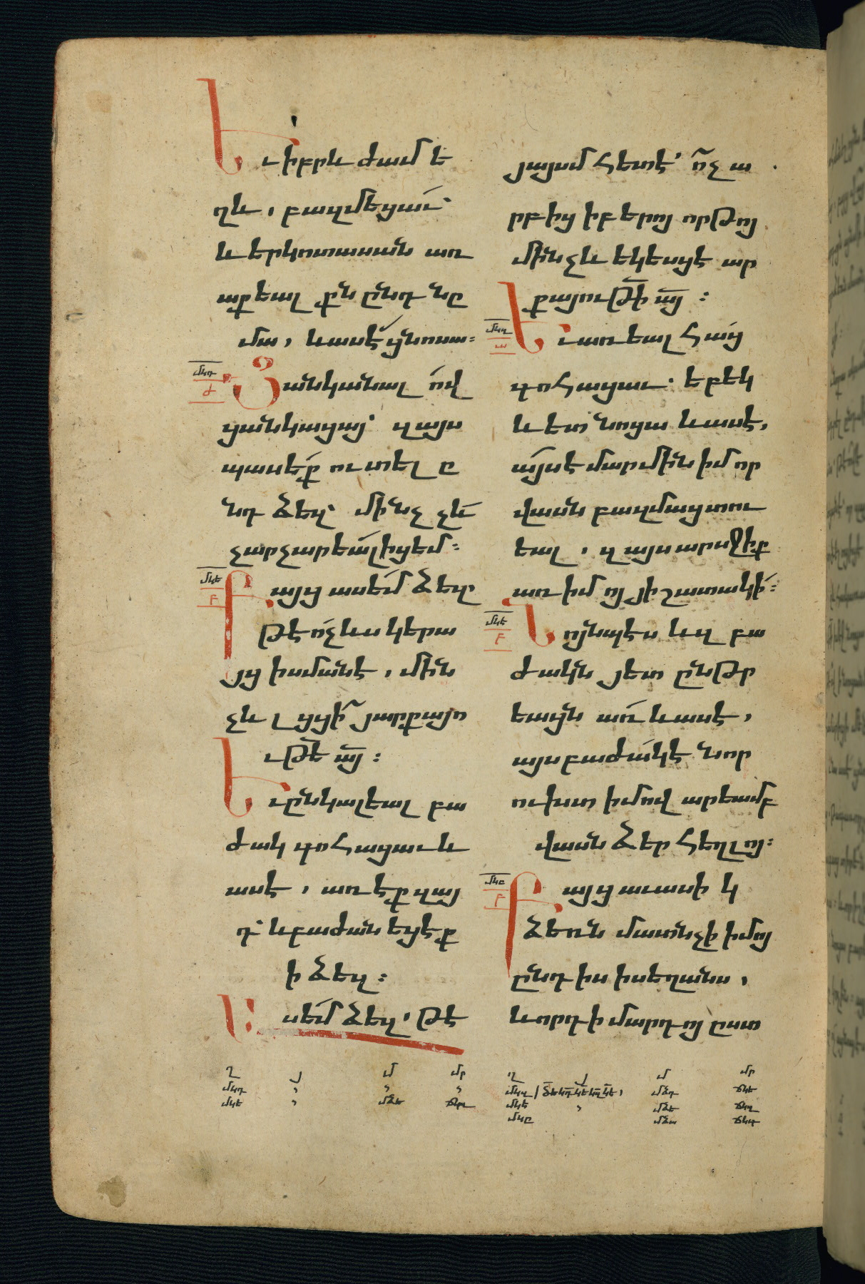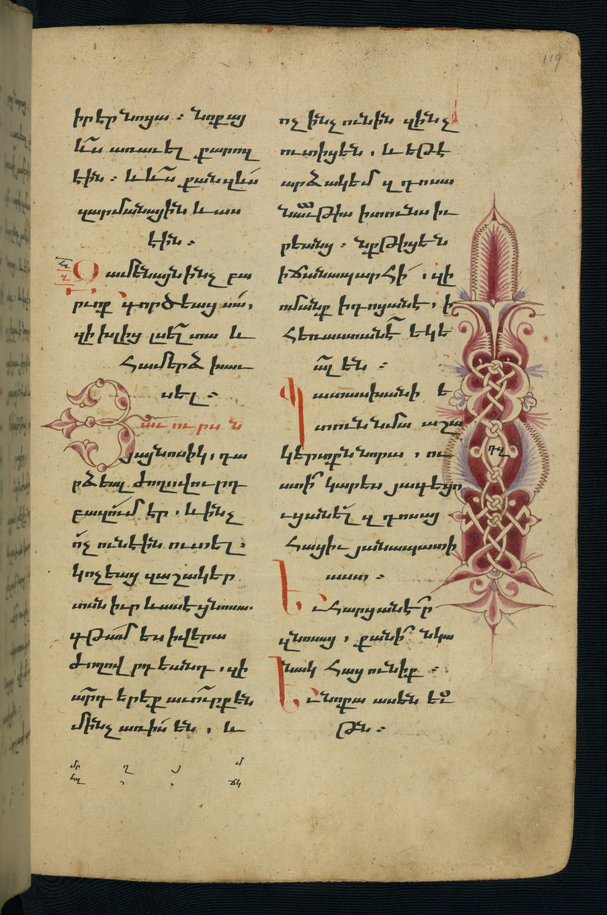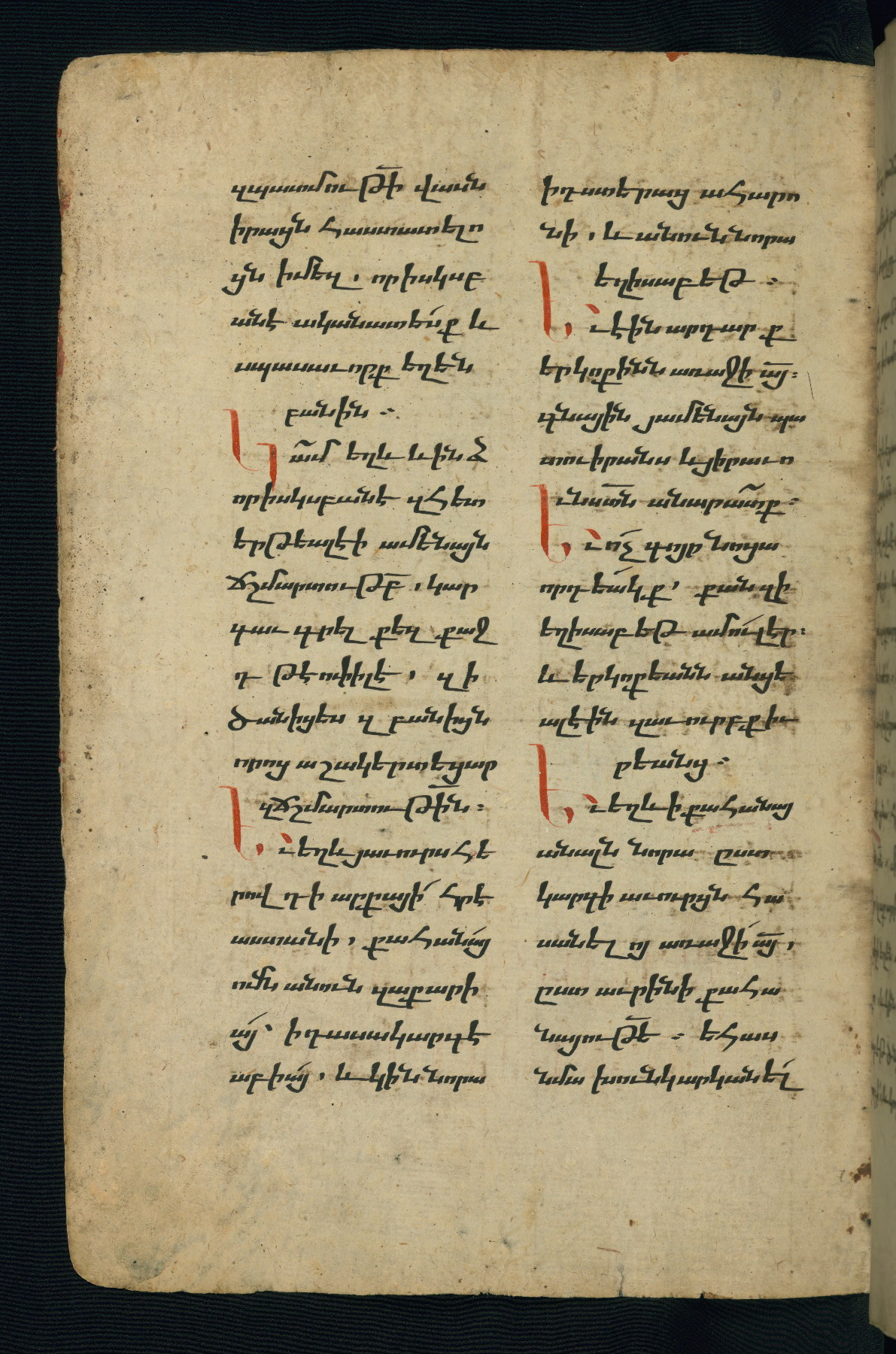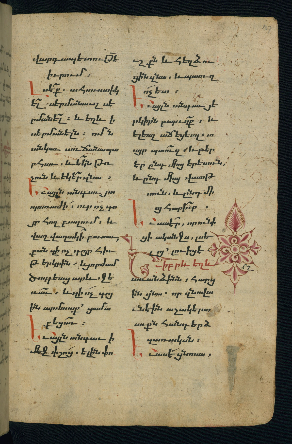 This Armenian Gospel book was produced in 904 of the Armenian era (1455 CE) at the monastery of Gamałiēl in Xizan by the scribe Yohannēs Vardapet, son of Vardan and Dilšat, and was illuminated by the priest Xačʿatur. The priest Pʿilipos commissioned the manuscript as a memorial to himself, his parents Łazar and Xutʿlumēlikʿ, and other relatives listed in the colophon on fols. 300r to 301v. Pʿilipos is depicted on fol. 14v alongside his brothers Yusēpʿ and Sultanša, as they kneel before the Virgin and Child enthroned (Theotokos). The book contains twenty-six full-page polychrome miniatures, including four Evangelist portraits; ornately designed canon tables; four decorated incipit pages; numerous marginal miniatures of floral and faunal motifs; and nineteen marginal miniatures of biblical characters or allusions to biblical narratives.