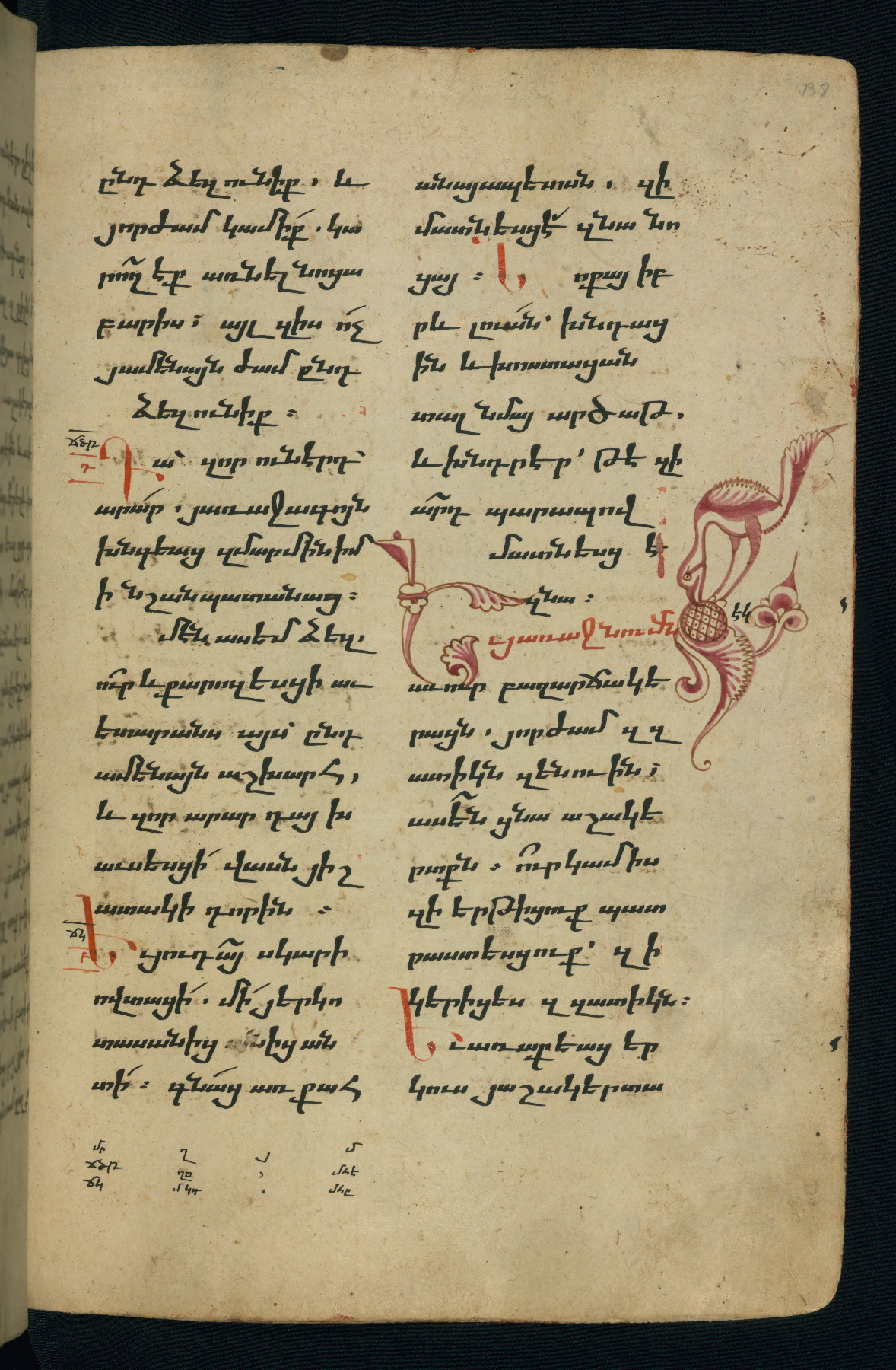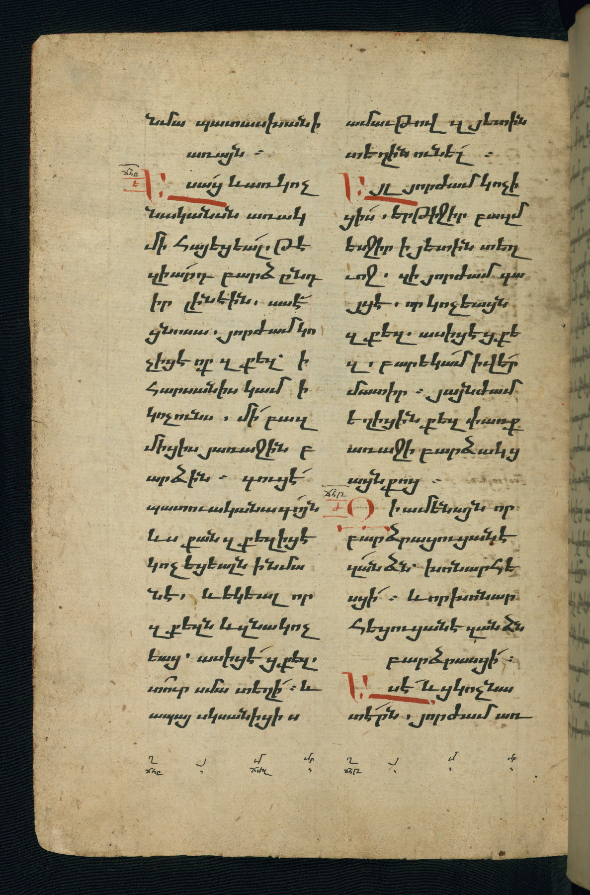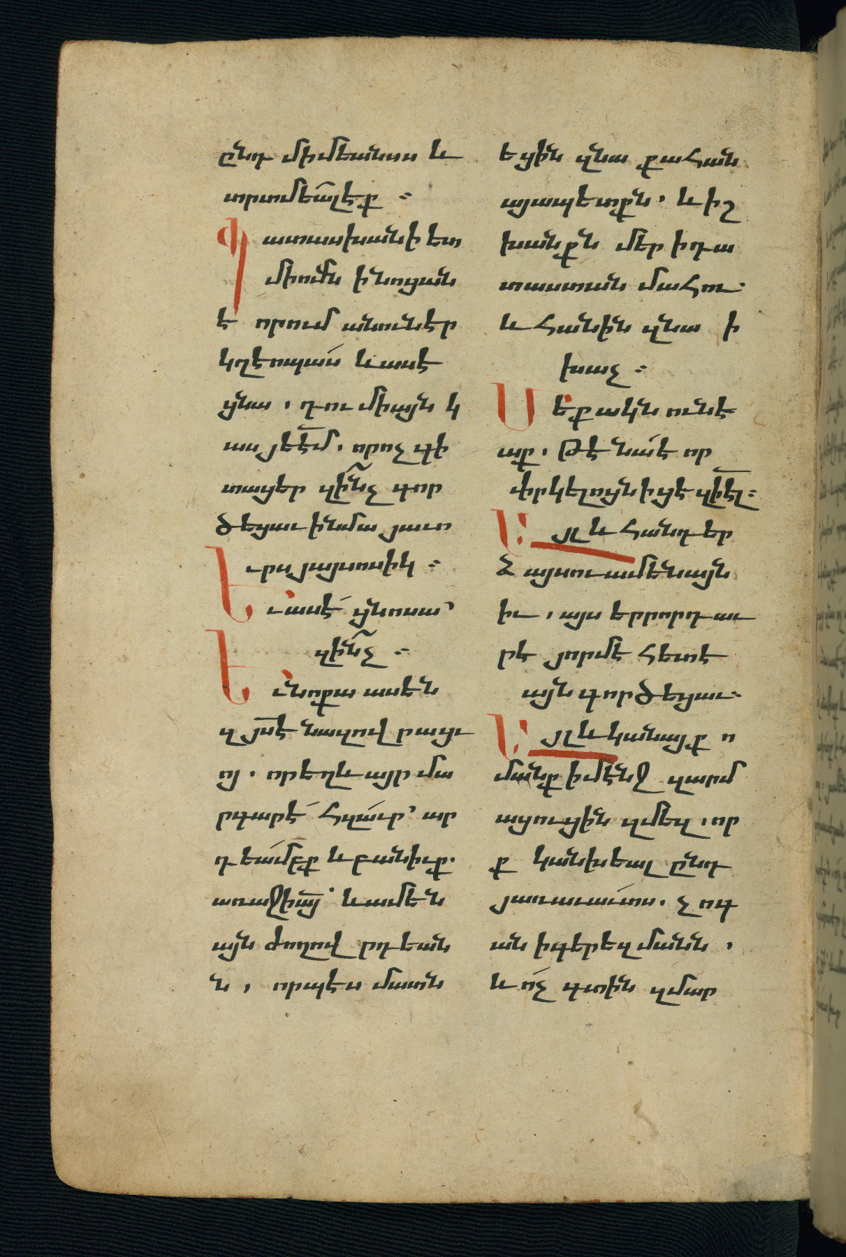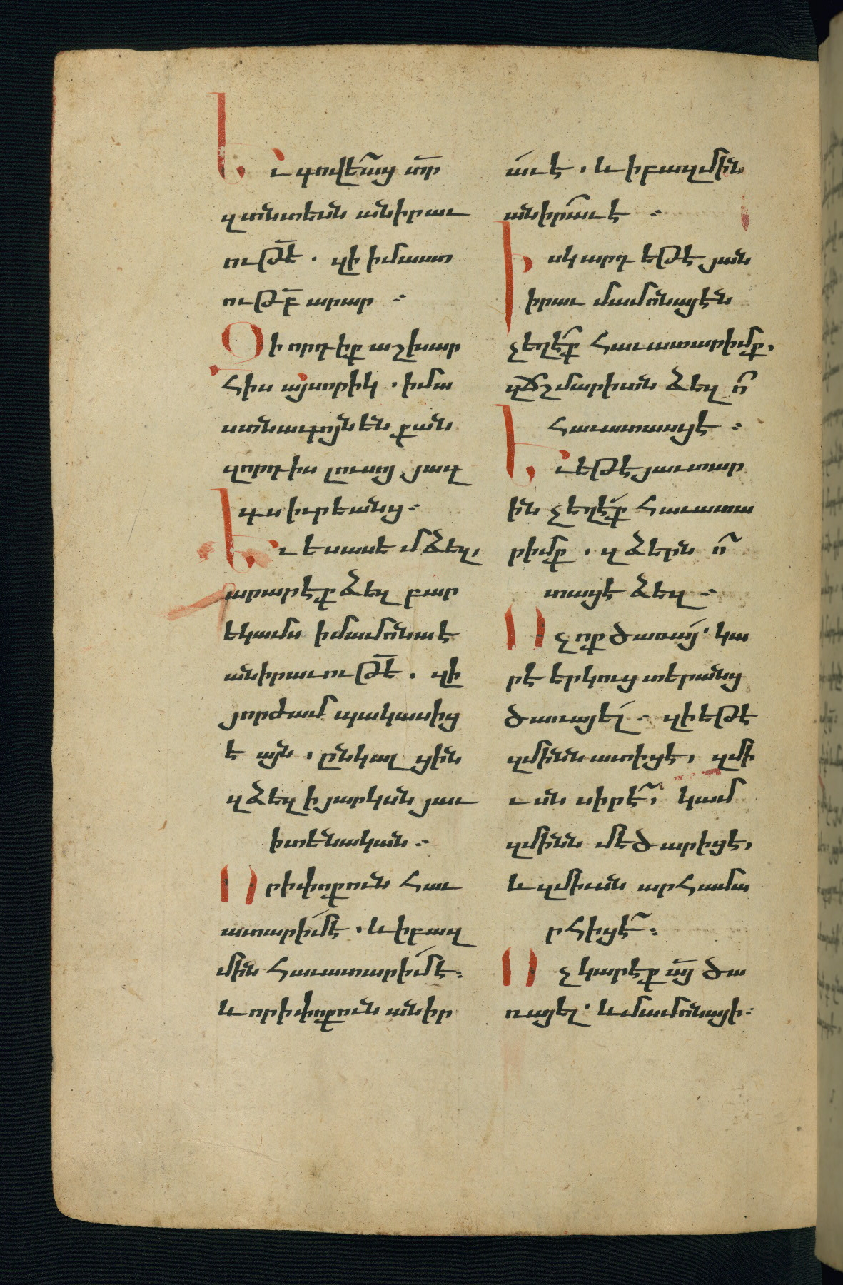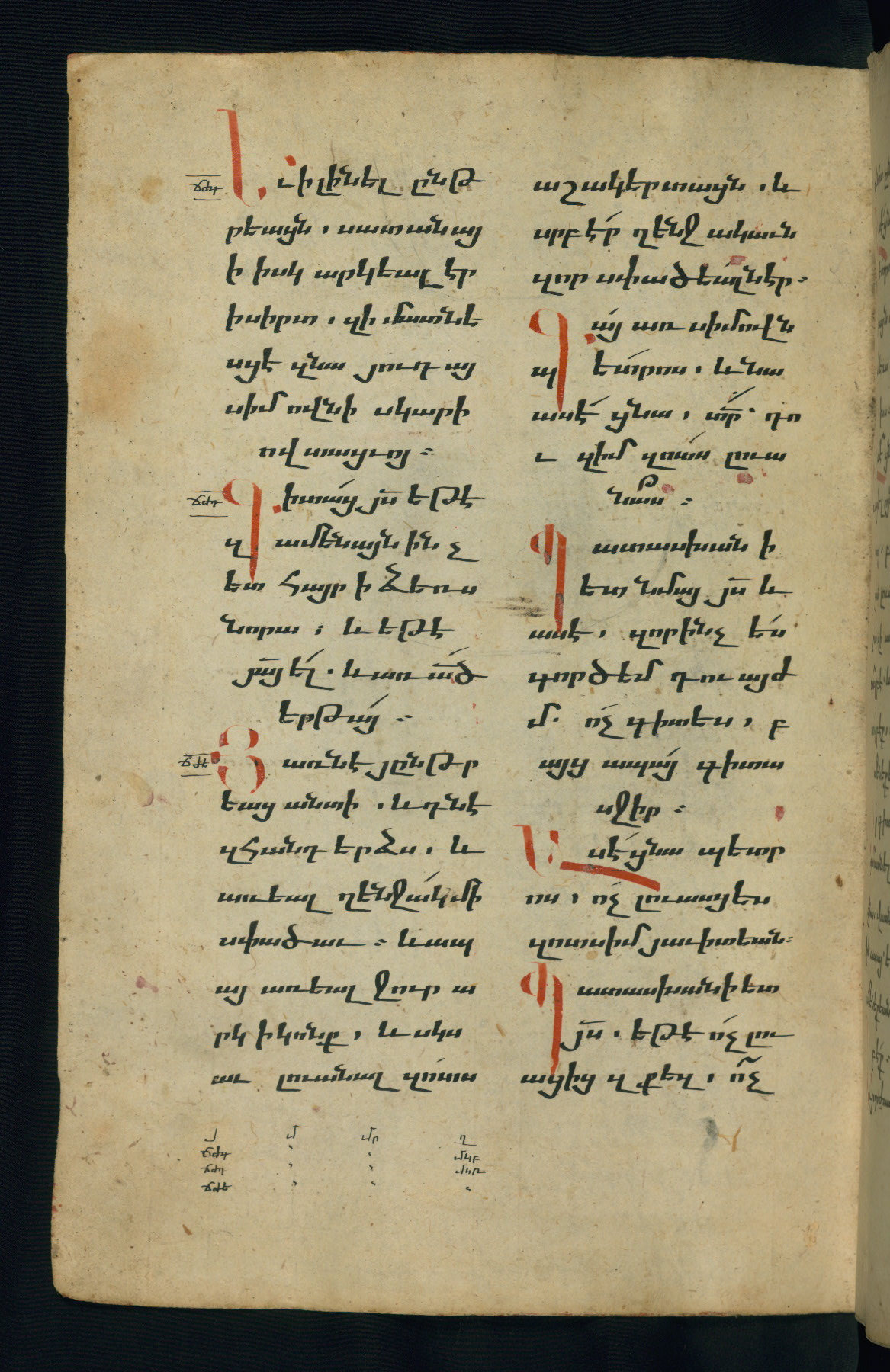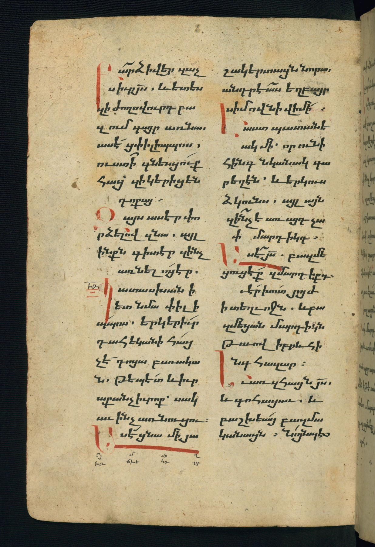 This Armenian Gospel book was produced in 904 of the Armenian era (1455 CE) at the monastery of Gamałiēl in Xizan by the scribe Yohannēs Vardapet, son of Vardan and Dilšat, and was illuminated by the priest Xačʿatur. The priest Pʿilipos commissioned the manuscript as a memorial to himself, his parents Łazar and Xutʿlumēlikʿ, and other relatives listed in the colophon on fols. 300r to 301v. Pʿilipos is depicted on fol. 14v alongside his brothers Yusēpʿ and Sultanša, as they kneel before the Virgin and Child enthroned (Theotokos). The book contains twenty-six full-page polychrome miniatures, including four Evangelist portraits; ornately designed canon tables; four decorated incipit pages; numerous marginal miniatures of floral and faunal motifs; and nineteen marginal miniatures of biblical characters or allusions to biblical narratives.