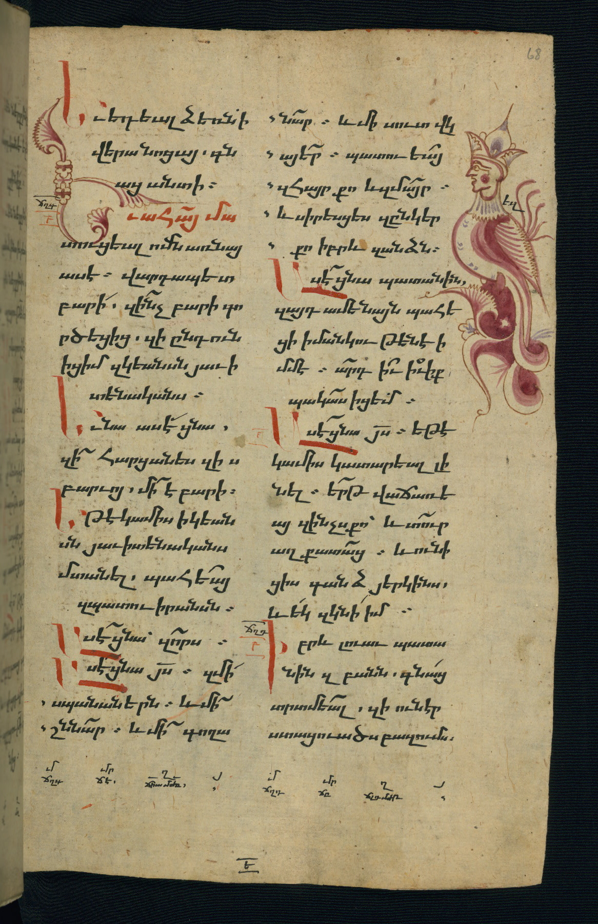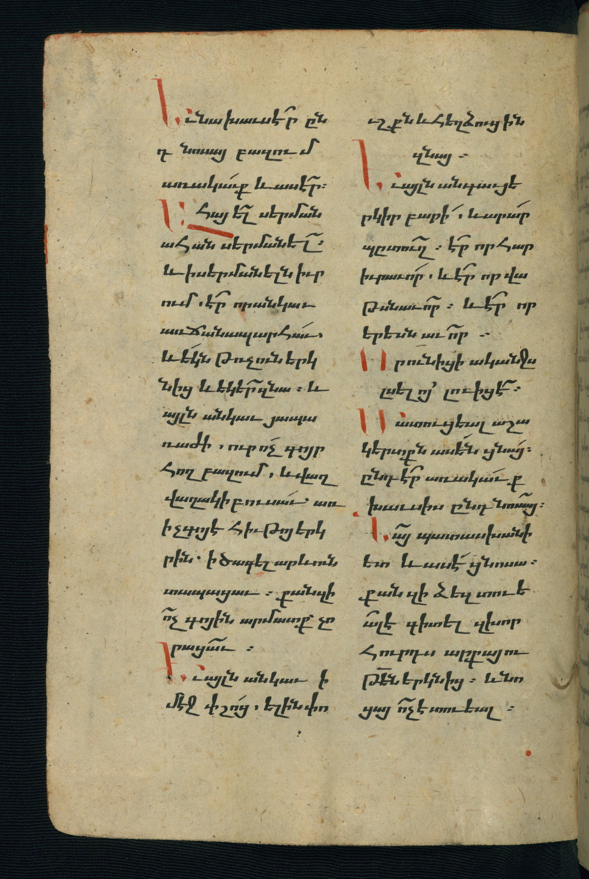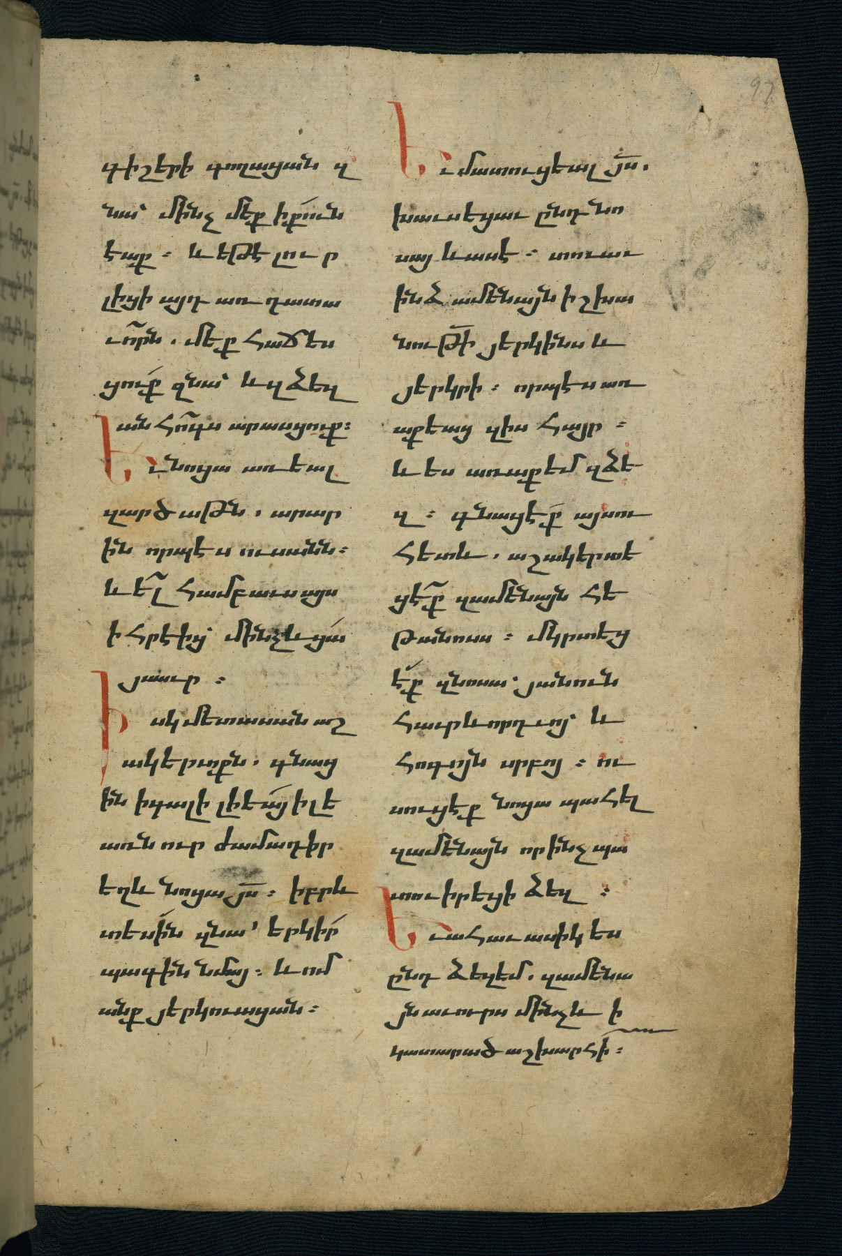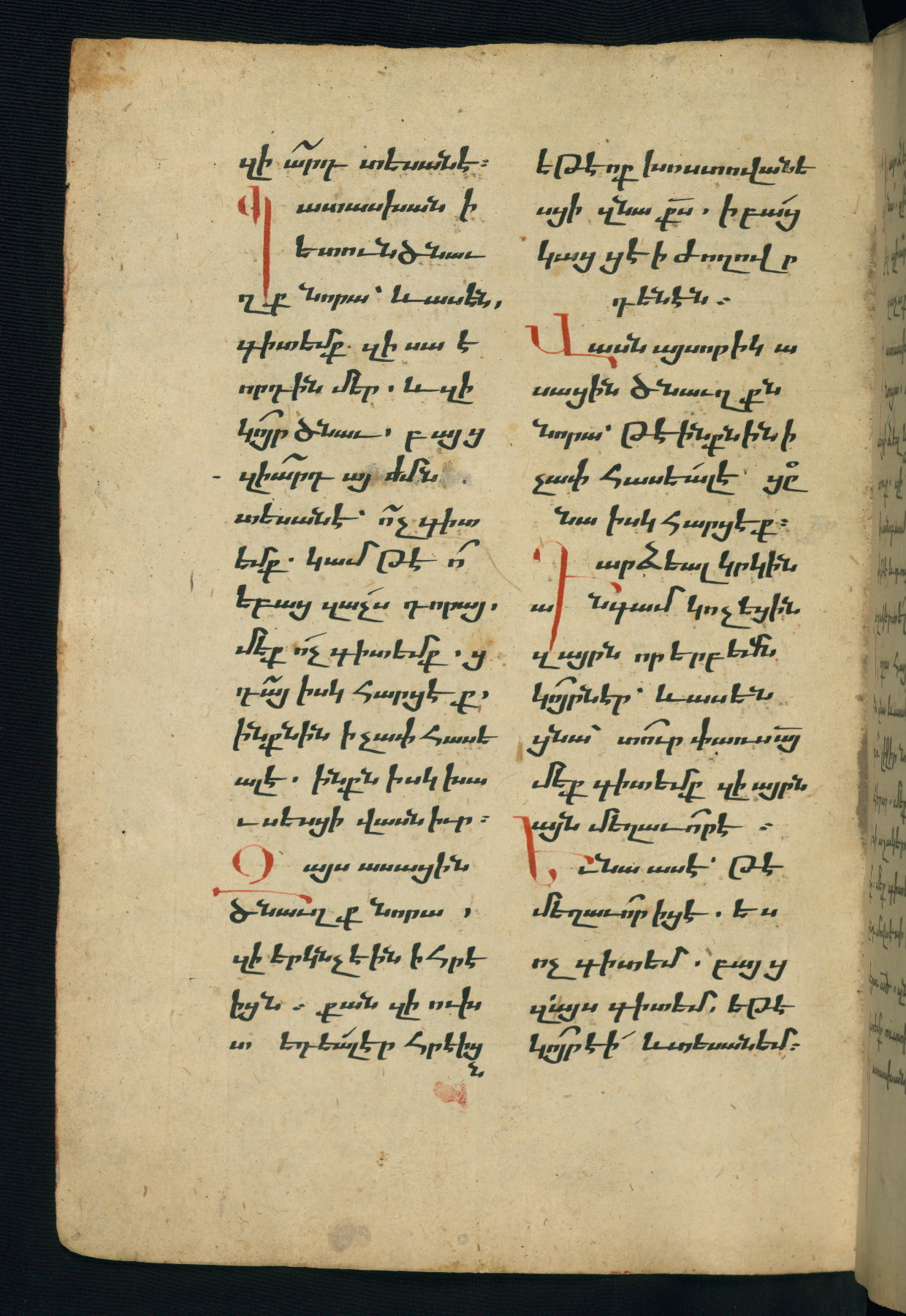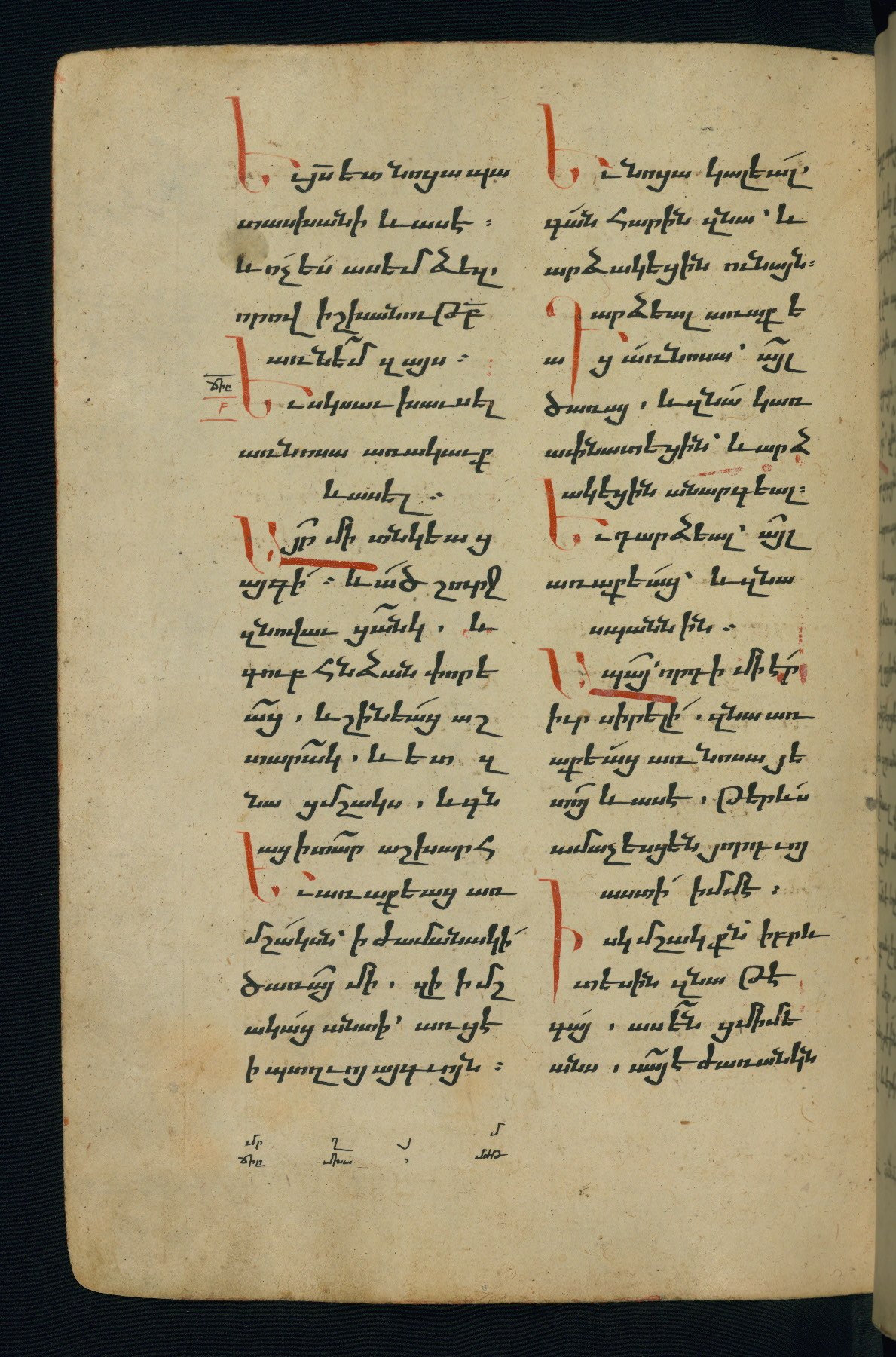 This Armenian Gospel book was produced in 904 of the Armenian era (1455 CE) at the monastery of Gamałiēl in Xizan by the scribe Yohannēs Vardapet, son of Vardan and Dilšat, and was illuminated by the priest Xačʿatur. The priest Pʿilipos commissioned the manuscript as a memorial to himself, his parents Łazar and Xutʿlumēlikʿ, and other relatives listed in the colophon on fols. 300r to 301v. Pʿilipos is depicted on fol. 14v alongside his brothers Yusēpʿ and Sultanša, as they kneel before the Virgin and Child enthroned (Theotokos). The book contains twenty-six full-page polychrome miniatures, including four Evangelist portraits; ornately designed canon tables; four decorated incipit pages; numerous marginal miniatures of floral and faunal motifs; and nineteen marginal miniatures of biblical characters or allusions to biblical narratives.