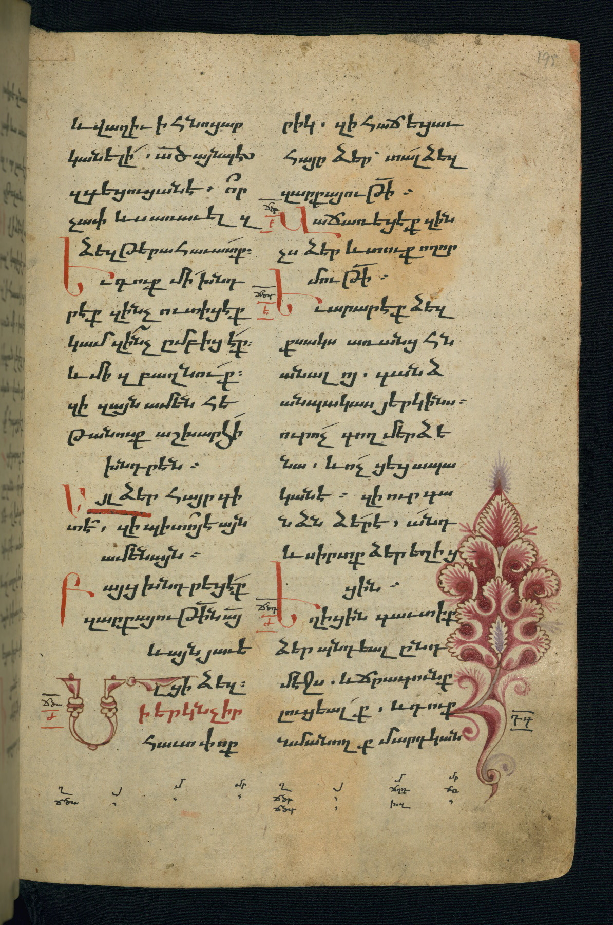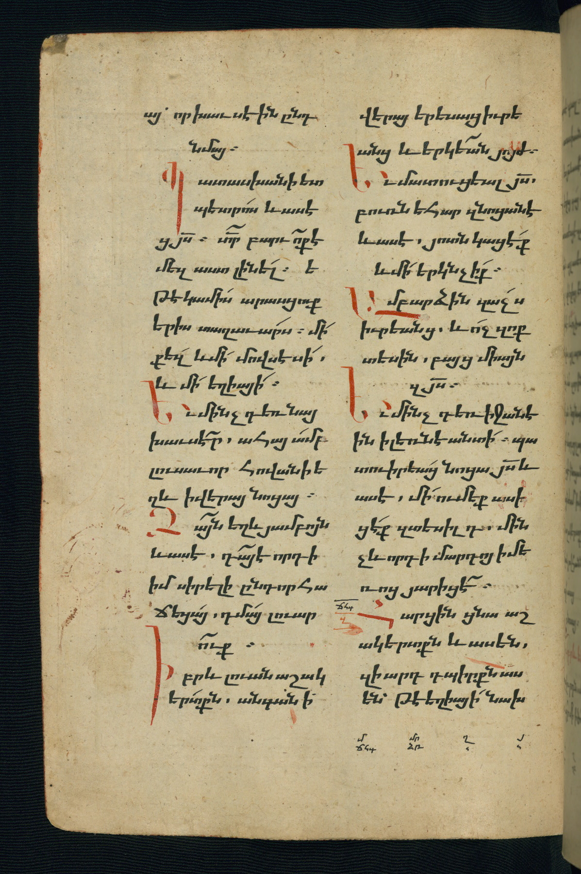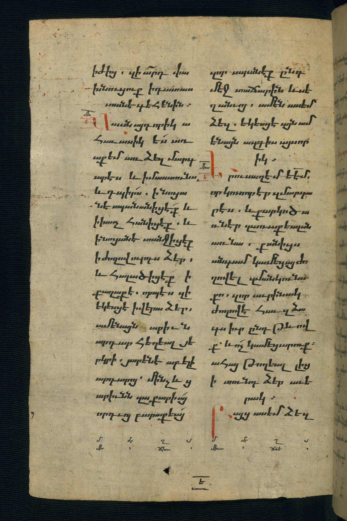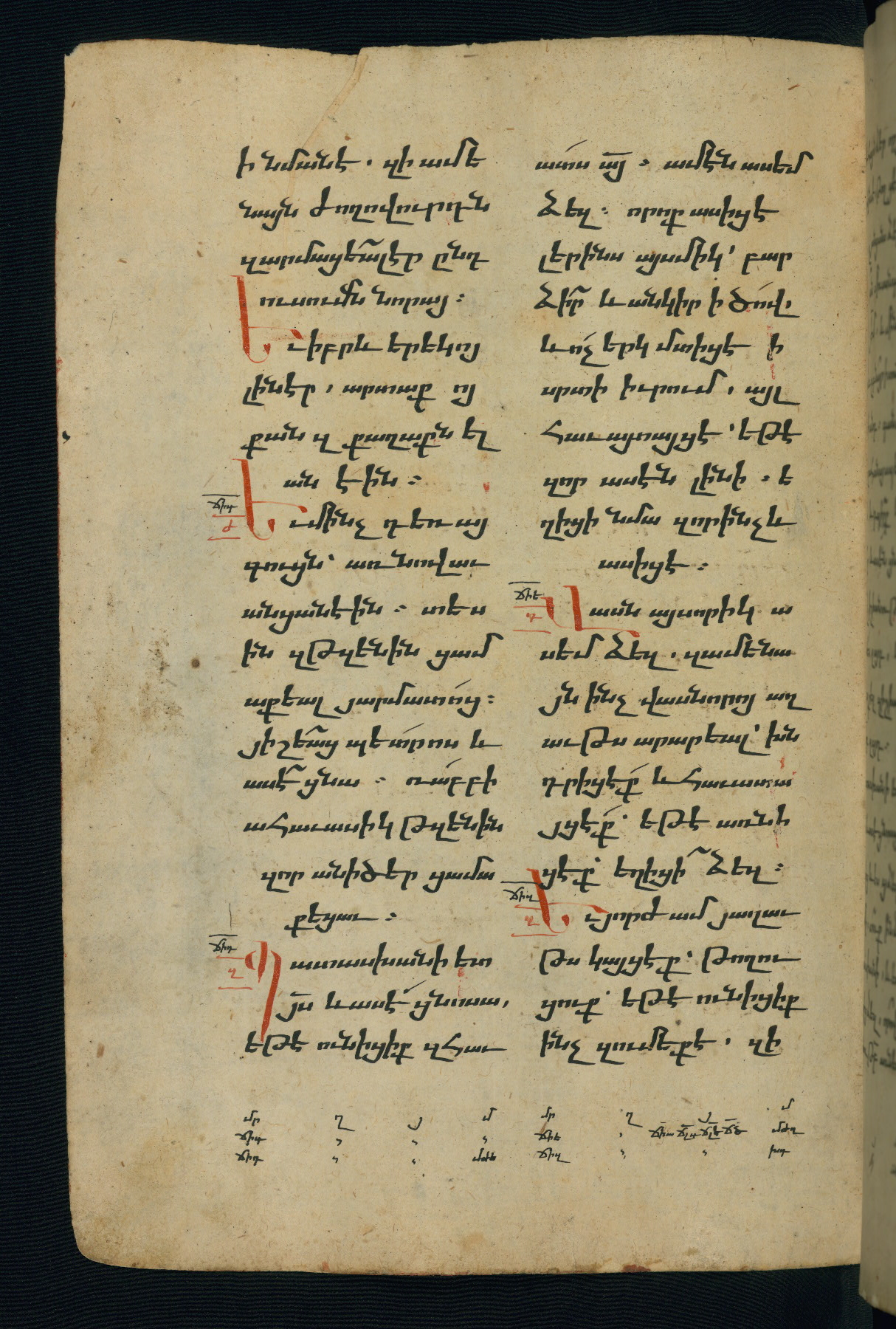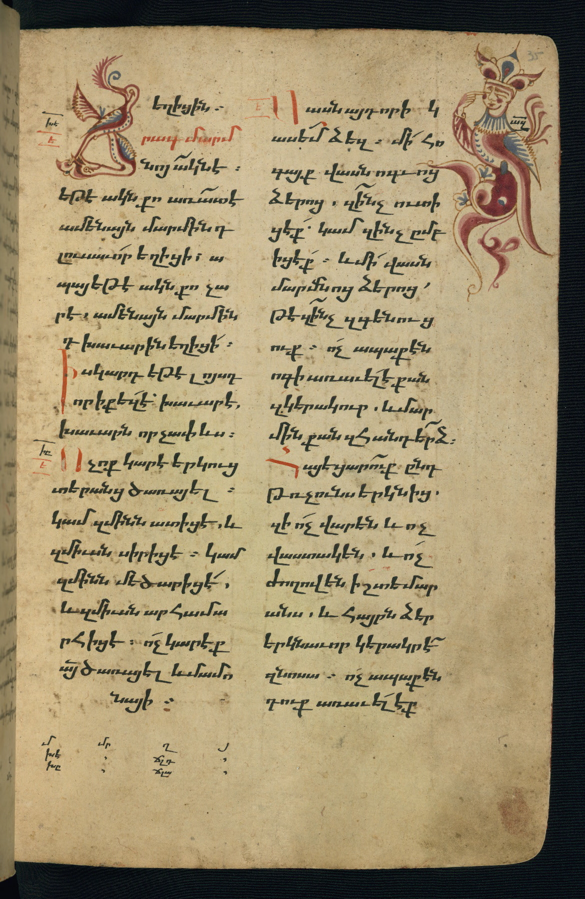 This Armenian Gospel book was produced in 904 of the Armenian era (1455 CE) at the monastery of Gamałiēl in Xizan by the scribe Yohannēs Vardapet, son of Vardan and Dilšat, and was illuminated by the priest Xačʿatur. The priest Pʿilipos commissioned the manuscript as a memorial to himself, his parents Łazar and Xutʿlumēlikʿ, and other relatives listed in the colophon on fols. 300r to 301v. Pʿilipos is depicted on fol. 14v alongside his brothers Yusēpʿ and Sultanša, as they kneel before the Virgin and Child enthroned (Theotokos). The book contains twenty-six full-page polychrome miniatures, including four Evangelist portraits; ornately designed canon tables; four decorated incipit pages; numerous marginal miniatures of floral and faunal motifs; and nineteen marginal miniatures of biblical characters or allusions to biblical narratives.