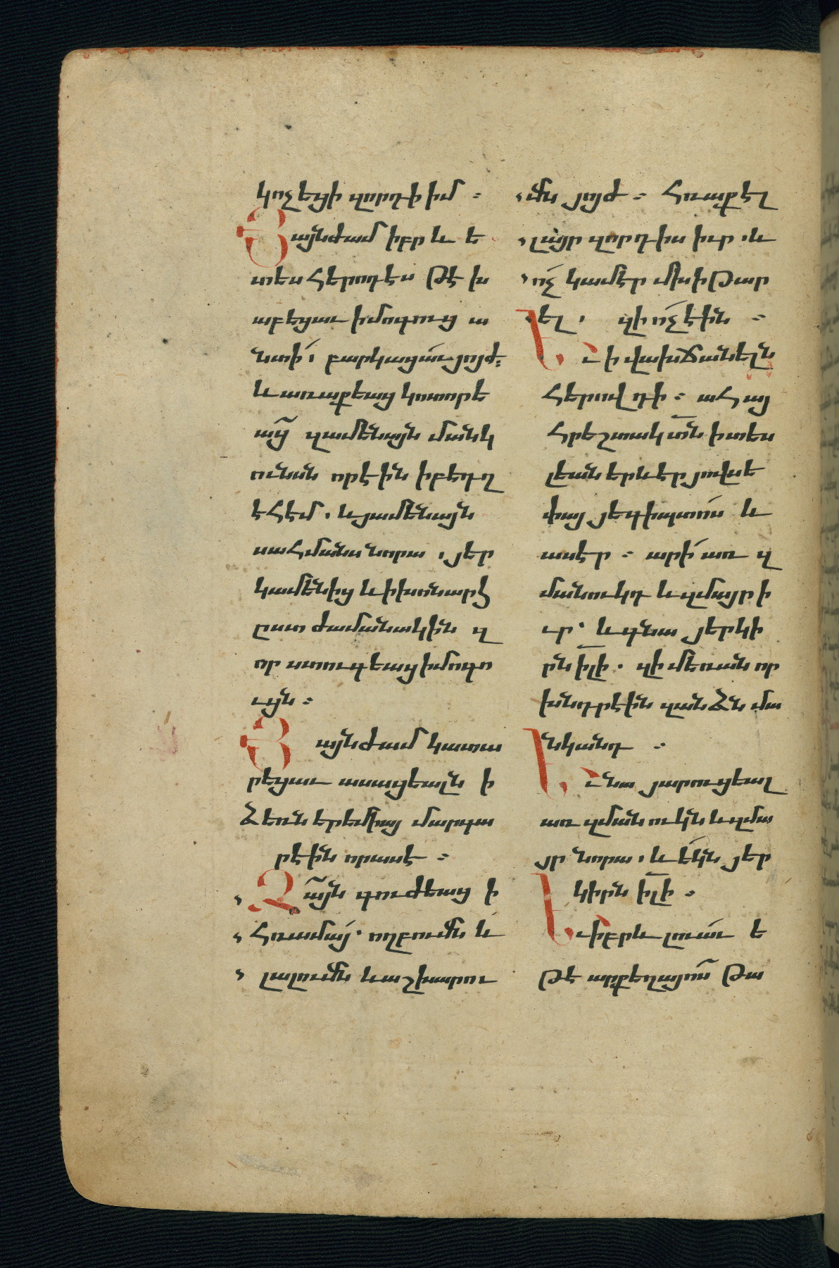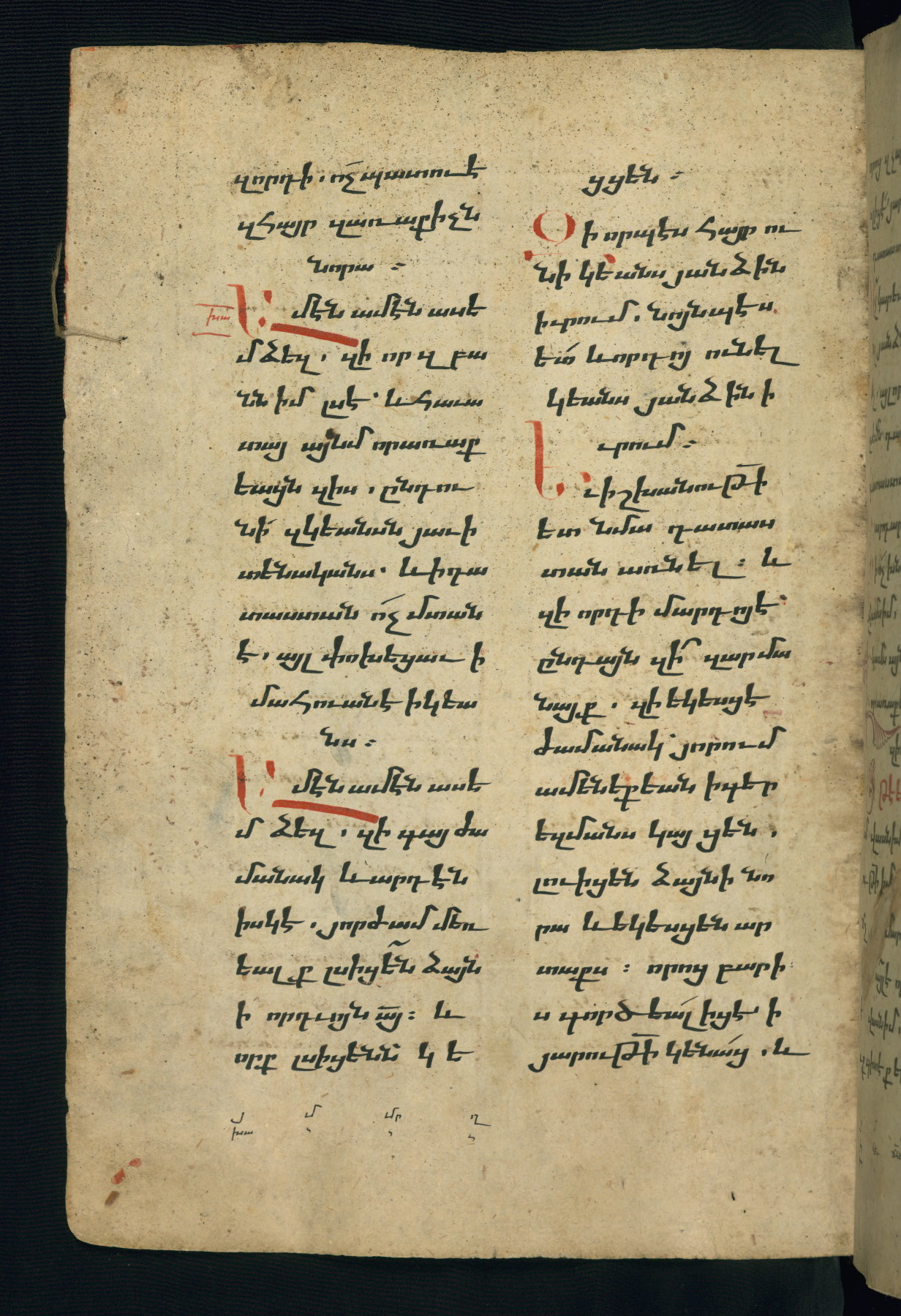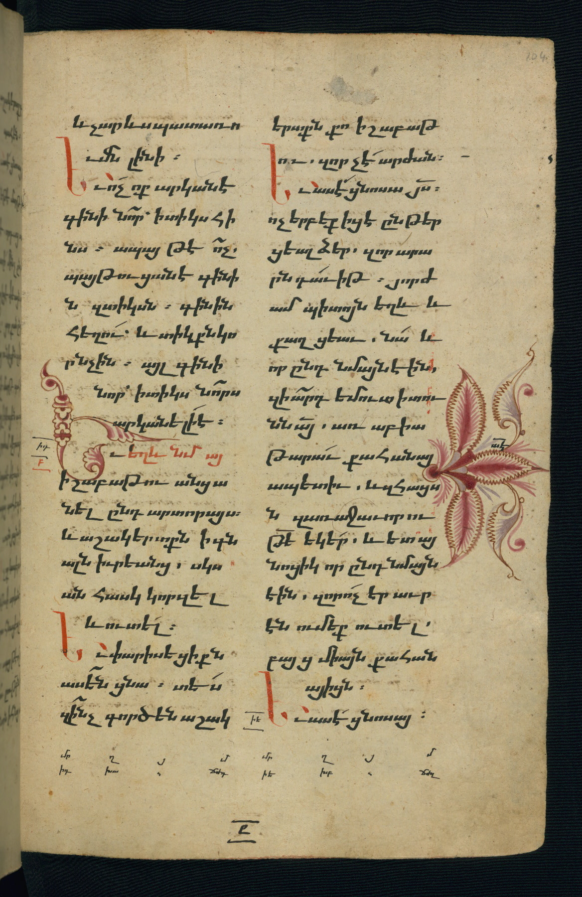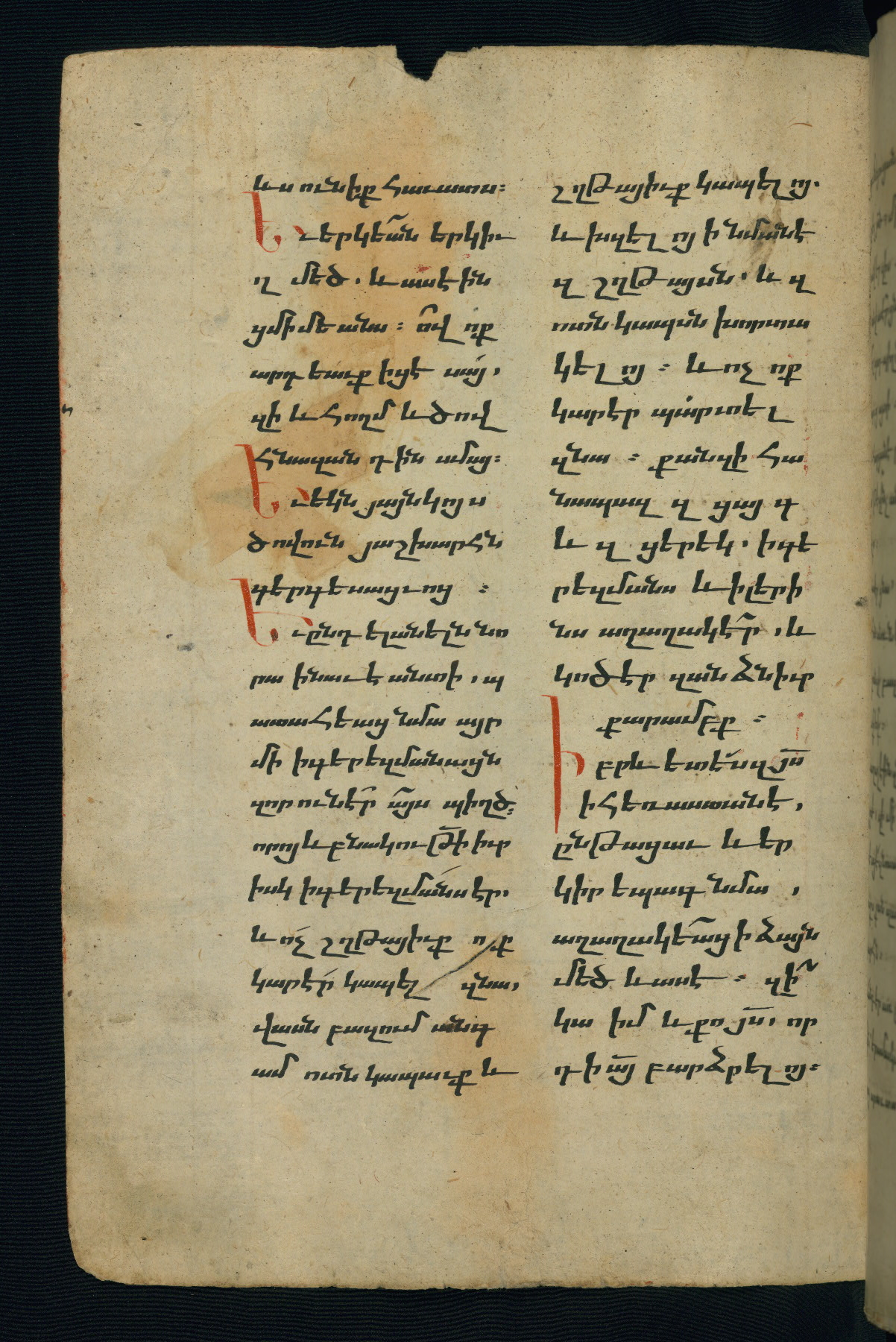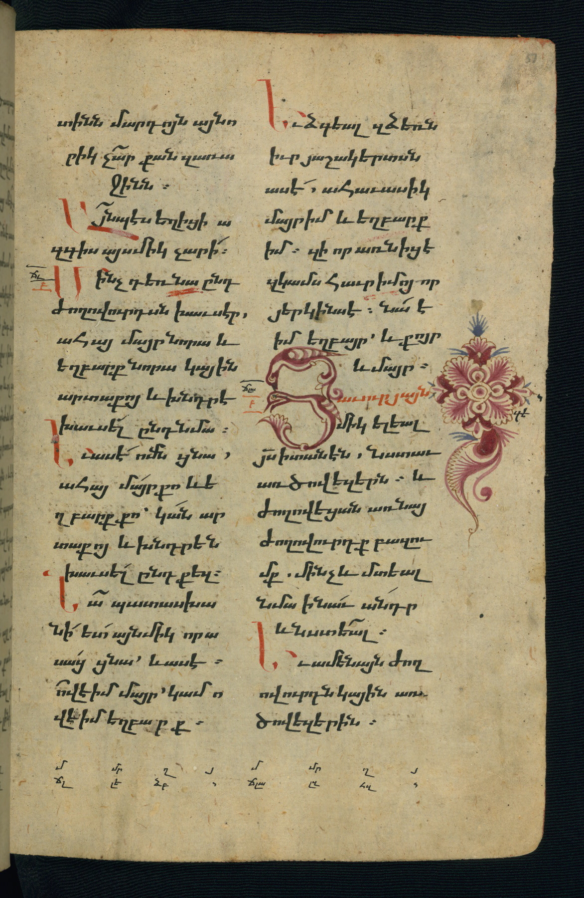 This Armenian Gospel book was produced in 904 of the Armenian era (1455 CE) at the monastery of Gamałiēl in Xizan by the scribe Yohannēs Vardapet, son of Vardan and Dilšat, and was illuminated by the priest Xačʿatur. The priest Pʿilipos commissioned the manuscript as a memorial to himself, his parents Łazar and Xutʿlumēlikʿ, and other relatives listed in the colophon on fols. 300r to 301v. Pʿilipos is depicted on fol. 14v alongside his brothers Yusēpʿ and Sultanša, as they kneel before the Virgin and Child enthroned (Theotokos). The book contains twenty-six full-page polychrome miniatures, including four Evangelist portraits; ornately designed canon tables; four decorated incipit pages; numerous marginal miniatures of floral and faunal motifs; and nineteen marginal miniatures of biblical characters or allusions to biblical narratives.