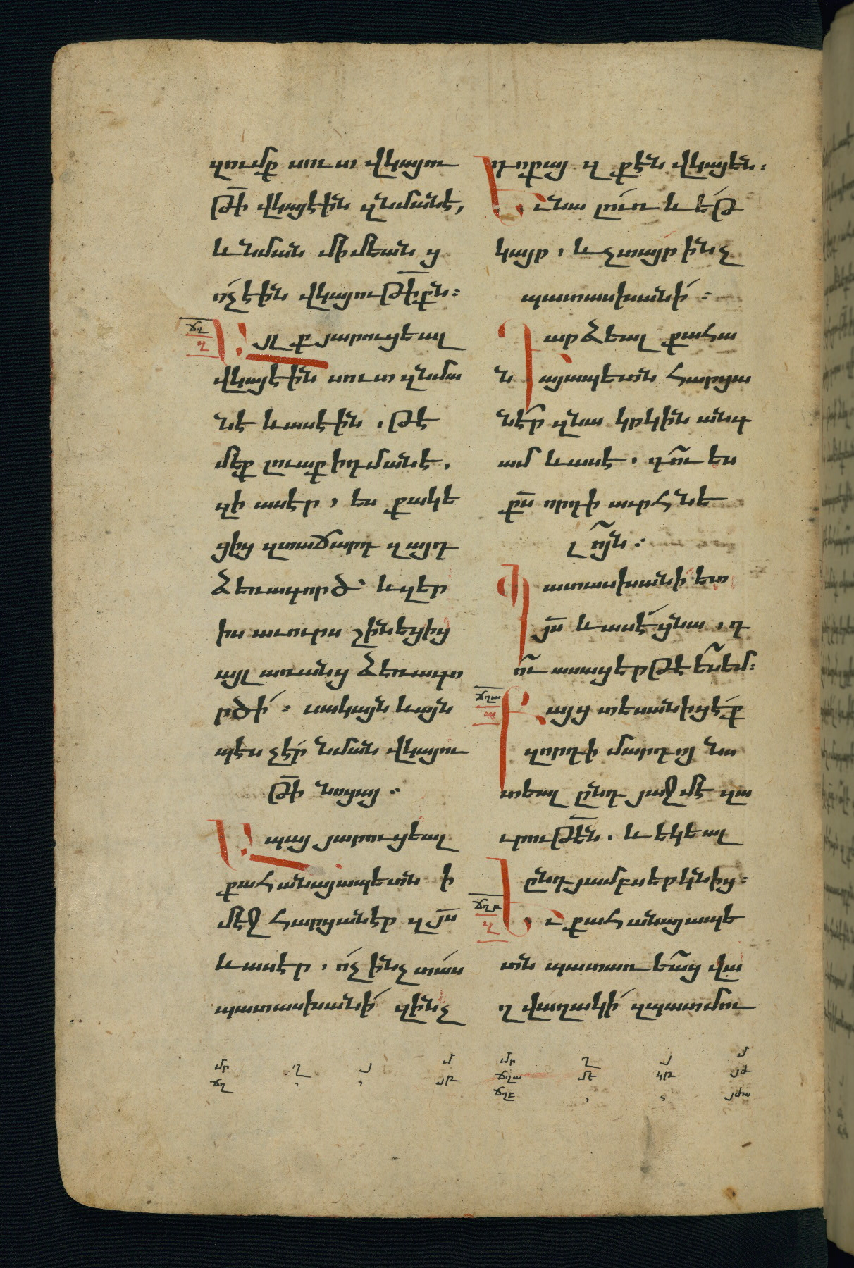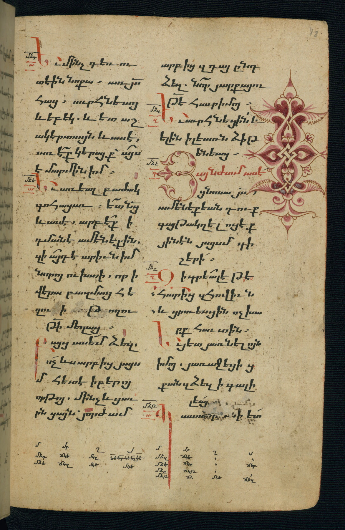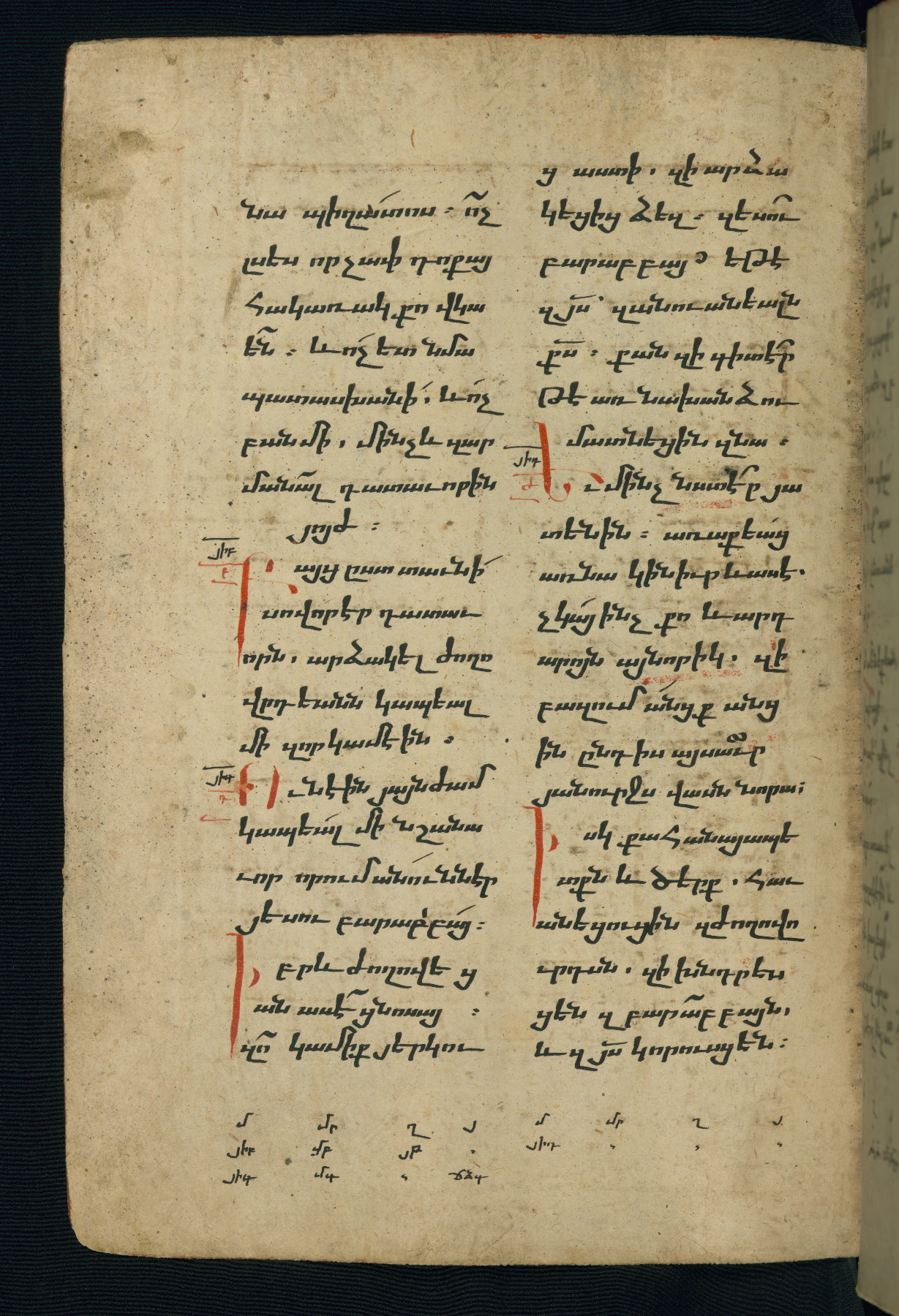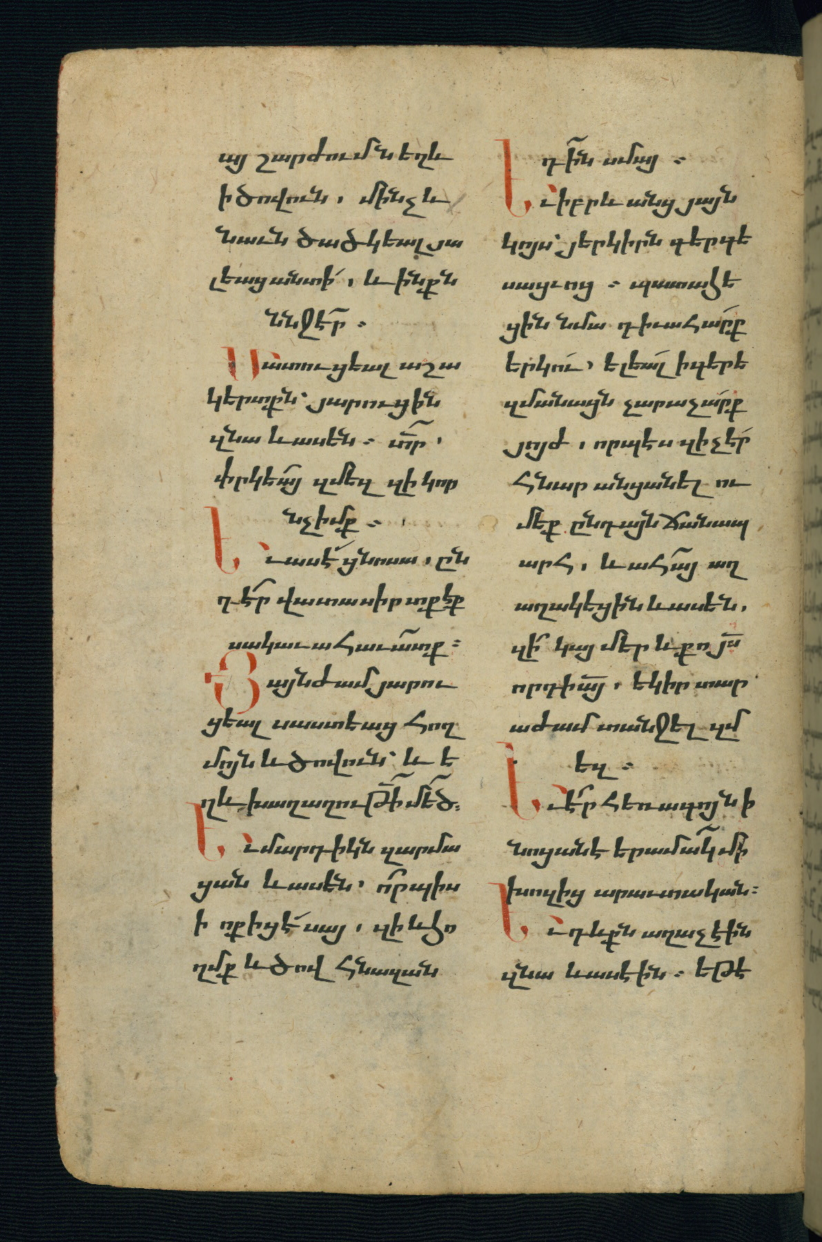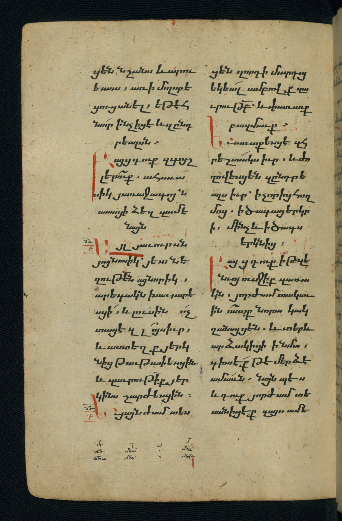 This Armenian Gospel book was produced in 904 of the Armenian era (1455 CE) at the monastery of Gamałiēl in Xizan by the scribe Yohannēs Vardapet, son of Vardan and Dilšat, and was illuminated by the priest Xačʿatur. The priest Pʿilipos commissioned the manuscript as a memorial to himself, his parents Łazar and Xutʿlumēlikʿ, and other relatives listed in the colophon on fols. 300r to 301v. Pʿilipos is depicted on fol. 14v alongside his brothers Yusēpʿ and Sultanša, as they kneel before the Virgin and Child enthroned (Theotokos). The book contains twenty-six full-page polychrome miniatures, including four Evangelist portraits; ornately designed canon tables; four decorated incipit pages; numerous marginal miniatures of floral and faunal motifs; and nineteen marginal miniatures of biblical characters or allusions to biblical narratives.