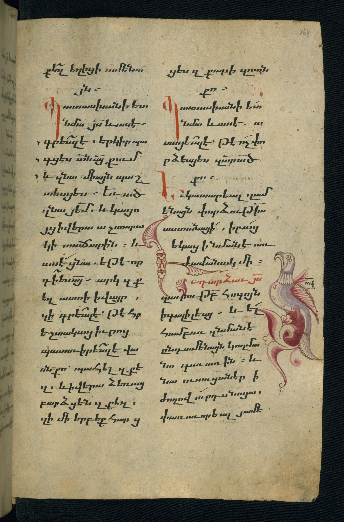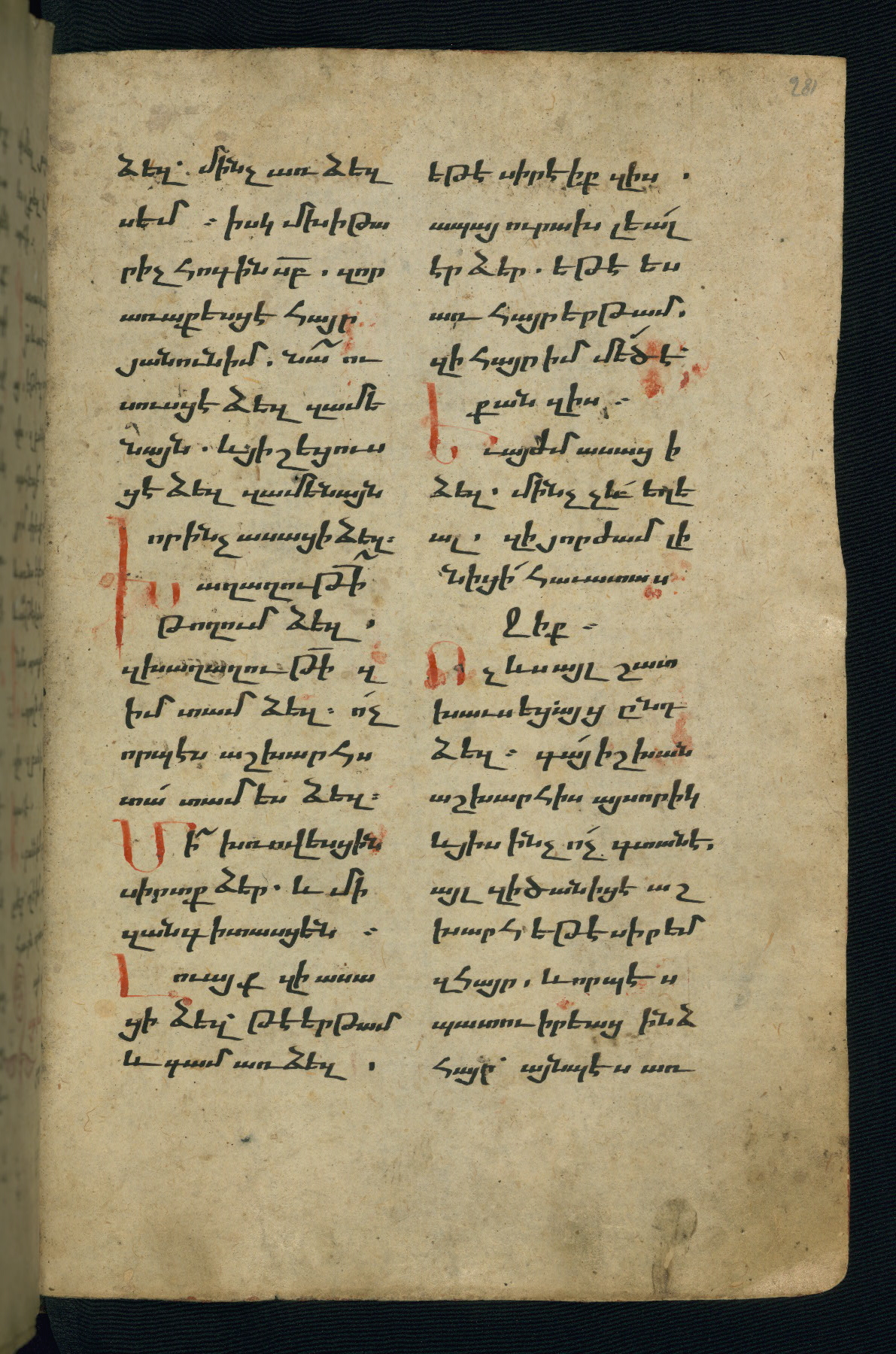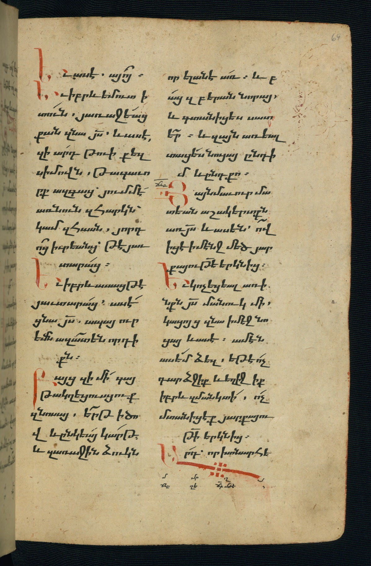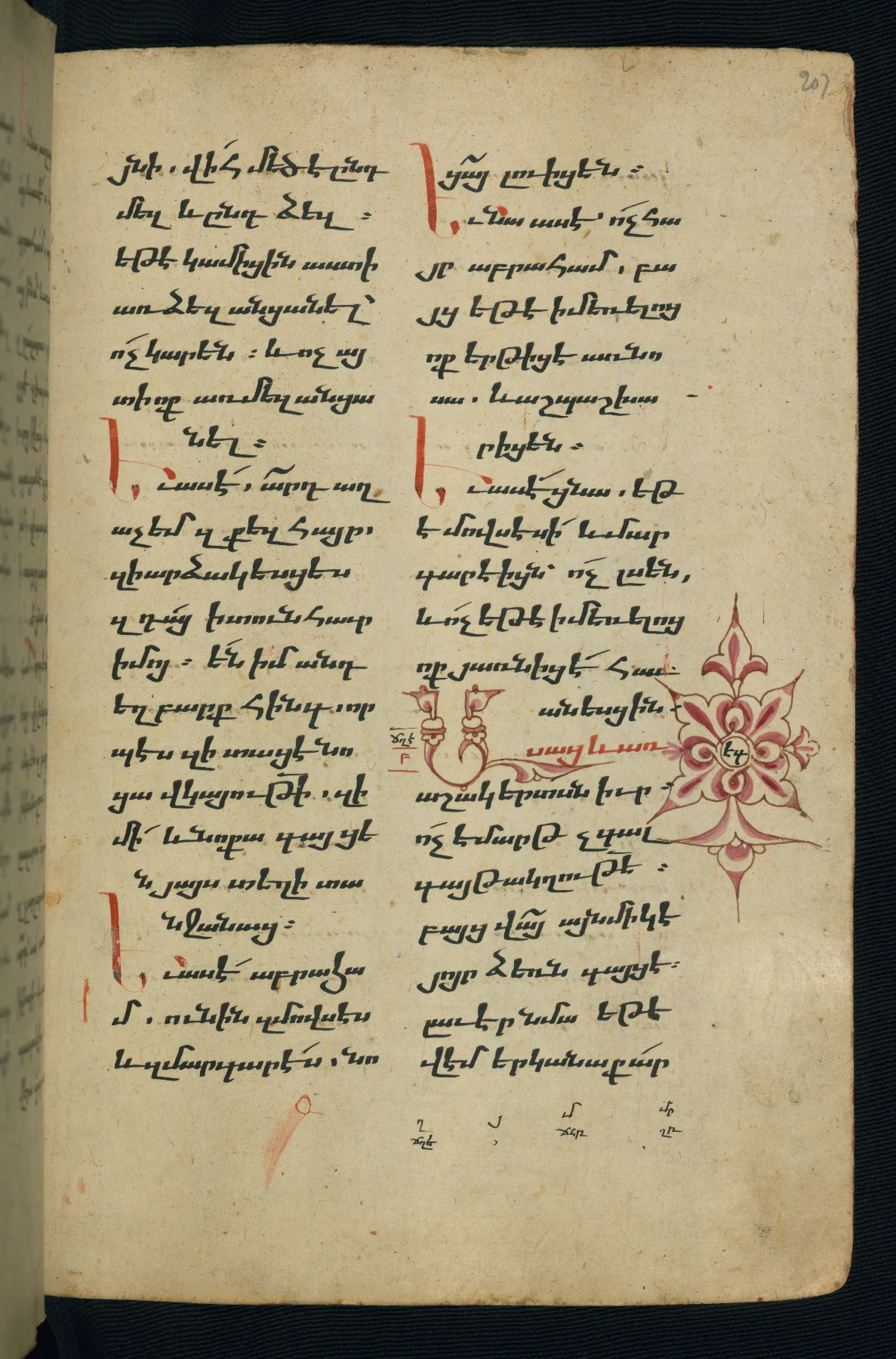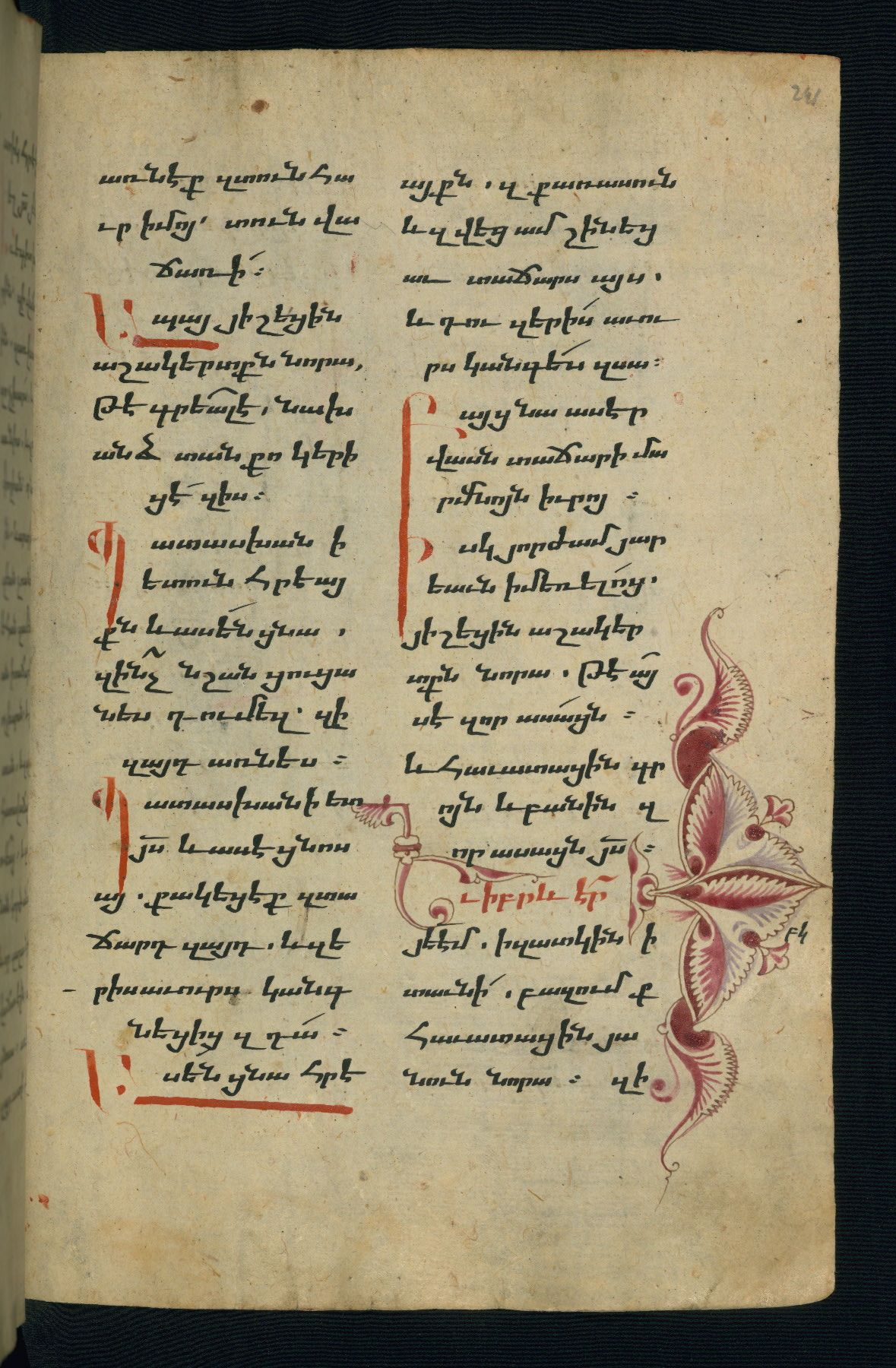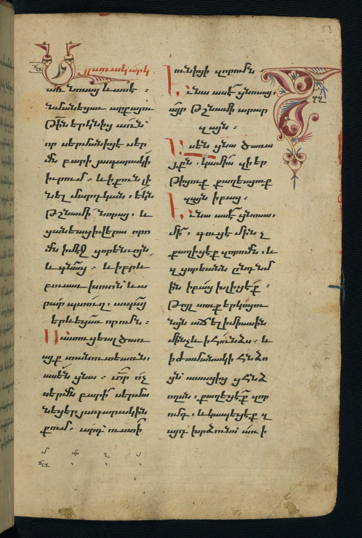 This Armenian Gospel book was produced in 904 of the Armenian era (1455 CE) at the monastery of Gamałiēl in Xizan by the scribe Yohannēs Vardapet, son of Vardan and Dilšat, and was illuminated by the priest Xačʿatur. The priest Pʿilipos commissioned the manuscript as a memorial to himself, his parents Łazar and Xutʿlumēlikʿ, and other relatives listed in the colophon on fols. 300r to 301v. Pʿilipos is depicted on fol. 14v alongside his brothers Yusēpʿ and Sultanša, as they kneel before the Virgin and Child enthroned (Theotokos). The book contains twenty-six full-page polychrome miniatures, including four Evangelist portraits; ornately designed canon tables; four decorated incipit pages; numerous marginal miniatures of floral and faunal motifs; and nineteen marginal miniatures of biblical characters or allusions to biblical narratives.