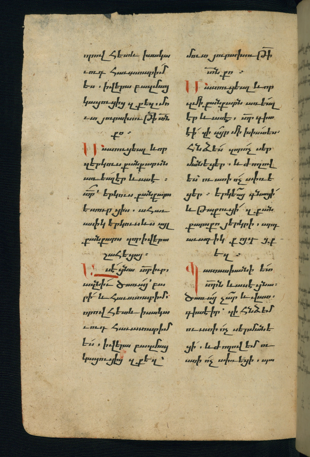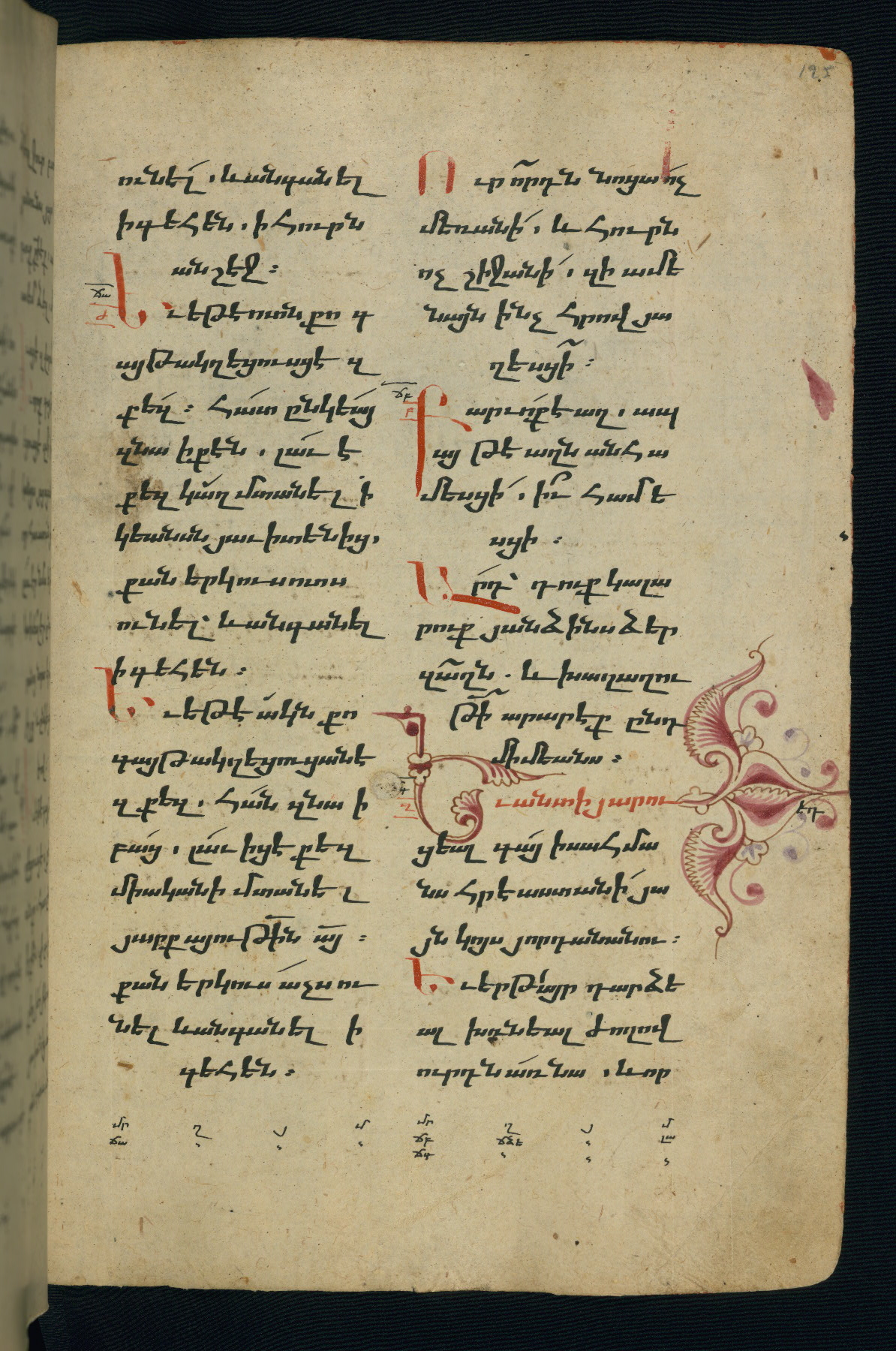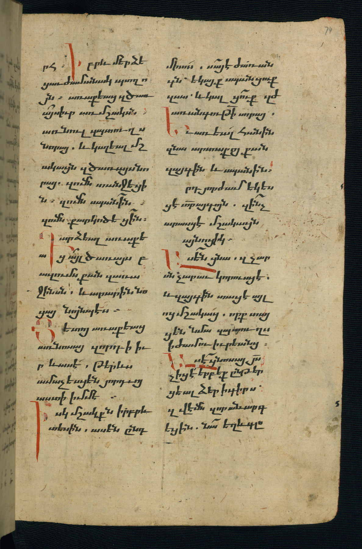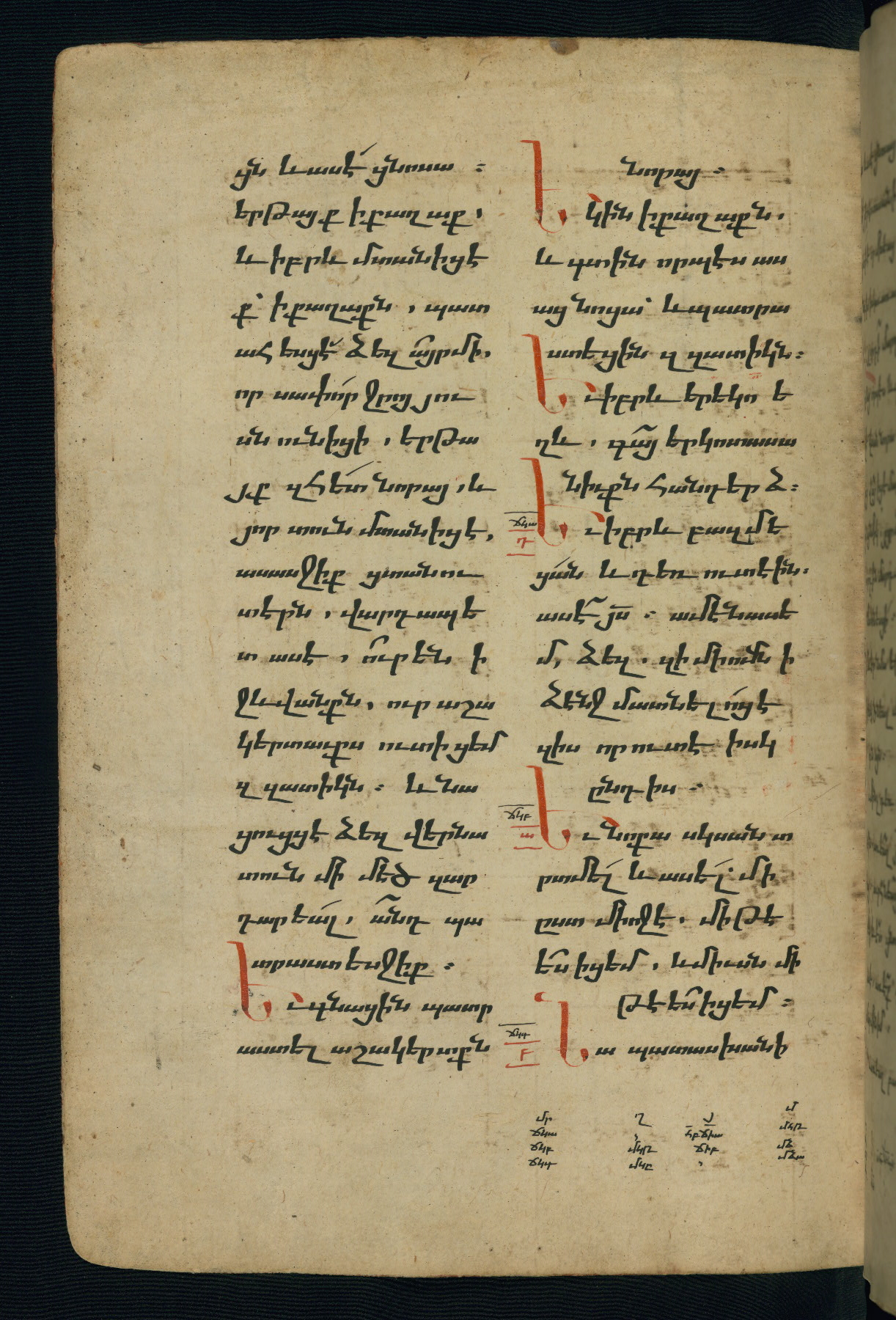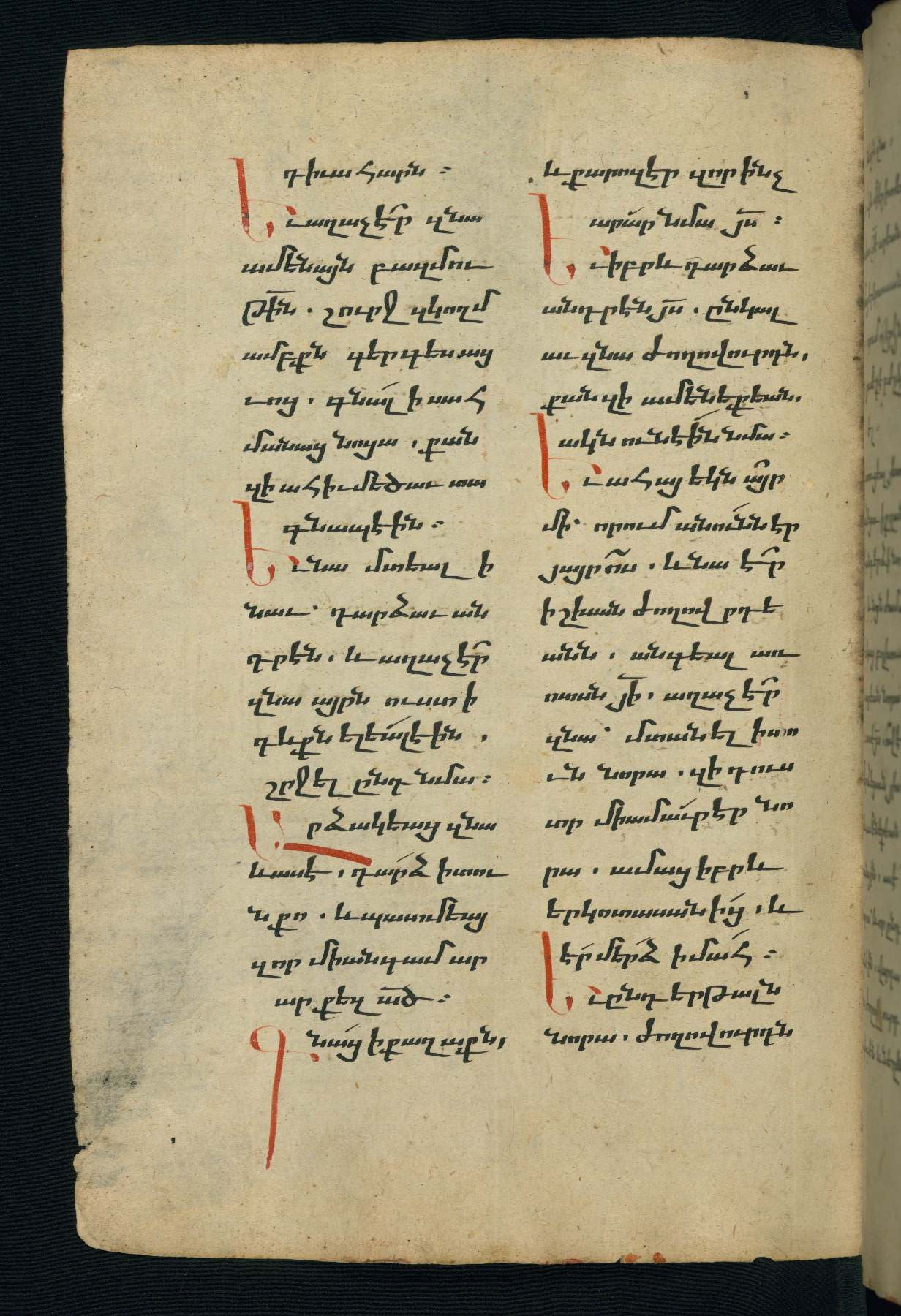 This Armenian Gospel book was produced in 904 of the Armenian era (1455 CE) at the monastery of Gamałiēl in Xizan by the scribe Yohannēs Vardapet, son of Vardan and Dilšat, and was illuminated by the priest Xačʿatur. The priest Pʿilipos commissioned the manuscript as a memorial to himself, his parents Łazar and Xutʿlumēlikʿ, and other relatives listed in the colophon on fols. 300r to 301v. Pʿilipos is depicted on fol. 14v alongside his brothers Yusēpʿ and Sultanša, as they kneel before the Virgin and Child enthroned (Theotokos). The book contains twenty-six full-page polychrome miniatures, including four Evangelist portraits; ornately designed canon tables; four decorated incipit pages; numerous marginal miniatures of floral and faunal motifs; and nineteen marginal miniatures of biblical characters or allusions to biblical narratives.