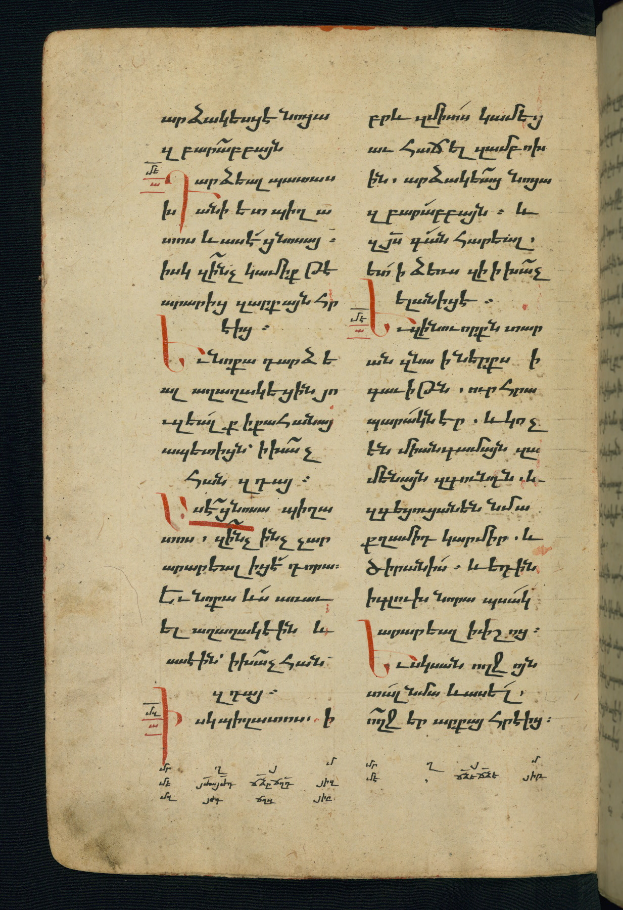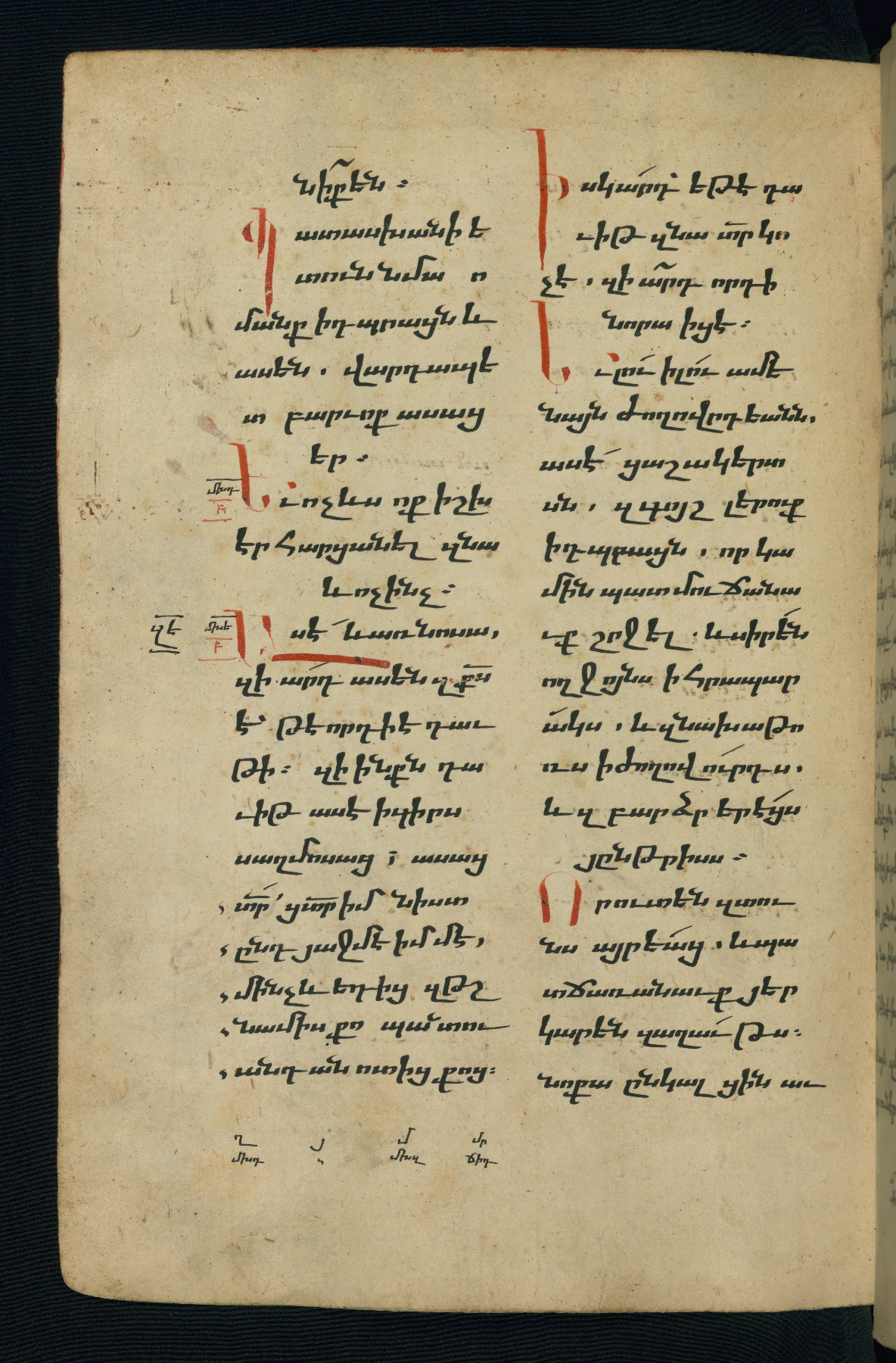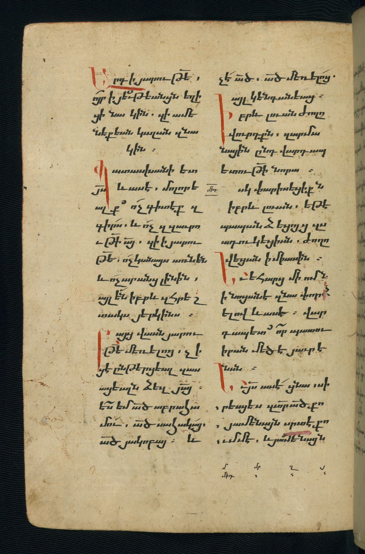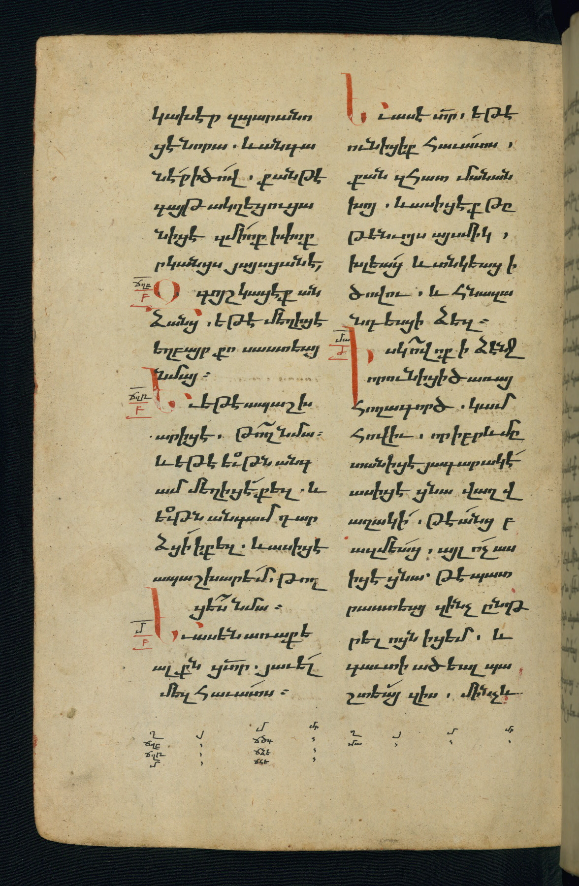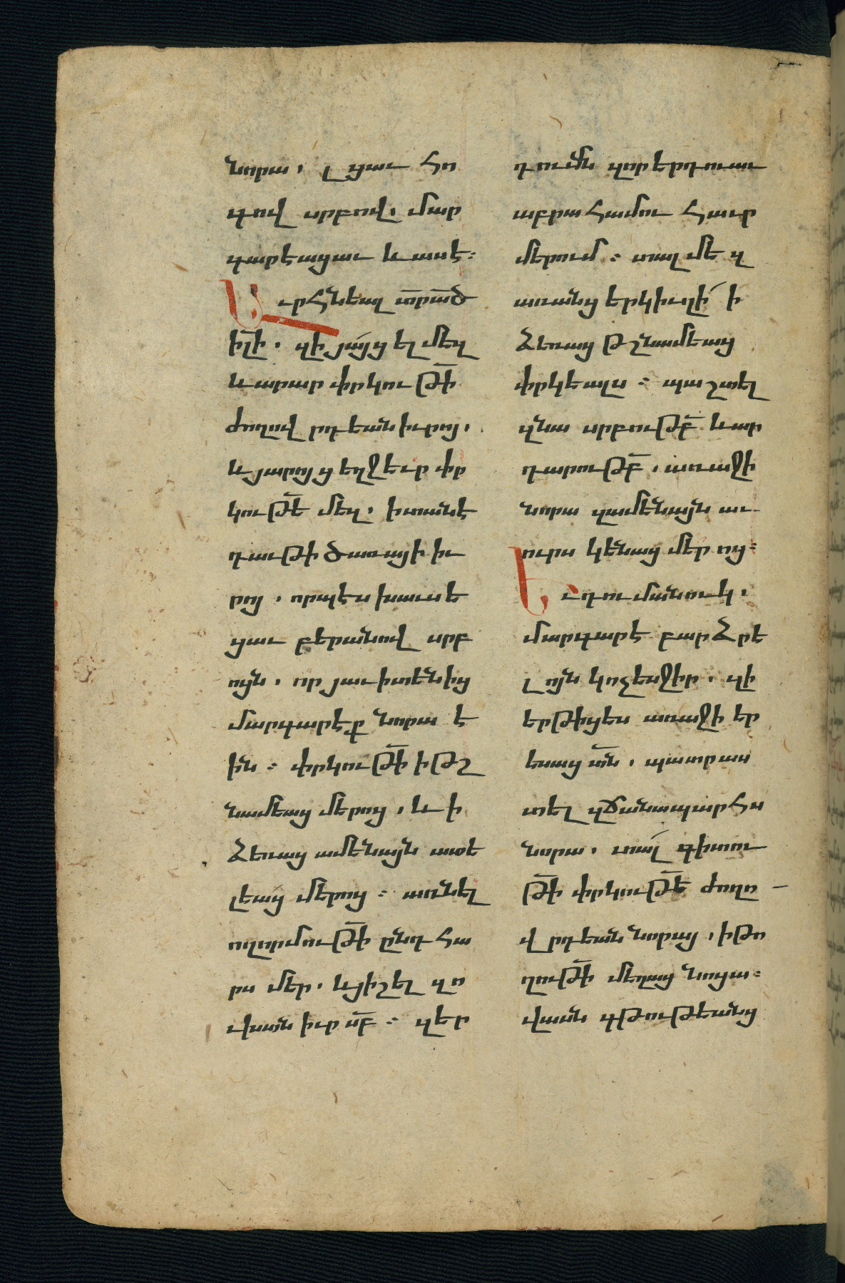 This Armenian Gospel book was produced in 904 of the Armenian era (1455 CE) at the monastery of Gamałiēl in Xizan by the scribe Yohannēs Vardapet, son of Vardan and Dilšat, and was illuminated by the priest Xačʿatur. The priest Pʿilipos commissioned the manuscript as a memorial to himself, his parents Łazar and Xutʿlumēlikʿ, and other relatives listed in the colophon on fols. 300r to 301v. Pʿilipos is depicted on fol. 14v alongside his brothers Yusēpʿ and Sultanša, as they kneel before the Virgin and Child enthroned (Theotokos). The book contains twenty-six full-page polychrome miniatures, including four Evangelist portraits; ornately designed canon tables; four decorated incipit pages; numerous marginal miniatures of floral and faunal motifs; and nineteen marginal miniatures of biblical characters or allusions to biblical narratives.