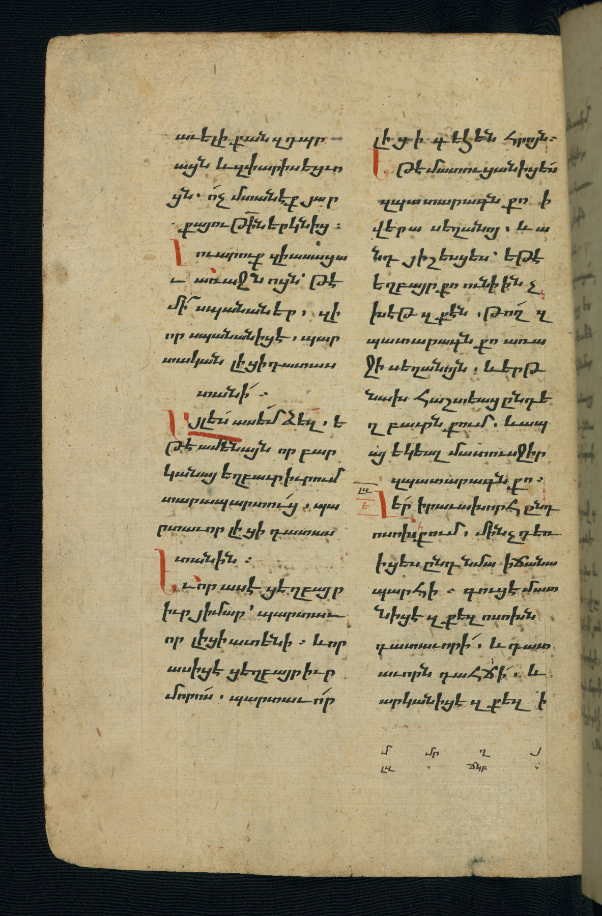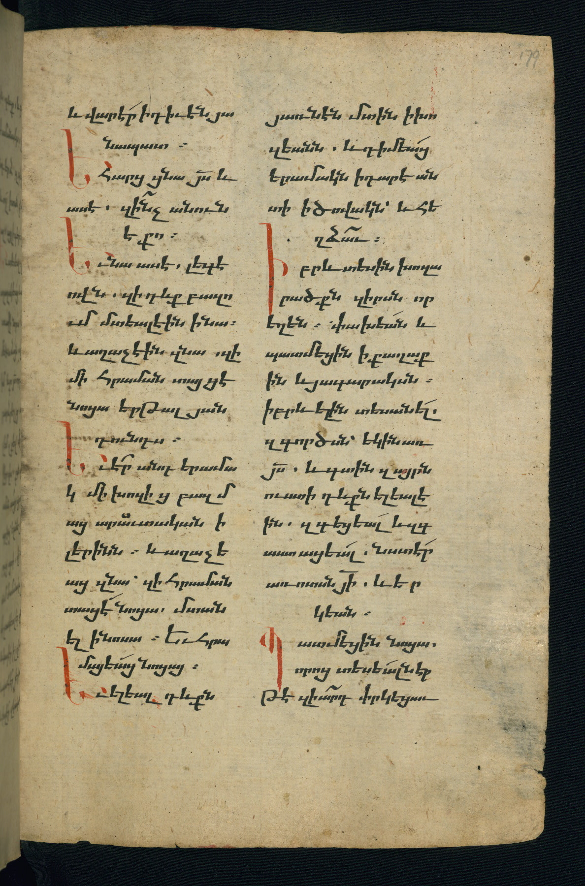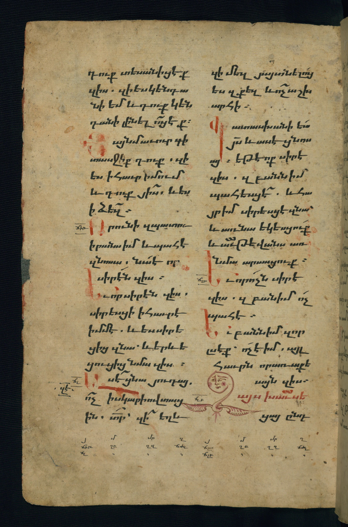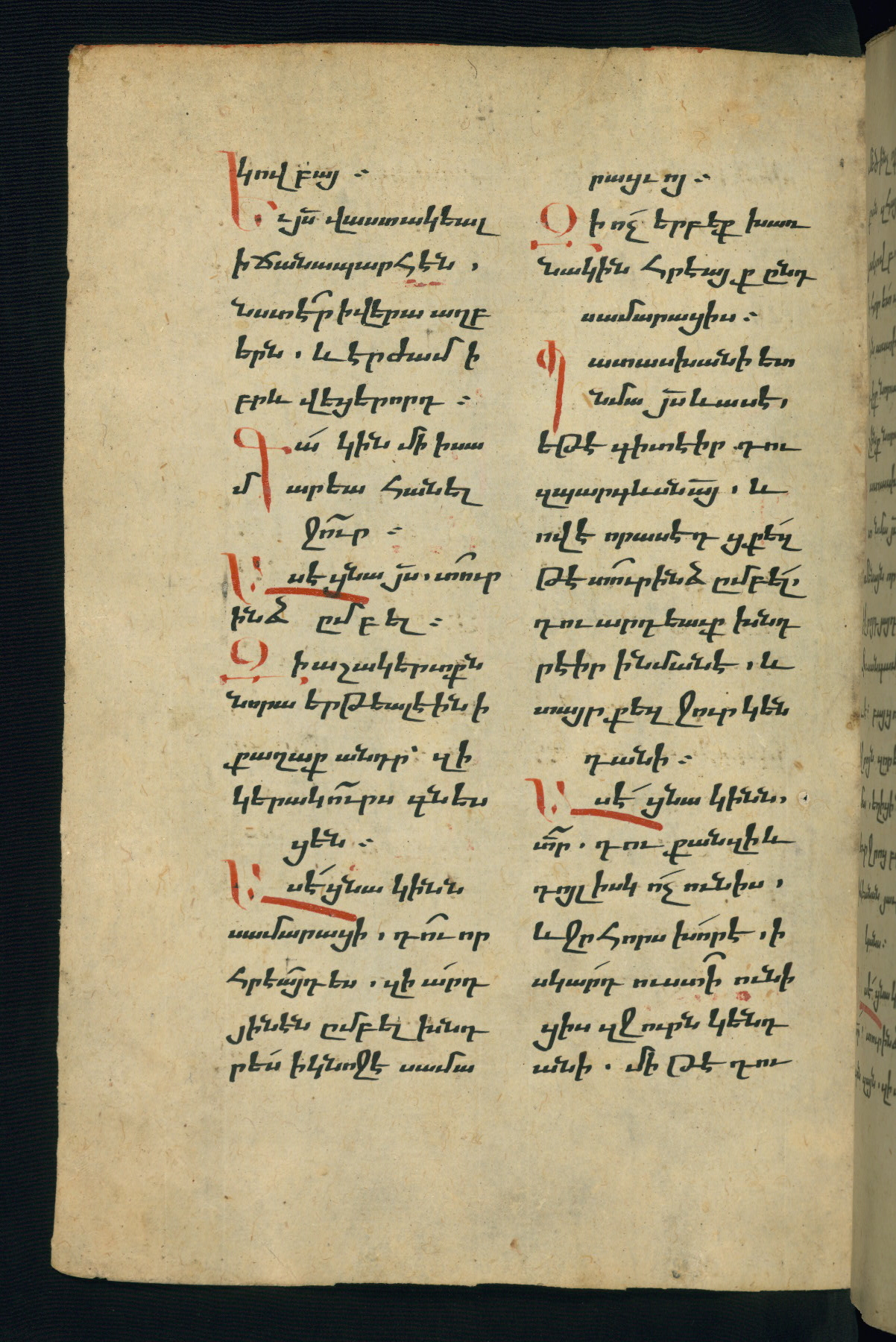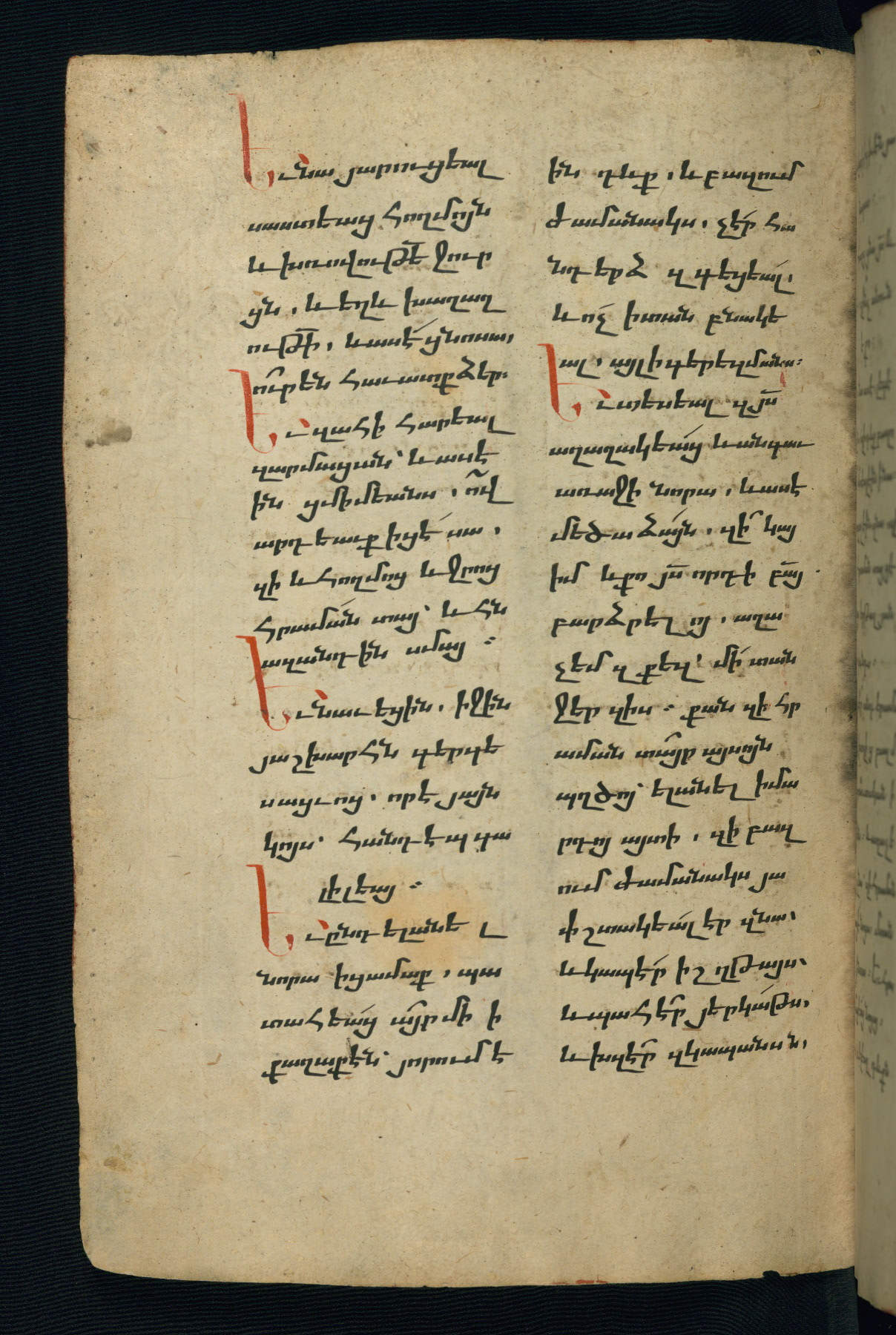 This Armenian Gospel book was produced in 904 of the Armenian era (1455 CE) at the monastery of Gamałiēl in Xizan by the scribe Yohannēs Vardapet, son of Vardan and Dilšat, and was illuminated by the priest Xačʿatur. The priest Pʿilipos commissioned the manuscript as a memorial to himself, his parents Łazar and Xutʿlumēlikʿ, and other relatives listed in the colophon on fols. 300r to 301v. Pʿilipos is depicted on fol. 14v alongside his brothers Yusēpʿ and Sultanša, as they kneel before the Virgin and Child enthroned (Theotokos). The book contains twenty-six full-page polychrome miniatures, including four Evangelist portraits; ornately designed canon tables; four decorated incipit pages; numerous marginal miniatures of floral and faunal motifs; and nineteen marginal miniatures of biblical characters or allusions to biblical narratives.