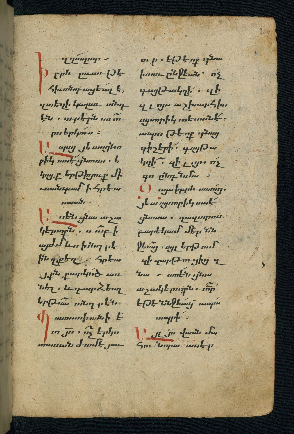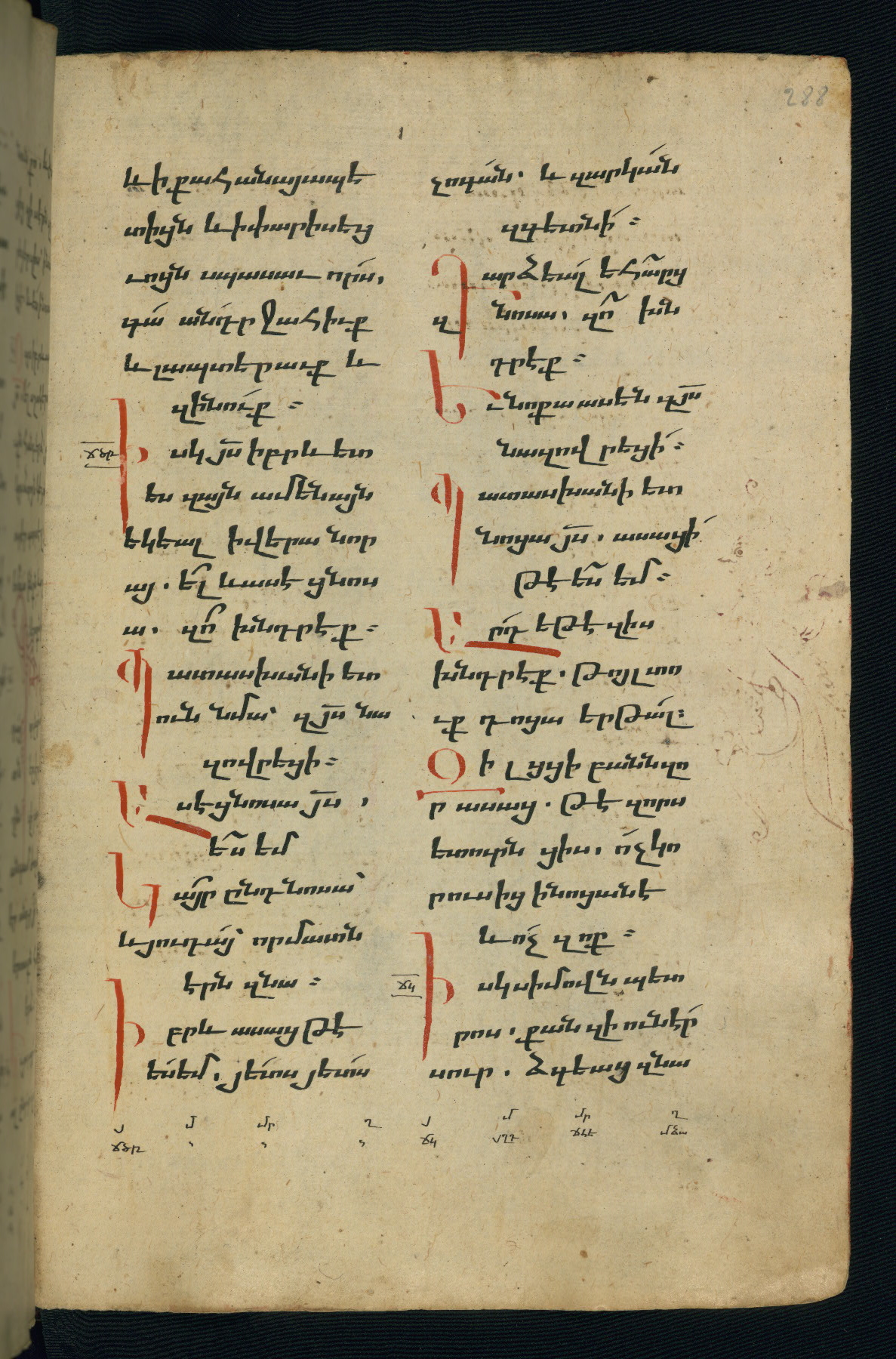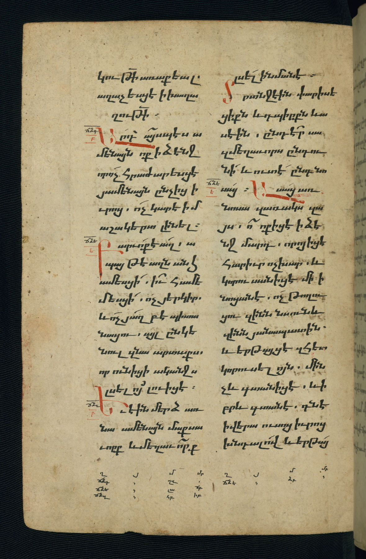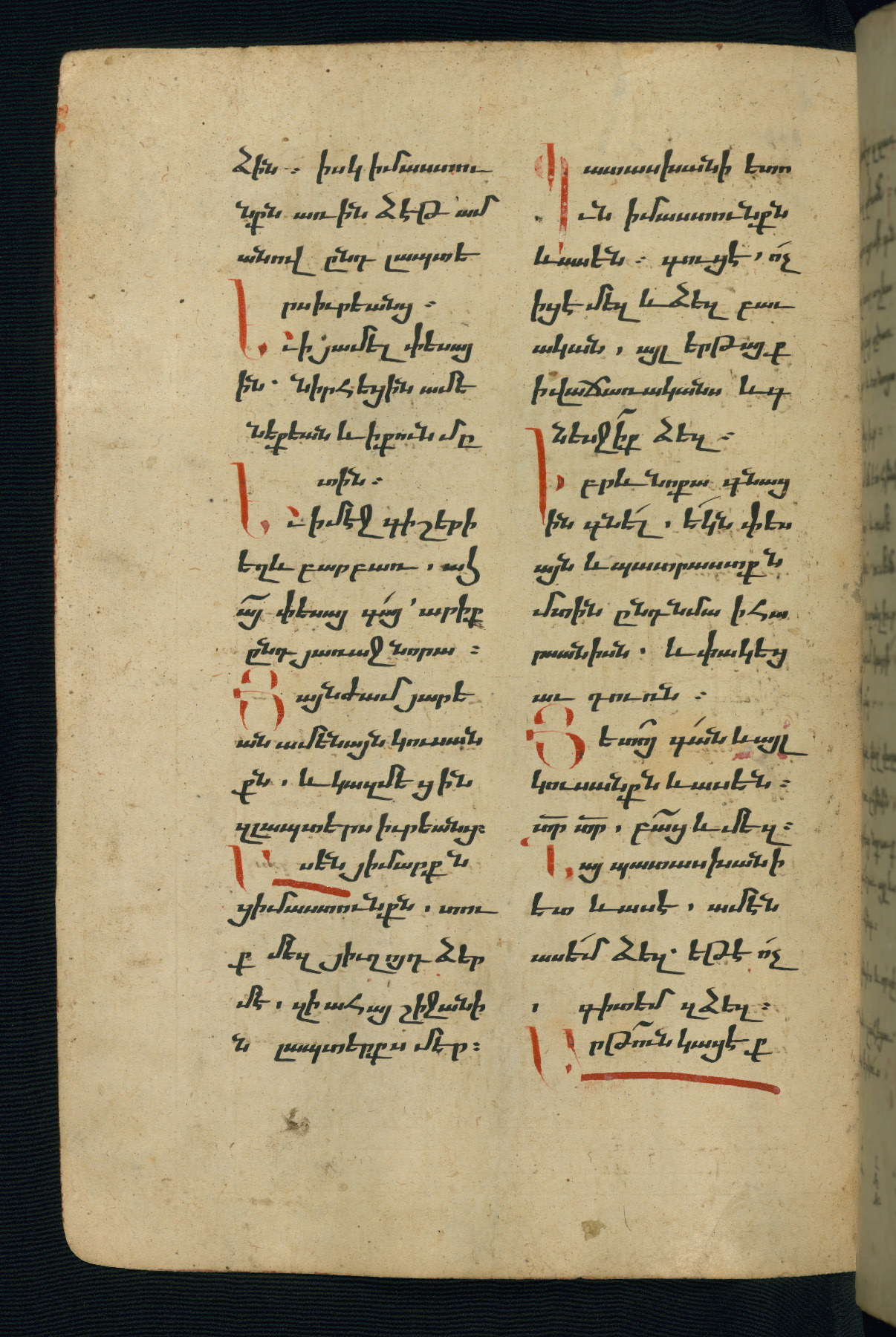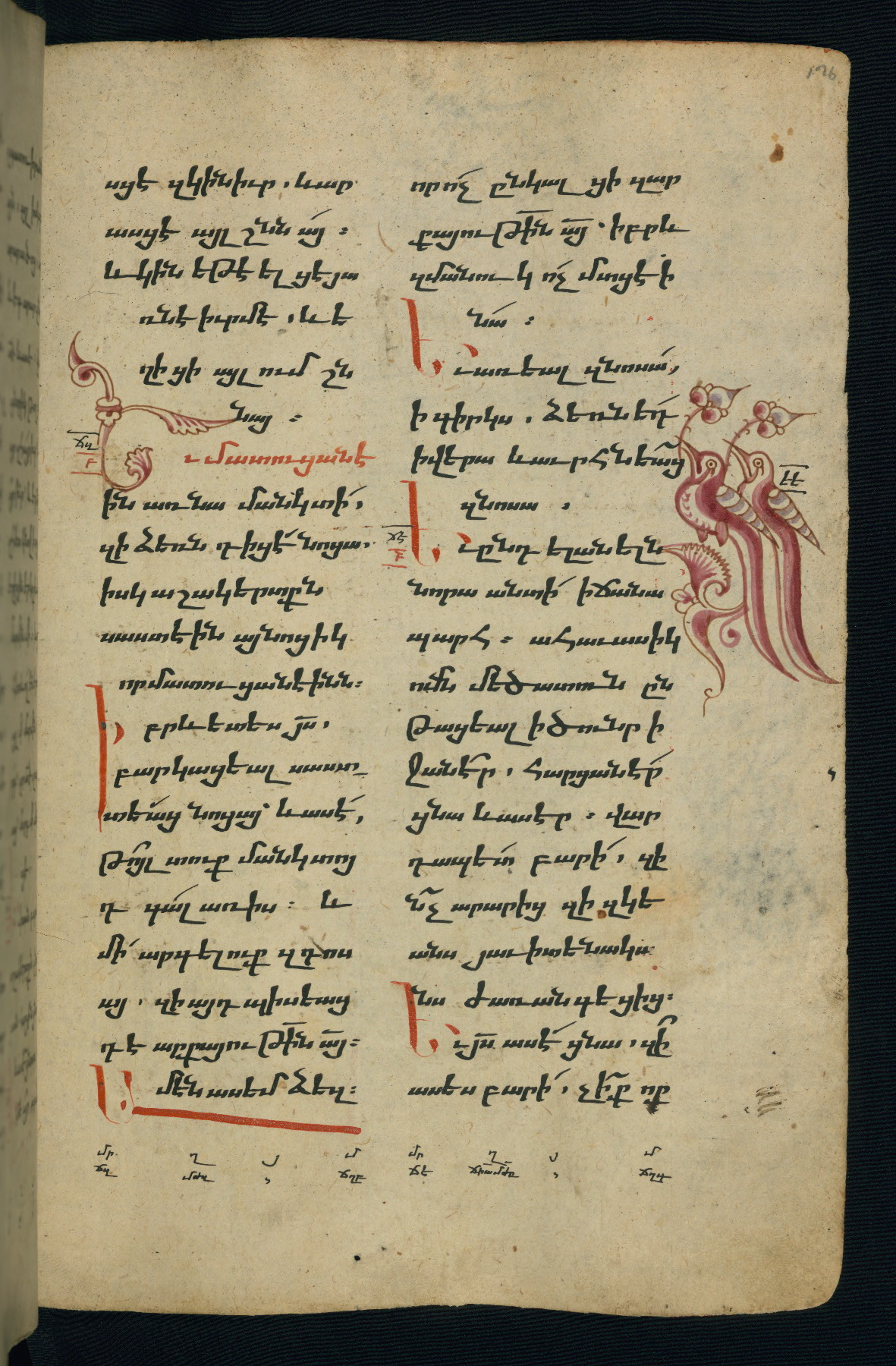 This Armenian Gospel book was produced in 904 of the Armenian era (1455 CE) at the monastery of Gamałiēl in Xizan by the scribe Yohannēs Vardapet, son of Vardan and Dilšat, and was illuminated by the priest Xačʿatur. The priest Pʿilipos commissioned the manuscript as a memorial to himself, his parents Łazar and Xutʿlumēlikʿ, and other relatives listed in the colophon on fols. 300r to 301v. Pʿilipos is depicted on fol. 14v alongside his brothers Yusēpʿ and Sultanša, as they kneel before the Virgin and Child enthroned (Theotokos). The book contains twenty-six full-page polychrome miniatures, including four Evangelist portraits; ornately designed canon tables; four decorated incipit pages; numerous marginal miniatures of floral and faunal motifs; and nineteen marginal miniatures of biblical characters or allusions to biblical narratives.