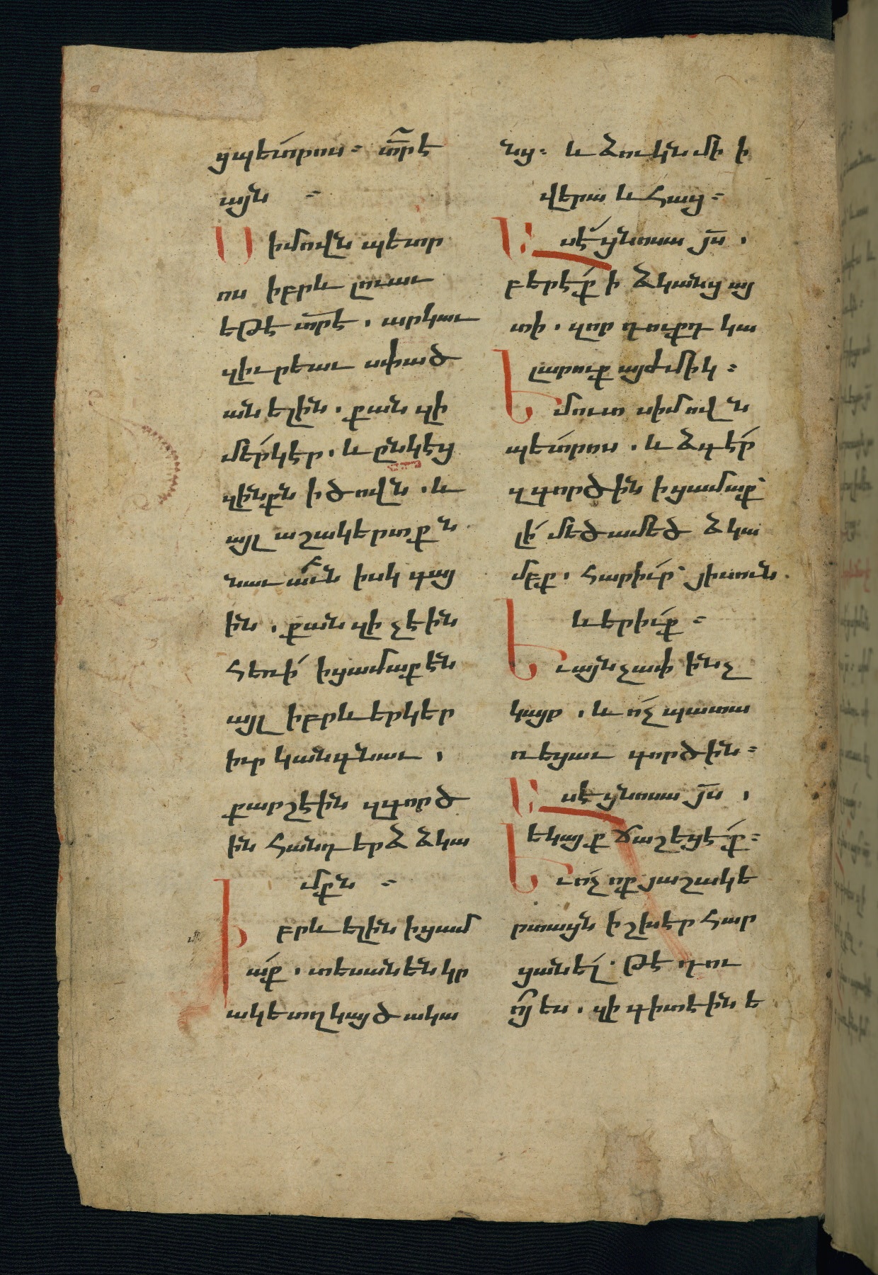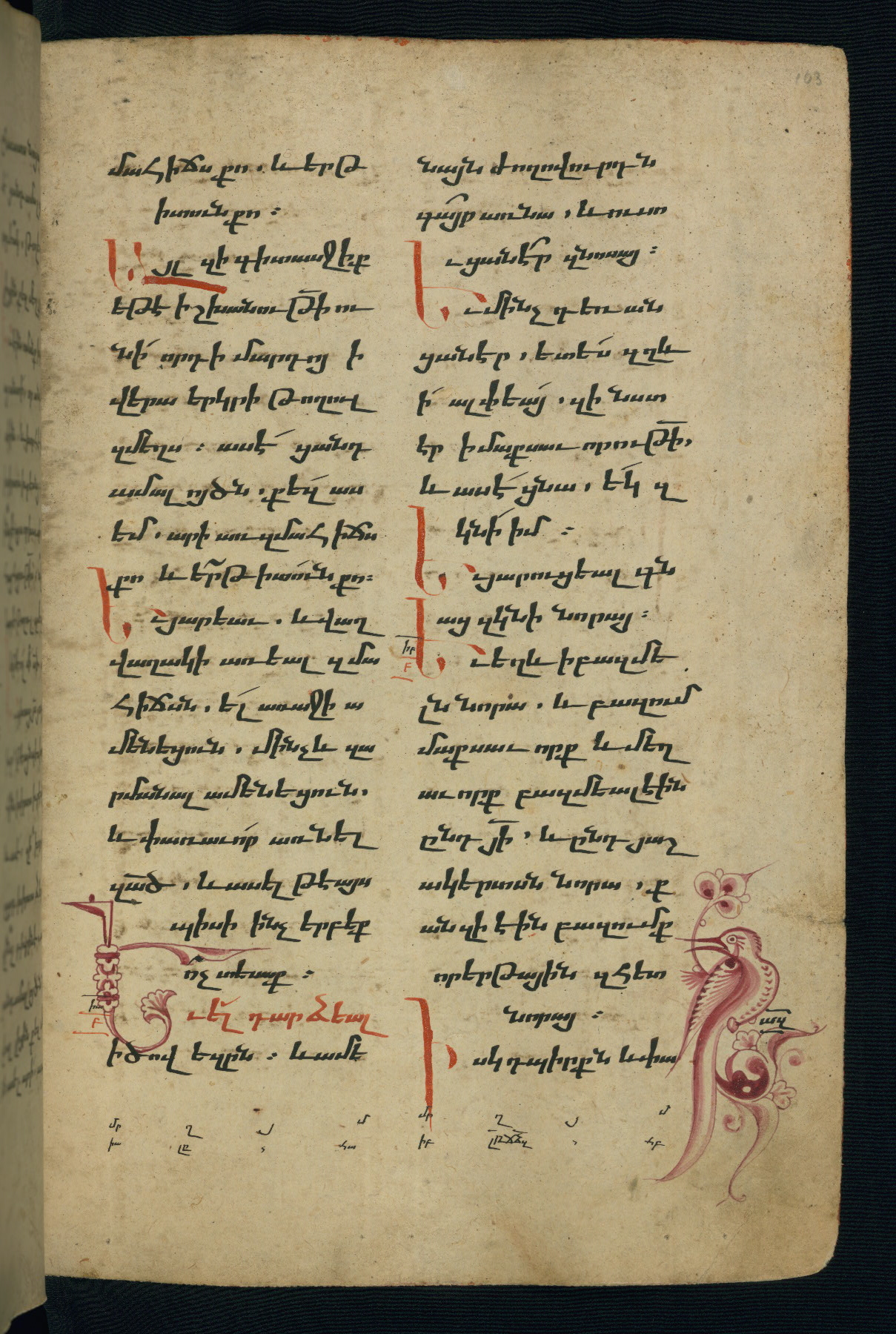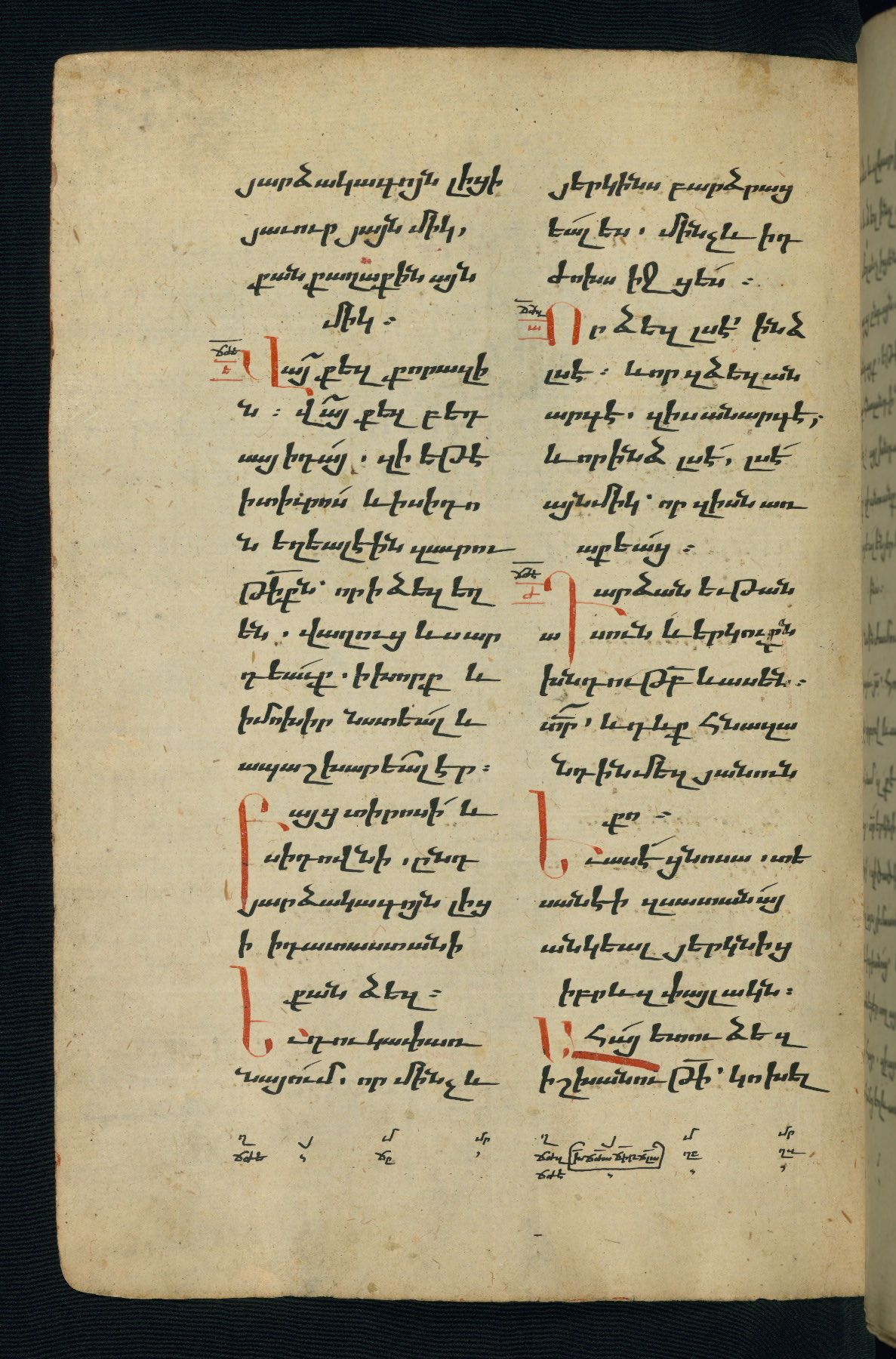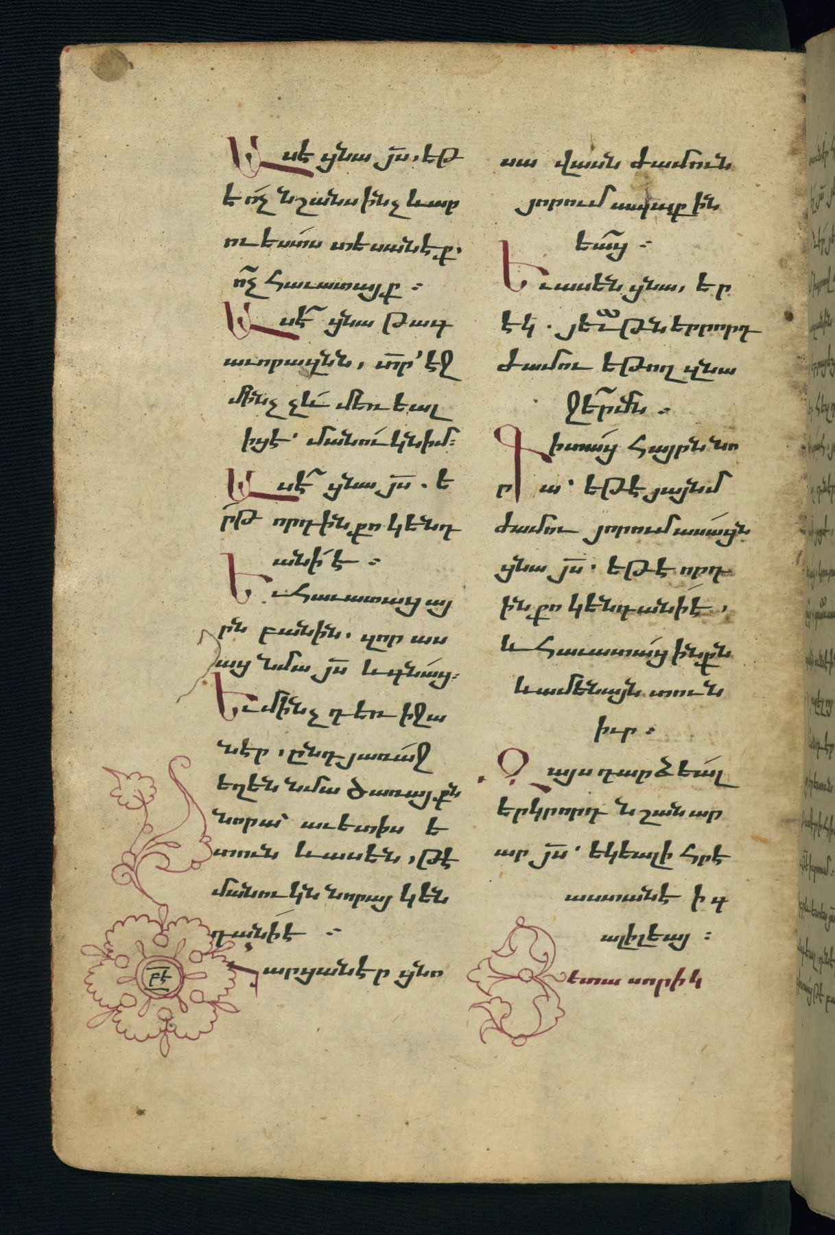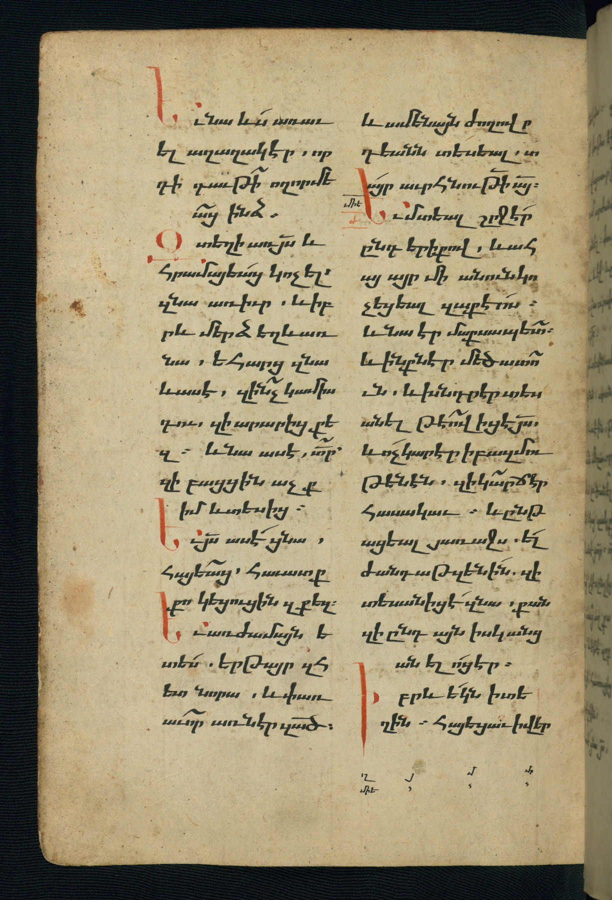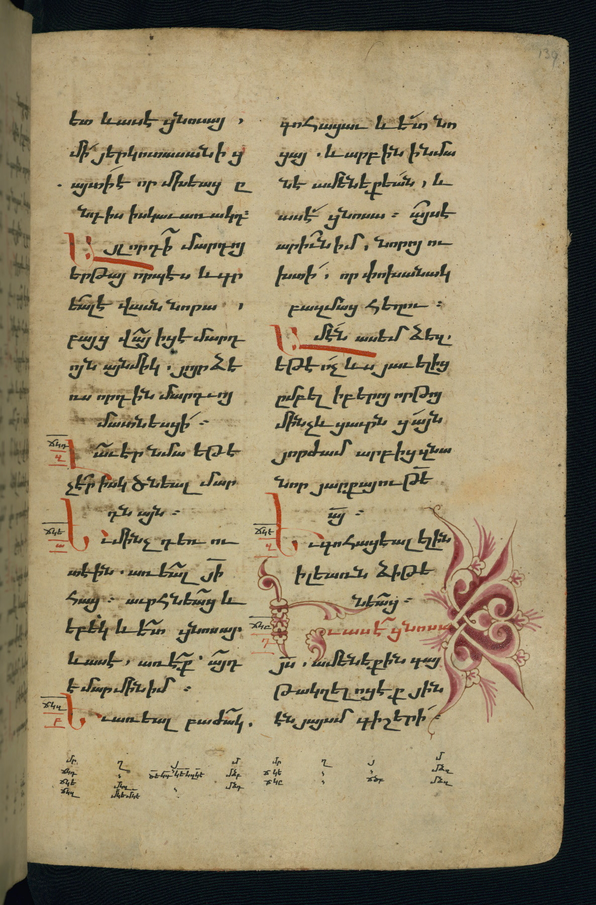 This Armenian Gospel book was produced in 904 of the Armenian era (1455 CE) at the monastery of Gamałiēl in Xizan by the scribe Yohannēs Vardapet, son of Vardan and Dilšat, and was illuminated by the priest Xačʿatur. The priest Pʿilipos commissioned the manuscript as a memorial to himself, his parents Łazar and Xutʿlumēlikʿ, and other relatives listed in the colophon on fols. 300r to 301v. Pʿilipos is depicted on fol. 14v alongside his brothers Yusēpʿ and Sultanša, as they kneel before the Virgin and Child enthroned (Theotokos). The book contains twenty-six full-page polychrome miniatures, including four Evangelist portraits; ornately designed canon tables; four decorated incipit pages; numerous marginal miniatures of floral and faunal motifs; and nineteen marginal miniatures of biblical characters or allusions to biblical narratives.
