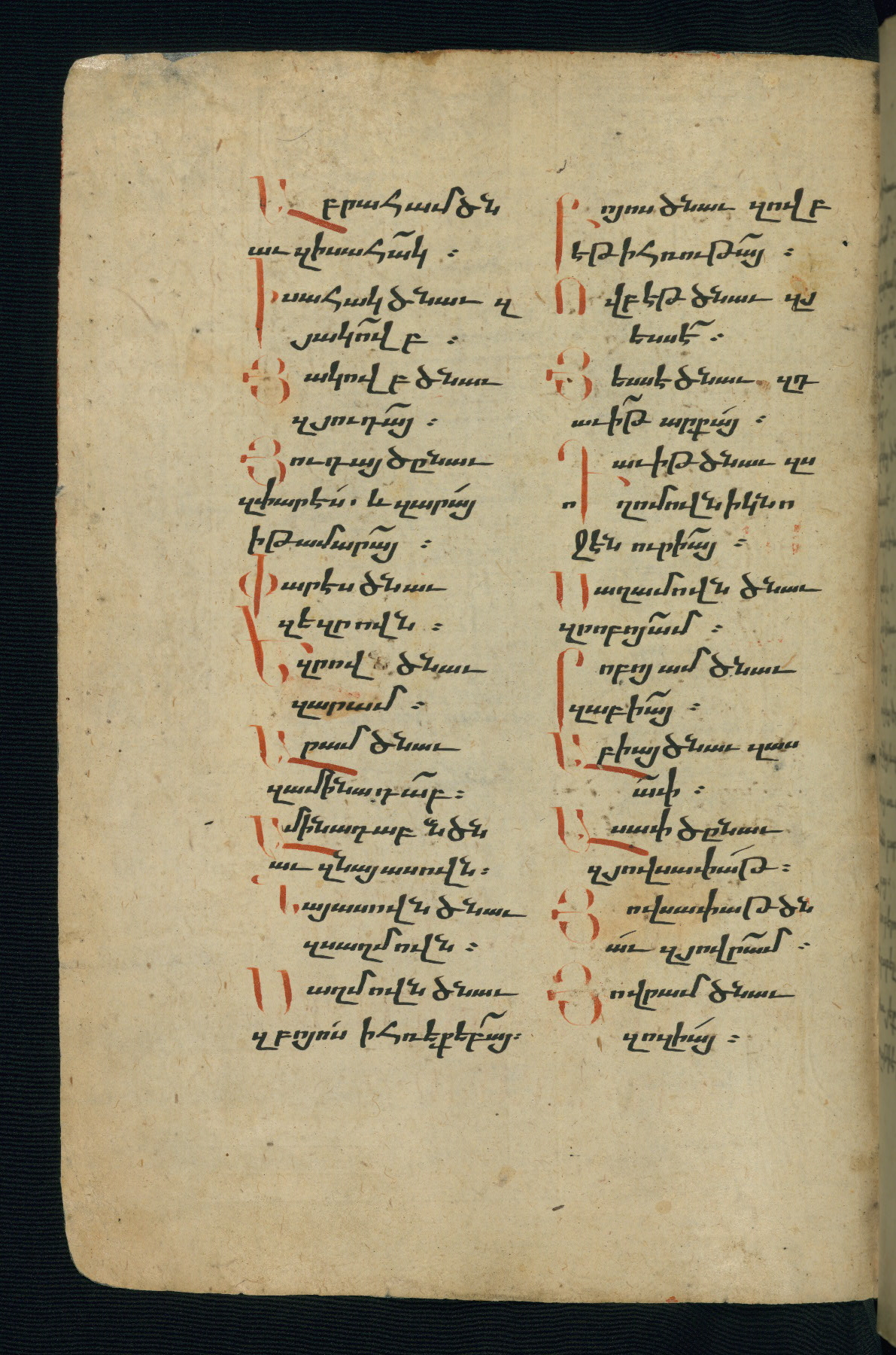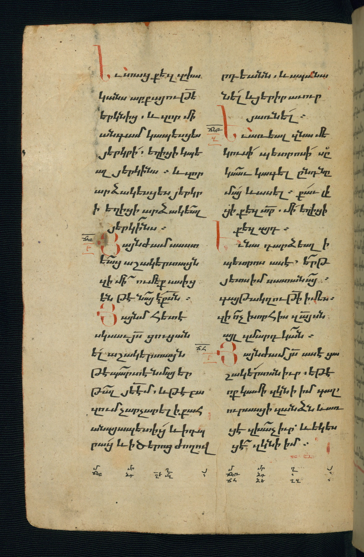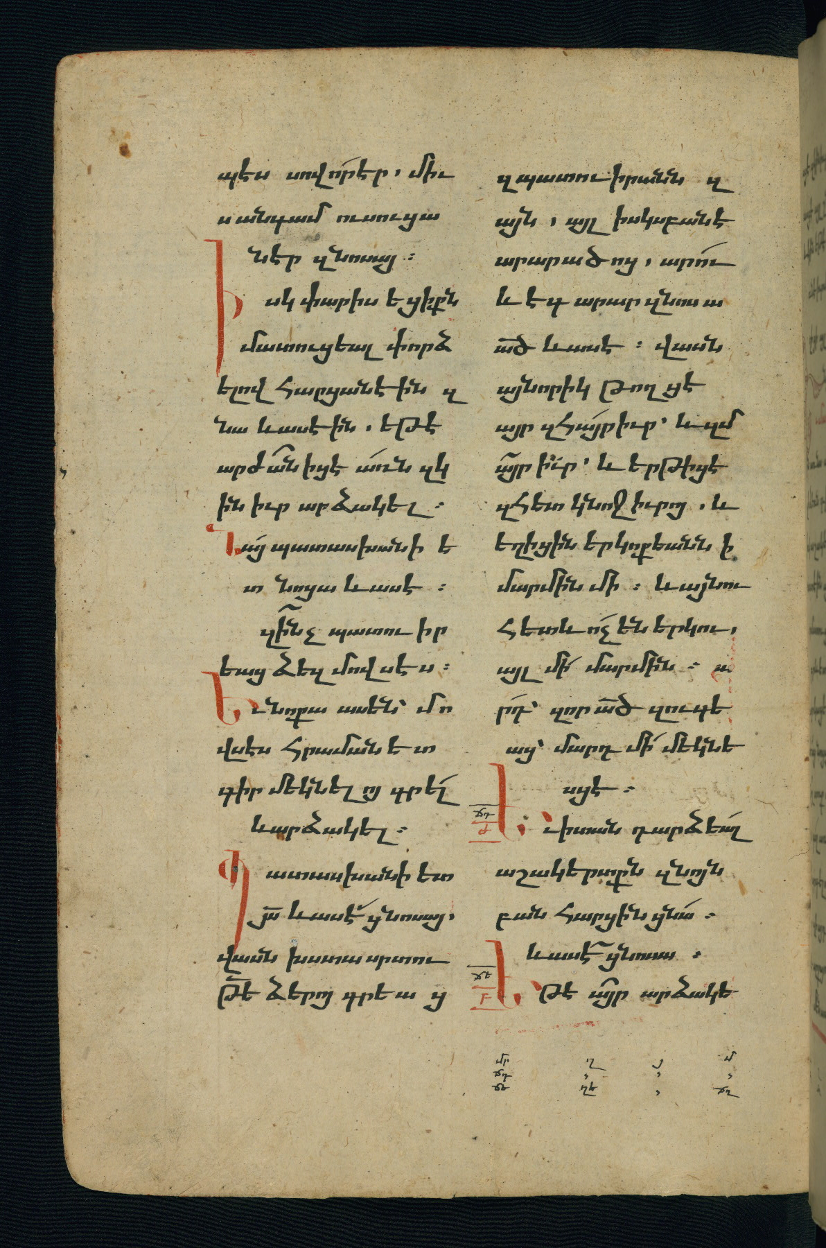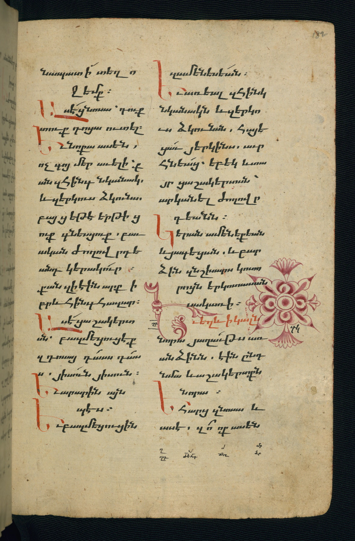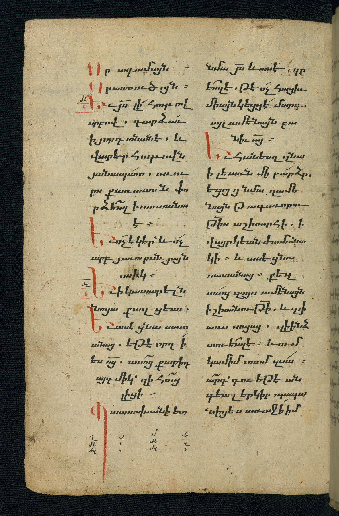 This Armenian Gospel book was produced in 904 of the Armenian era (1455 CE) at the monastery of Gamałiēl in Xizan by the scribe Yohannēs Vardapet, son of Vardan and Dilšat, and was illuminated by the priest Xačʿatur. The priest Pʿilipos commissioned the manuscript as a memorial to himself, his parents Łazar and Xutʿlumēlikʿ, and other relatives listed in the colophon on fols. 300r to 301v. Pʿilipos is depicted on fol. 14v alongside his brothers Yusēpʿ and Sultanša, as they kneel before the Virgin and Child enthroned (Theotokos). The book contains twenty-six full-page polychrome miniatures, including four Evangelist portraits; ornately designed canon tables; four decorated incipit pages; numerous marginal miniatures of floral and faunal motifs; and nineteen marginal miniatures of biblical characters or allusions to biblical narratives.