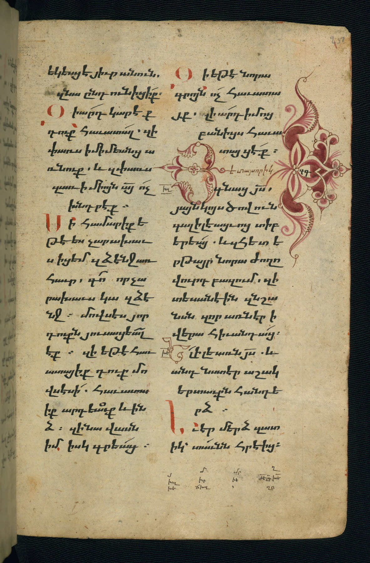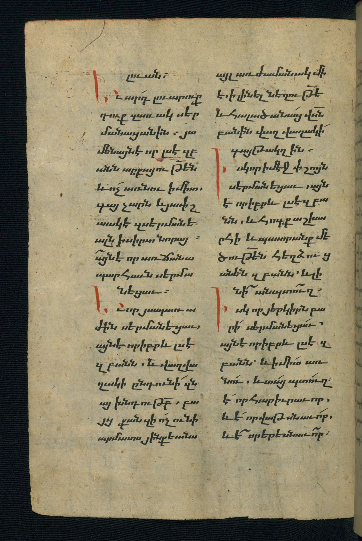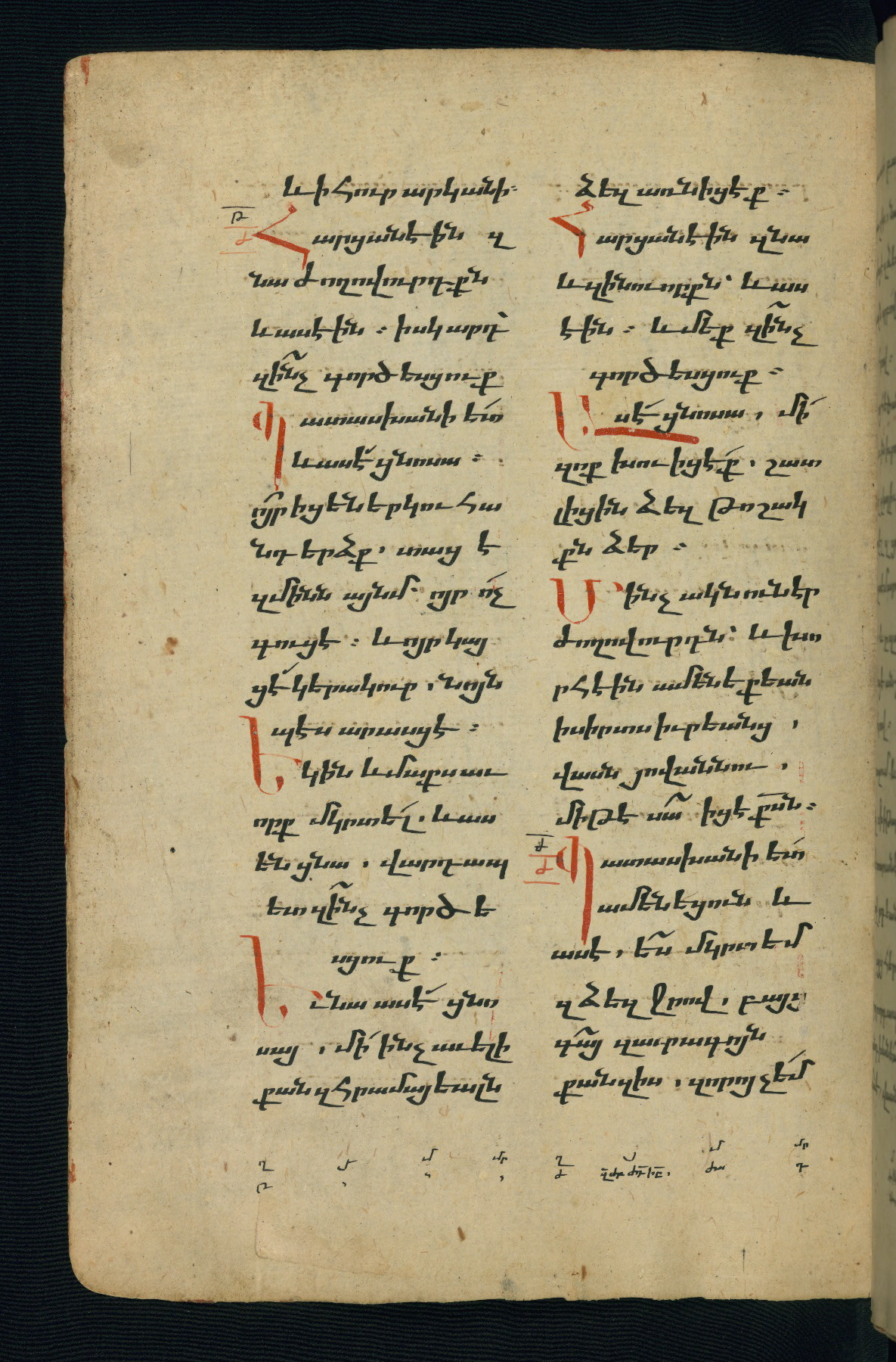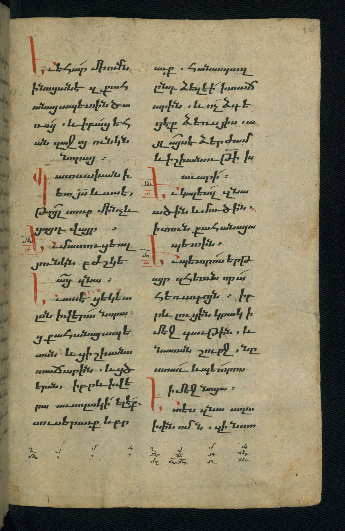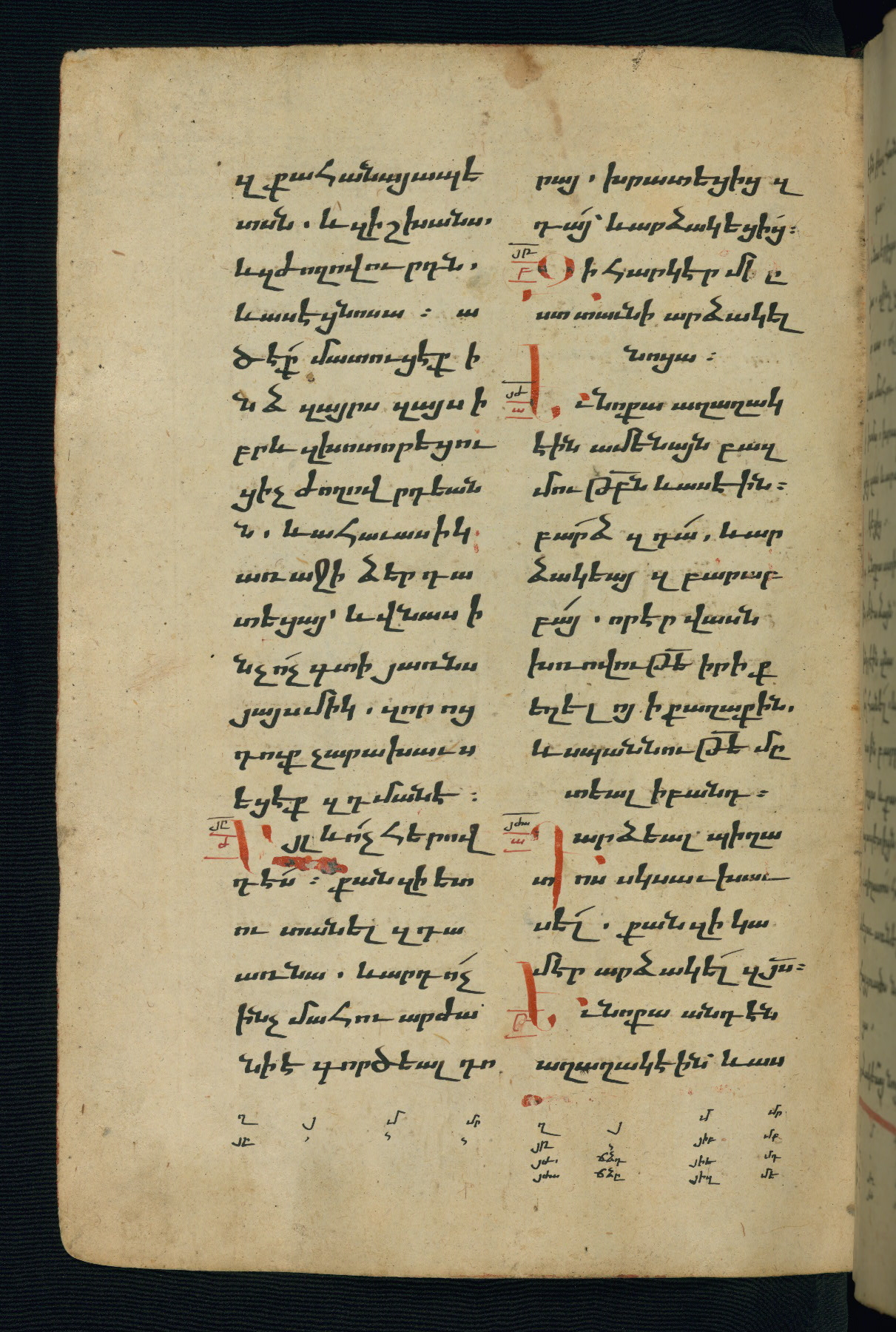 This Armenian Gospel book was produced in 904 of the Armenian era (1455 CE) at the monastery of Gamałiēl in Xizan by the scribe Yohannēs Vardapet, son of Vardan and Dilšat, and was illuminated by the priest Xačʿatur. The priest Pʿilipos commissioned the manuscript as a memorial to himself, his parents Łazar and Xutʿlumēlikʿ, and other relatives listed in the colophon on fols. 300r to 301v. Pʿilipos is depicted on fol. 14v alongside his brothers Yusēpʿ and Sultanša, as they kneel before the Virgin and Child enthroned (Theotokos). The book contains twenty-six full-page polychrome miniatures, including four Evangelist portraits; ornately designed canon tables; four decorated incipit pages; numerous marginal miniatures of floral and faunal motifs; and nineteen marginal miniatures of biblical characters or allusions to biblical narratives.