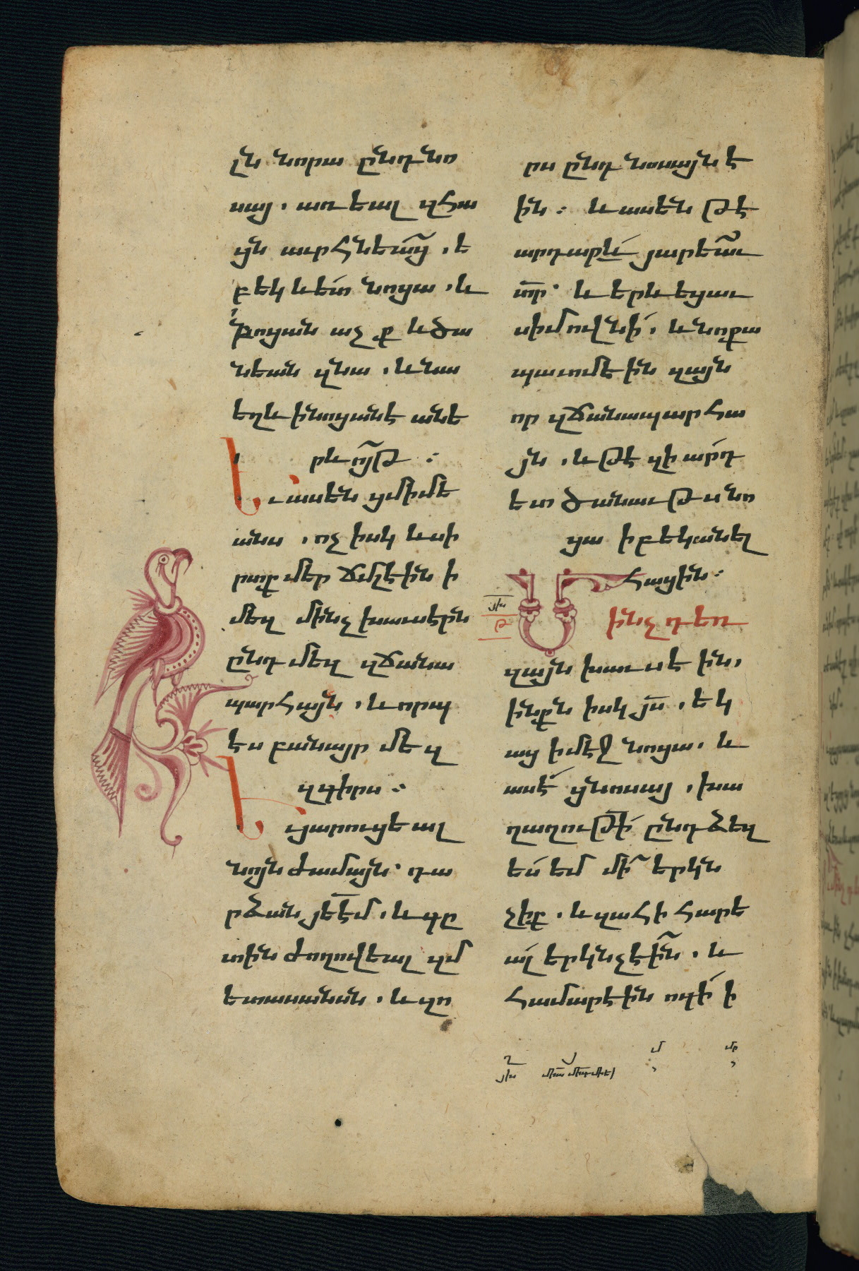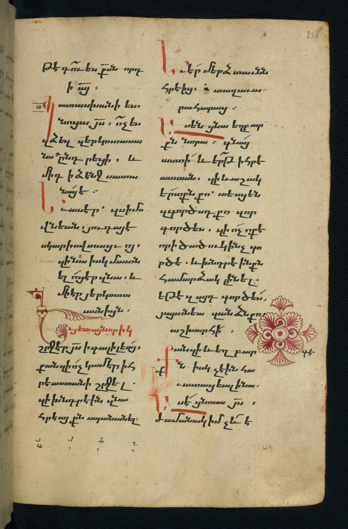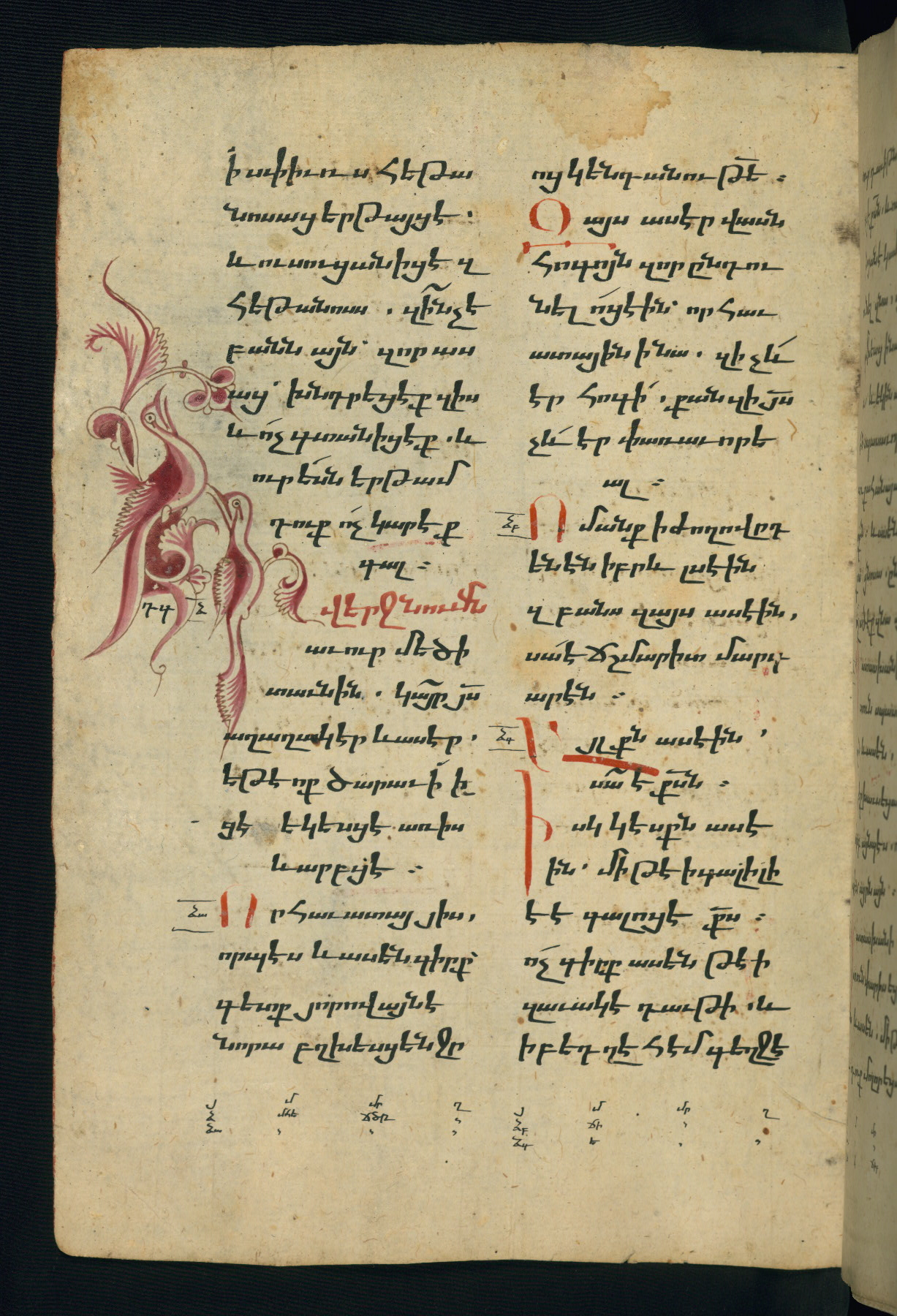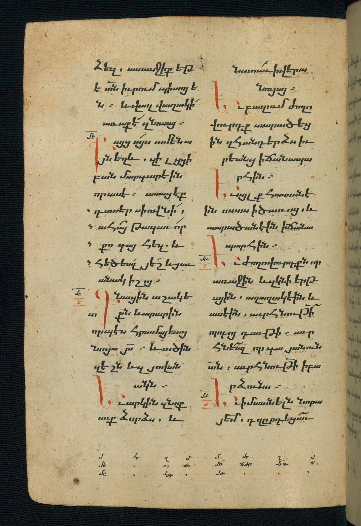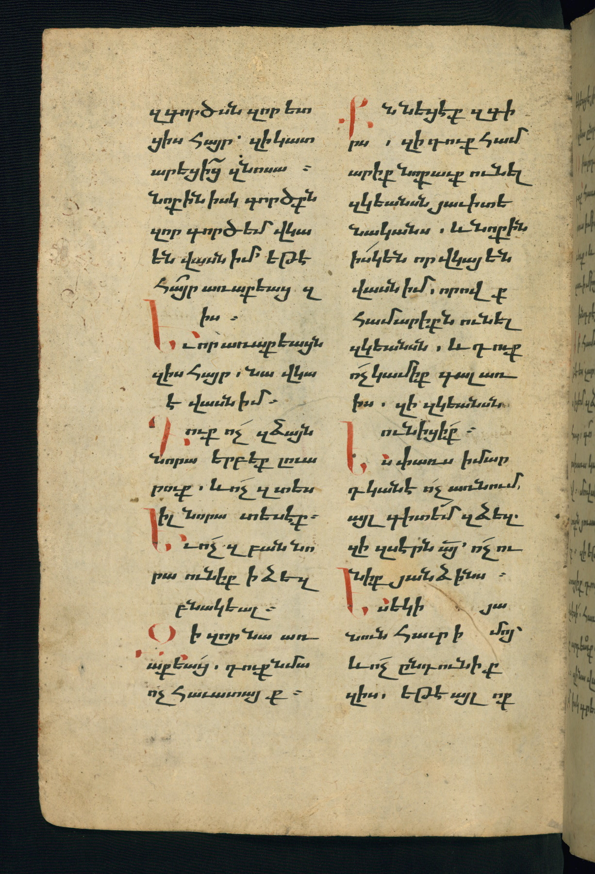 This Armenian Gospel book was produced in 904 of the Armenian era (1455 CE) at the monastery of Gamałiēl in Xizan by the scribe Yohannēs Vardapet, son of Vardan and Dilšat, and was illuminated by the priest Xačʿatur. The priest Pʿilipos commissioned the manuscript as a memorial to himself, his parents Łazar and Xutʿlumēlikʿ, and other relatives listed in the colophon on fols. 300r to 301v. Pʿilipos is depicted on fol. 14v alongside his brothers Yusēpʿ and Sultanša, as they kneel before the Virgin and Child enthroned (Theotokos). The book contains twenty-six full-page polychrome miniatures, including four Evangelist portraits; ornately designed canon tables; four decorated incipit pages; numerous marginal miniatures of floral and faunal motifs; and nineteen marginal miniatures of biblical characters or allusions to biblical narratives.