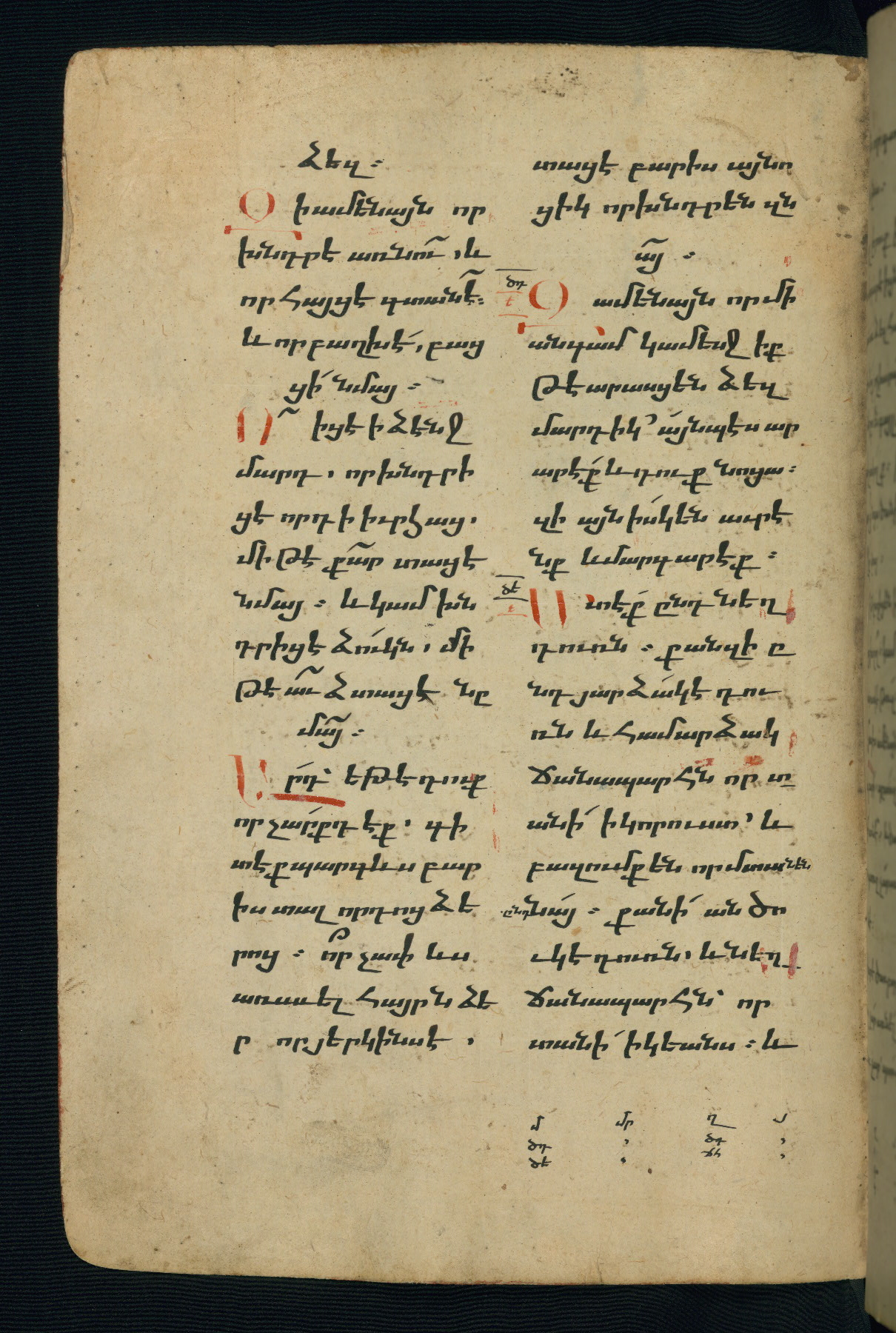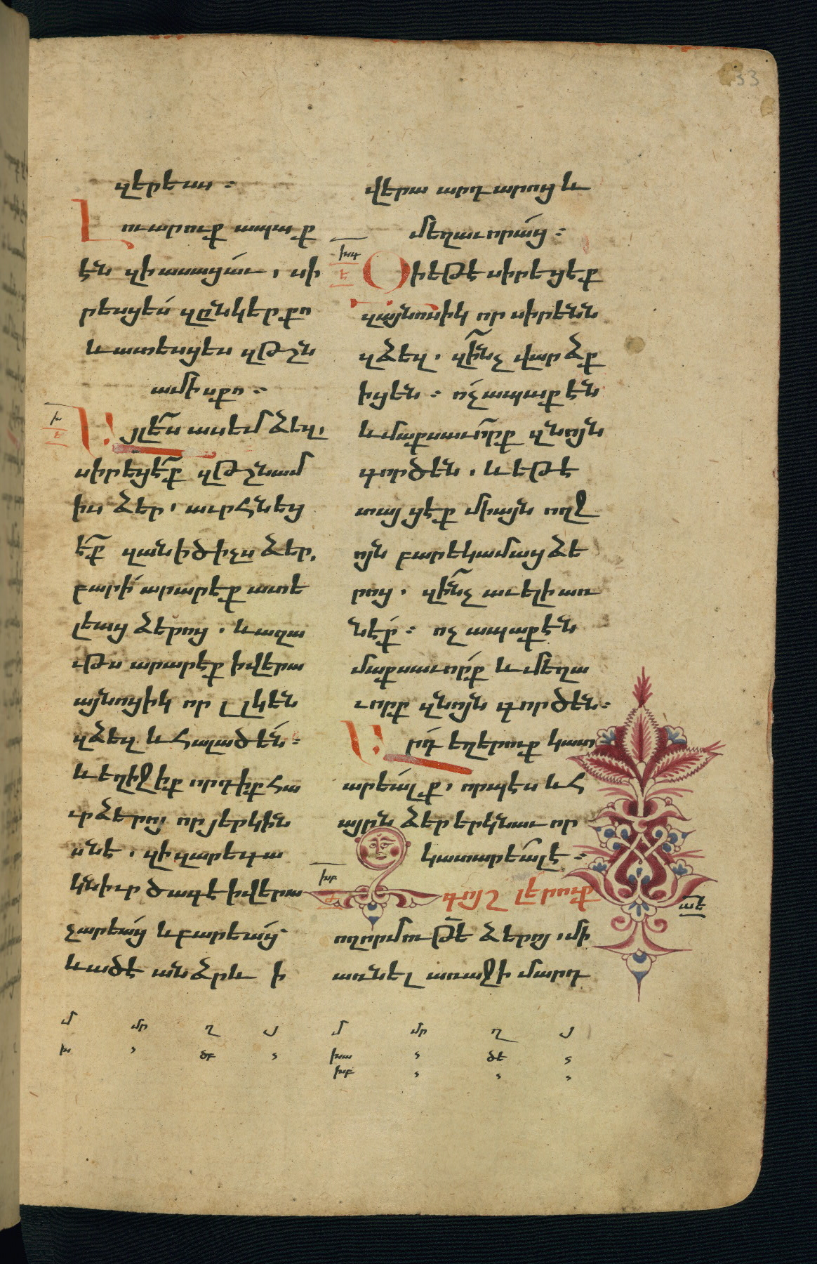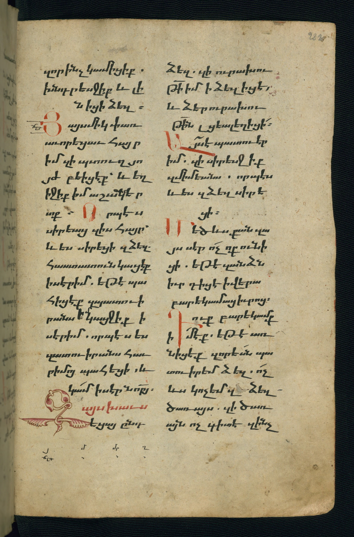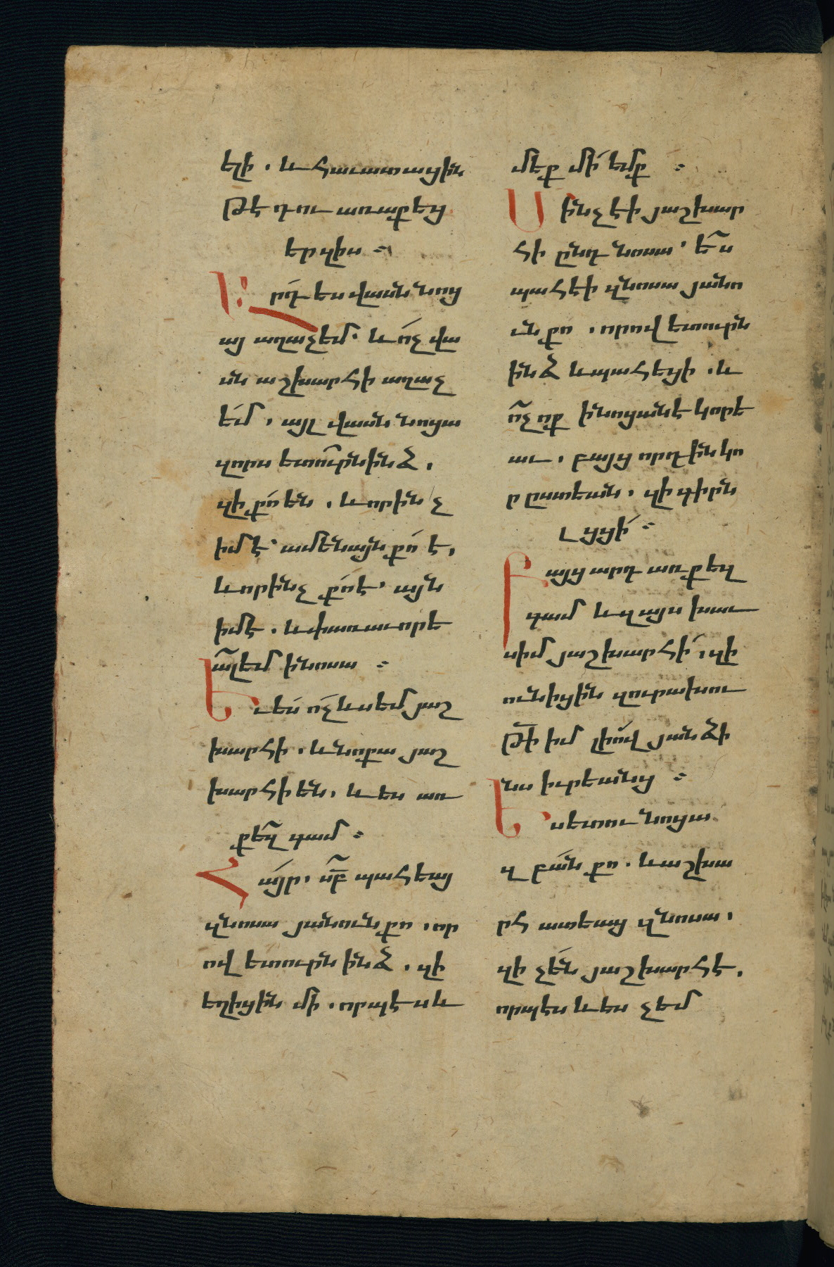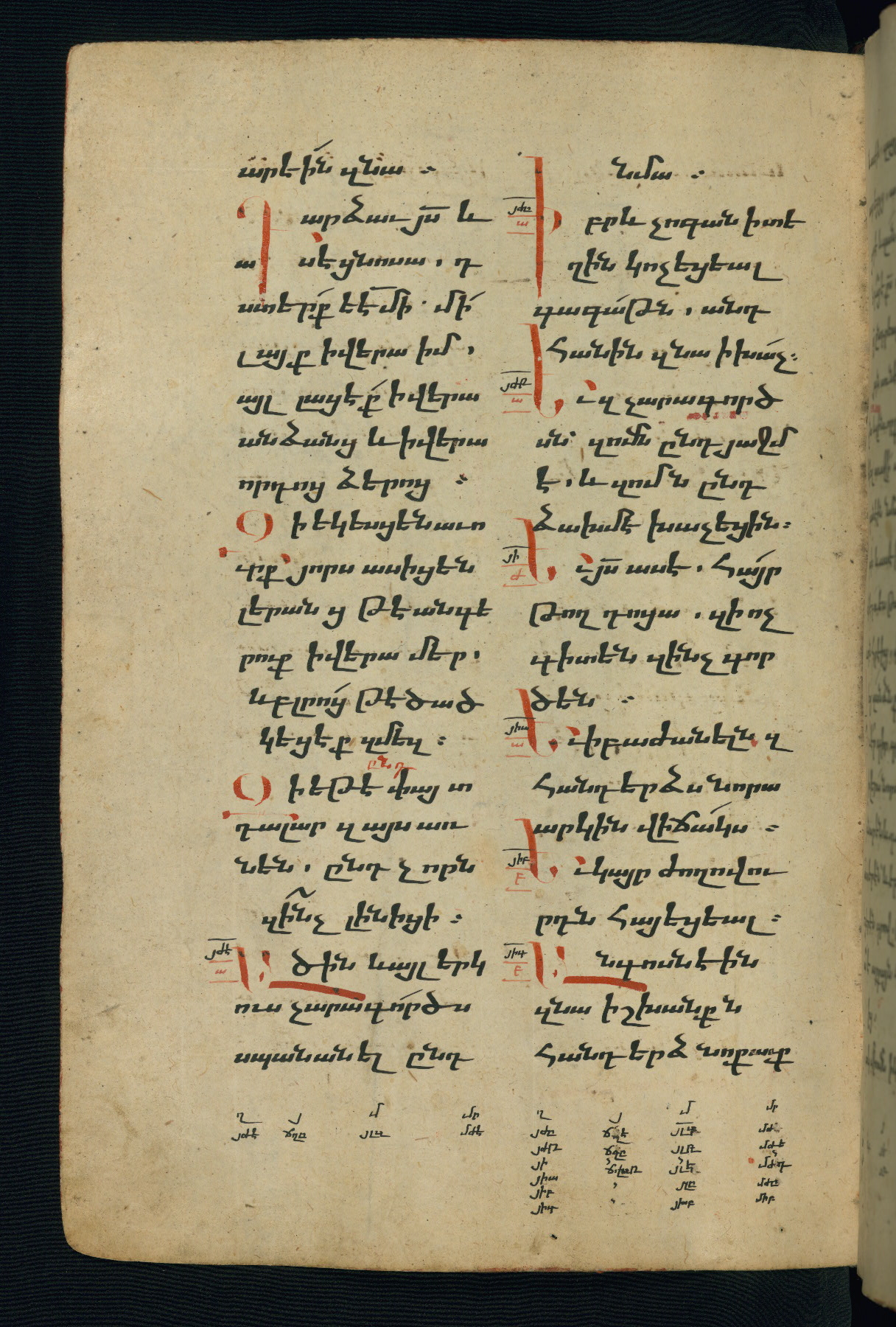This Armenian Gospel book was produced in 904 of the Armenian era (1455 CE) at the monastery of Gamałiēl in Xizan by the scribe Yohannēs Vardapet, son of Vardan and Dilšat, and was illuminated by the priest Xačʿatur. The priest Pʿilipos commissioned the manuscript as a memorial to himself, his parents Łazar and Xutʿlumēlikʿ, and other relatives listed in the colophon on fols. 300r to 301v. Pʿilipos is depicted on fol. 14v alongside his brothers Yusēpʿ and Sultanša, as they kneel before the Virgin and Child enthroned (Theotokos). The book contains twenty-six full-page polychrome miniatures, including four Evangelist portraits; ornately designed canon tables; four decorated incipit pages; numerous marginal miniatures of floral and faunal motifs; and nineteen marginal miniatures of biblical characters or allusions to biblical narratives.