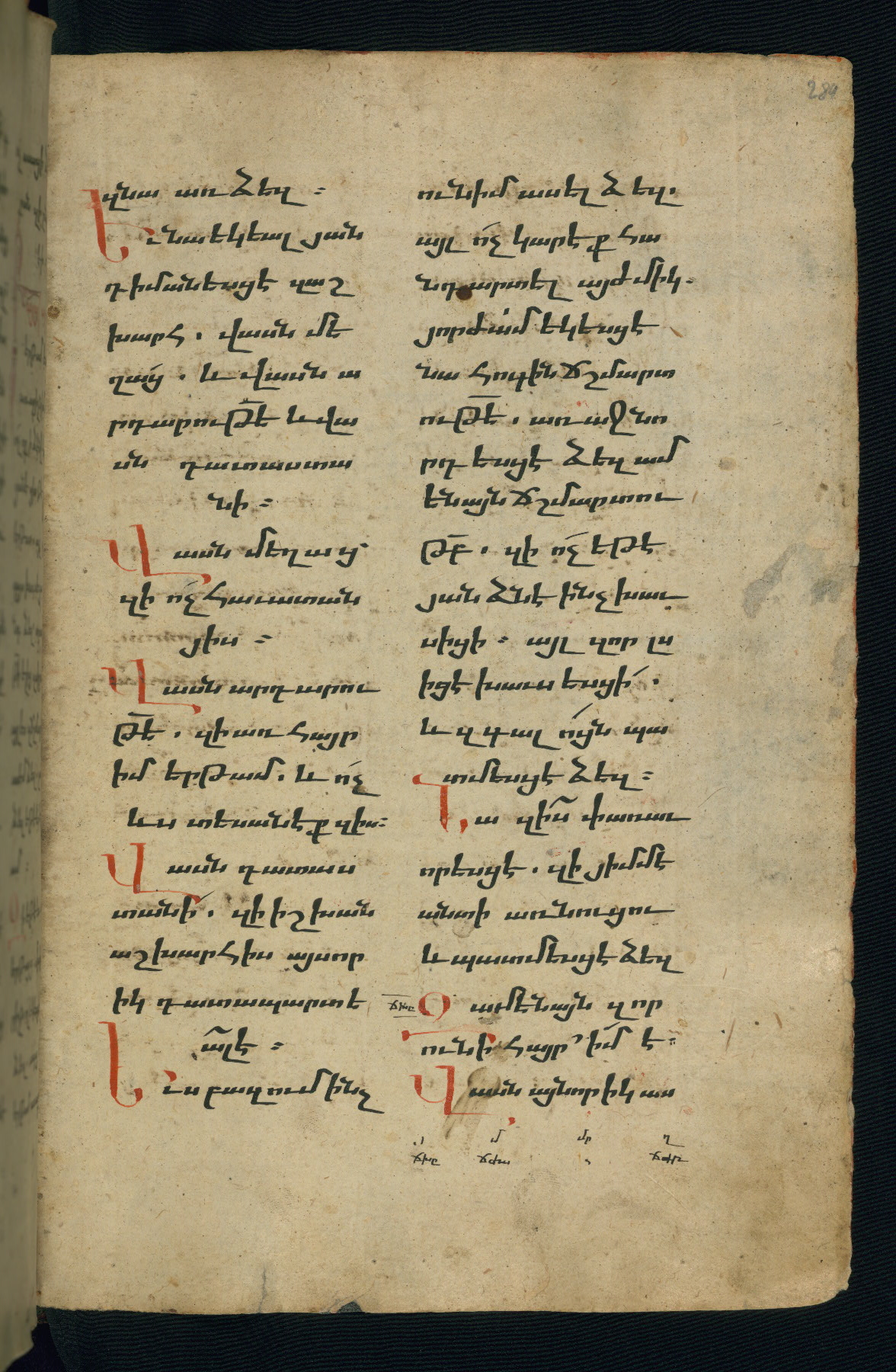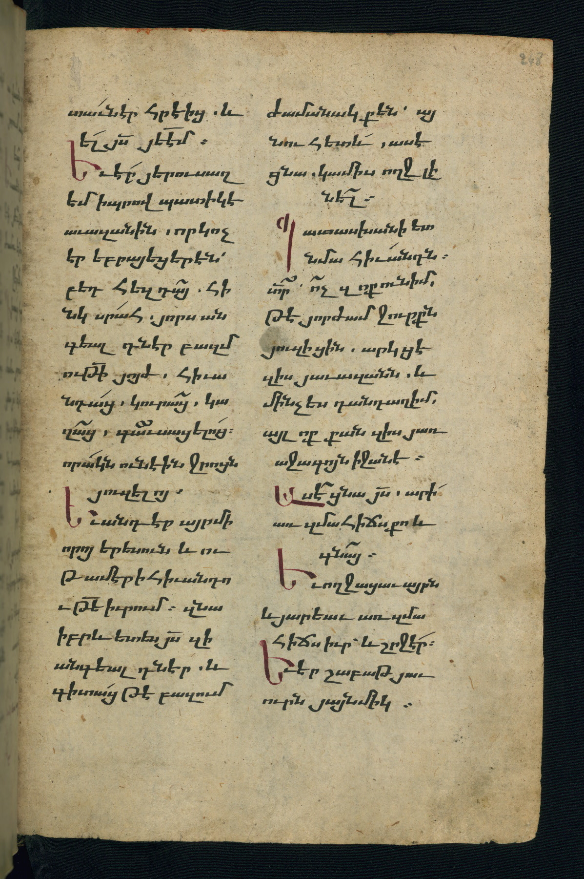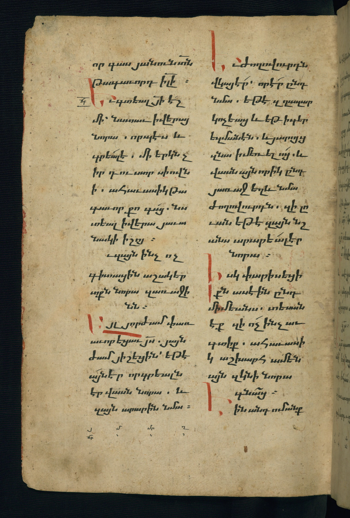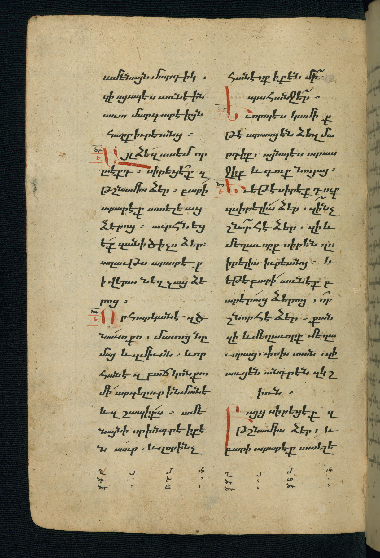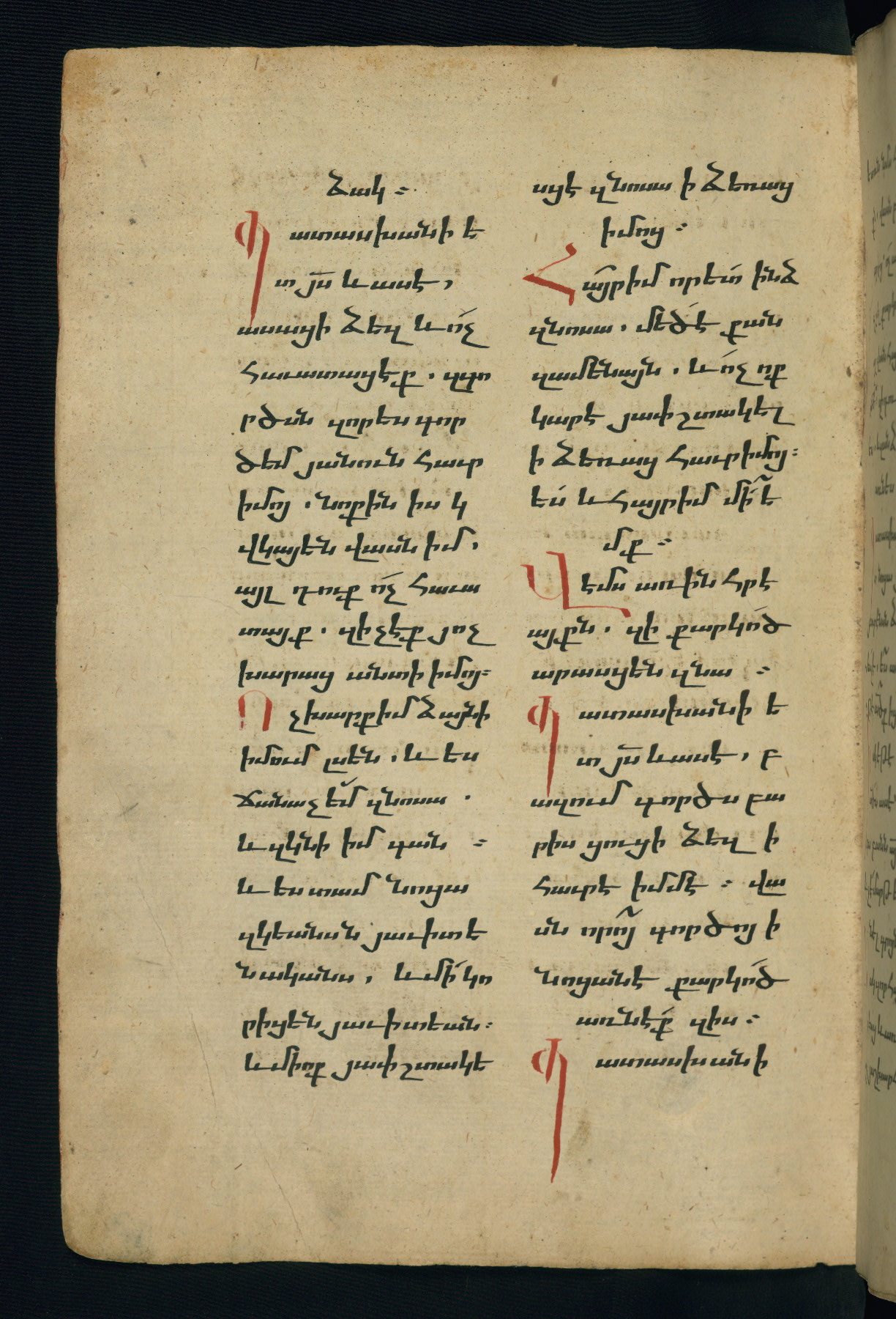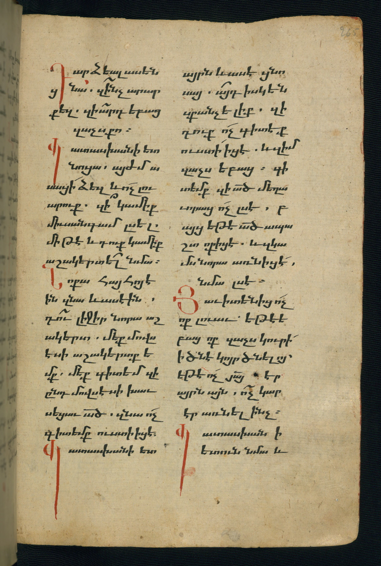 This Armenian Gospel book was produced in 904 of the Armenian era (1455 CE) at the monastery of Gamałiēl in Xizan by the scribe Yohannēs Vardapet, son of Vardan and Dilšat, and was illuminated by the priest Xačʿatur. The priest Pʿilipos commissioned the manuscript as a memorial to himself, his parents Łazar and Xutʿlumēlikʿ, and other relatives listed in the colophon on fols. 300r to 301v. Pʿilipos is depicted on fol. 14v alongside his brothers Yusēpʿ and Sultanša, as they kneel before the Virgin and Child enthroned (Theotokos). The book contains twenty-six full-page polychrome miniatures, including four Evangelist portraits; ornately designed canon tables; four decorated incipit pages; numerous marginal miniatures of floral and faunal motifs; and nineteen marginal miniatures of biblical characters or allusions to biblical narratives.