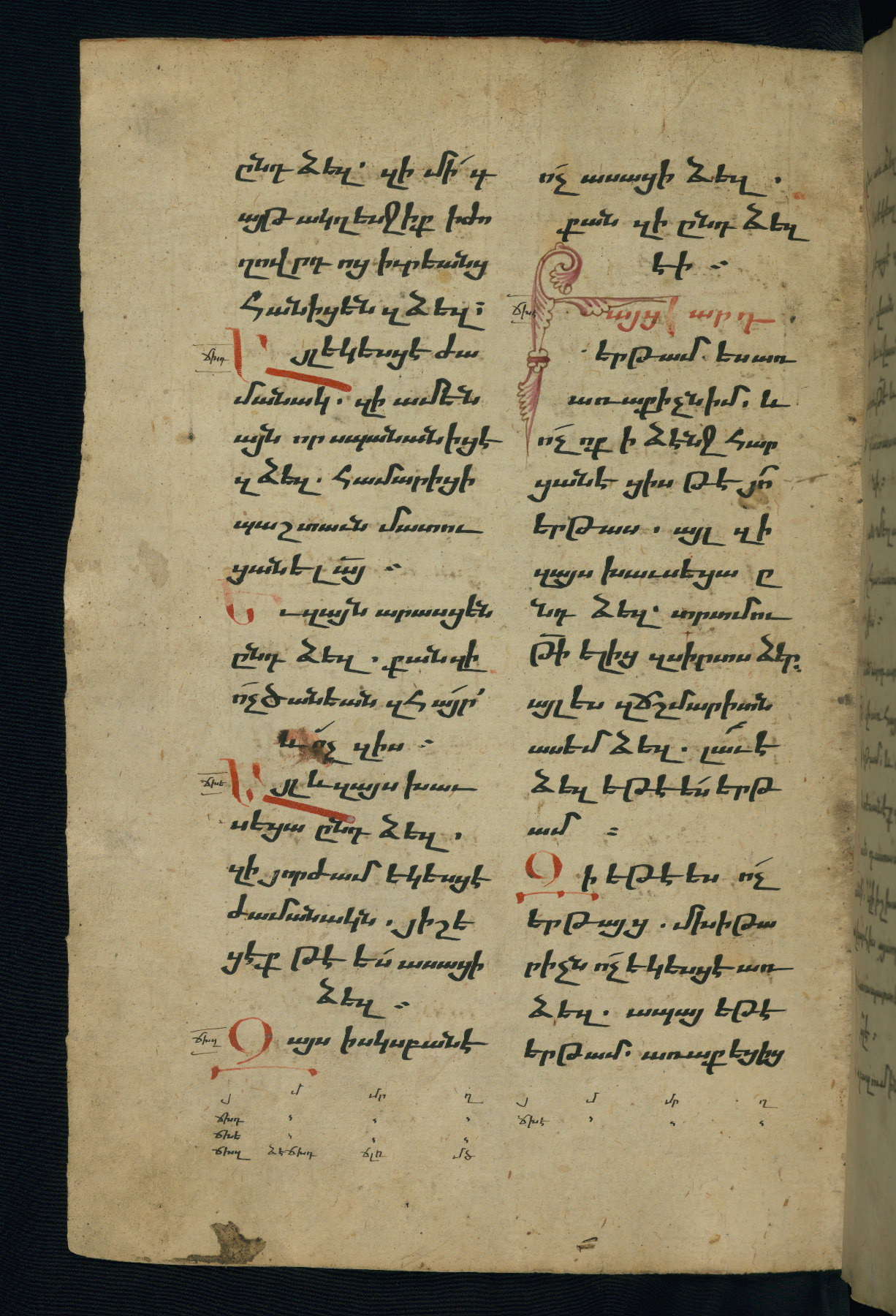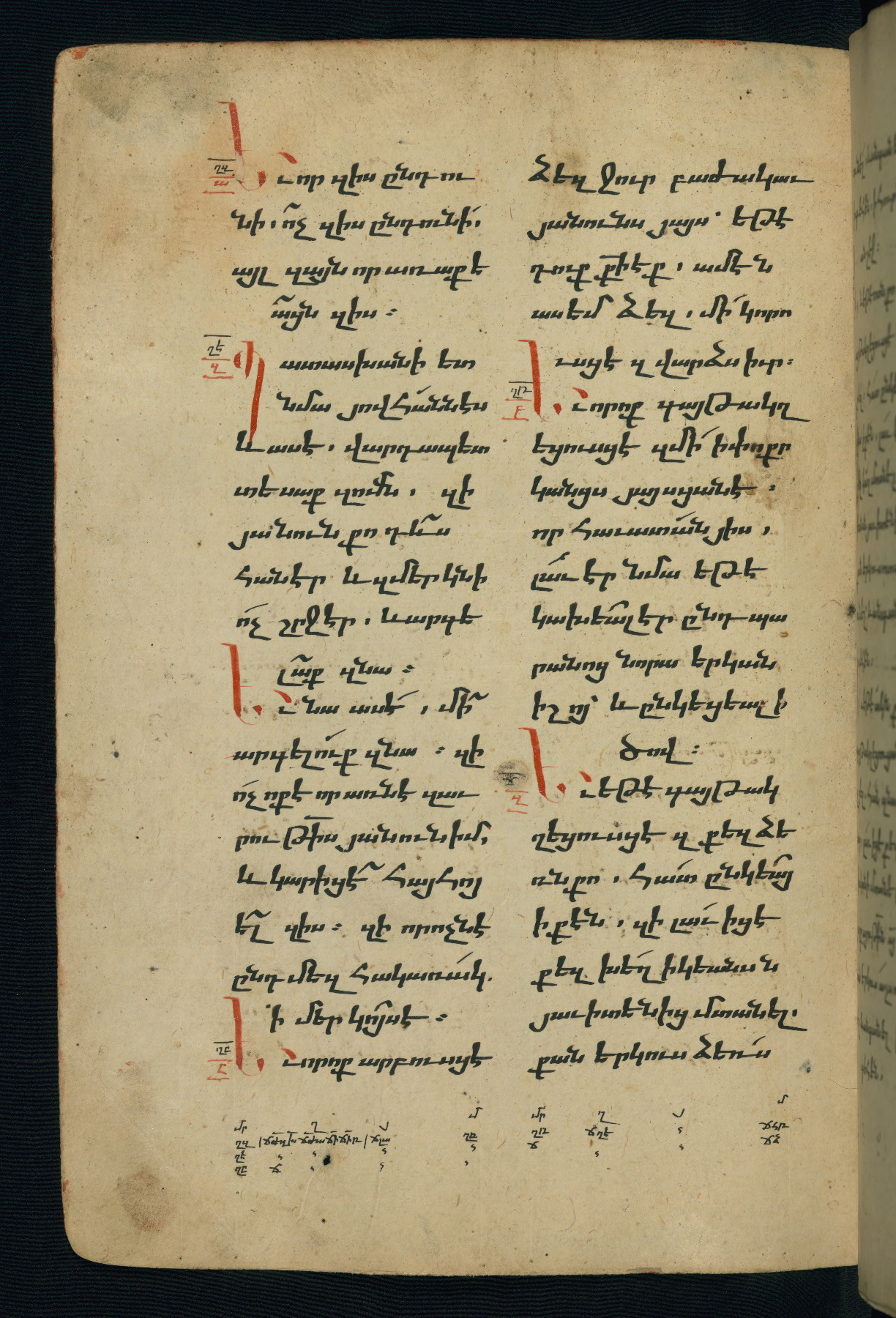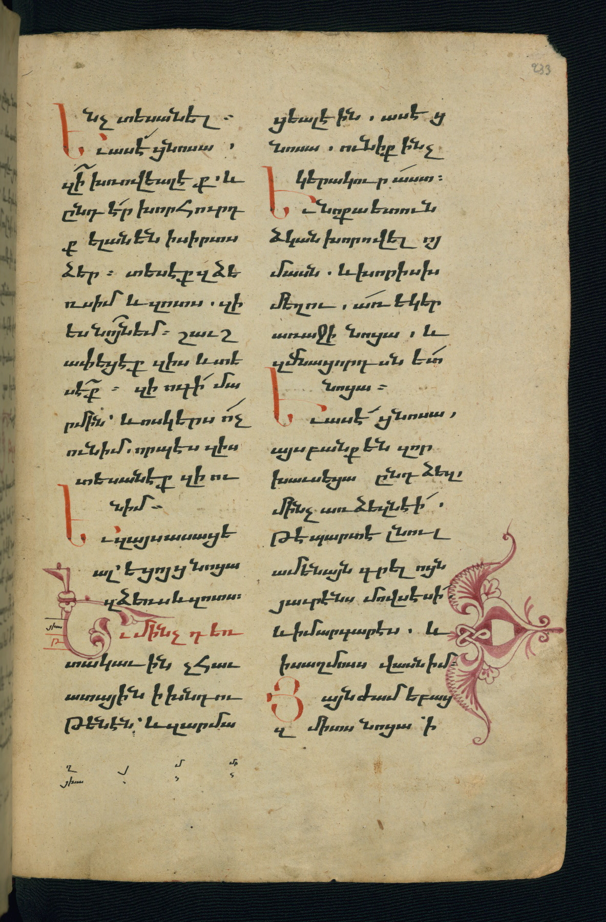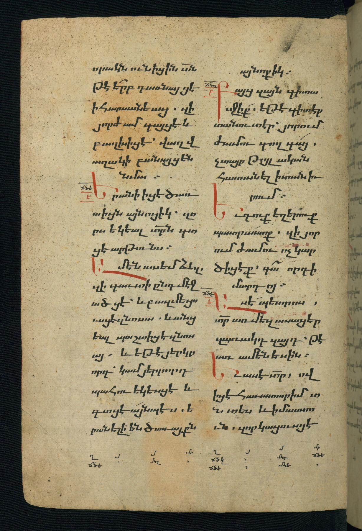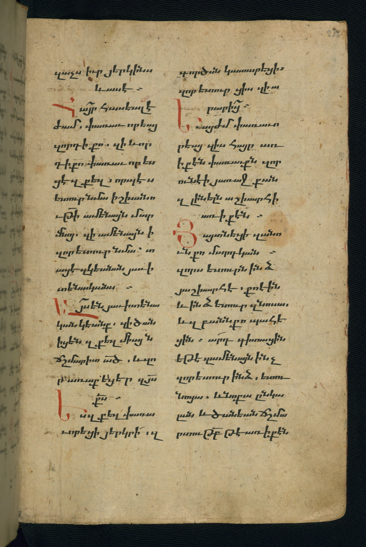 This Armenian Gospel book was produced in 904 of the Armenian era (1455 CE) at the monastery of Gamałiēl in Xizan by the scribe Yohannēs Vardapet, son of Vardan and Dilšat, and was illuminated by the priest Xačʿatur. The priest Pʿilipos commissioned the manuscript as a memorial to himself, his parents Łazar and Xutʿlumēlikʿ, and other relatives listed in the colophon on fols. 300r to 301v. Pʿilipos is depicted on fol. 14v alongside his brothers Yusēpʿ and Sultanša, as they kneel before the Virgin and Child enthroned (Theotokos). The book contains twenty-six full-page polychrome miniatures, including four Evangelist portraits; ornately designed canon tables; four decorated incipit pages; numerous marginal miniatures of floral and faunal motifs; and nineteen marginal miniatures of biblical characters or allusions to biblical narratives.