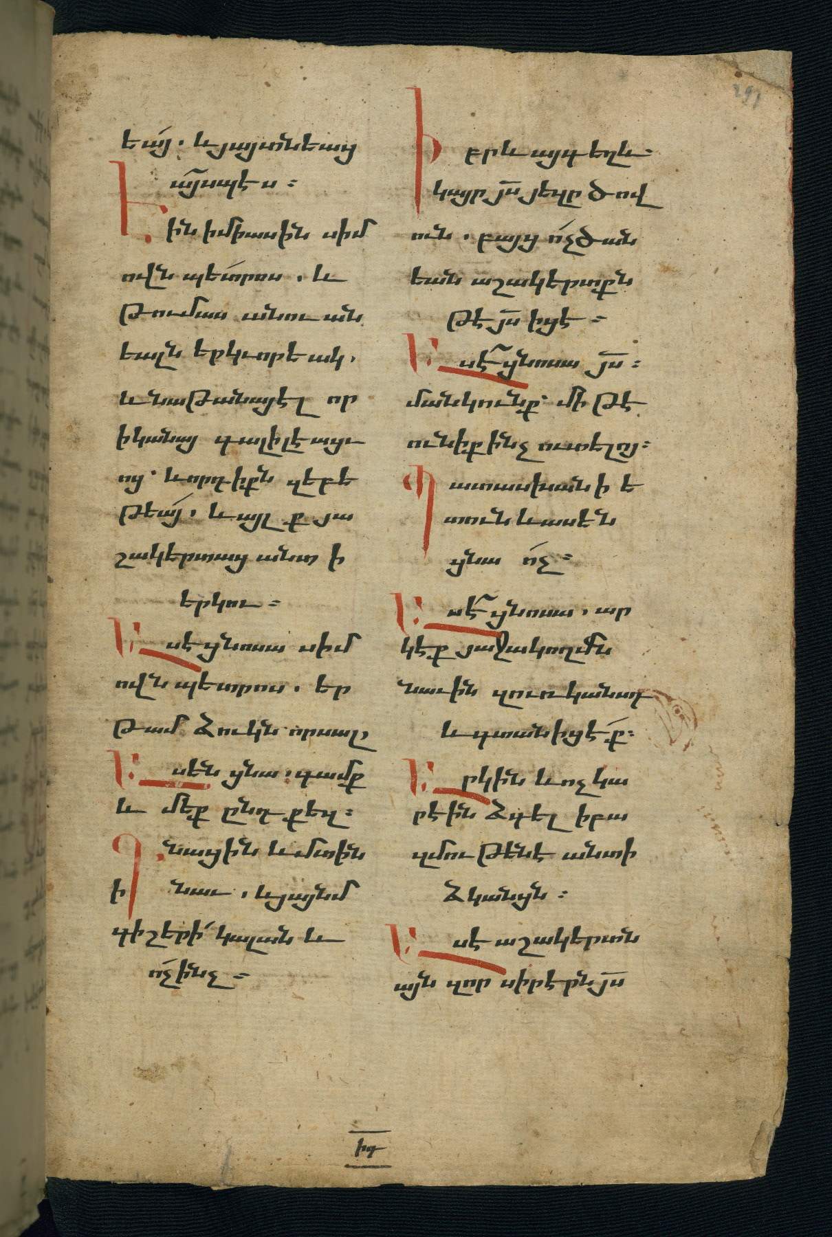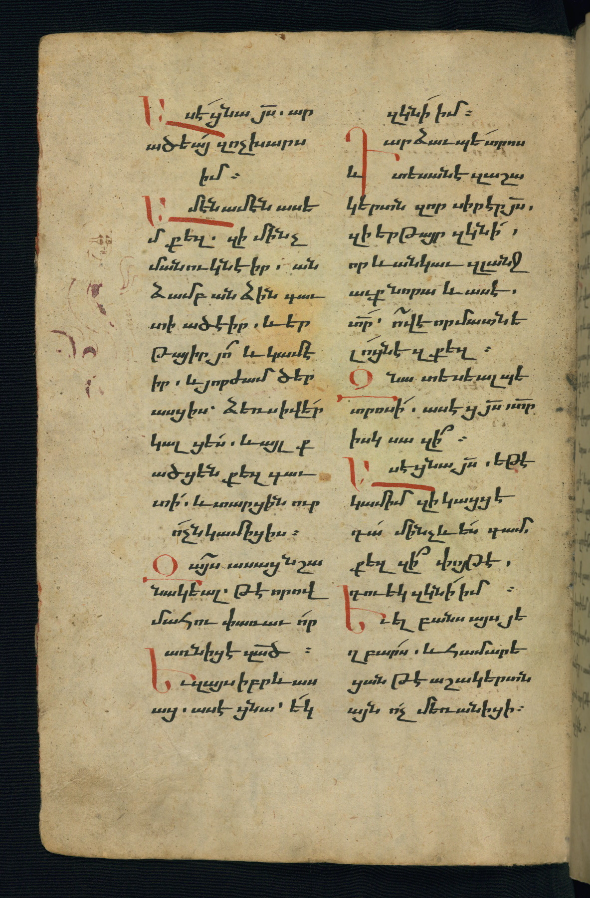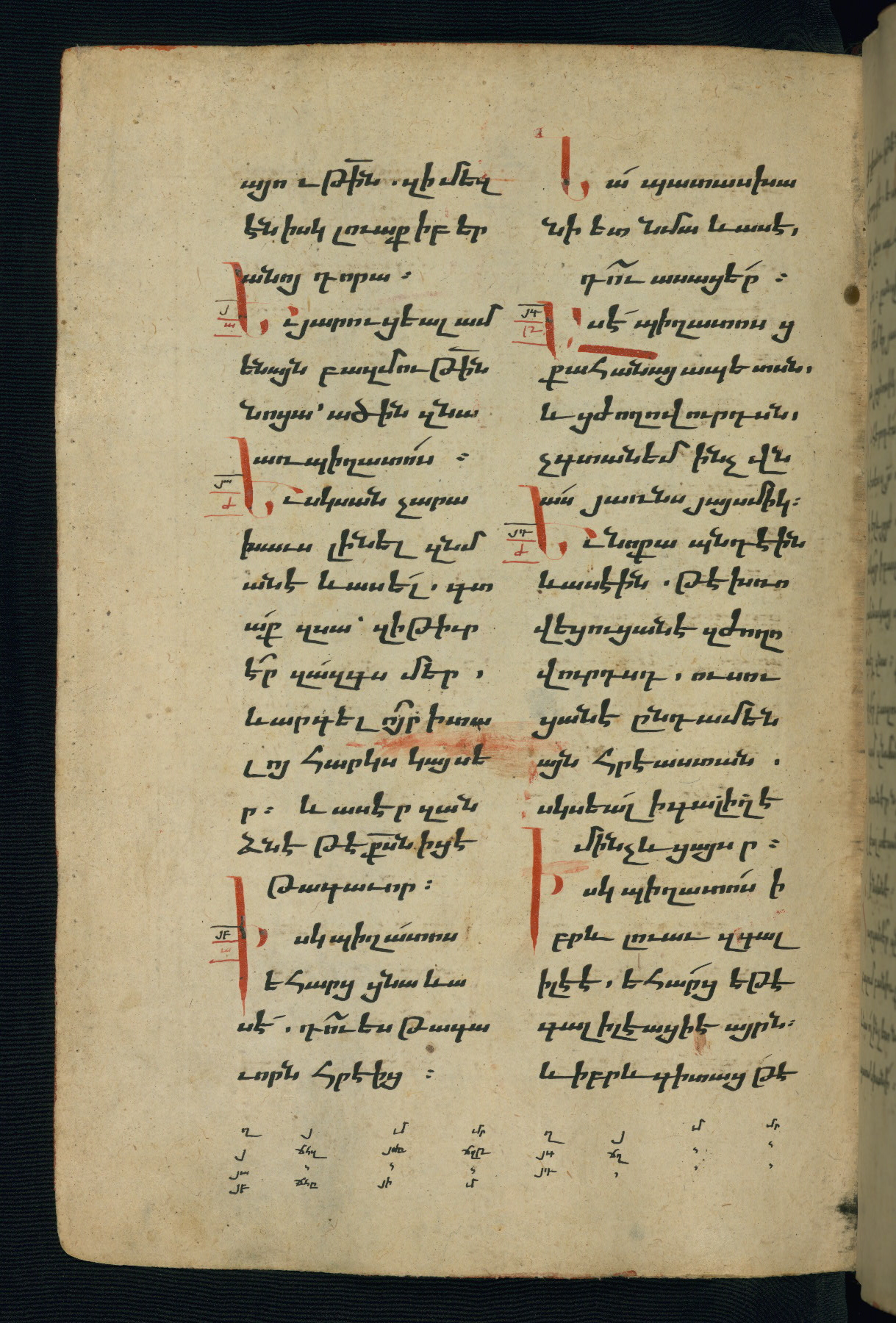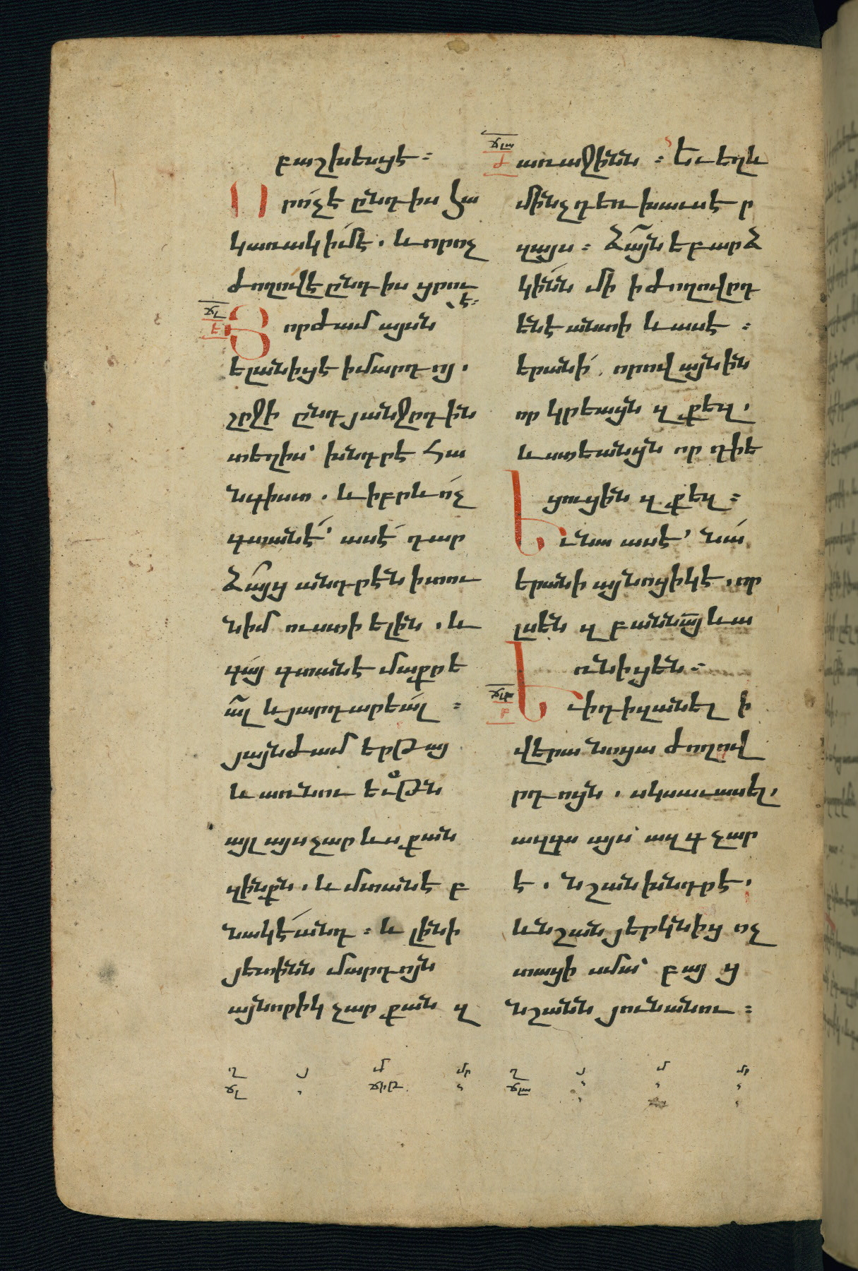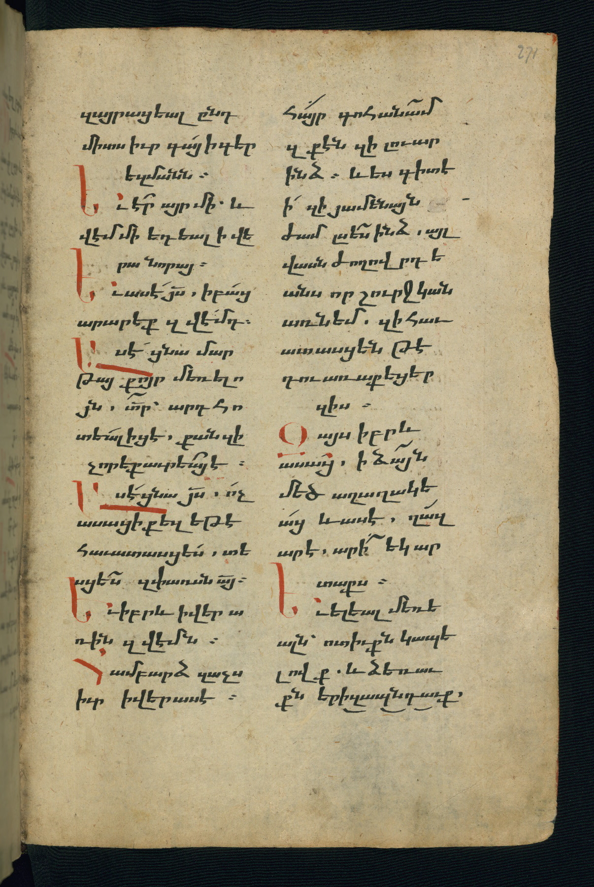 This Armenian Gospel book was produced in 904 of the Armenian era (1455 CE) at the monastery of Gamałiēl in Xizan by the scribe Yohannēs Vardapet, son of Vardan and Dilšat, and was illuminated by the priest Xačʿatur. The priest Pʿilipos commissioned the manuscript as a memorial to himself, his parents Łazar and Xutʿlumēlikʿ, and other relatives listed in the colophon on fols. 300r to 301v. Pʿilipos is depicted on fol. 14v alongside his brothers Yusēpʿ and Sultanša, as they kneel before the Virgin and Child enthroned (Theotokos). The book contains twenty-six full-page polychrome miniatures, including four Evangelist portraits; ornately designed canon tables; four decorated incipit pages; numerous marginal miniatures of floral and faunal motifs; and nineteen marginal miniatures of biblical characters or allusions to biblical narratives.