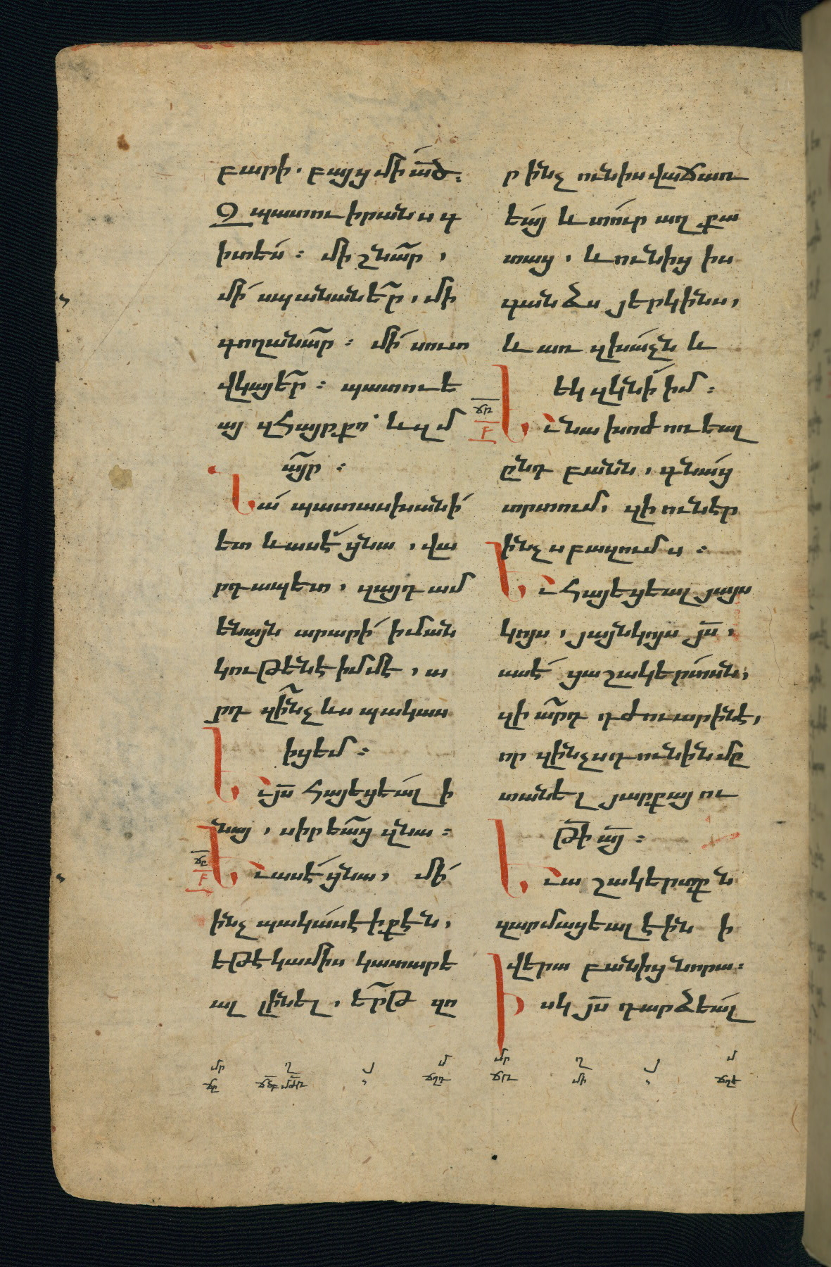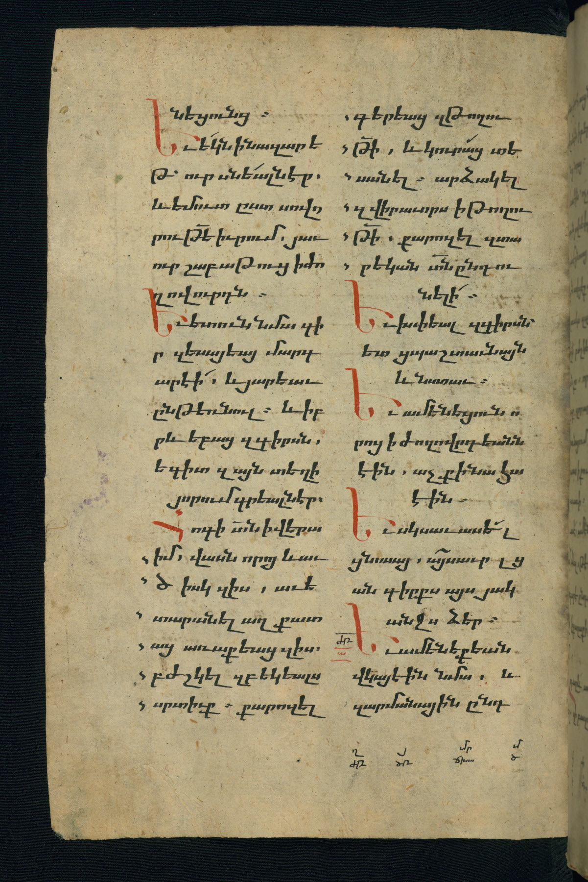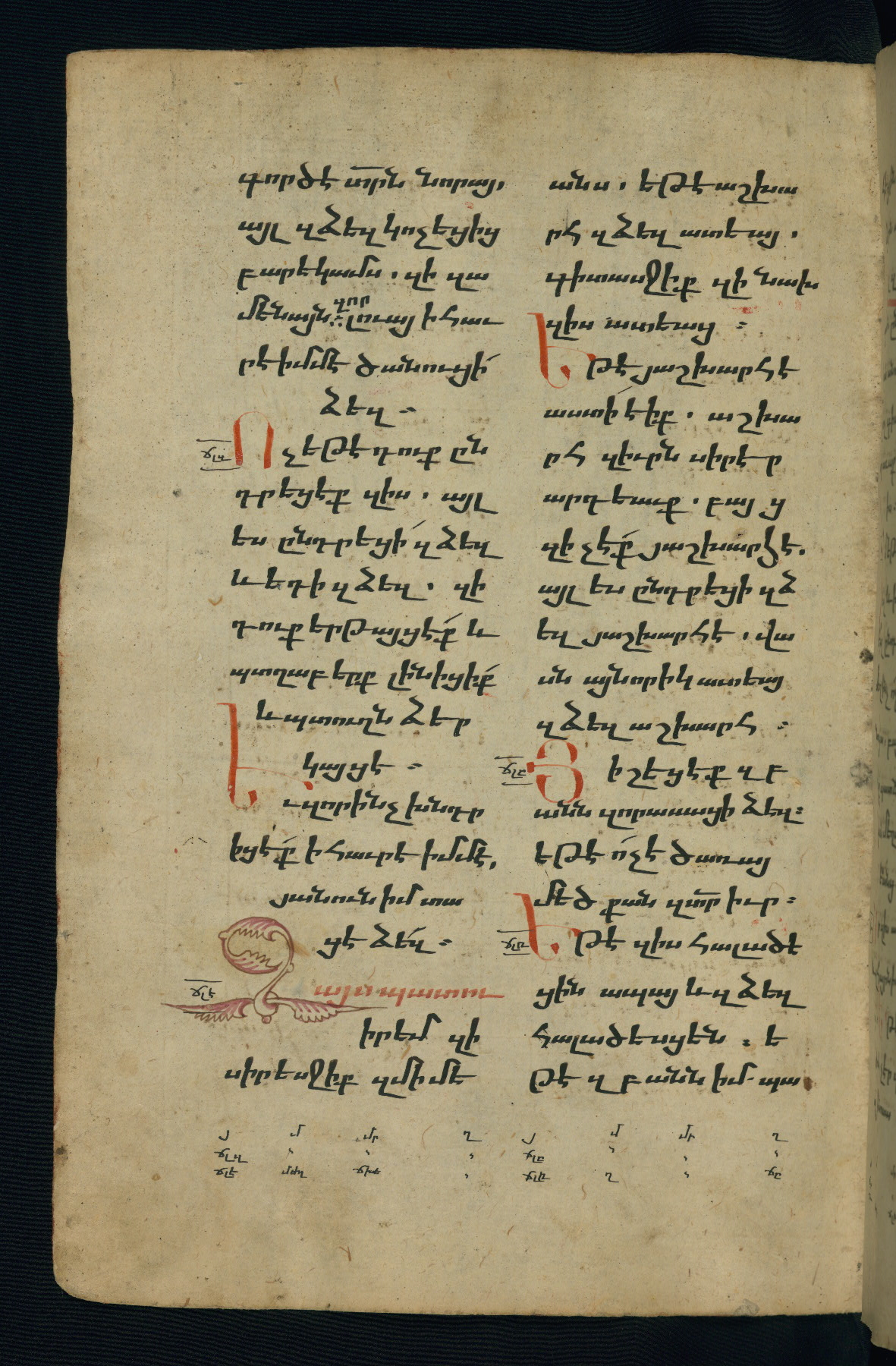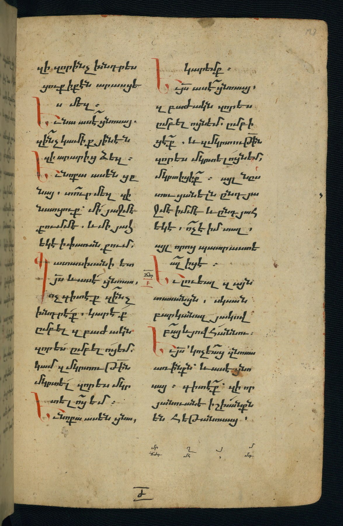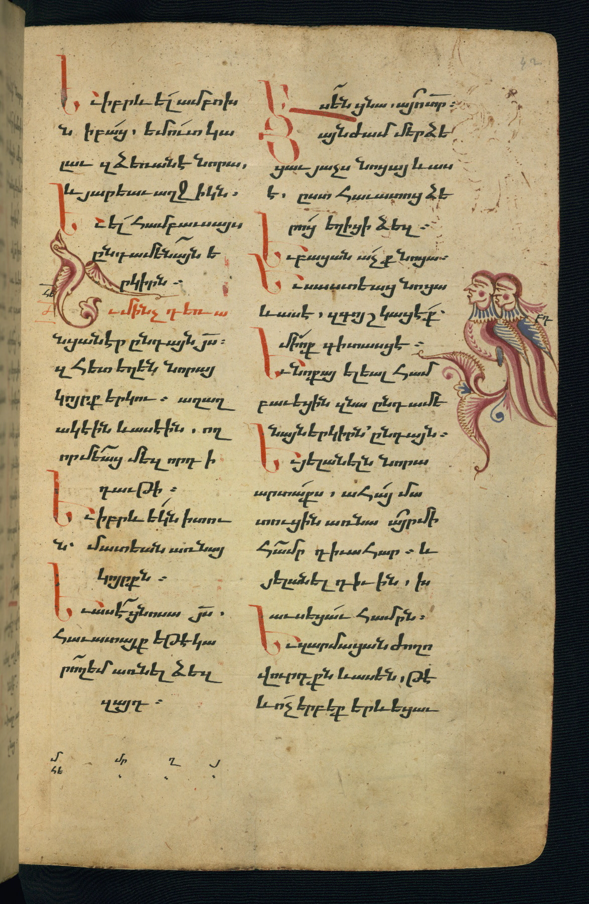 This Armenian Gospel book was produced in 904 of the Armenian era (1455 CE) at the monastery of Gamałiēl in Xizan by the scribe Yohannēs Vardapet, son of Vardan and Dilšat, and was illuminated by the priest Xačʿatur. The priest Pʿilipos commissioned the manuscript as a memorial to himself, his parents Łazar and Xutʿlumēlikʿ, and other relatives listed in the colophon on fols. 300r to 301v. Pʿilipos is depicted on fol. 14v alongside his brothers Yusēpʿ and Sultanša, as they kneel before the Virgin and Child enthroned (Theotokos). The book contains twenty-six full-page polychrome miniatures, including four Evangelist portraits; ornately designed canon tables; four decorated incipit pages; numerous marginal miniatures of floral and faunal motifs; and nineteen marginal miniatures of biblical characters or allusions to biblical narratives.