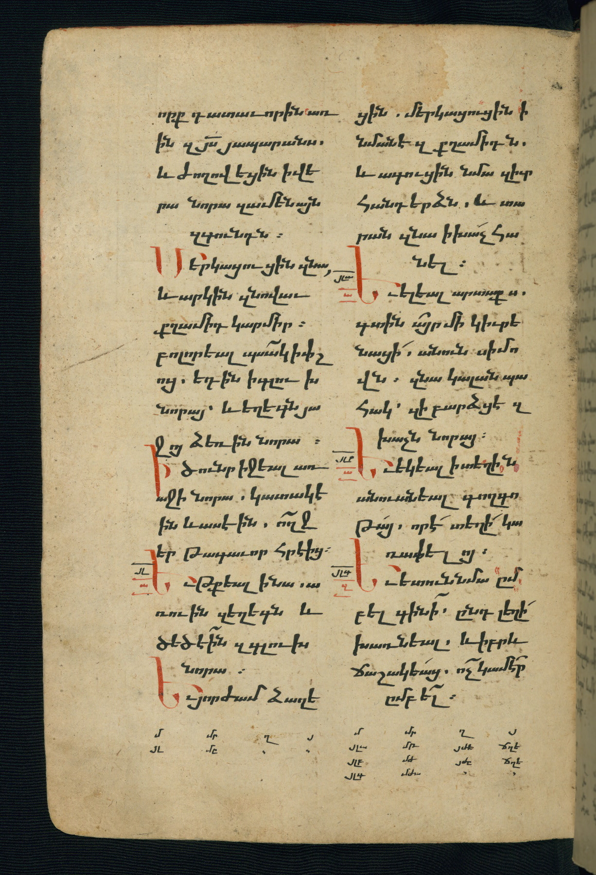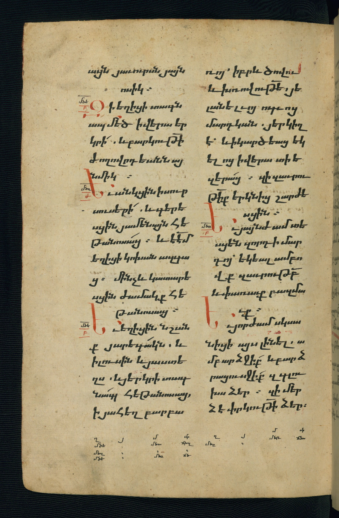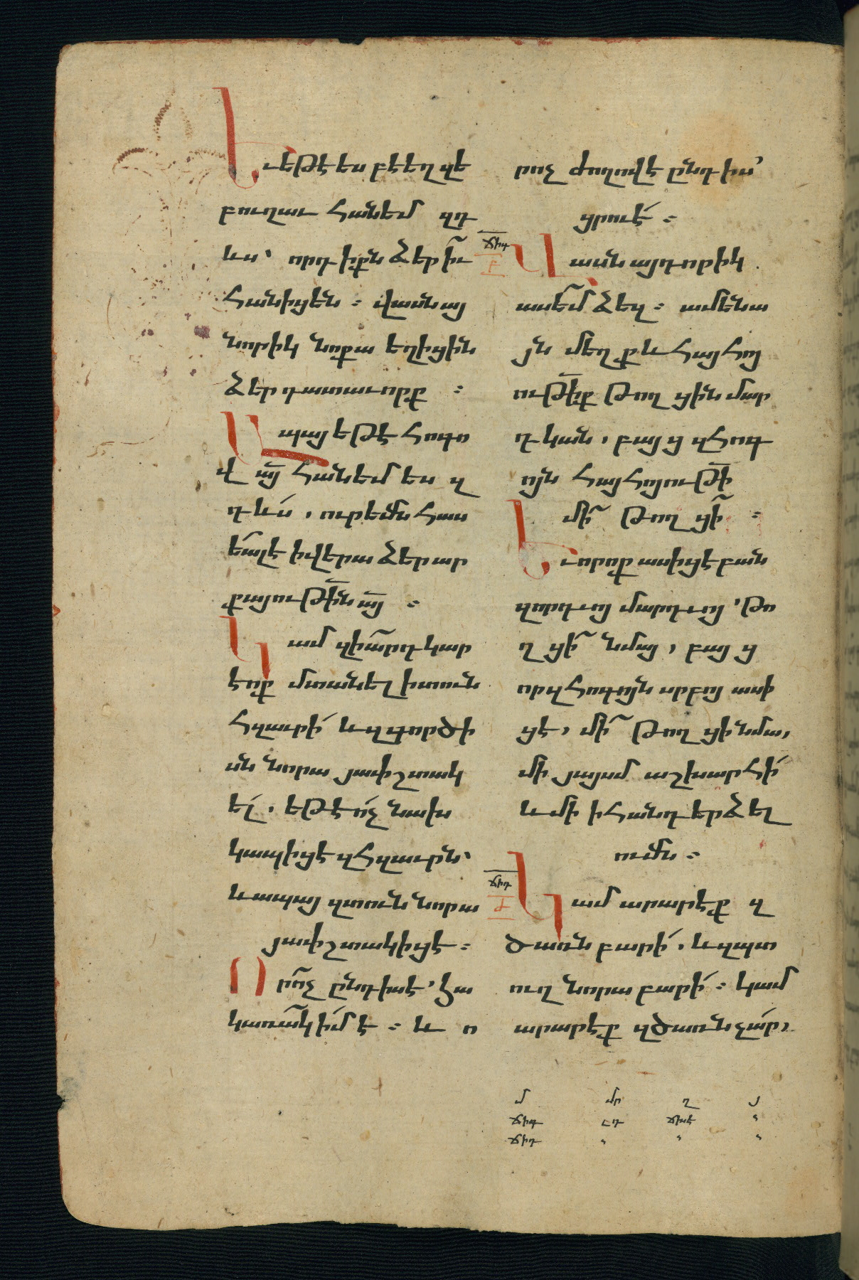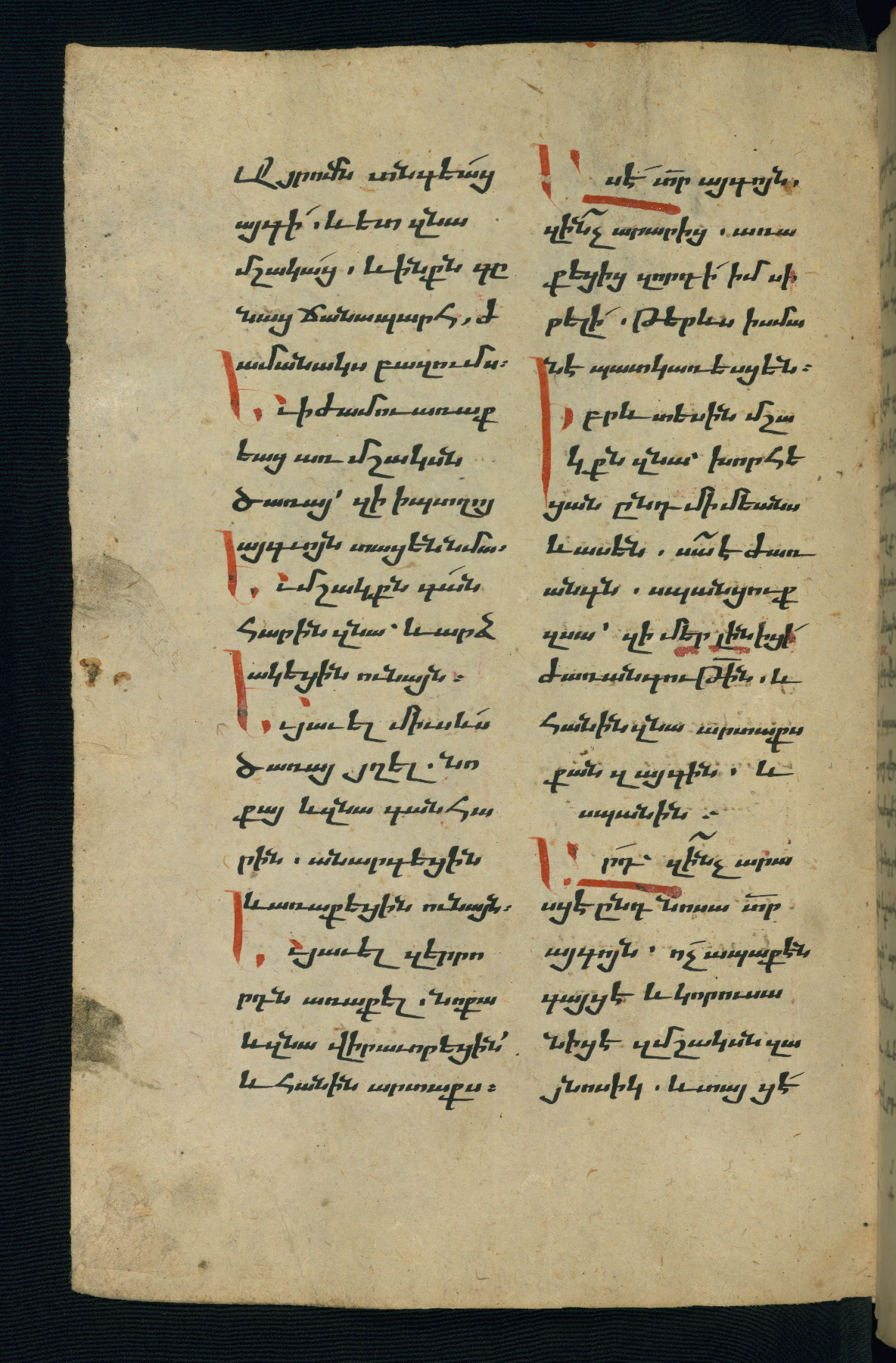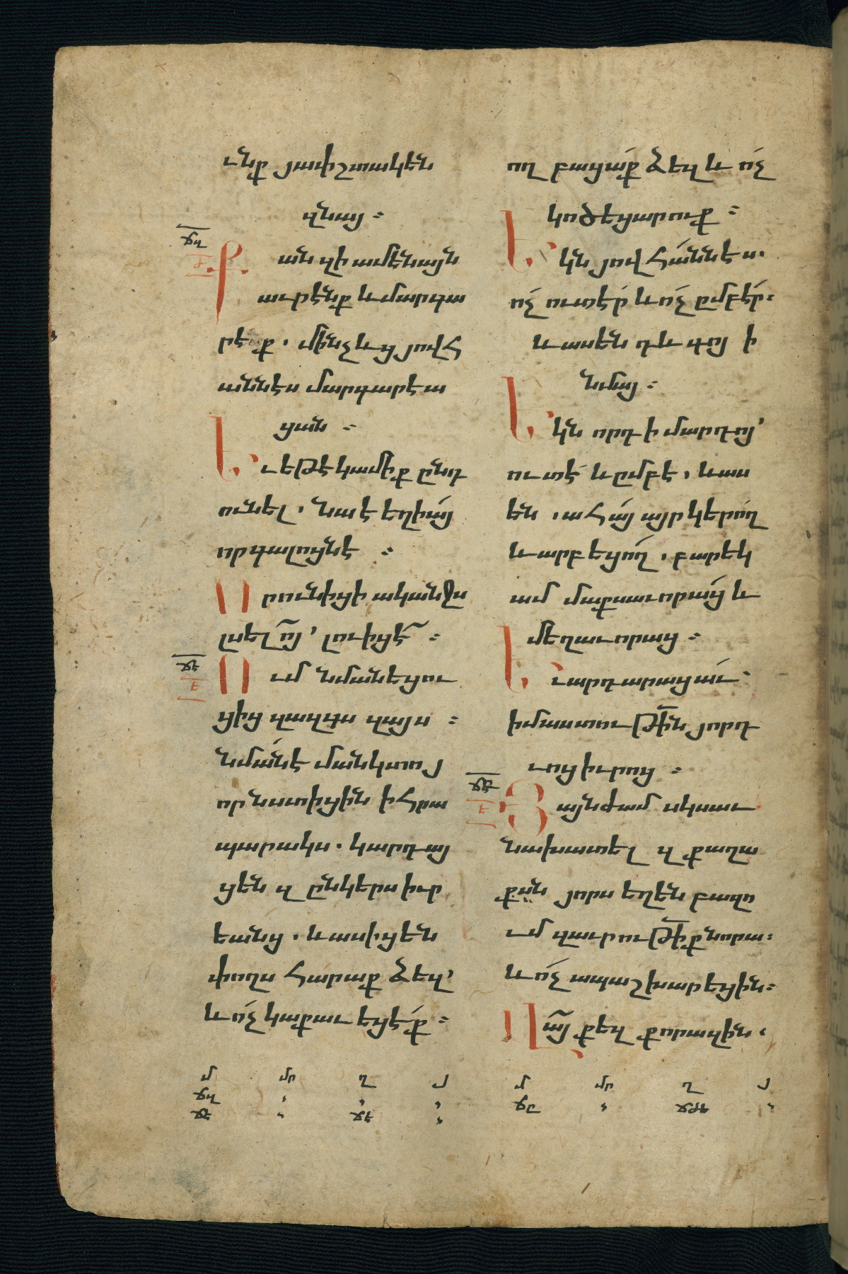 This Armenian Gospel book was produced in 904 of the Armenian era (1455 CE) at the monastery of Gamałiēl in Xizan by the scribe Yohannēs Vardapet, son of Vardan and Dilšat, and was illuminated by the priest Xačʿatur. The priest Pʿilipos commissioned the manuscript as a memorial to himself, his parents Łazar and Xutʿlumēlikʿ, and other relatives listed in the colophon on fols. 300r to 301v. Pʿilipos is depicted on fol. 14v alongside his brothers Yusēpʿ and Sultanša, as they kneel before the Virgin and Child enthroned (Theotokos). The book contains twenty-six full-page polychrome miniatures, including four Evangelist portraits; ornately designed canon tables; four decorated incipit pages; numerous marginal miniatures of floral and faunal motifs; and nineteen marginal miniatures of biblical characters or allusions to biblical narratives.