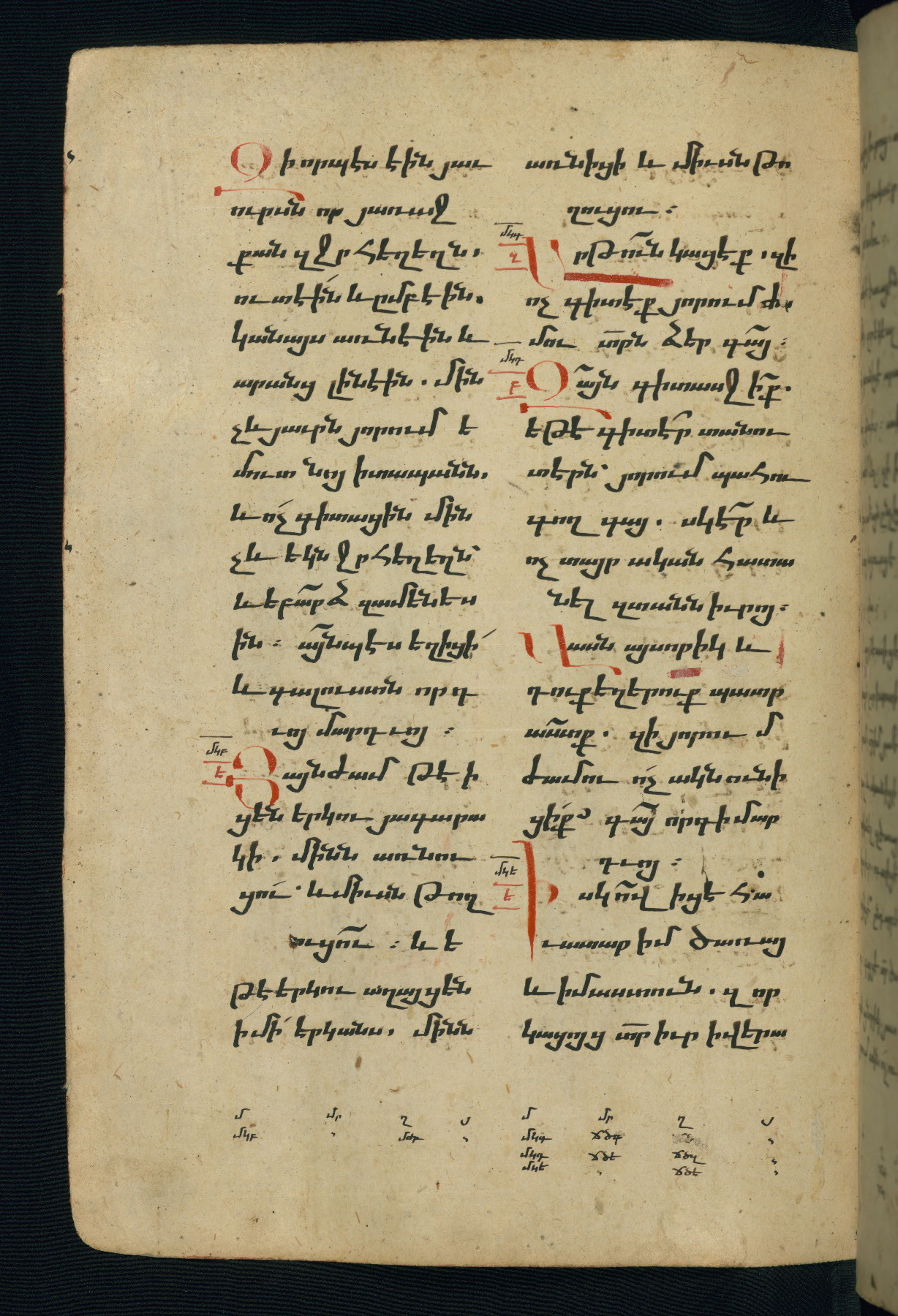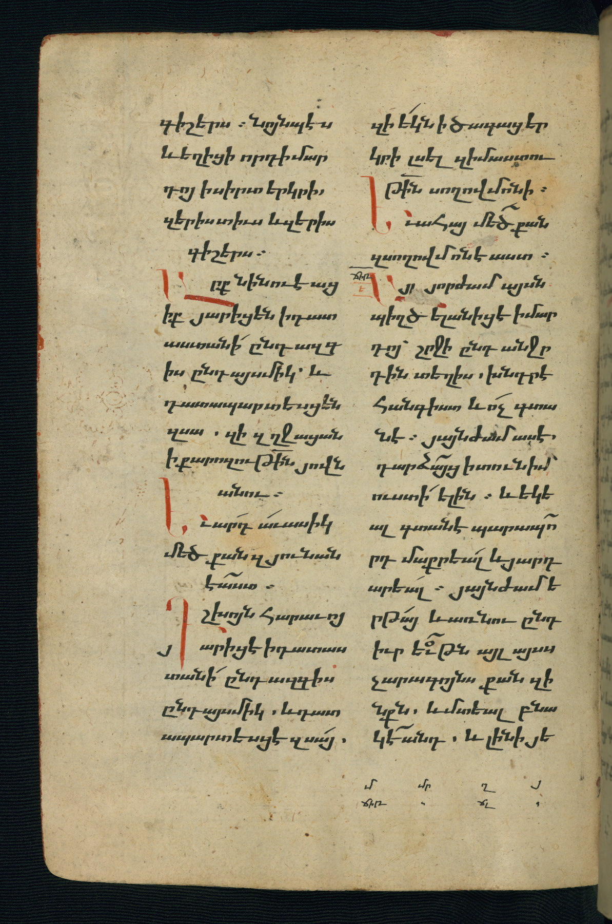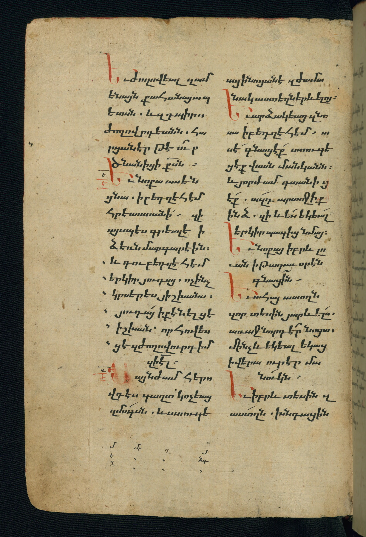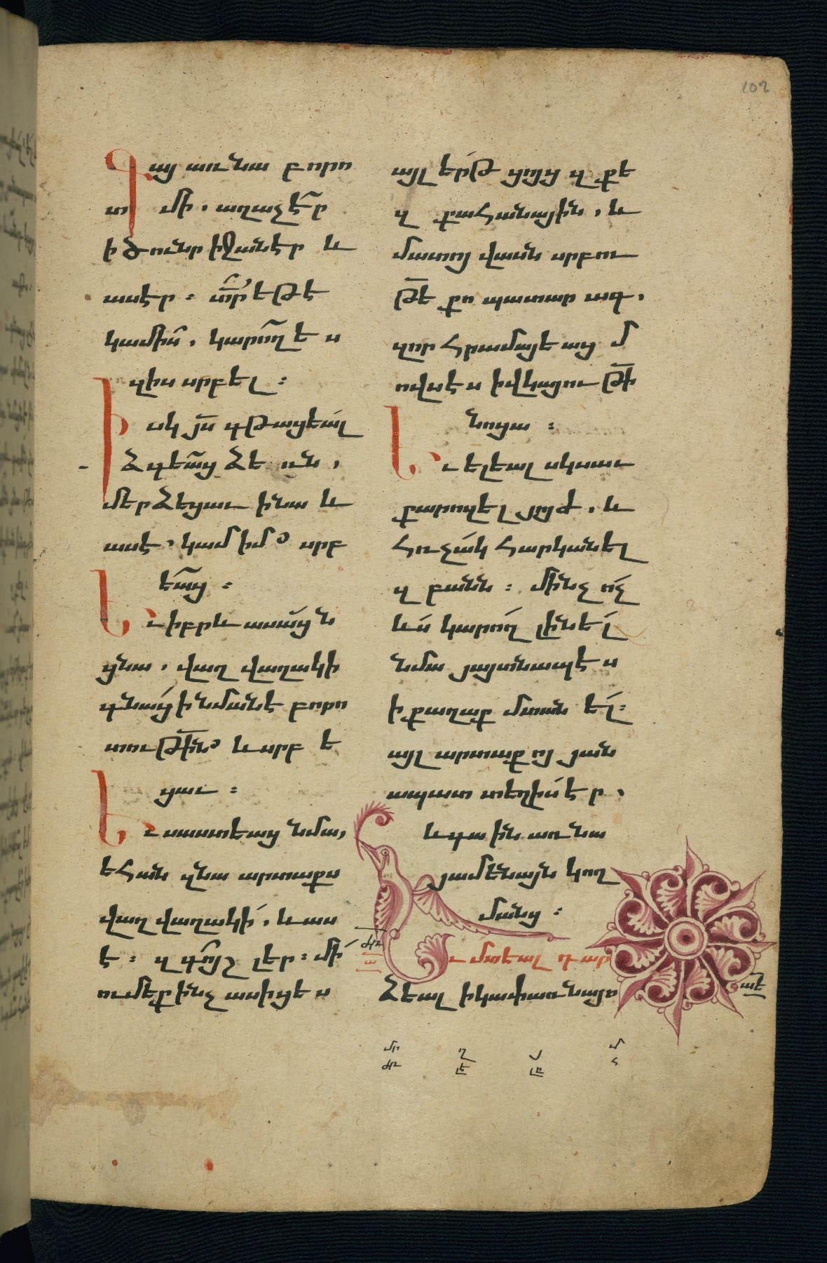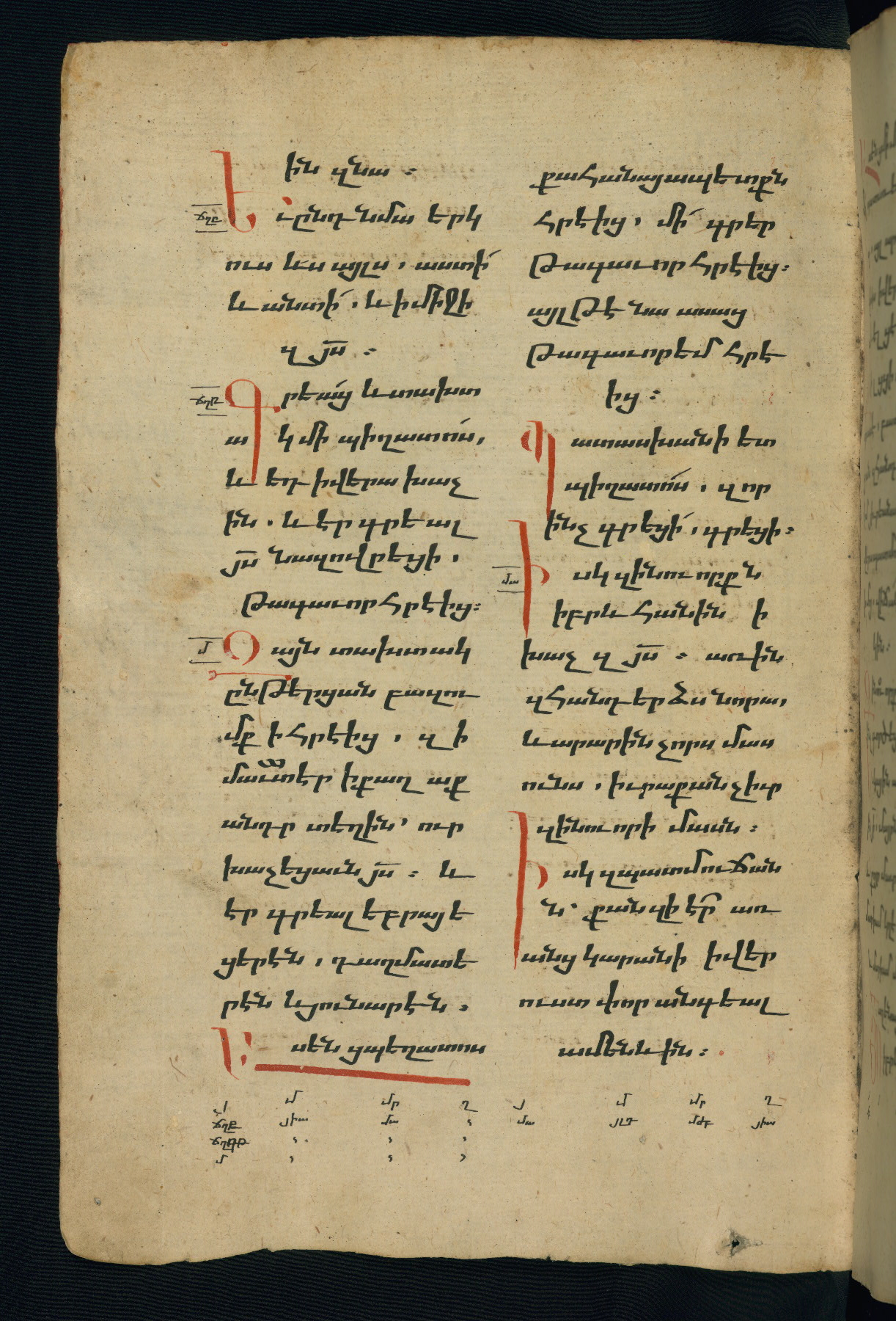 This Armenian Gospel book was produced in 904 of the Armenian era (1455 CE) at the monastery of Gamałiēl in Xizan by the scribe Yohannēs Vardapet, son of Vardan and Dilšat, and was illuminated by the priest Xačʿatur. The priest Pʿilipos commissioned the manuscript as a memorial to himself, his parents Łazar and Xutʿlumēlikʿ, and other relatives listed in the colophon on fols. 300r to 301v. Pʿilipos is depicted on fol. 14v alongside his brothers Yusēpʿ and Sultanša, as they kneel before the Virgin and Child enthroned (Theotokos). The book contains twenty-six full-page polychrome miniatures, including four Evangelist portraits; ornately designed canon tables; four decorated incipit pages; numerous marginal miniatures of floral and faunal motifs; and nineteen marginal miniatures of biblical characters or allusions to biblical narratives.