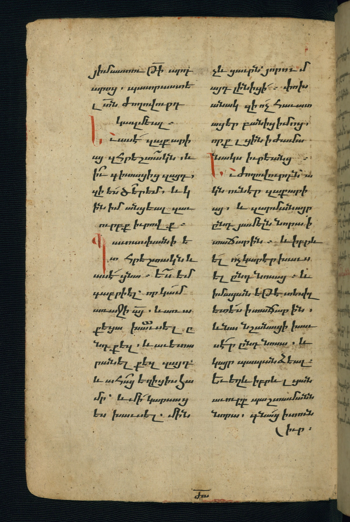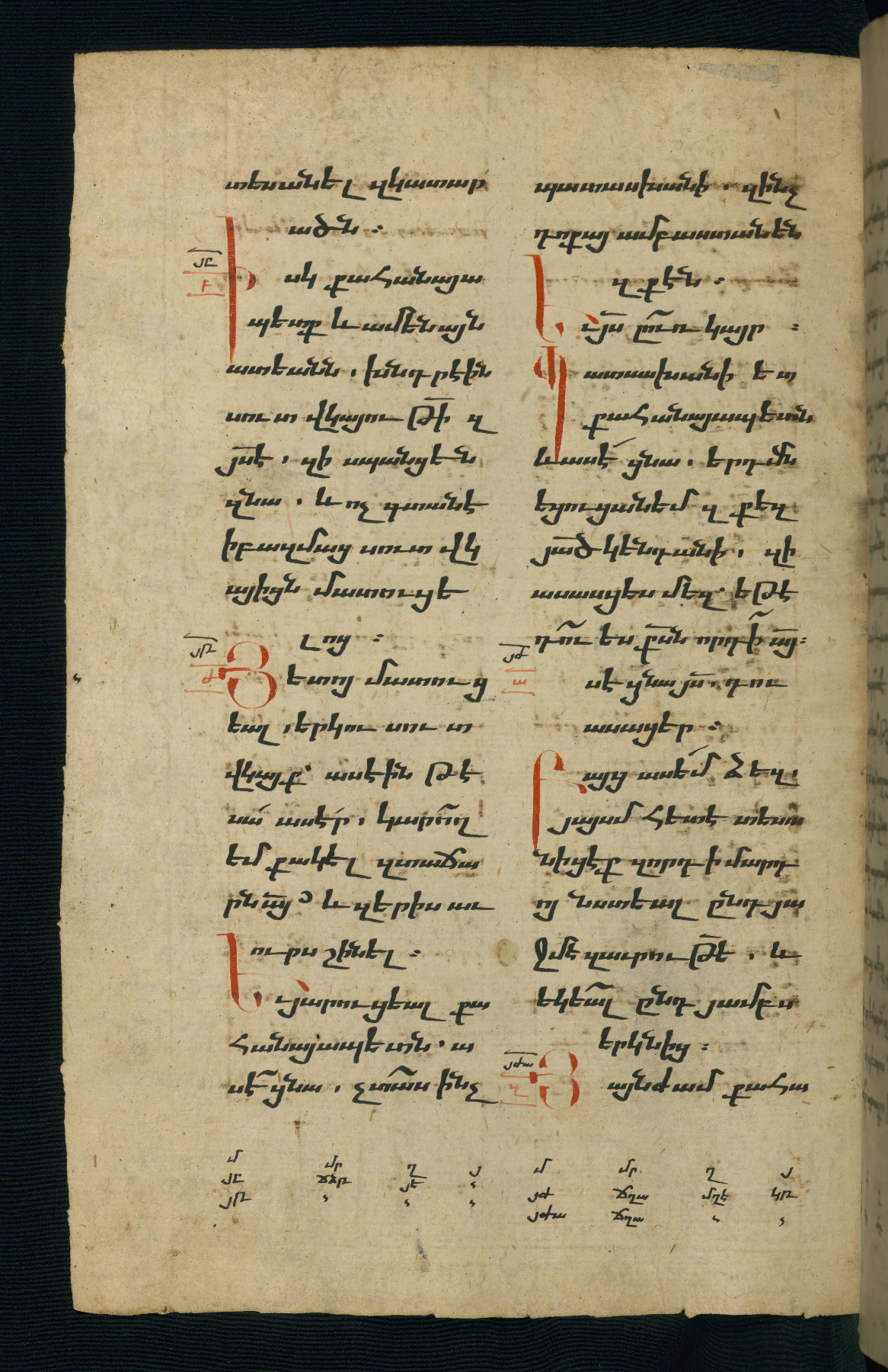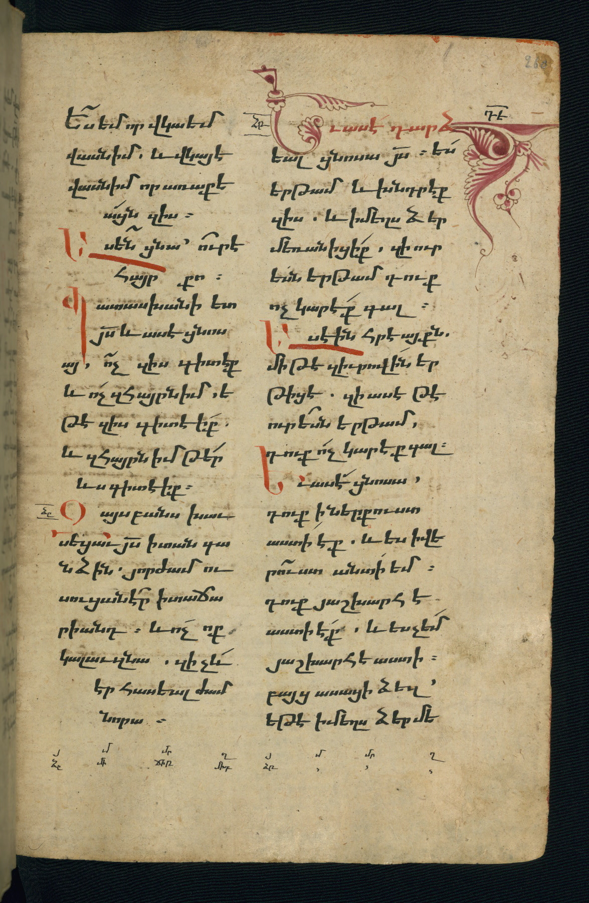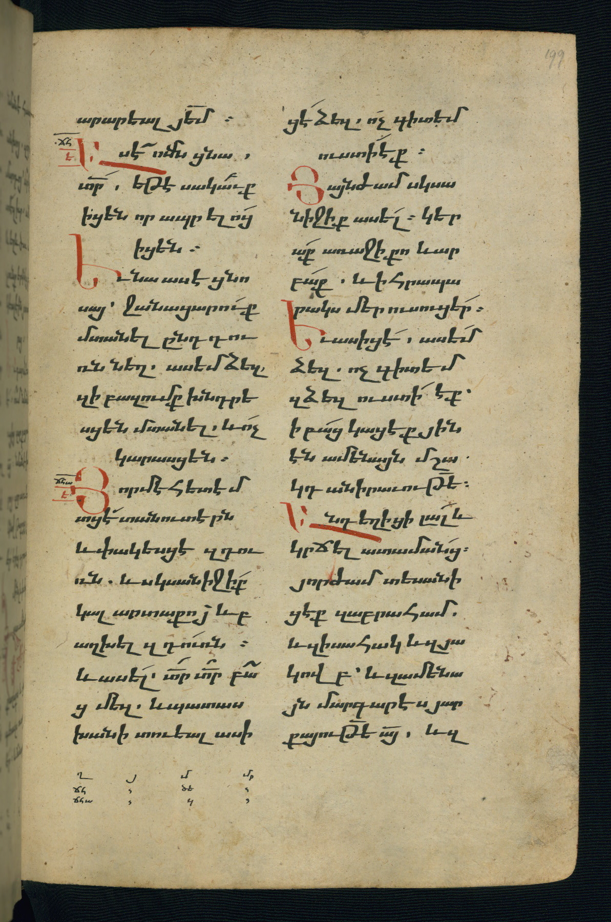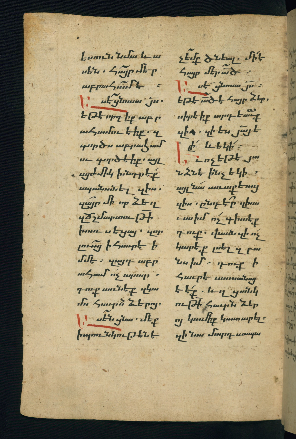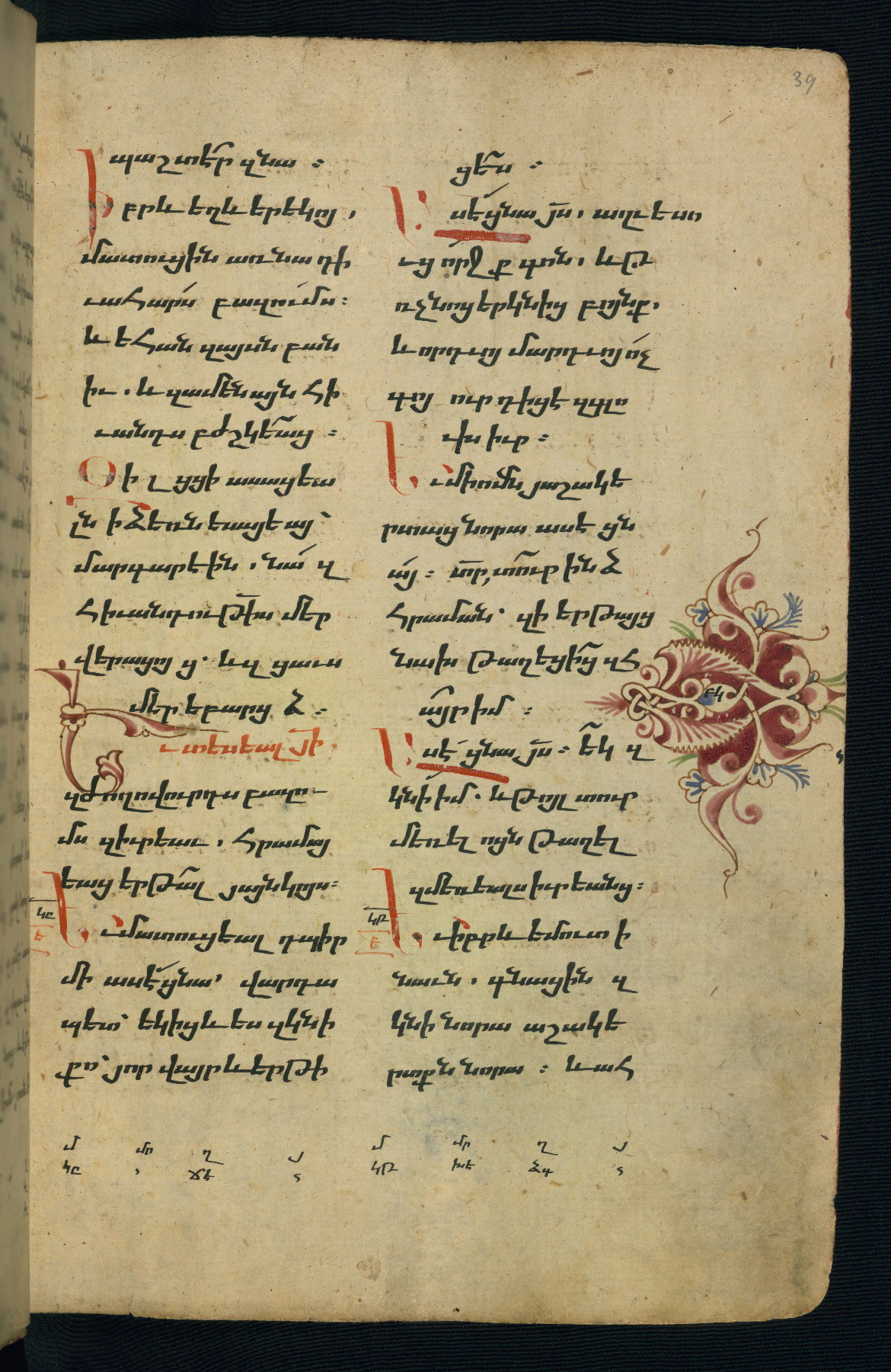 This Armenian Gospel book was produced in 904 of the Armenian era (1455 CE) at the monastery of Gamałiēl in Xizan by the scribe Yohannēs Vardapet, son of Vardan and Dilšat, and was illuminated by the priest Xačʿatur. The priest Pʿilipos commissioned the manuscript as a memorial to himself, his parents Łazar and Xutʿlumēlikʿ, and other relatives listed in the colophon on fols. 300r to 301v. Pʿilipos is depicted on fol. 14v alongside his brothers Yusēpʿ and Sultanša, as they kneel before the Virgin and Child enthroned (Theotokos). The book contains twenty-six full-page polychrome miniatures, including four Evangelist portraits; ornately designed canon tables; four decorated incipit pages; numerous marginal miniatures of floral and faunal motifs; and nineteen marginal miniatures of biblical characters or allusions to biblical narratives.
