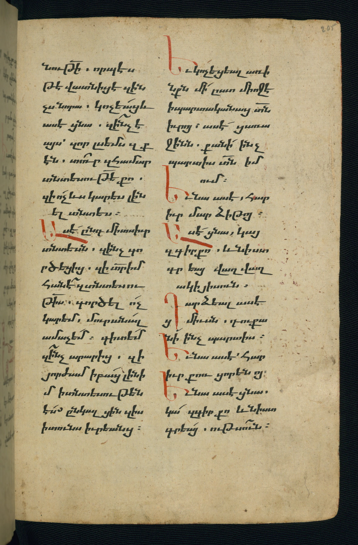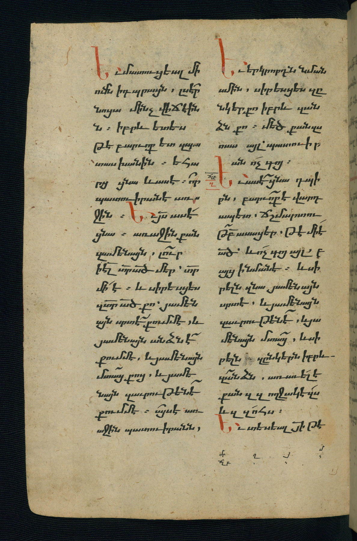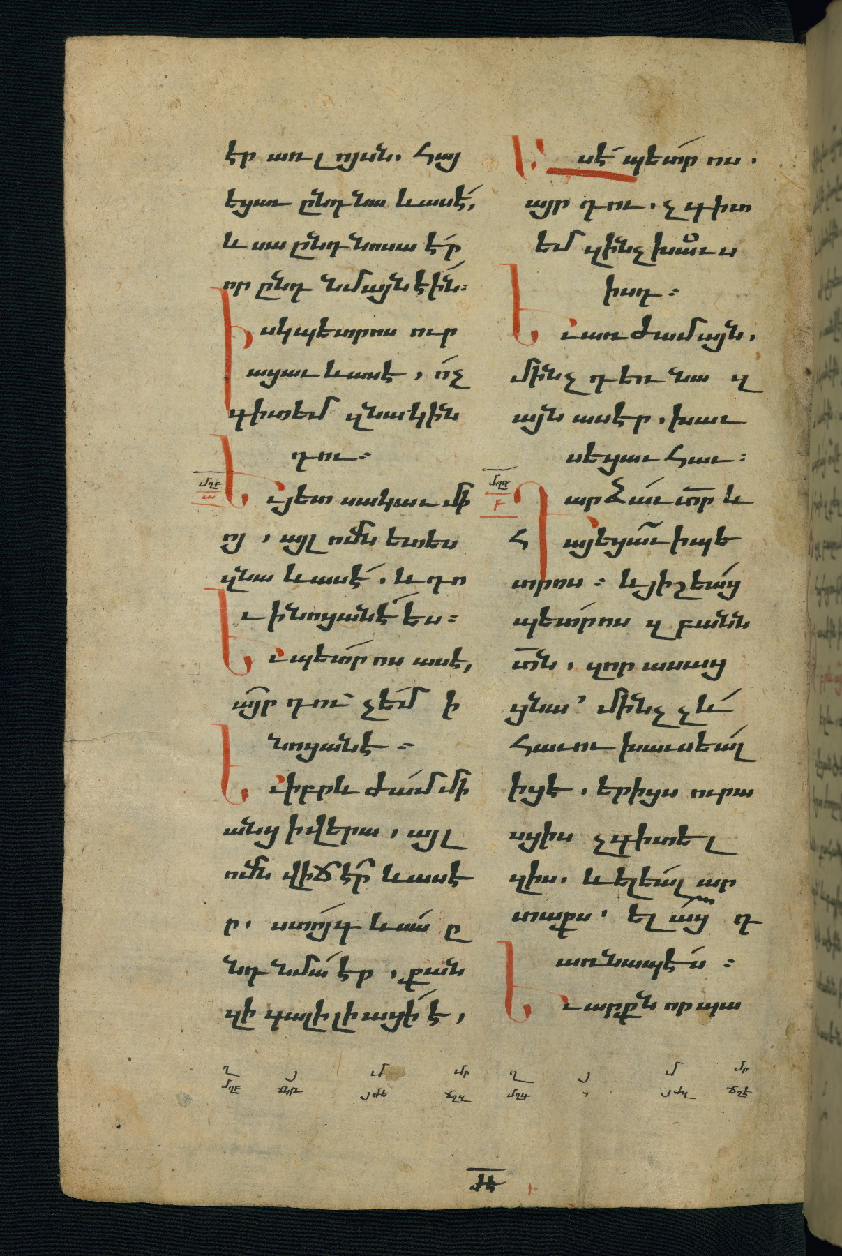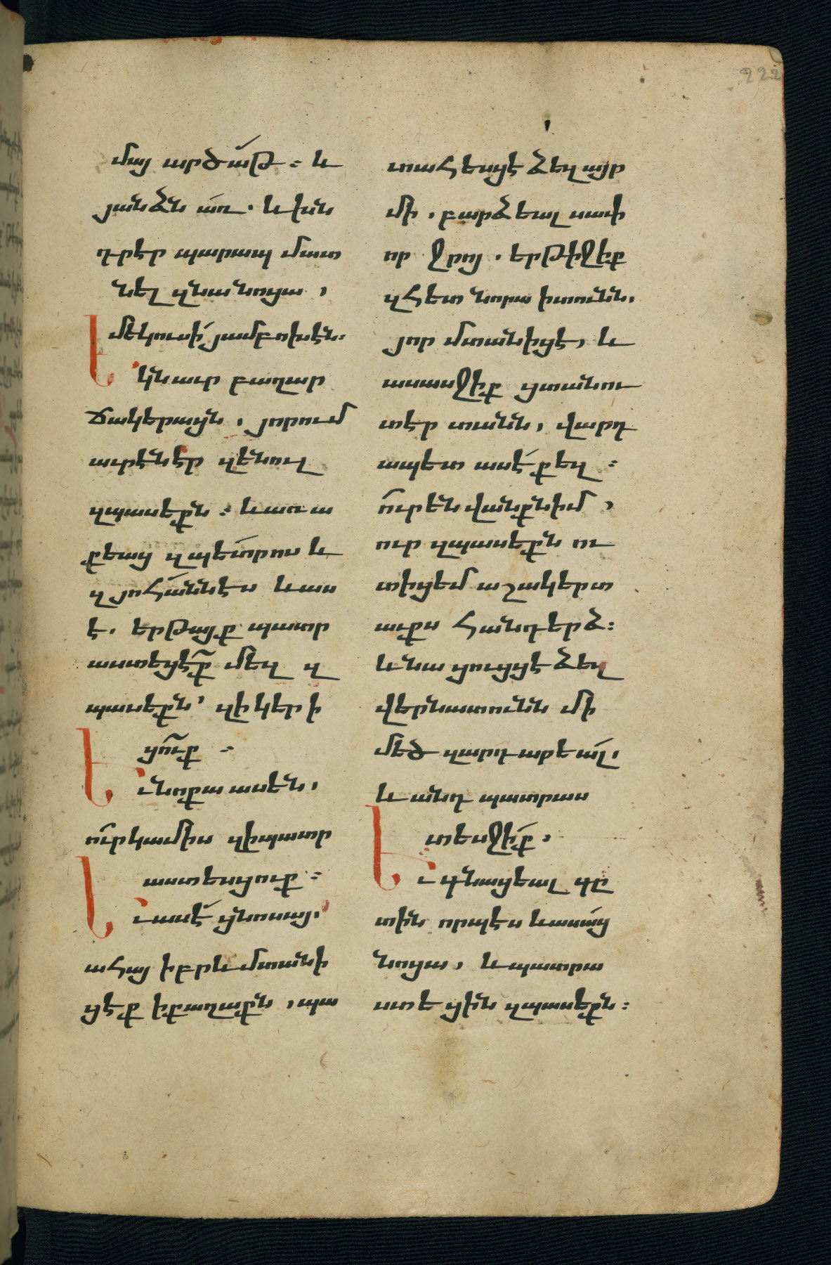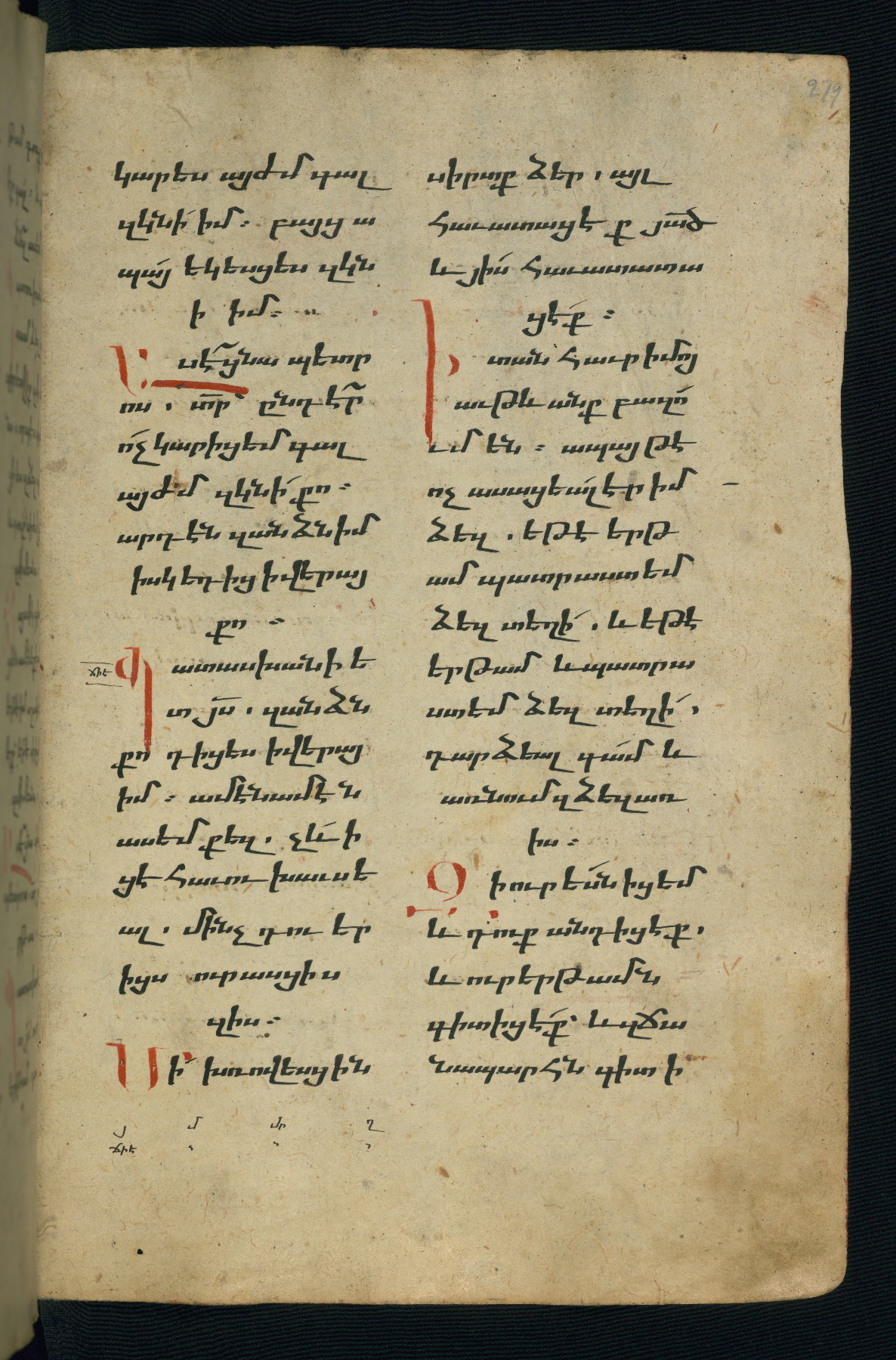 This Armenian Gospel book was produced in 904 of the Armenian era (1455 CE) at the monastery of Gamałiēl in Xizan by the scribe Yohannēs Vardapet, son of Vardan and Dilšat, and was illuminated by the priest Xačʿatur. The priest Pʿilipos commissioned the manuscript as a memorial to himself, his parents Łazar and Xutʿlumēlikʿ, and other relatives listed in the colophon on fols. 300r to 301v. Pʿilipos is depicted on fol. 14v alongside his brothers Yusēpʿ and Sultanša, as they kneel before the Virgin and Child enthroned (Theotokos). The book contains twenty-six full-page polychrome miniatures, including four Evangelist portraits; ornately designed canon tables; four decorated incipit pages; numerous marginal miniatures of floral and faunal motifs; and nineteen marginal miniatures of biblical characters or allusions to biblical narratives.