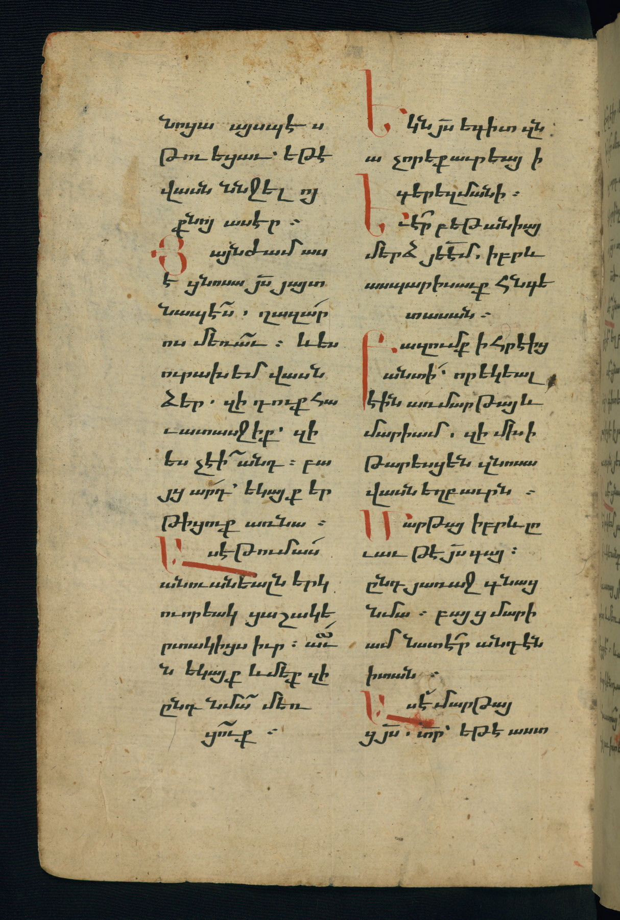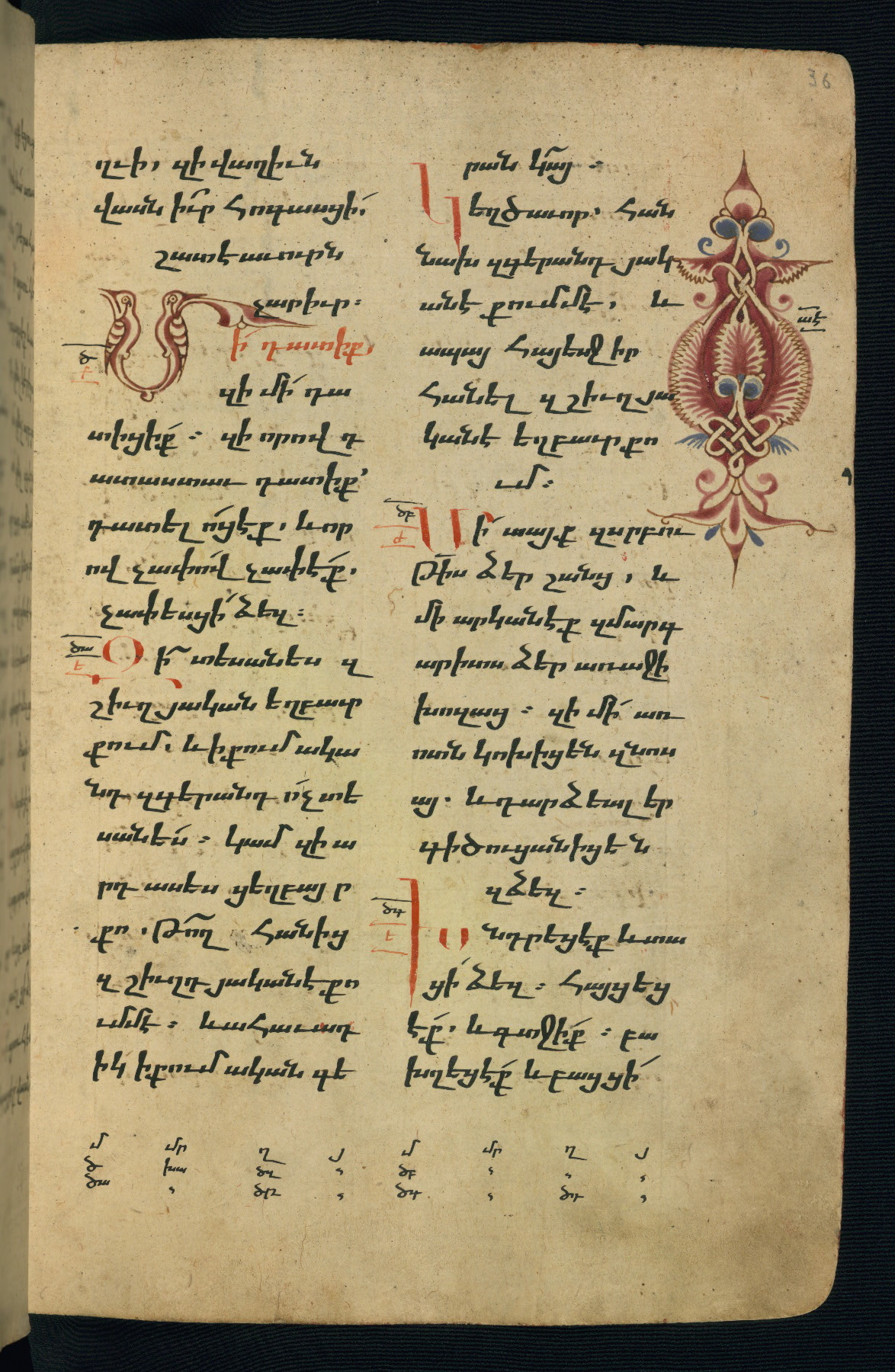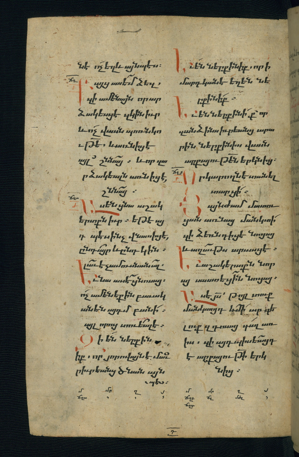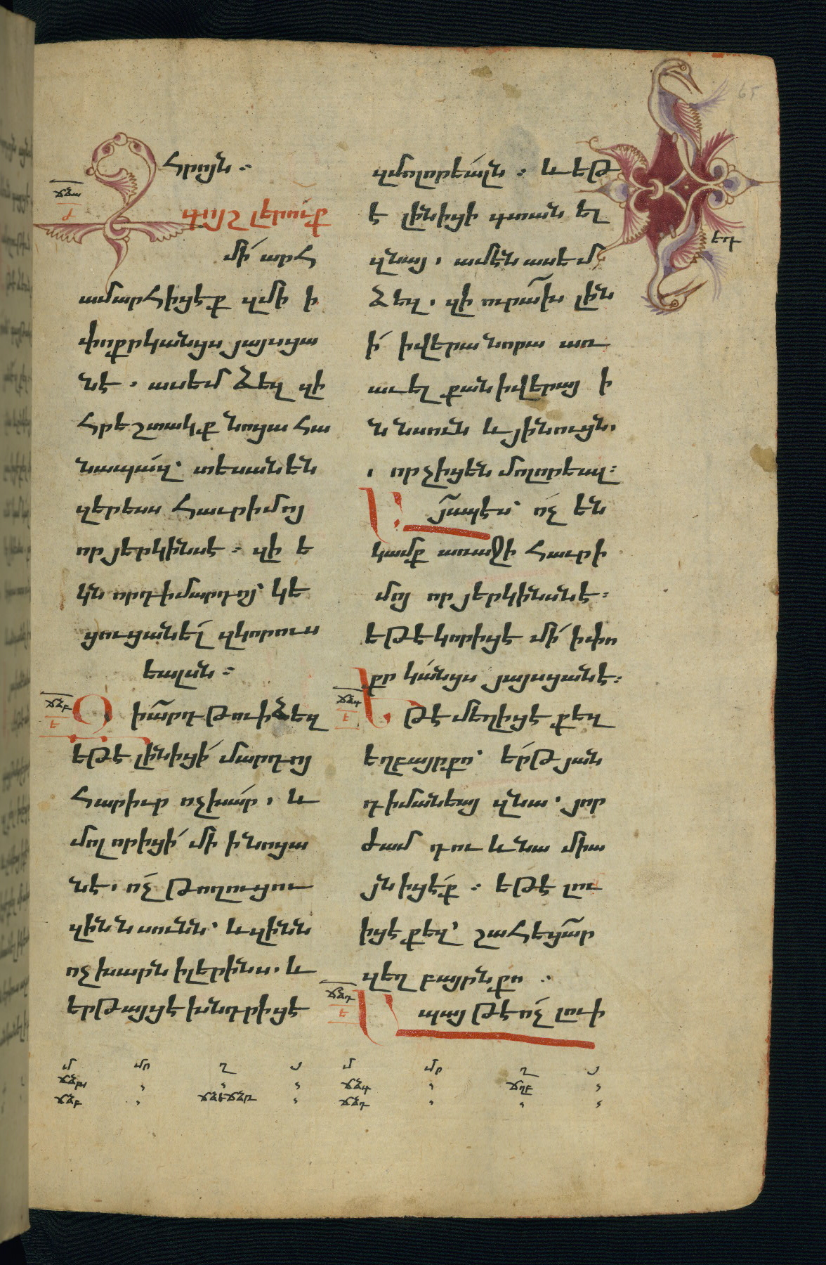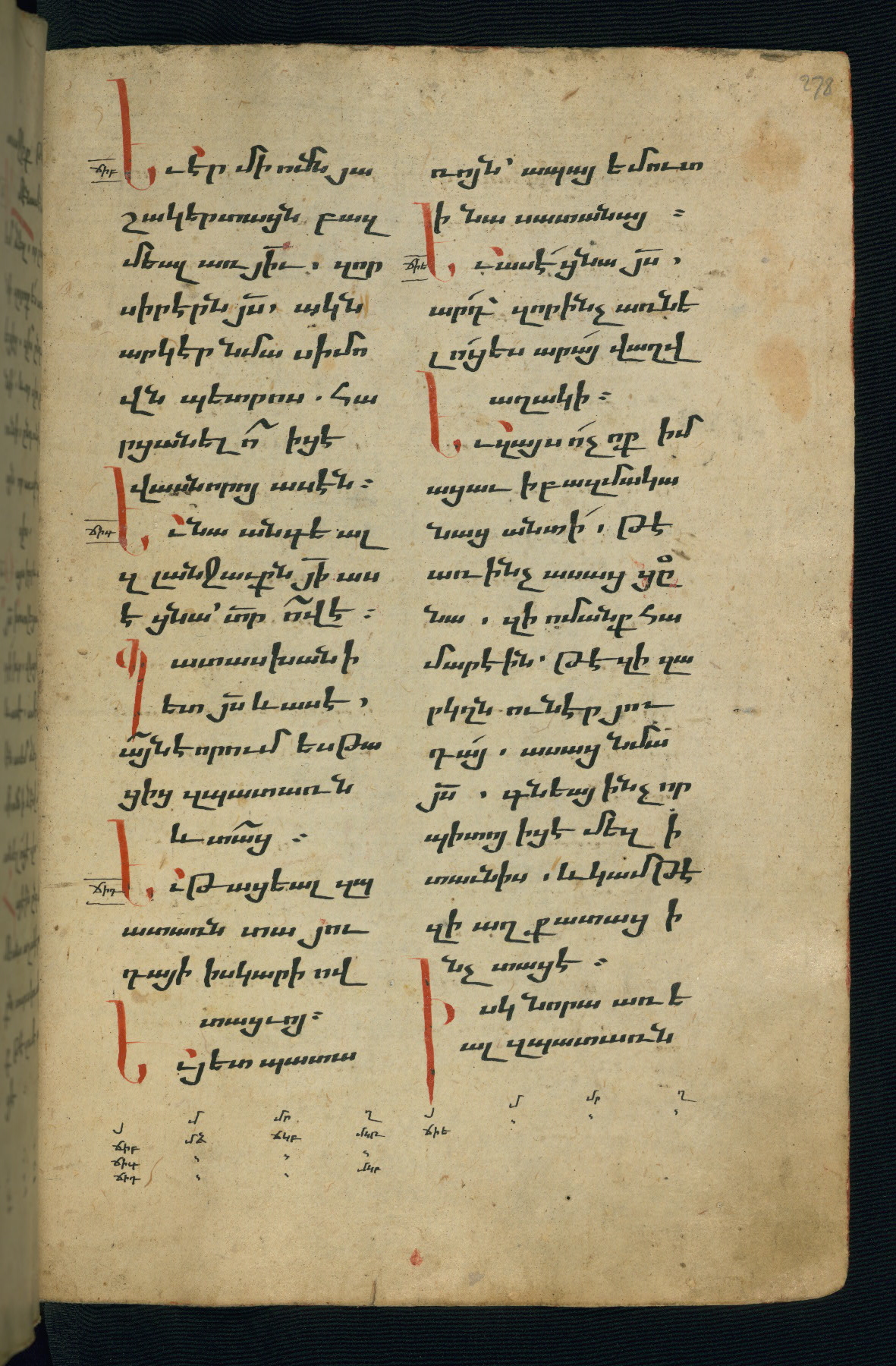 This Armenian Gospel book was produced in 904 of the Armenian era (1455 CE) at the monastery of Gamałiēl in Xizan by the scribe Yohannēs Vardapet, son of Vardan and Dilšat, and was illuminated by the priest Xačʿatur. The priest Pʿilipos commissioned the manuscript as a memorial to himself, his parents Łazar and Xutʿlumēlikʿ, and other relatives listed in the colophon on fols. 300r to 301v. Pʿilipos is depicted on fol. 14v alongside his brothers Yusēpʿ and Sultanša, as they kneel before the Virgin and Child enthroned (Theotokos). The book contains twenty-six full-page polychrome miniatures, including four Evangelist portraits; ornately designed canon tables; four decorated incipit pages; numerous marginal miniatures of floral and faunal motifs; and nineteen marginal miniatures of biblical characters or allusions to biblical narratives.
