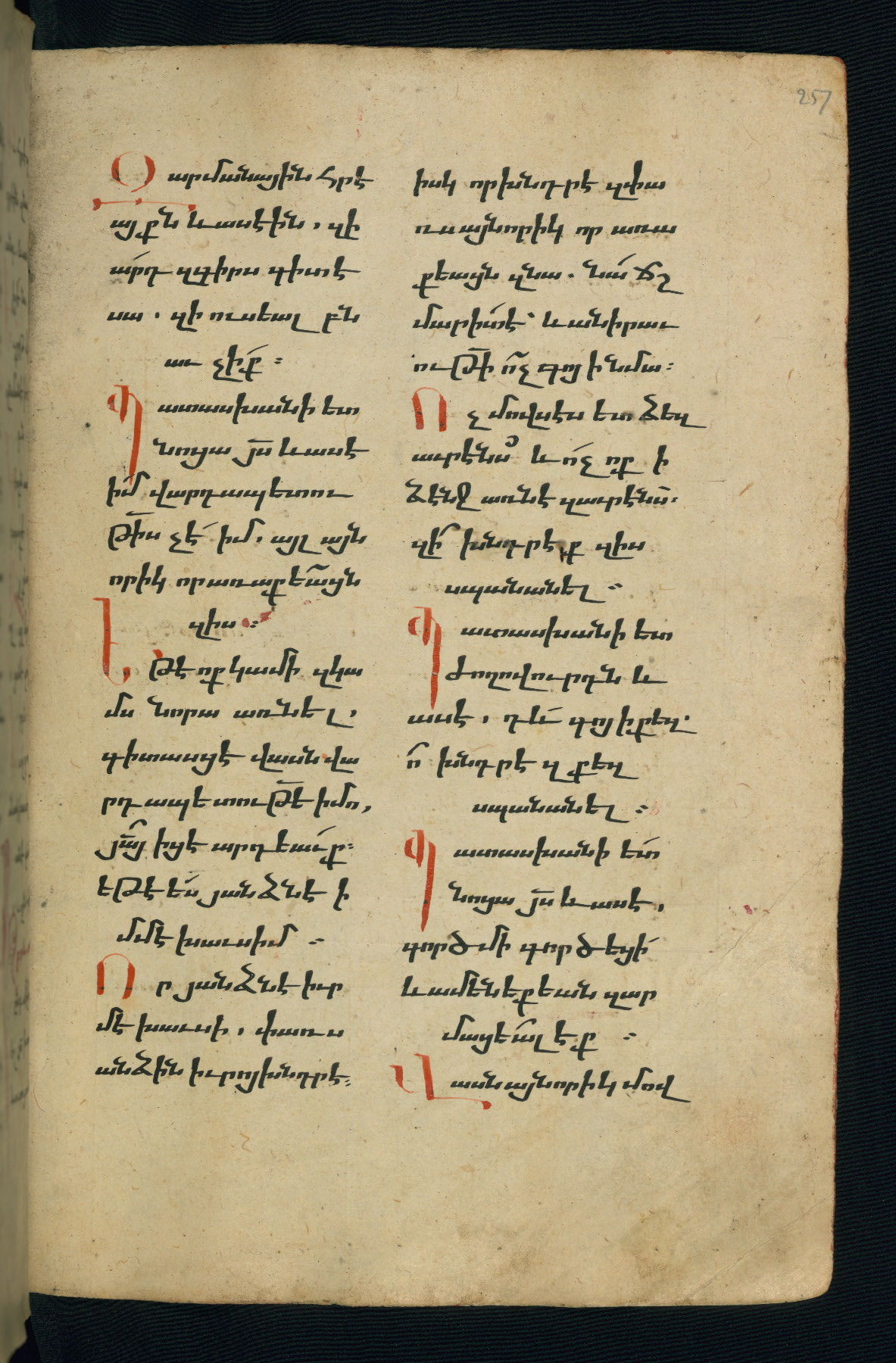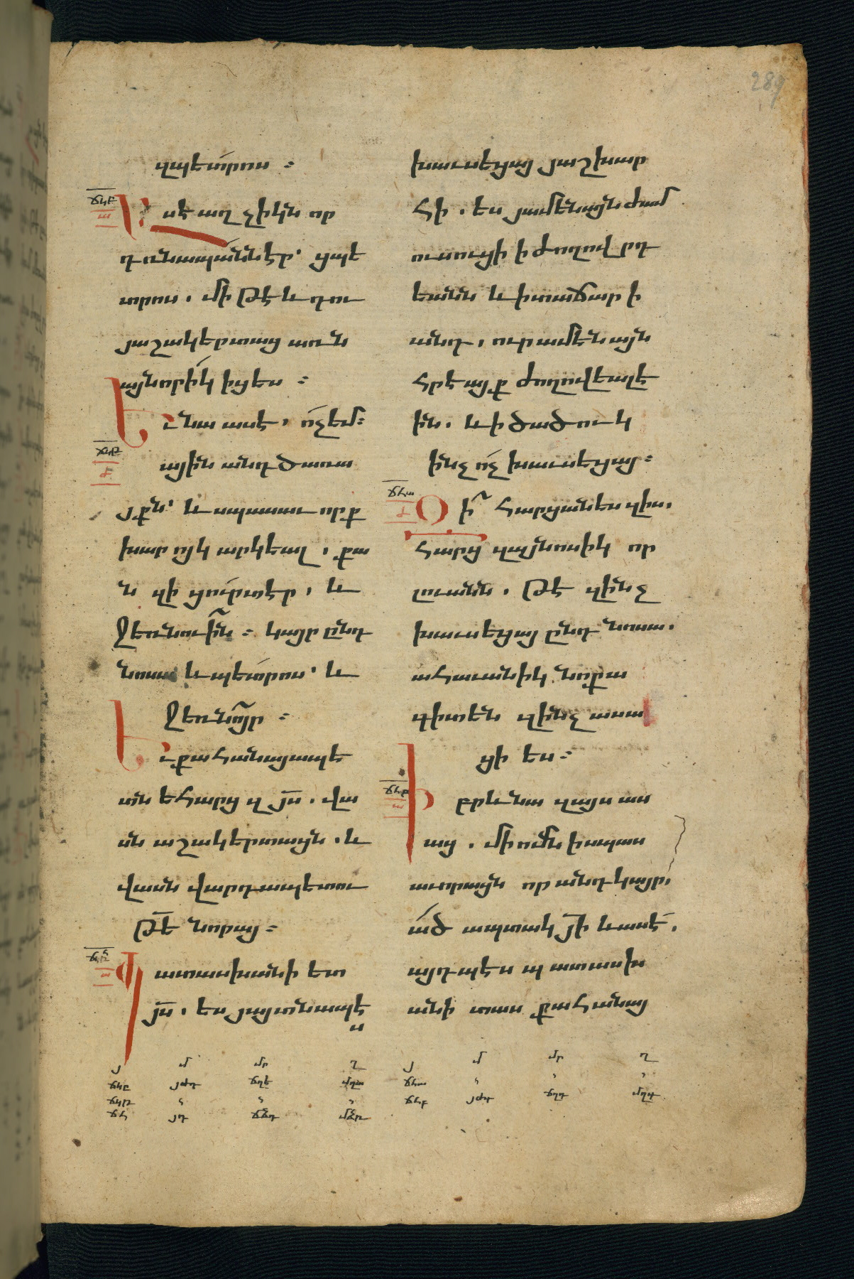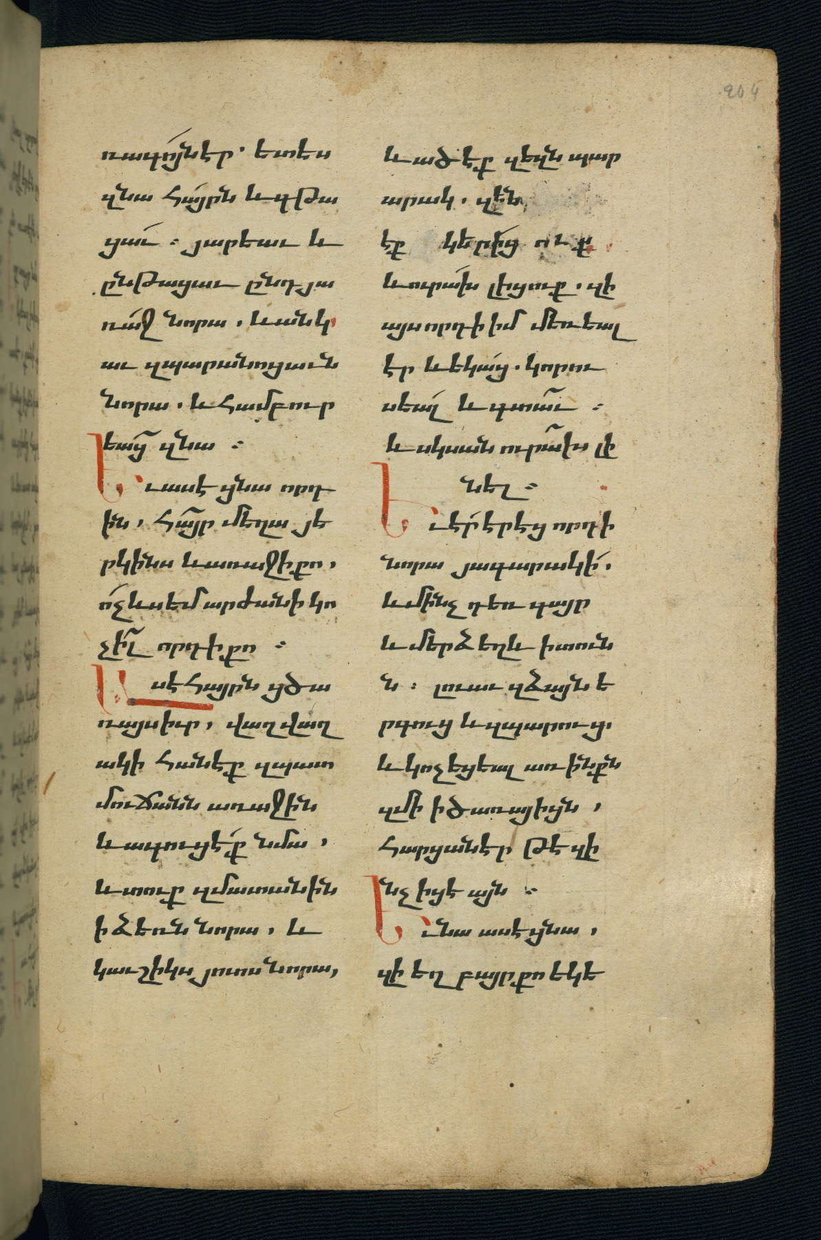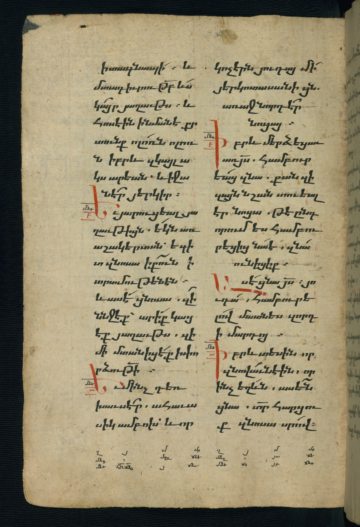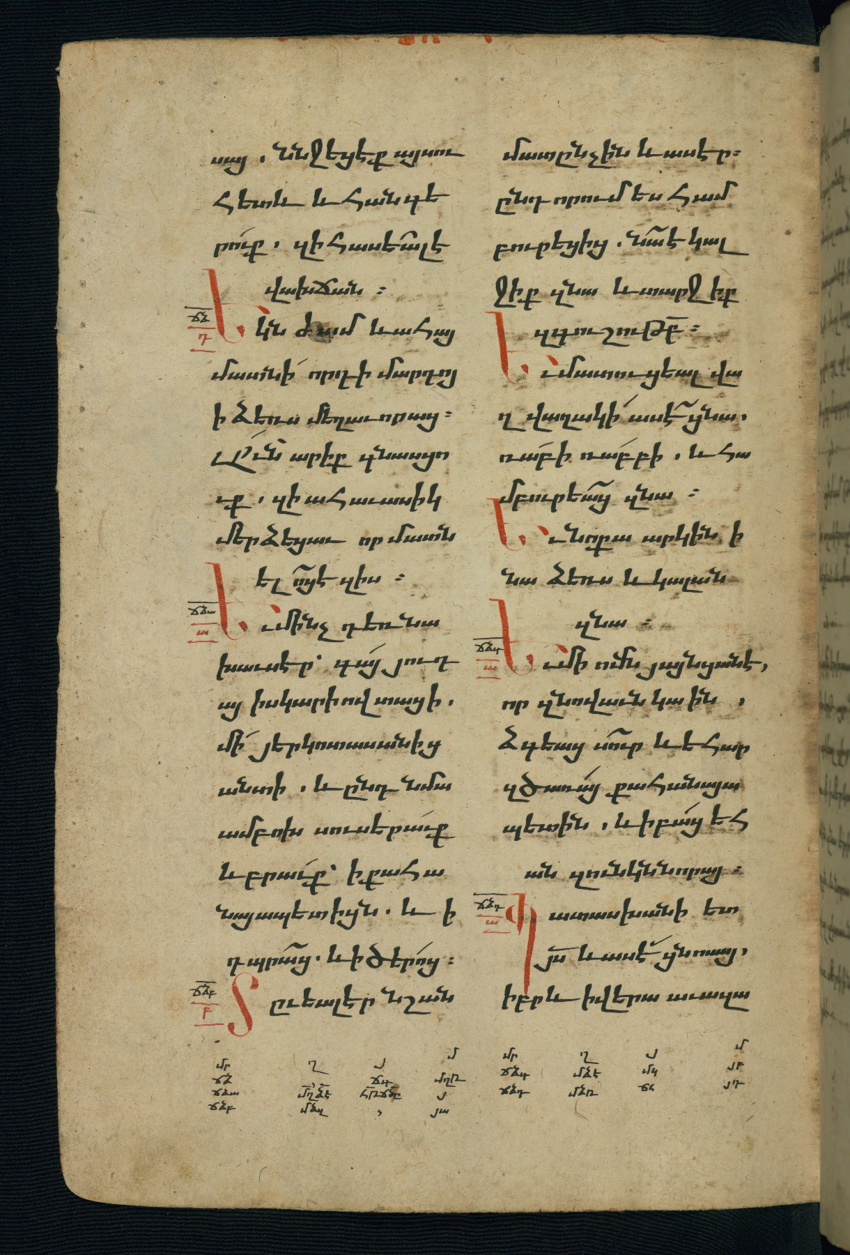 This Armenian Gospel book was produced in 904 of the Armenian era (1455 CE) at the monastery of Gamałiēl in Xizan by the scribe Yohannēs Vardapet, son of Vardan and Dilšat, and was illuminated by the priest Xačʿatur. The priest Pʿilipos commissioned the manuscript as a memorial to himself, his parents Łazar and Xutʿlumēlikʿ, and other relatives listed in the colophon on fols. 300r to 301v. Pʿilipos is depicted on fol. 14v alongside his brothers Yusēpʿ and Sultanša, as they kneel before the Virgin and Child enthroned (Theotokos). The book contains twenty-six full-page polychrome miniatures, including four Evangelist portraits; ornately designed canon tables; four decorated incipit pages; numerous marginal miniatures of floral and faunal motifs; and nineteen marginal miniatures of biblical characters or allusions to biblical narratives.