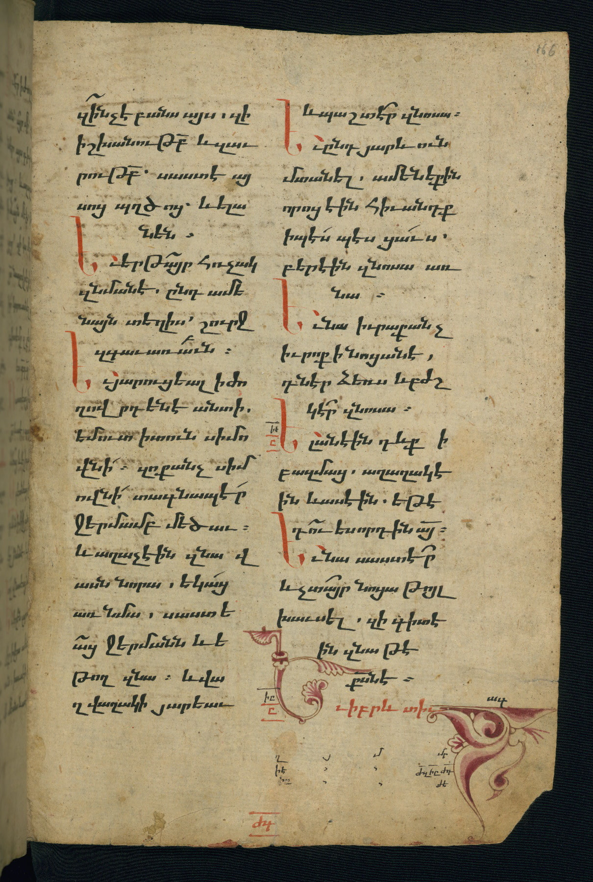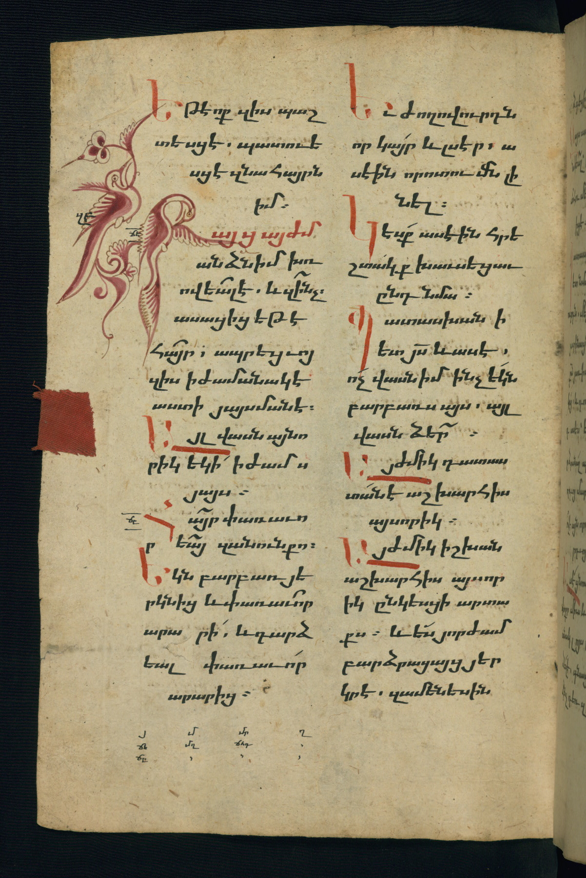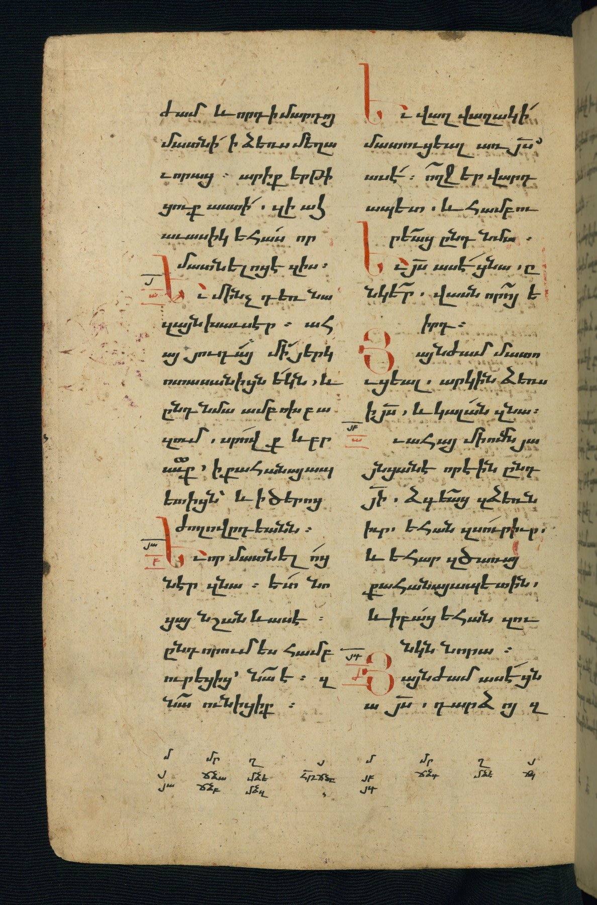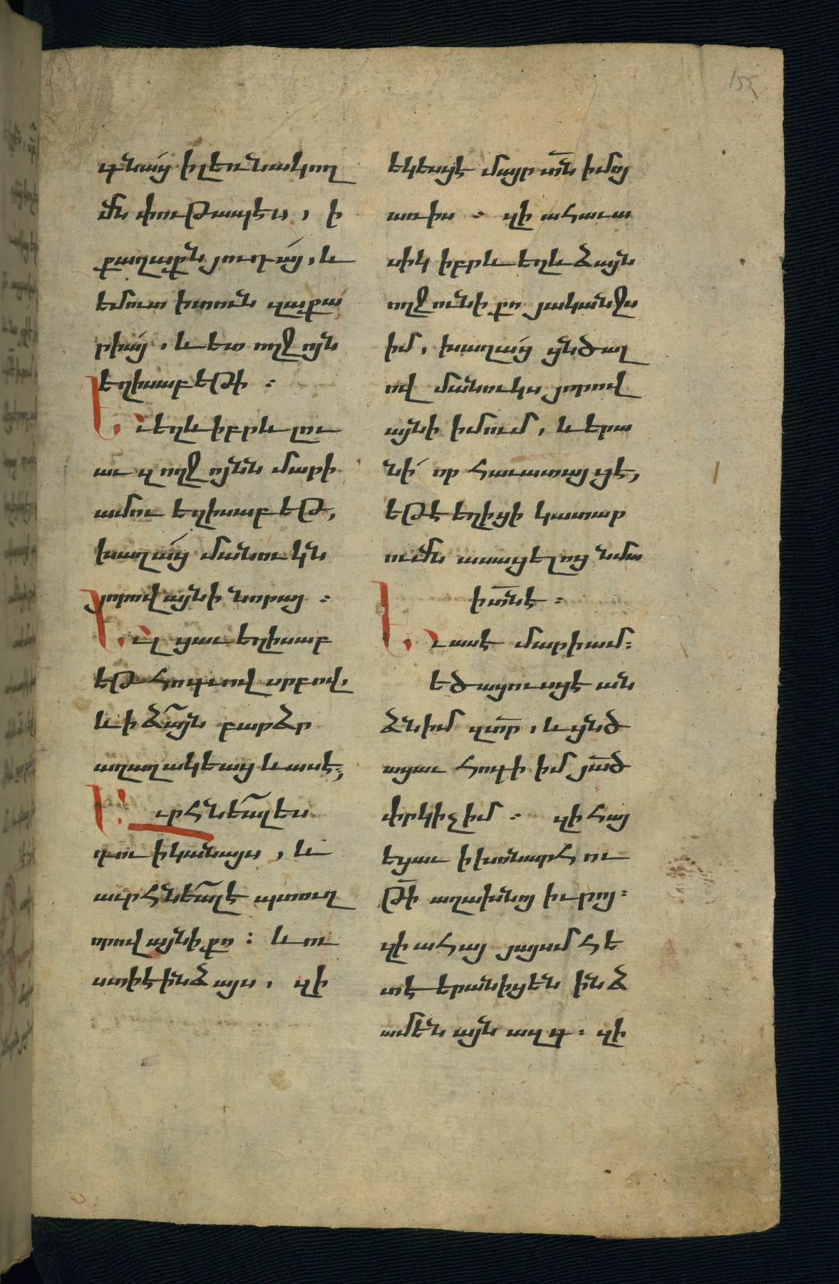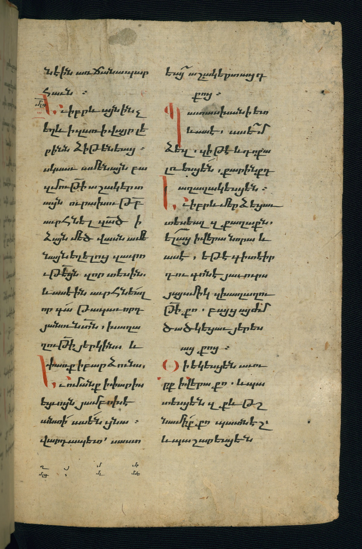 This Armenian Gospel book was produced in 904 of the Armenian era (1455 CE) at the monastery of Gamałiēl in Xizan by the scribe Yohannēs Vardapet, son of Vardan and Dilšat, and was illuminated by the priest Xačʿatur. The priest Pʿilipos commissioned the manuscript as a memorial to himself, his parents Łazar and Xutʿlumēlikʿ, and other relatives listed in the colophon on fols. 300r to 301v. Pʿilipos is depicted on fol. 14v alongside his brothers Yusēpʿ and Sultanša, as they kneel before the Virgin and Child enthroned (Theotokos). The book contains twenty-six full-page polychrome miniatures, including four Evangelist portraits; ornately designed canon tables; four decorated incipit pages; numerous marginal miniatures of floral and faunal motifs; and nineteen marginal miniatures of biblical characters or allusions to biblical narratives.