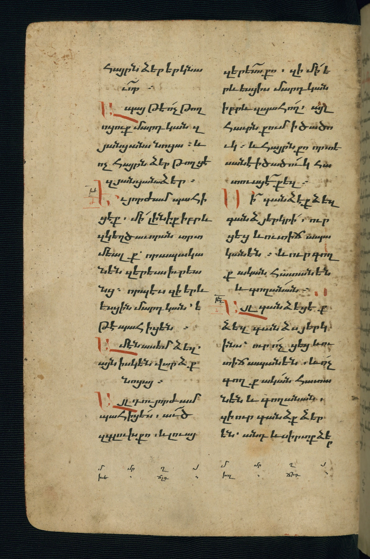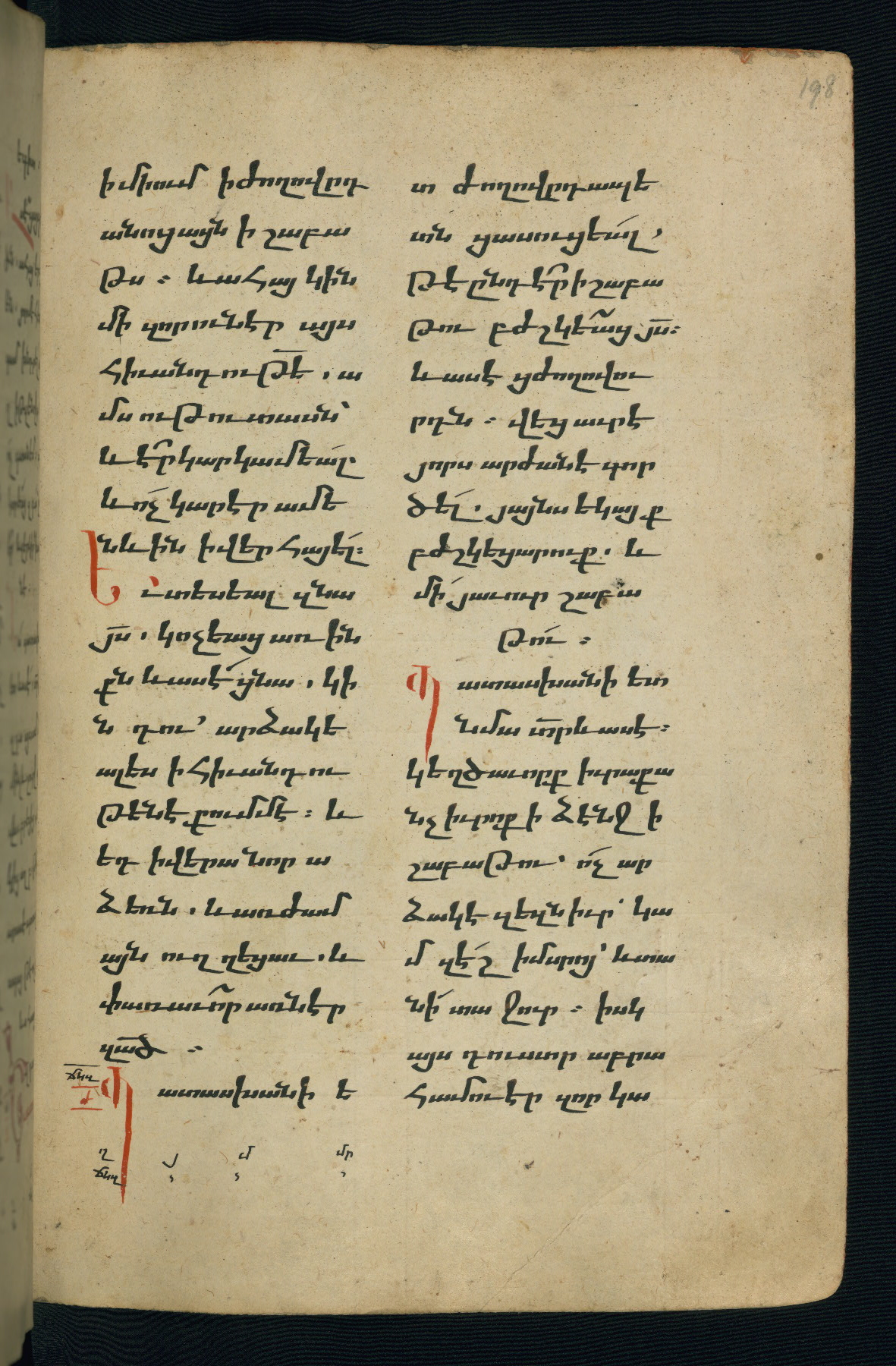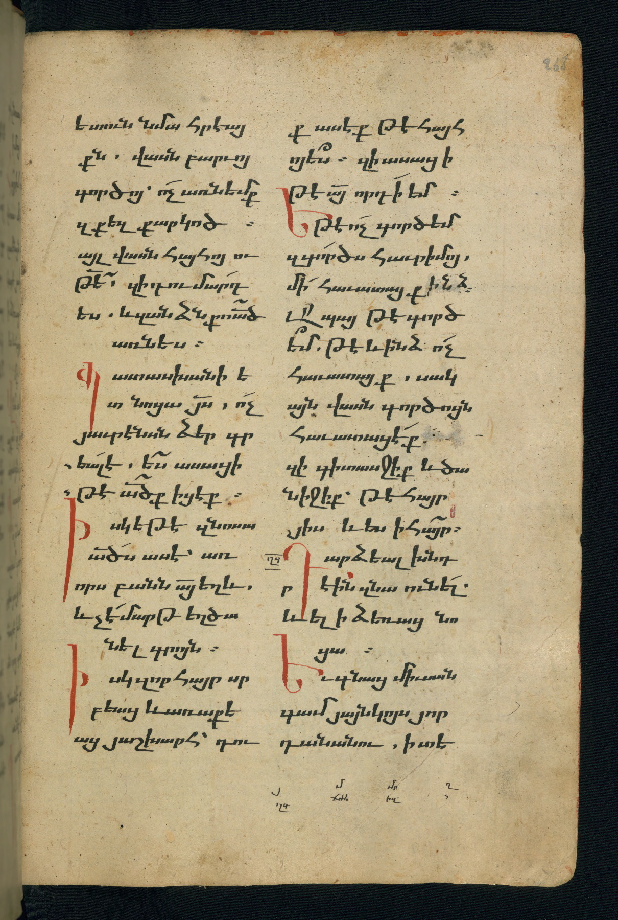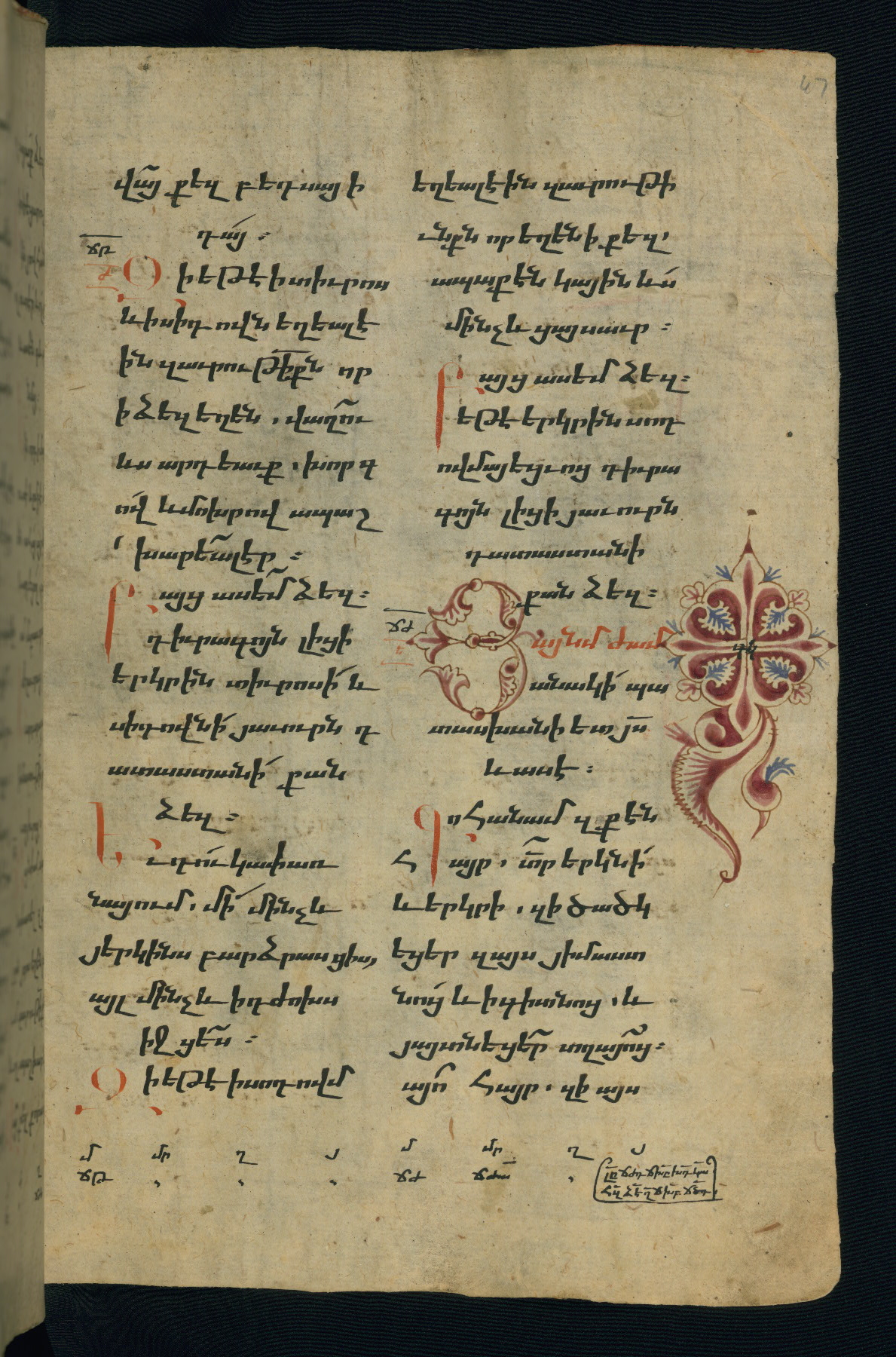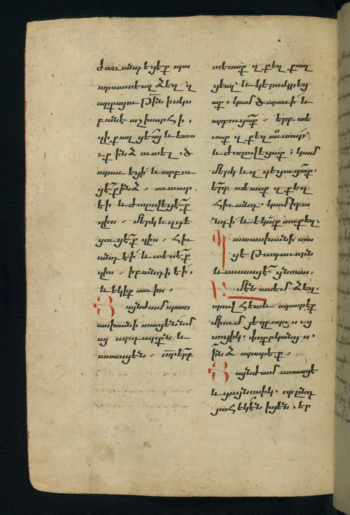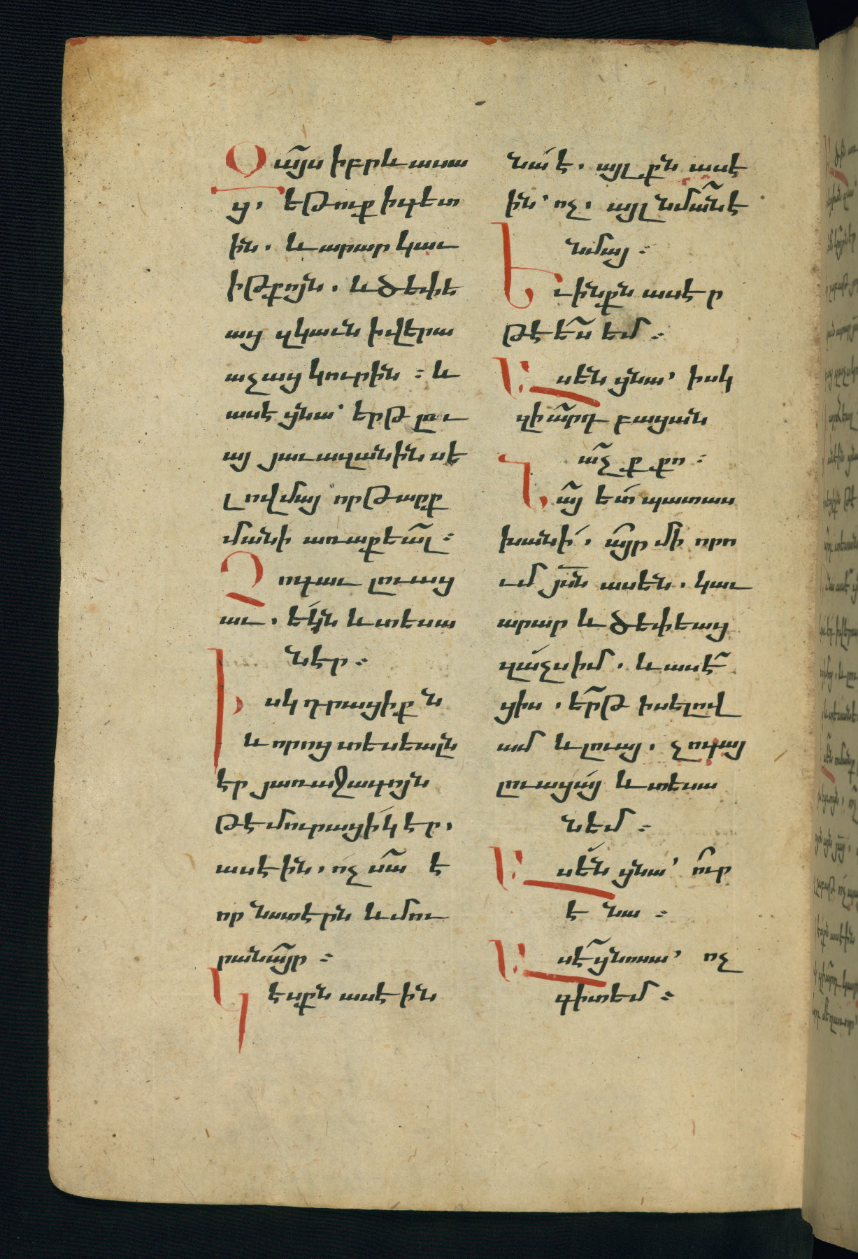 This Armenian Gospel book was produced in 904 of the Armenian era (1455 CE) at the monastery of Gamałiēl in Xizan by the scribe Yohannēs Vardapet, son of Vardan and Dilšat, and was illuminated by the priest Xačʿatur. The priest Pʿilipos commissioned the manuscript as a memorial to himself, his parents Łazar and Xutʿlumēlikʿ, and other relatives listed in the colophon on fols. 300r to 301v. Pʿilipos is depicted on fol. 14v alongside his brothers Yusēpʿ and Sultanša, as they kneel before the Virgin and Child enthroned (Theotokos). The book contains twenty-six full-page polychrome miniatures, including four Evangelist portraits; ornately designed canon tables; four decorated incipit pages; numerous marginal miniatures of floral and faunal motifs; and nineteen marginal miniatures of biblical characters or allusions to biblical narratives.