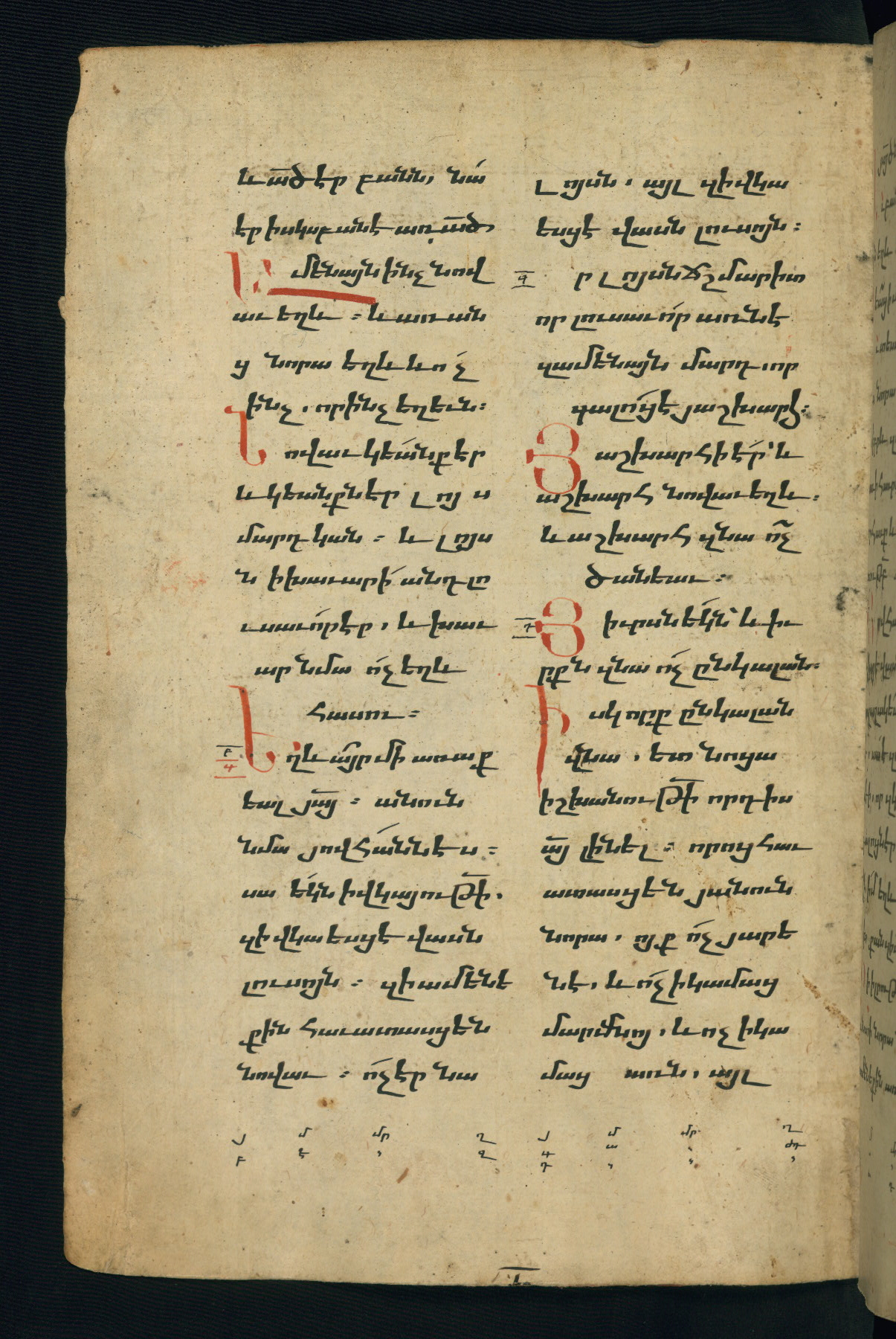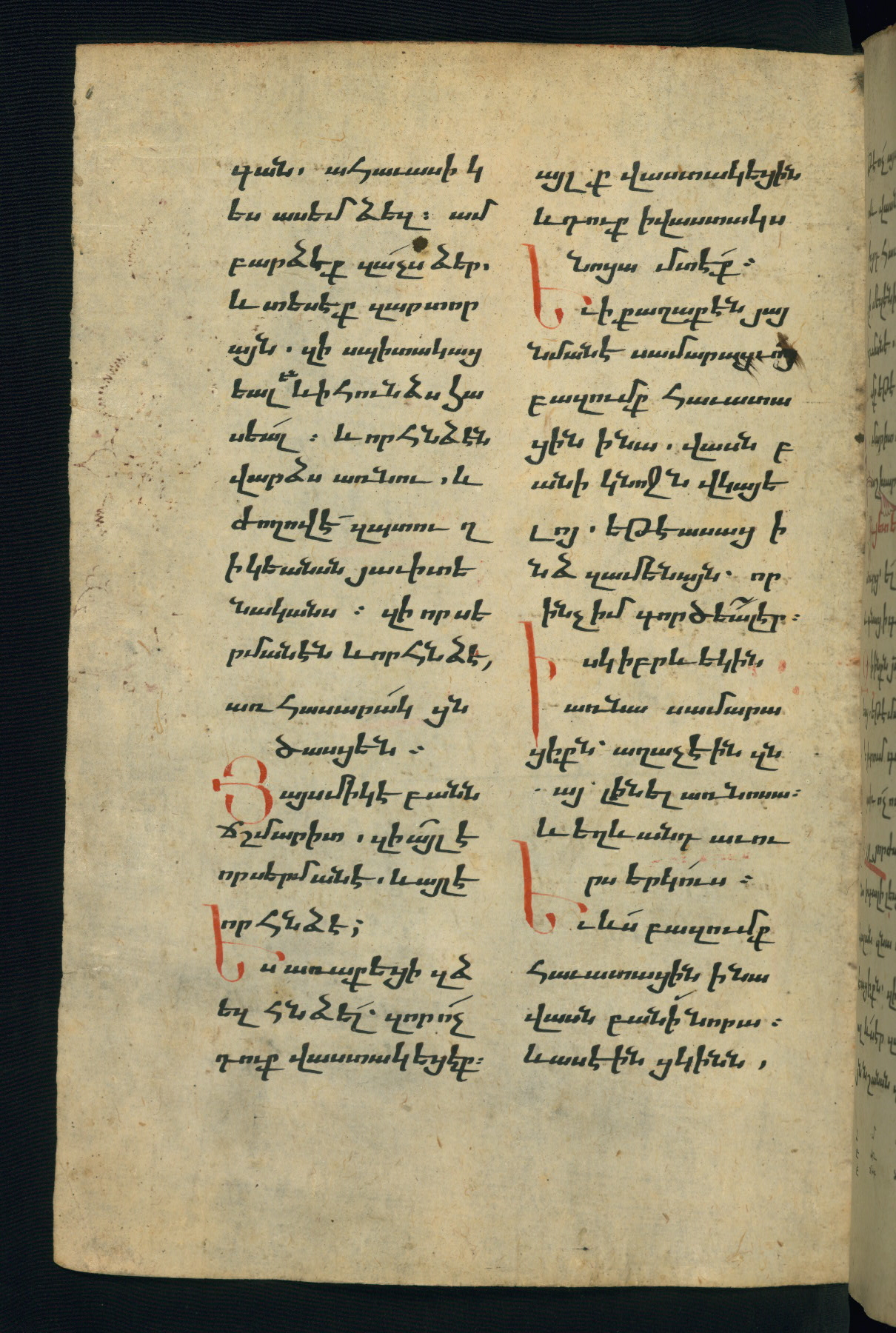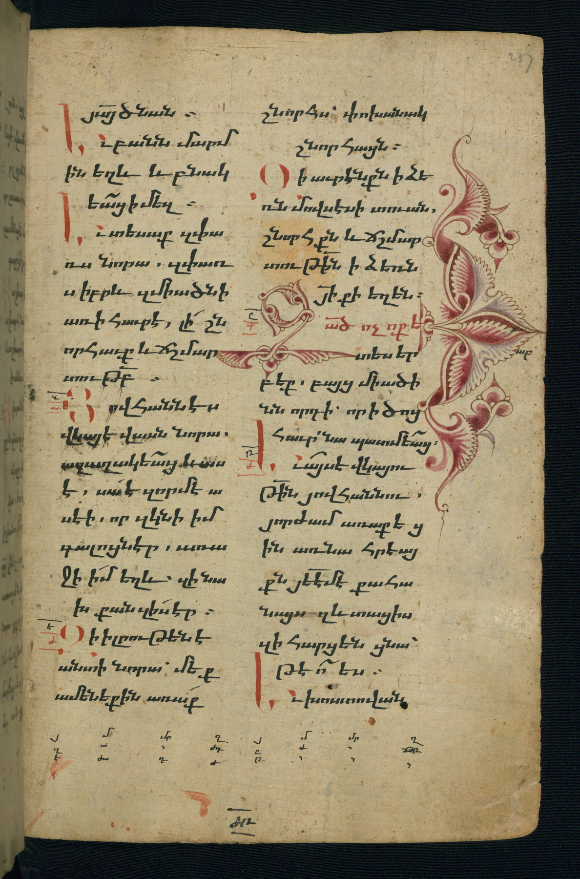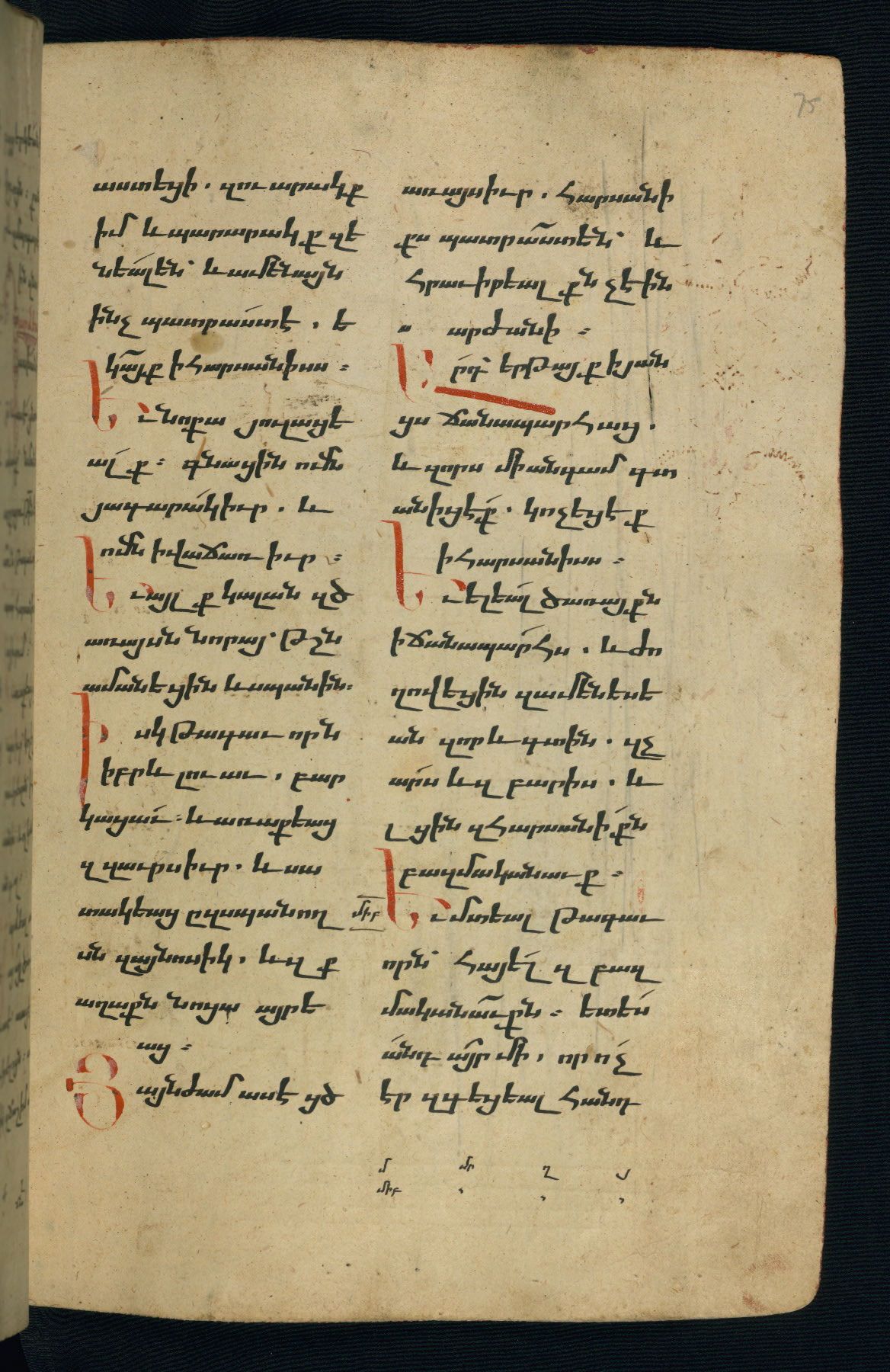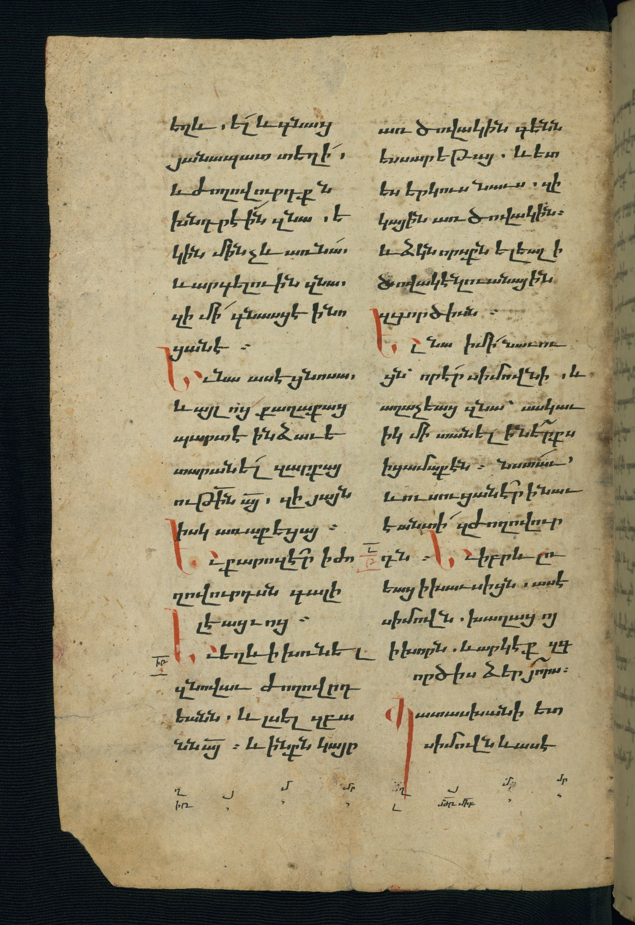 This Armenian Gospel book was produced in 904 of the Armenian era (1455 CE) at the monastery of Gamałiēl in Xizan by the scribe Yohannēs Vardapet, son of Vardan and Dilšat, and was illuminated by the priest Xačʿatur. The priest Pʿilipos commissioned the manuscript as a memorial to himself, his parents Łazar and Xutʿlumēlikʿ, and other relatives listed in the colophon on fols. 300r to 301v. Pʿilipos is depicted on fol. 14v alongside his brothers Yusēpʿ and Sultanša, as they kneel before the Virgin and Child enthroned (Theotokos). The book contains twenty-six full-page polychrome miniatures, including four Evangelist portraits; ornately designed canon tables; four decorated incipit pages; numerous marginal miniatures of floral and faunal motifs; and nineteen marginal miniatures of biblical characters or allusions to biblical narratives.