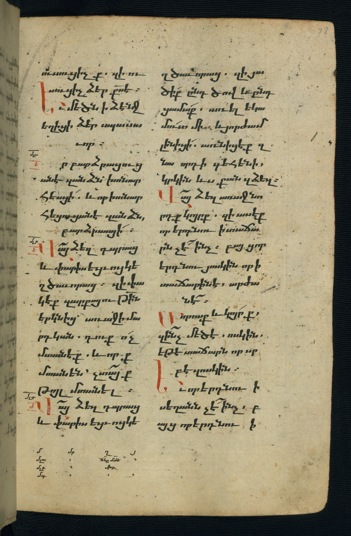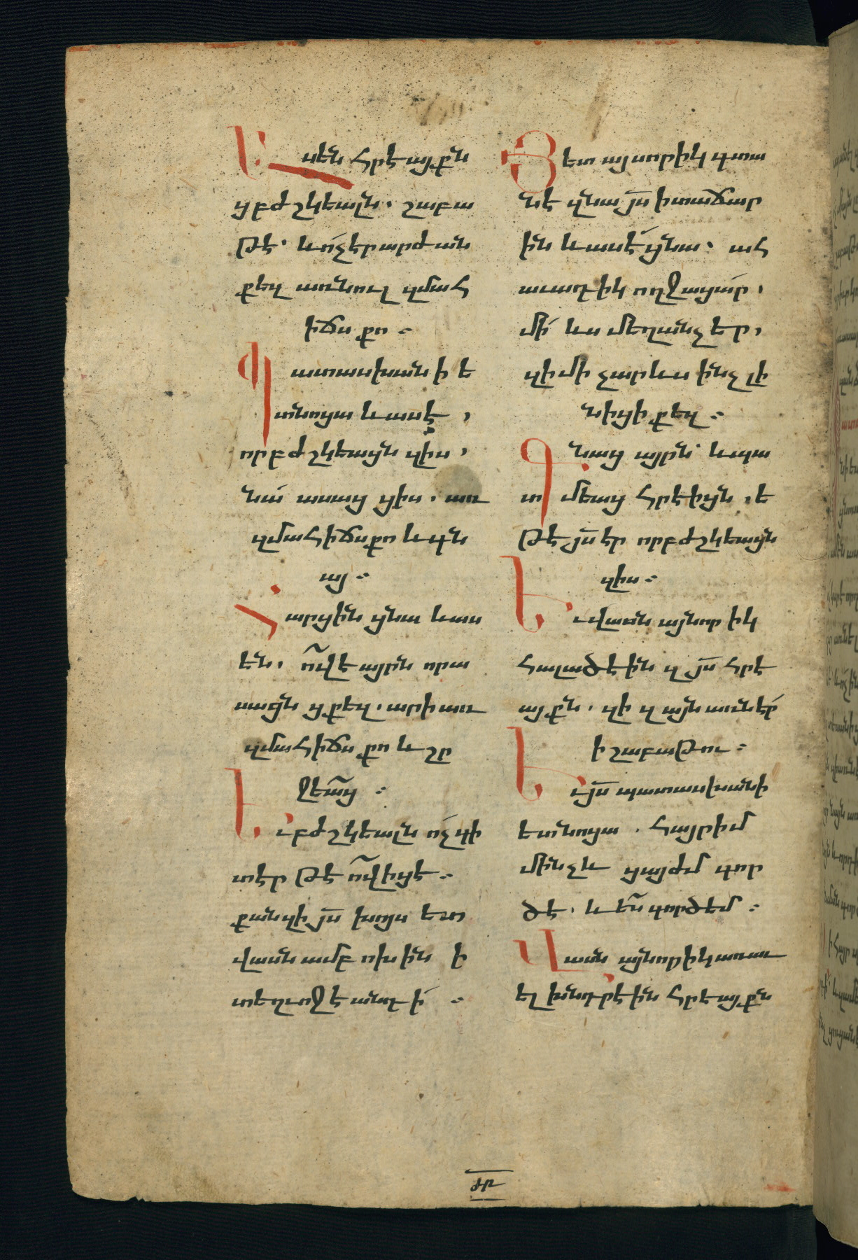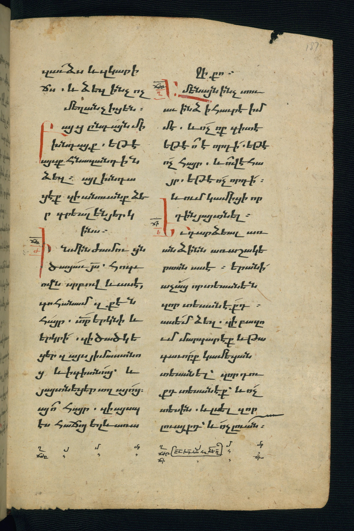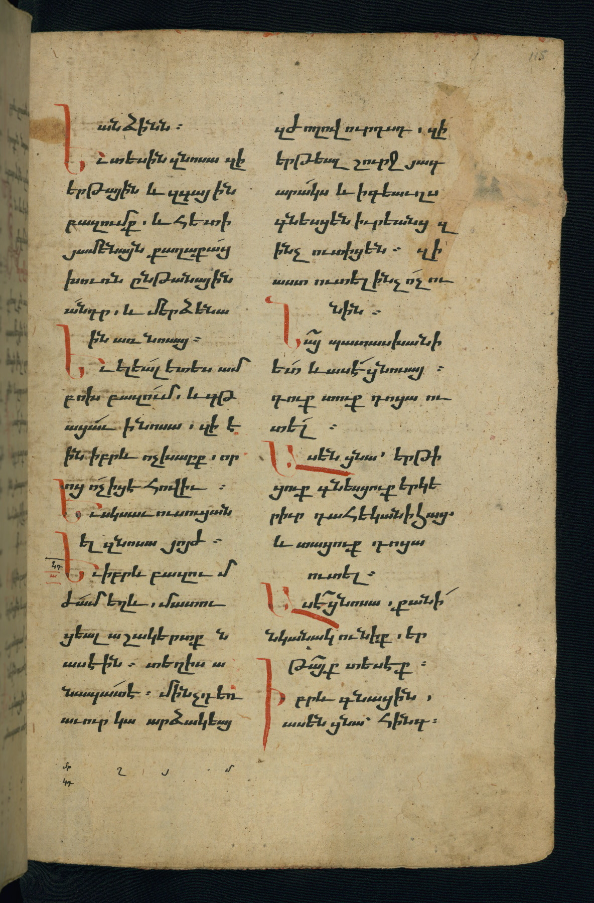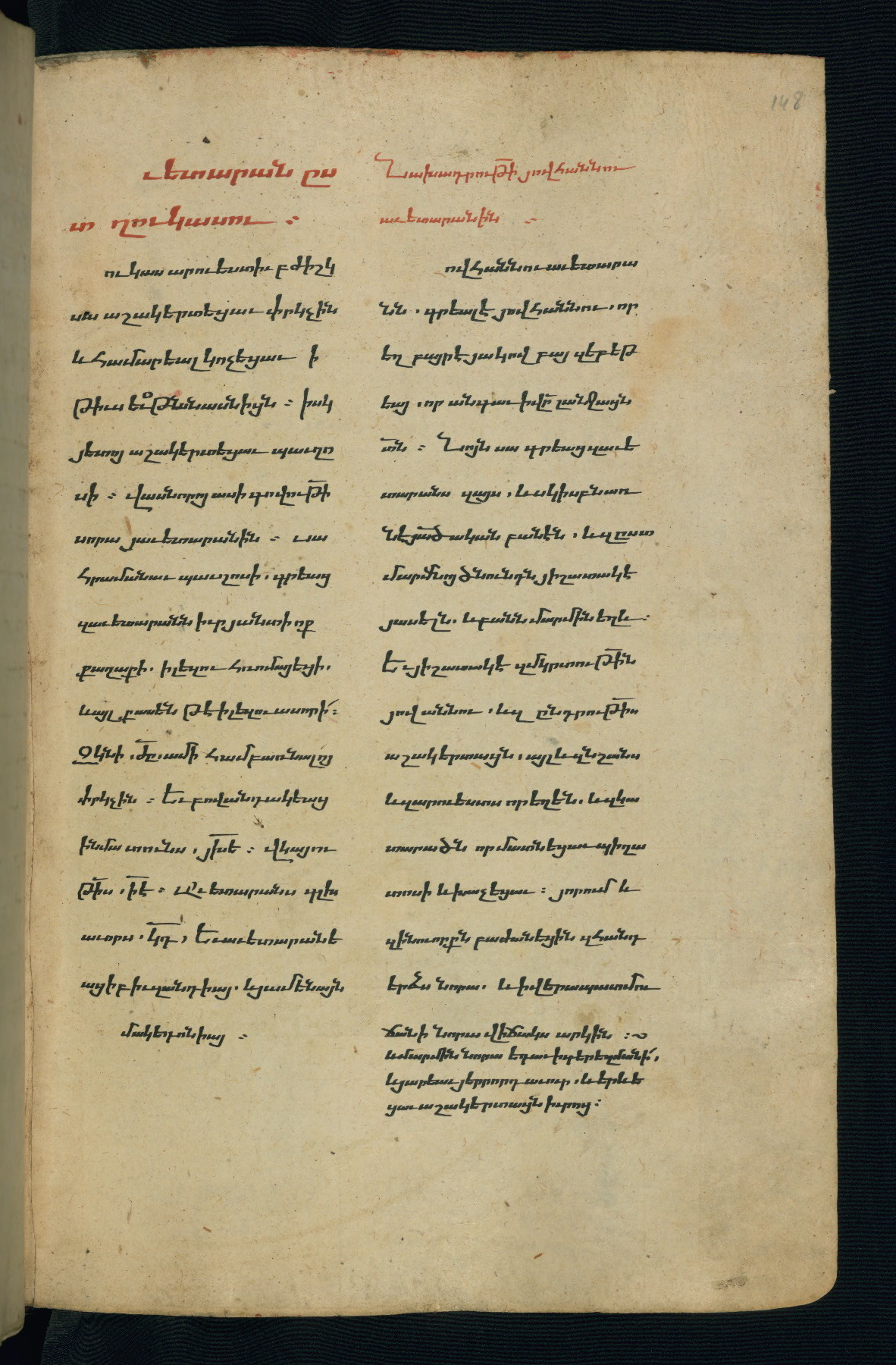 This Armenian Gospel book was produced in 904 of the Armenian era (1455 CE) at the monastery of Gamałiēl in Xizan by the scribe Yohannēs Vardapet, son of Vardan and Dilšat, and was illuminated by the priest Xačʿatur. The priest Pʿilipos commissioned the manuscript as a memorial to himself, his parents Łazar and Xutʿlumēlikʿ, and other relatives listed in the colophon on fols. 300r to 301v. Pʿilipos is depicted on fol. 14v alongside his brothers Yusēpʿ and Sultanša, as they kneel before the Virgin and Child enthroned (Theotokos). The book contains twenty-six full-page polychrome miniatures, including four Evangelist portraits; ornately designed canon tables; four decorated incipit pages; numerous marginal miniatures of floral and faunal motifs; and nineteen marginal miniatures of biblical characters or allusions to biblical narratives.
