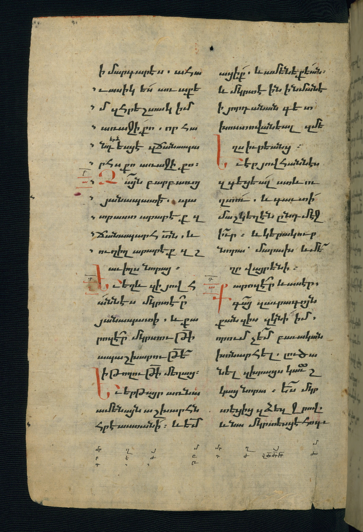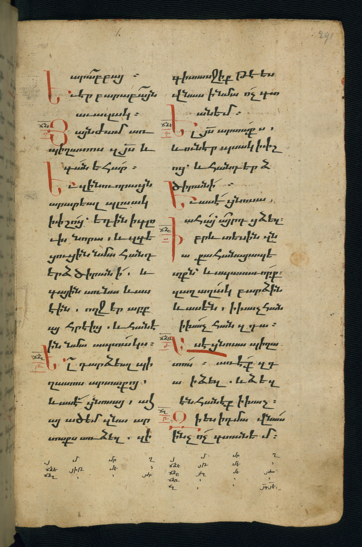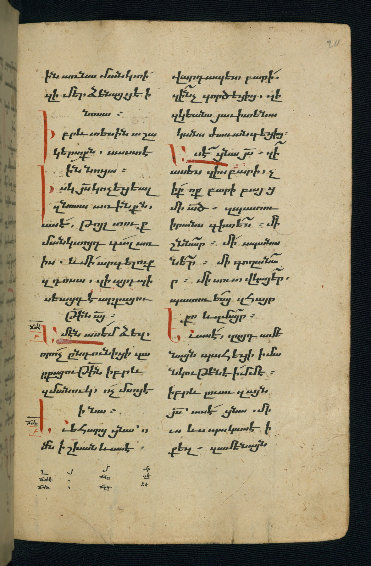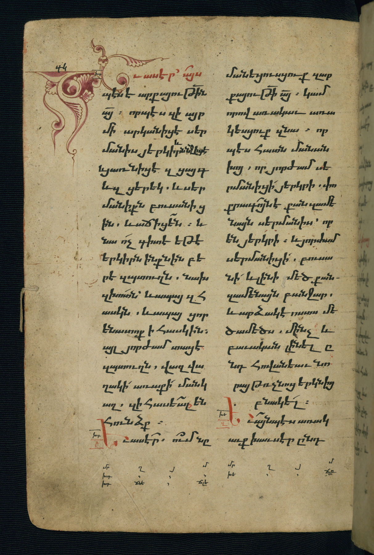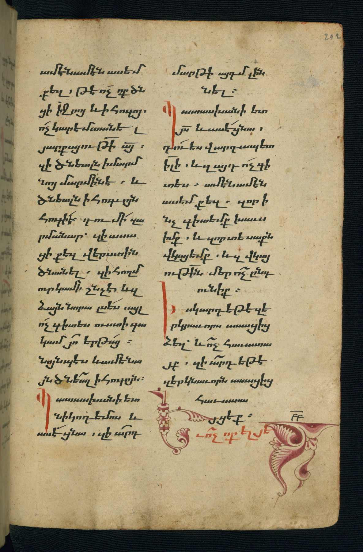 This Armenian Gospel book was produced in 904 of the Armenian era (1455 CE) at the monastery of Gamałiēl in Xizan by the scribe Yohannēs Vardapet, son of Vardan and Dilšat, and was illuminated by the priest Xačʿatur. The priest Pʿilipos commissioned the manuscript as a memorial to himself, his parents Łazar and Xutʿlumēlikʿ, and other relatives listed in the colophon on fols. 300r to 301v. Pʿilipos is depicted on fol. 14v alongside his brothers Yusēpʿ and Sultanša, as they kneel before the Virgin and Child enthroned (Theotokos). The book contains twenty-six full-page polychrome miniatures, including four Evangelist portraits; ornately designed canon tables; four decorated incipit pages; numerous marginal miniatures of floral and faunal motifs; and nineteen marginal miniatures of biblical characters or allusions to biblical narratives.