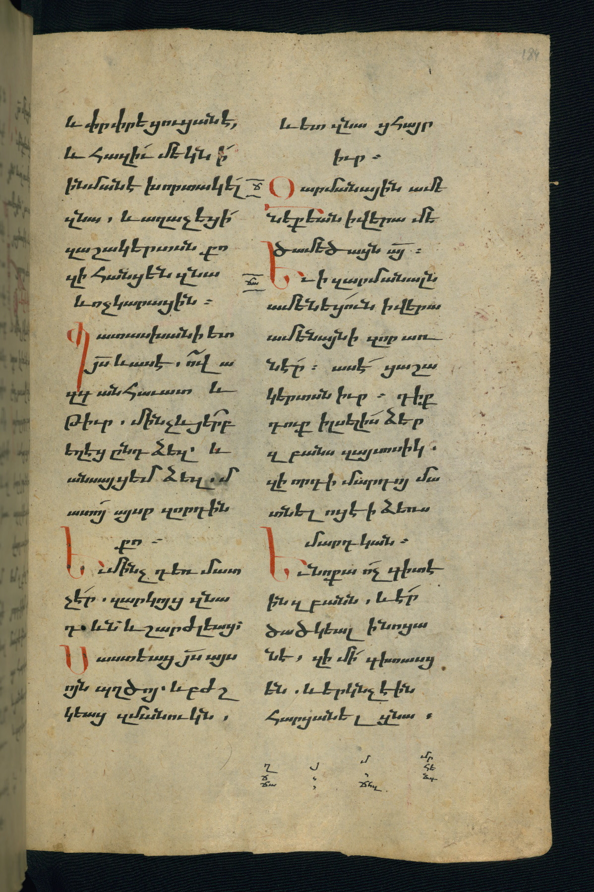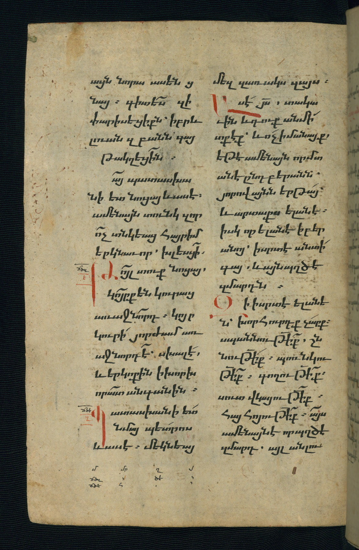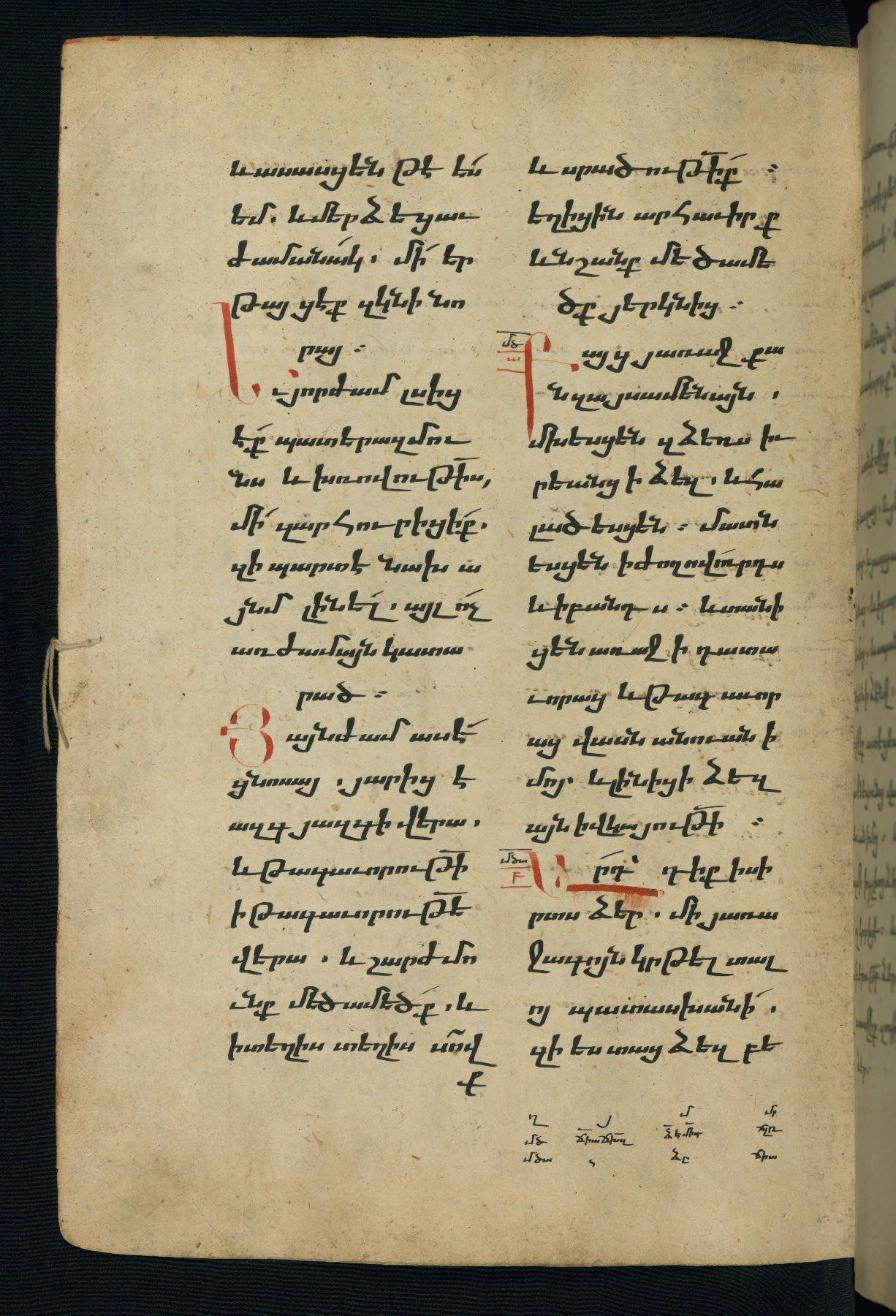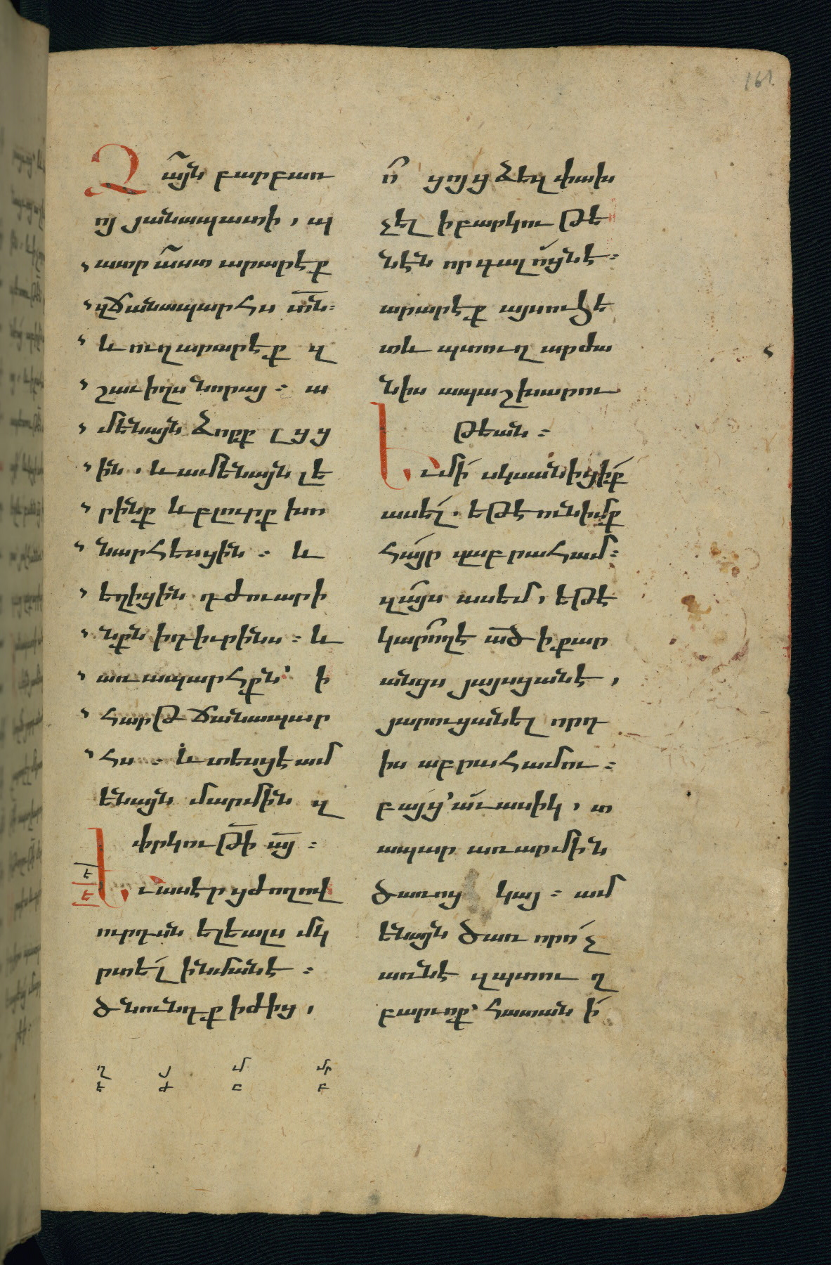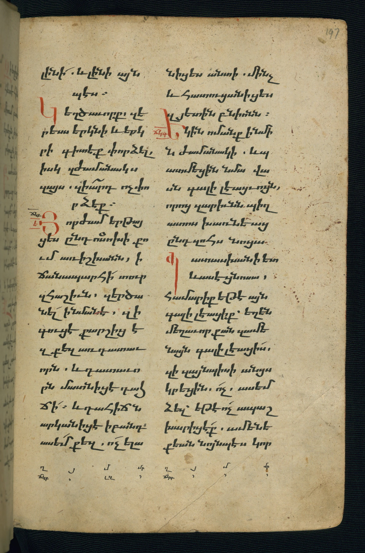 This Armenian Gospel book was produced in 904 of the Armenian era (1455 CE) at the monastery of Gamałiēl in Xizan by the scribe Yohannēs Vardapet, son of Vardan and Dilšat, and was illuminated by the priest Xačʿatur. The priest Pʿilipos commissioned the manuscript as a memorial to himself, his parents Łazar and Xutʿlumēlikʿ, and other relatives listed in the colophon on fols. 300r to 301v. Pʿilipos is depicted on fol. 14v alongside his brothers Yusēpʿ and Sultanša, as they kneel before the Virgin and Child enthroned (Theotokos). The book contains twenty-six full-page polychrome miniatures, including four Evangelist portraits; ornately designed canon tables; four decorated incipit pages; numerous marginal miniatures of floral and faunal motifs; and nineteen marginal miniatures of biblical characters or allusions to biblical narratives.