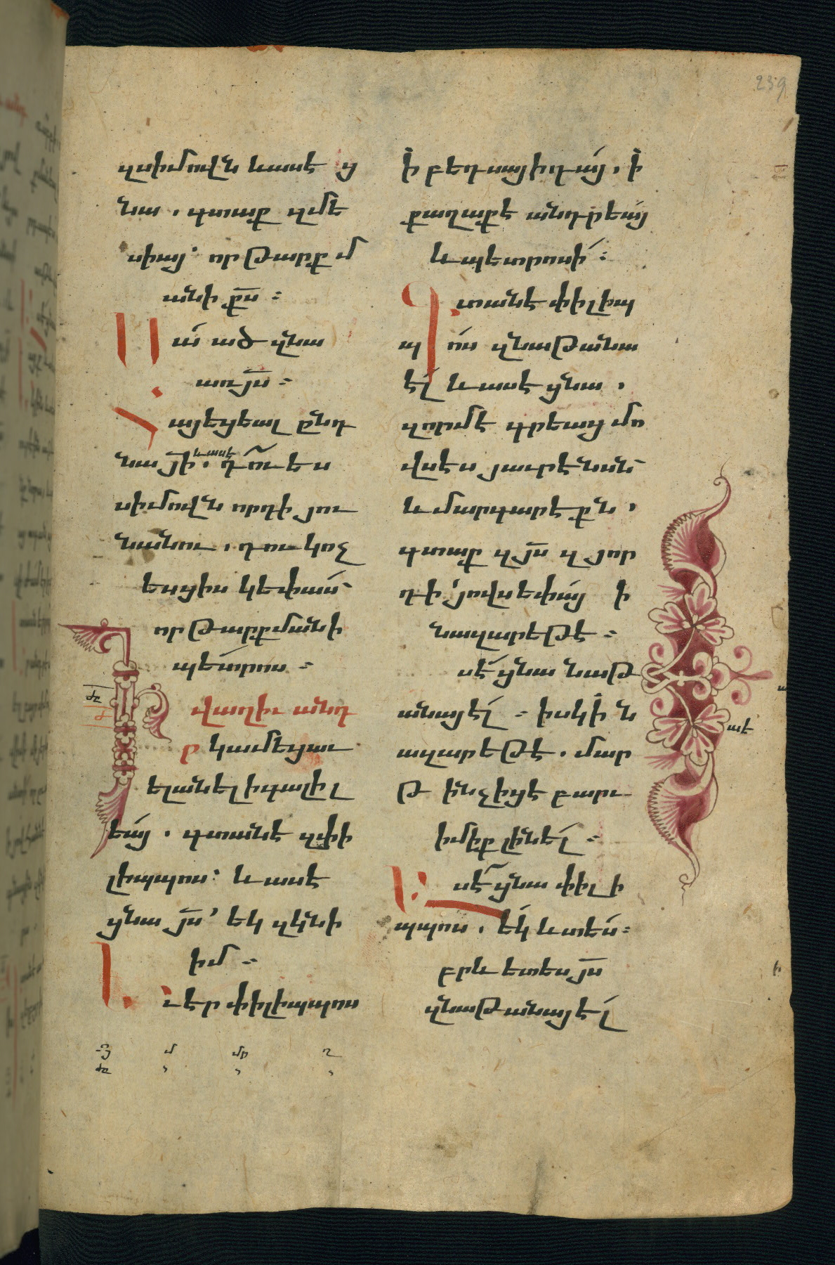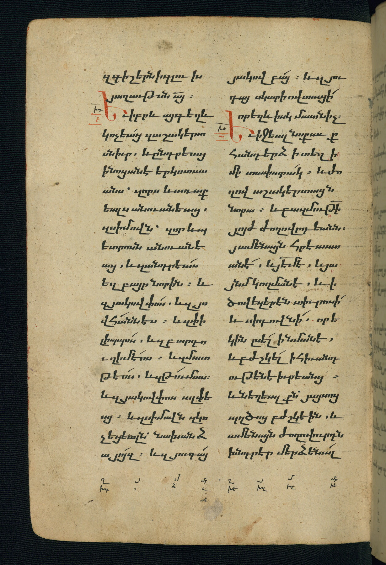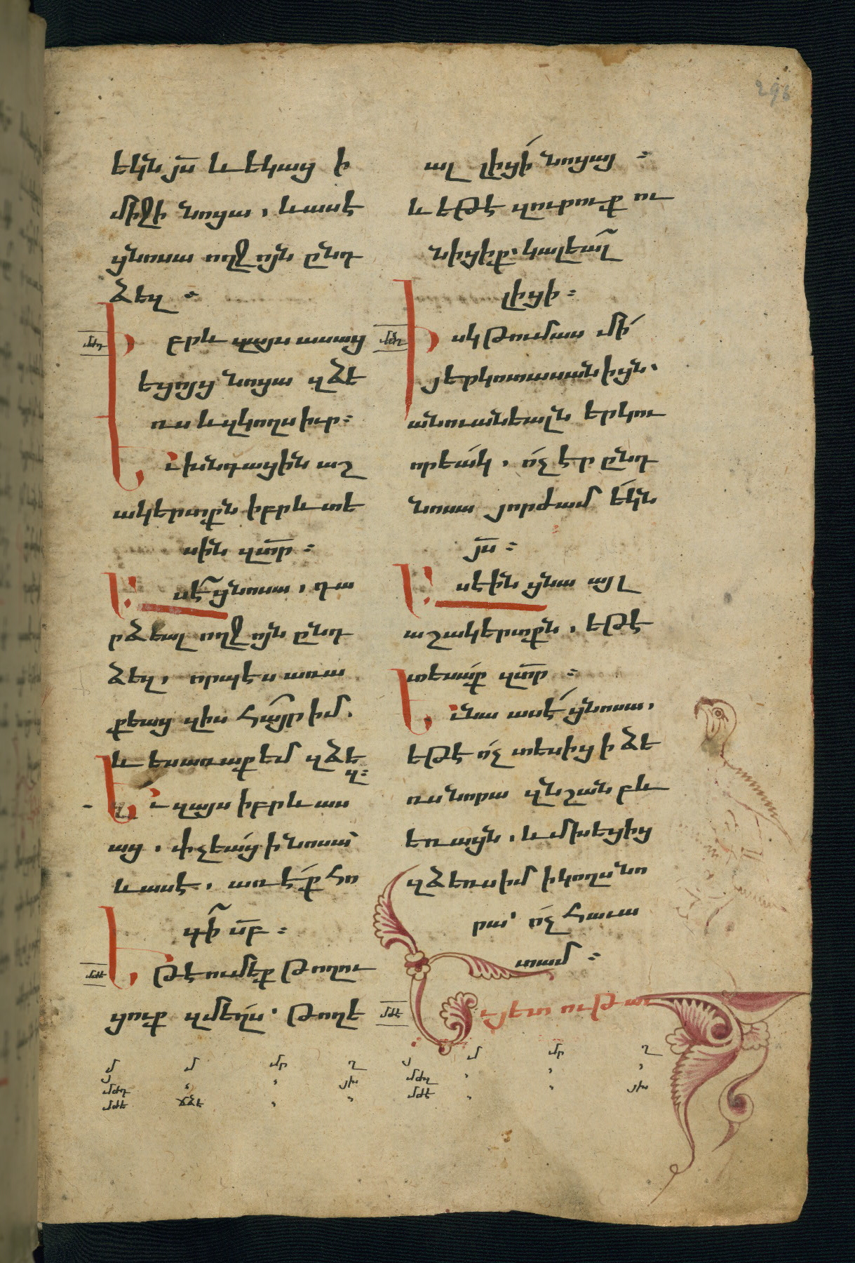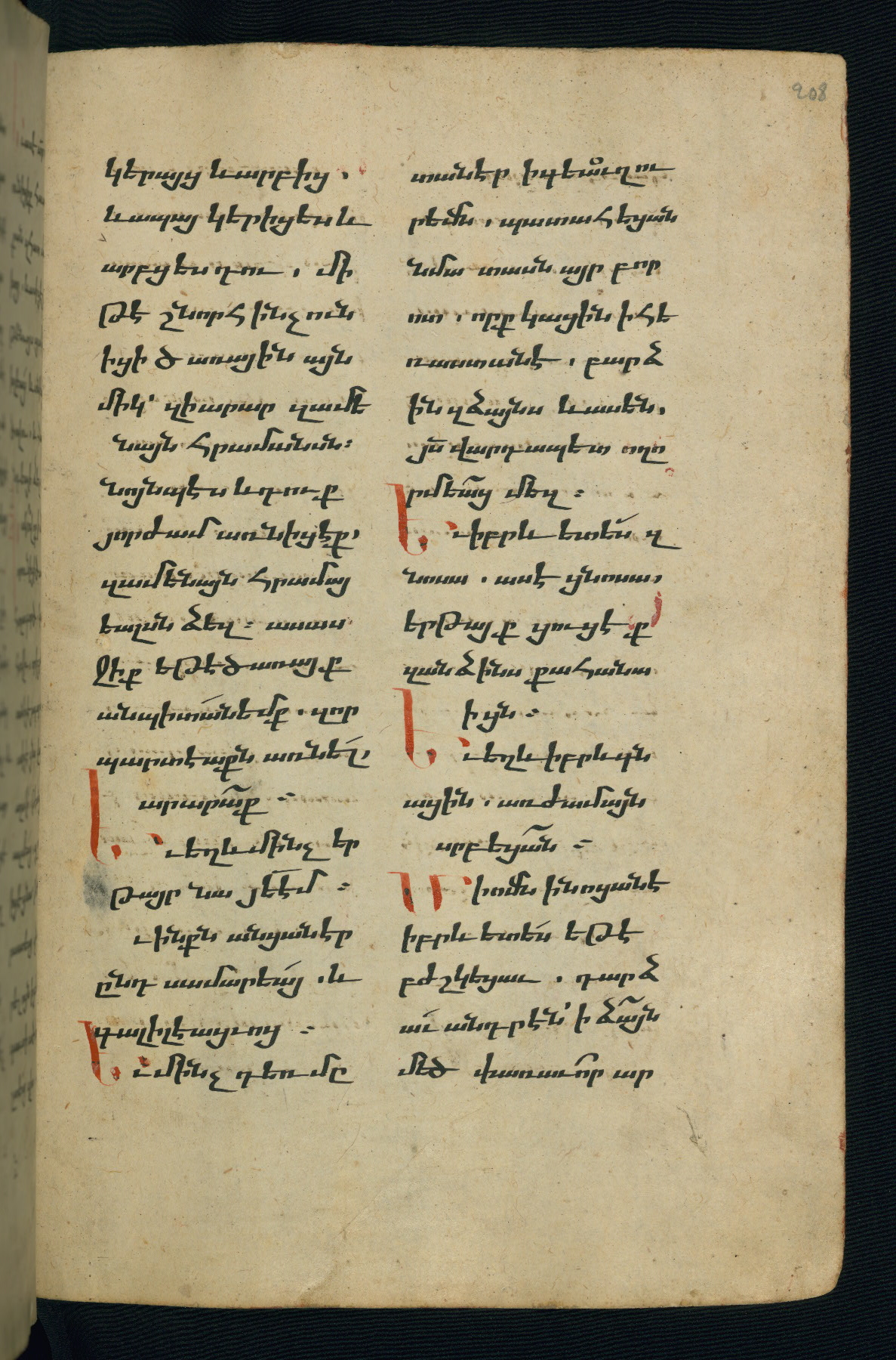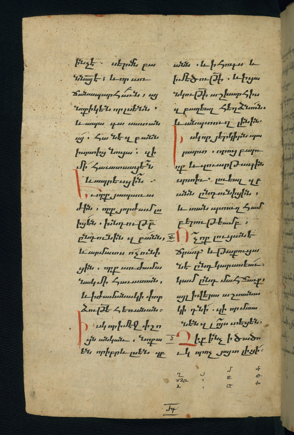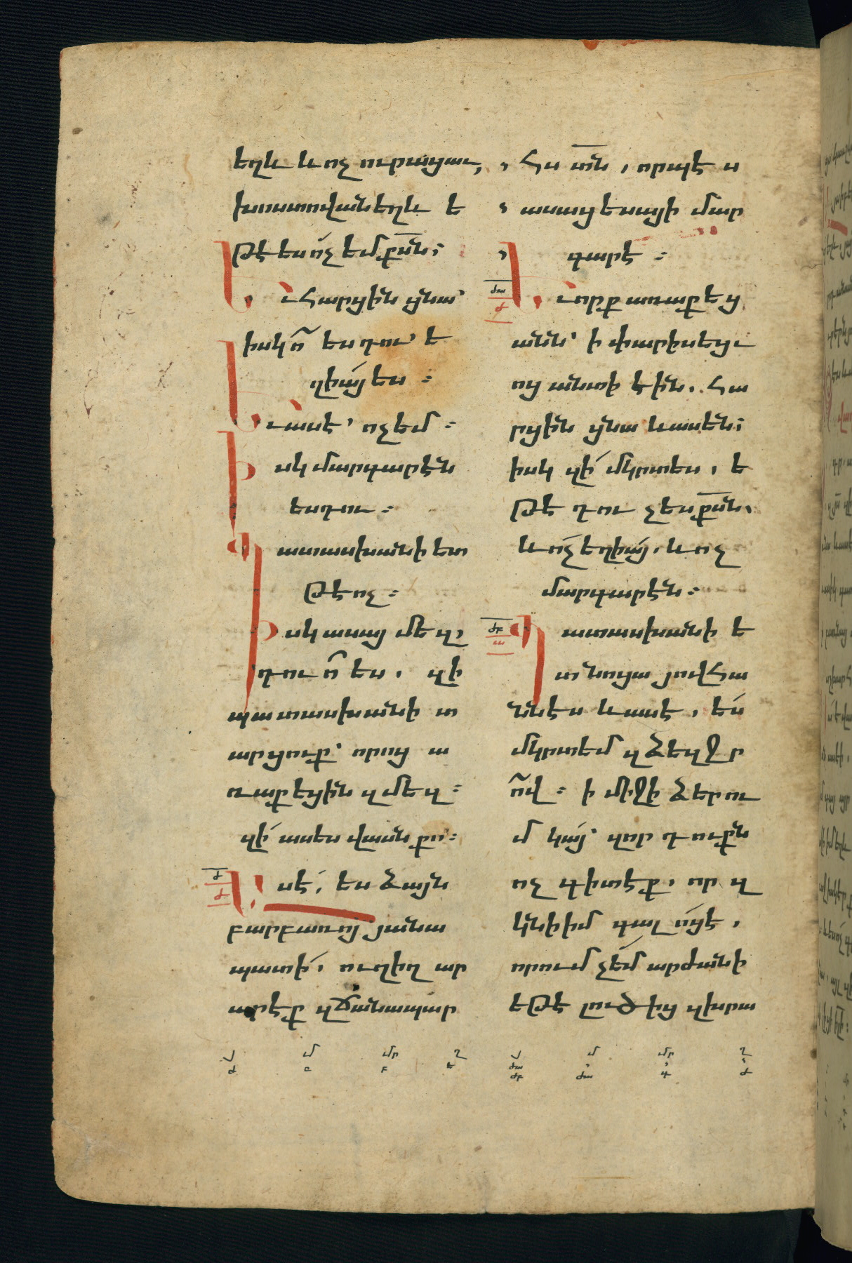 This Armenian Gospel book was produced in 904 of the Armenian era (1455 CE) at the monastery of Gamałiēl in Xizan by the scribe Yohannēs Vardapet, son of Vardan and Dilšat, and was illuminated by the priest Xačʿatur. The priest Pʿilipos commissioned the manuscript as a memorial to himself, his parents Łazar and Xutʿlumēlikʿ, and other relatives listed in the colophon on fols. 300r to 301v. Pʿilipos is depicted on fol. 14v alongside his brothers Yusēpʿ and Sultanša, as they kneel before the Virgin and Child enthroned (Theotokos). The book contains twenty-six full-page polychrome miniatures, including four Evangelist portraits; ornately designed canon tables; four decorated incipit pages; numerous marginal miniatures of floral and faunal motifs; and nineteen marginal miniatures of biblical characters or allusions to biblical narratives.