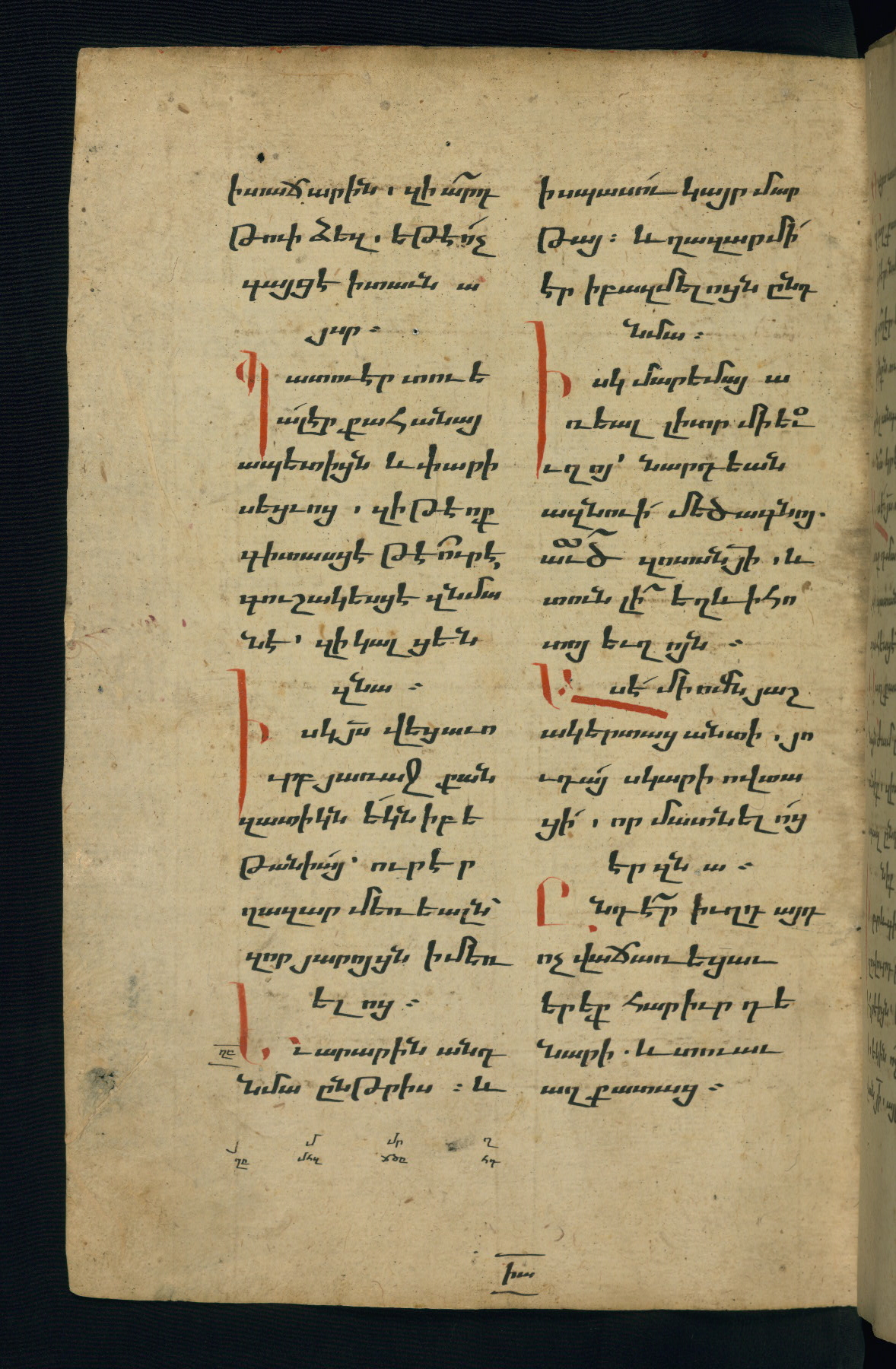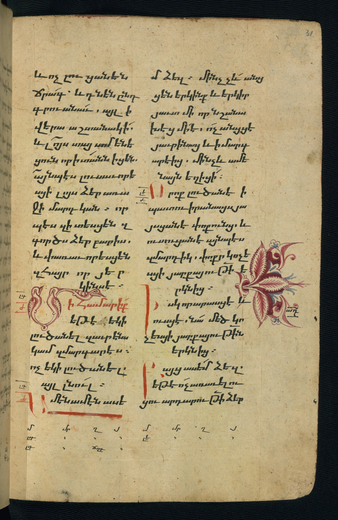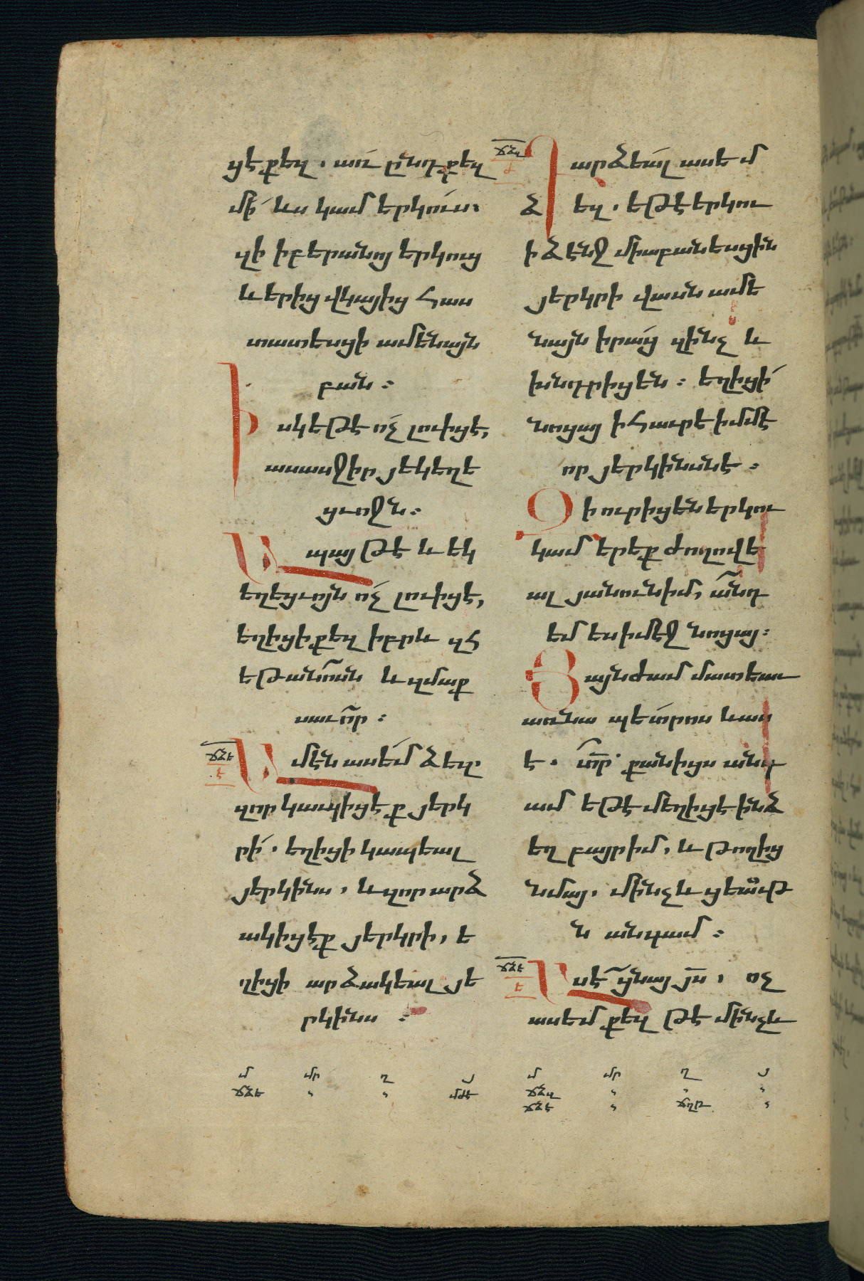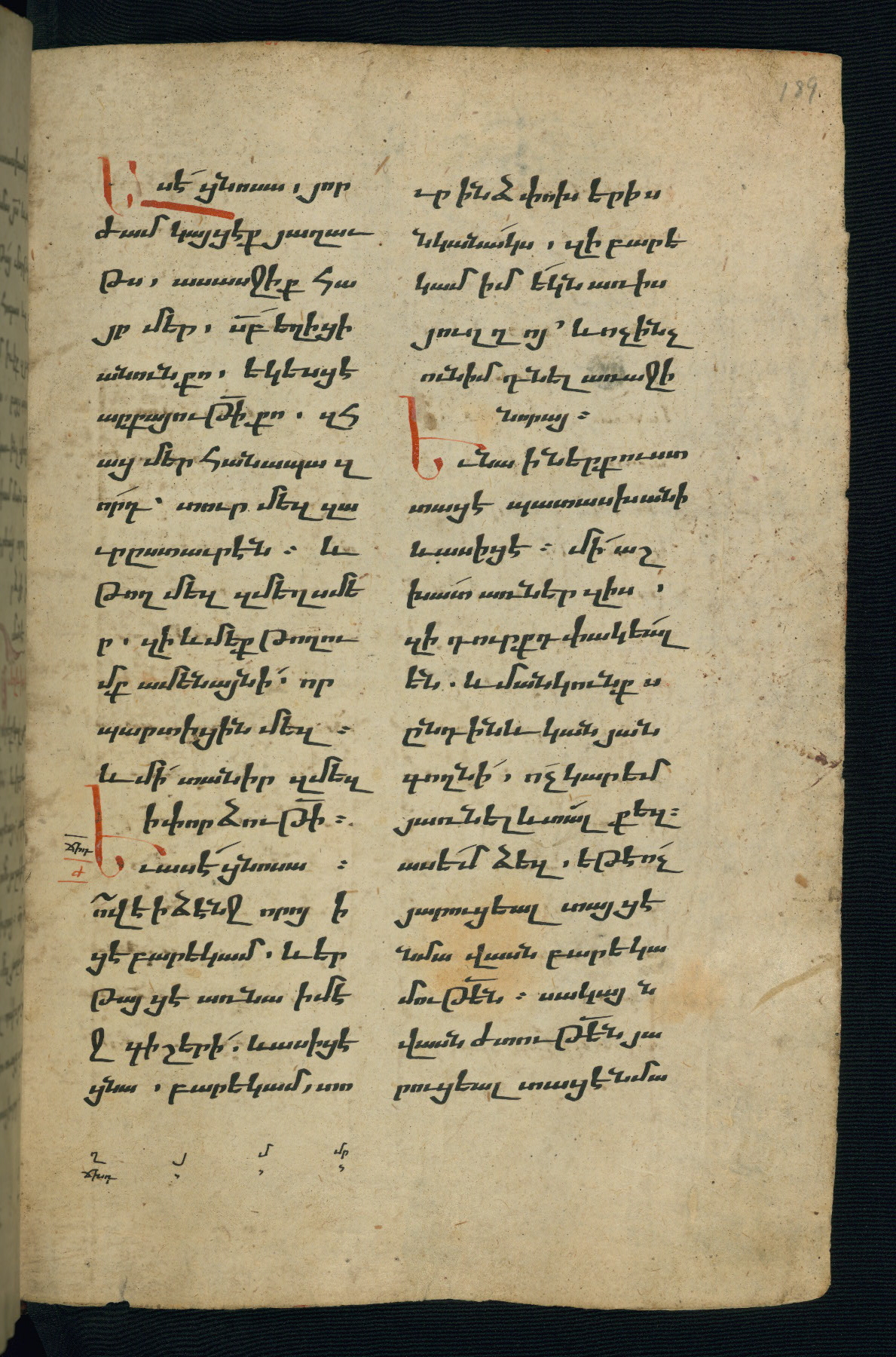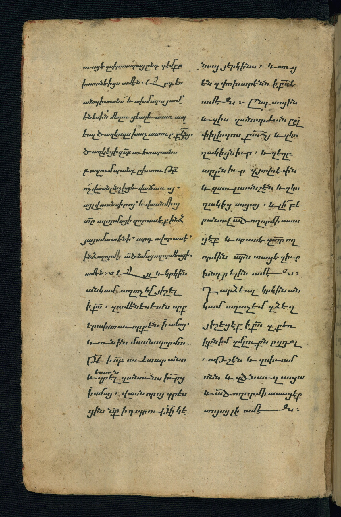 This Armenian Gospel book was produced in 904 of the Armenian era (1455 CE) at the monastery of Gamałiēl in Xizan by the scribe Yohannēs Vardapet, son of Vardan and Dilšat, and was illuminated by the priest Xačʿatur. The priest Pʿilipos commissioned the manuscript as a memorial to himself, his parents Łazar and Xutʿlumēlikʿ, and other relatives listed in the colophon on fols. 300r to 301v. Pʿilipos is depicted on fol. 14v alongside his brothers Yusēpʿ and Sultanša, as they kneel before the Virgin and Child enthroned (Theotokos). The book contains twenty-six full-page polychrome miniatures, including four Evangelist portraits; ornately designed canon tables; four decorated incipit pages; numerous marginal miniatures of floral and faunal motifs; and nineteen marginal miniatures of biblical characters or allusions to biblical narratives.