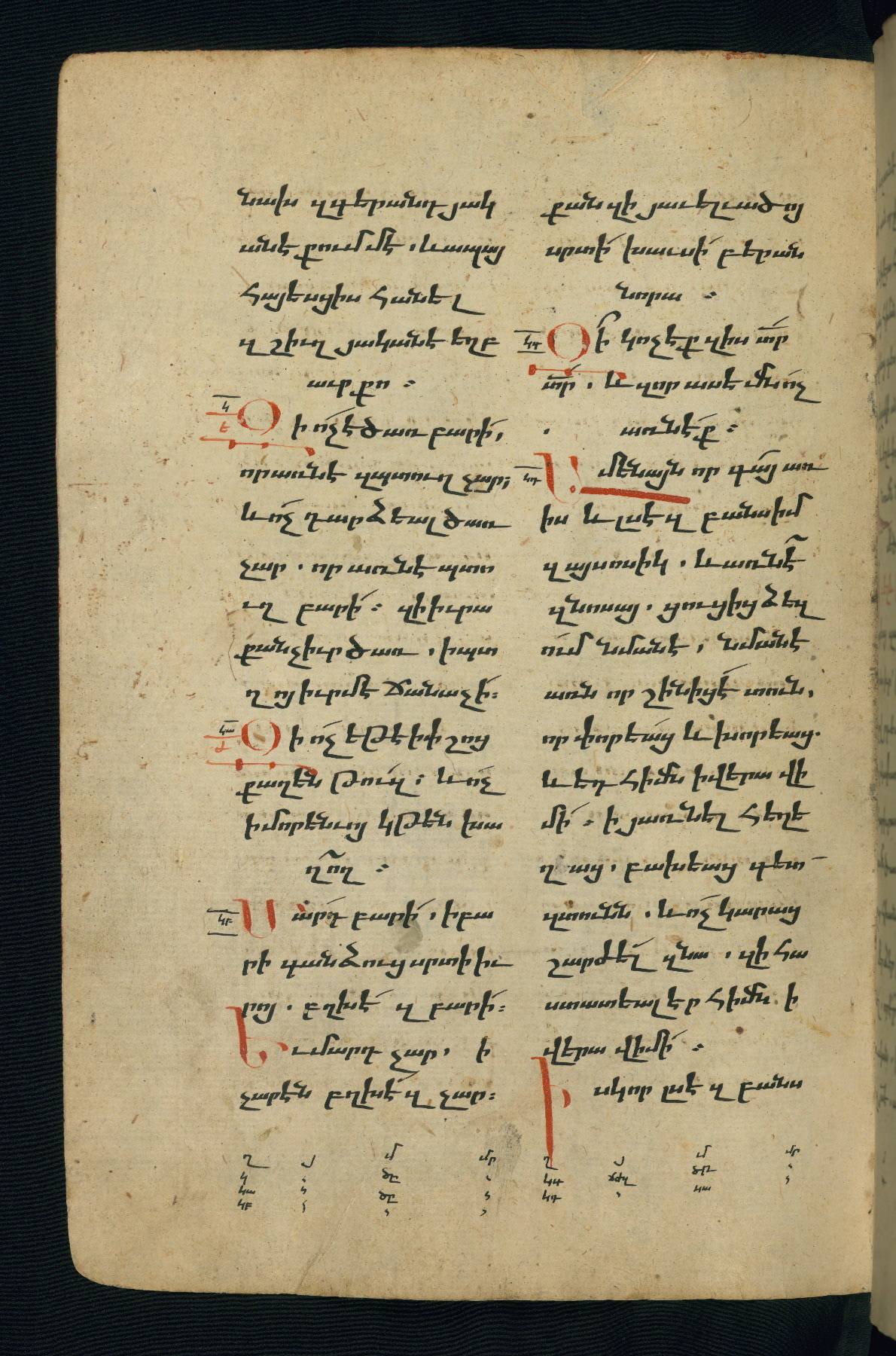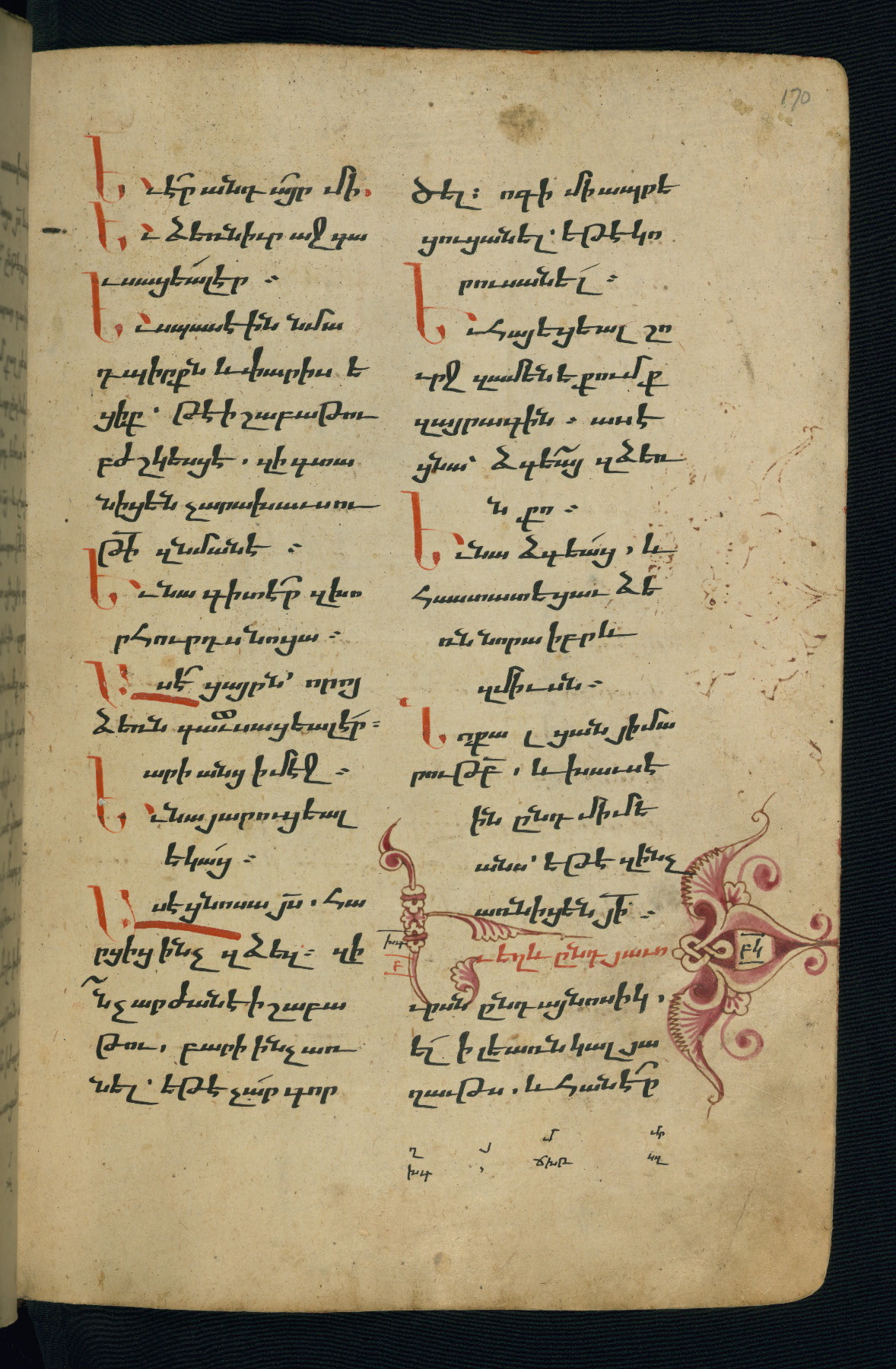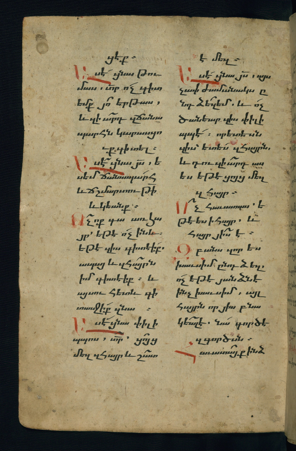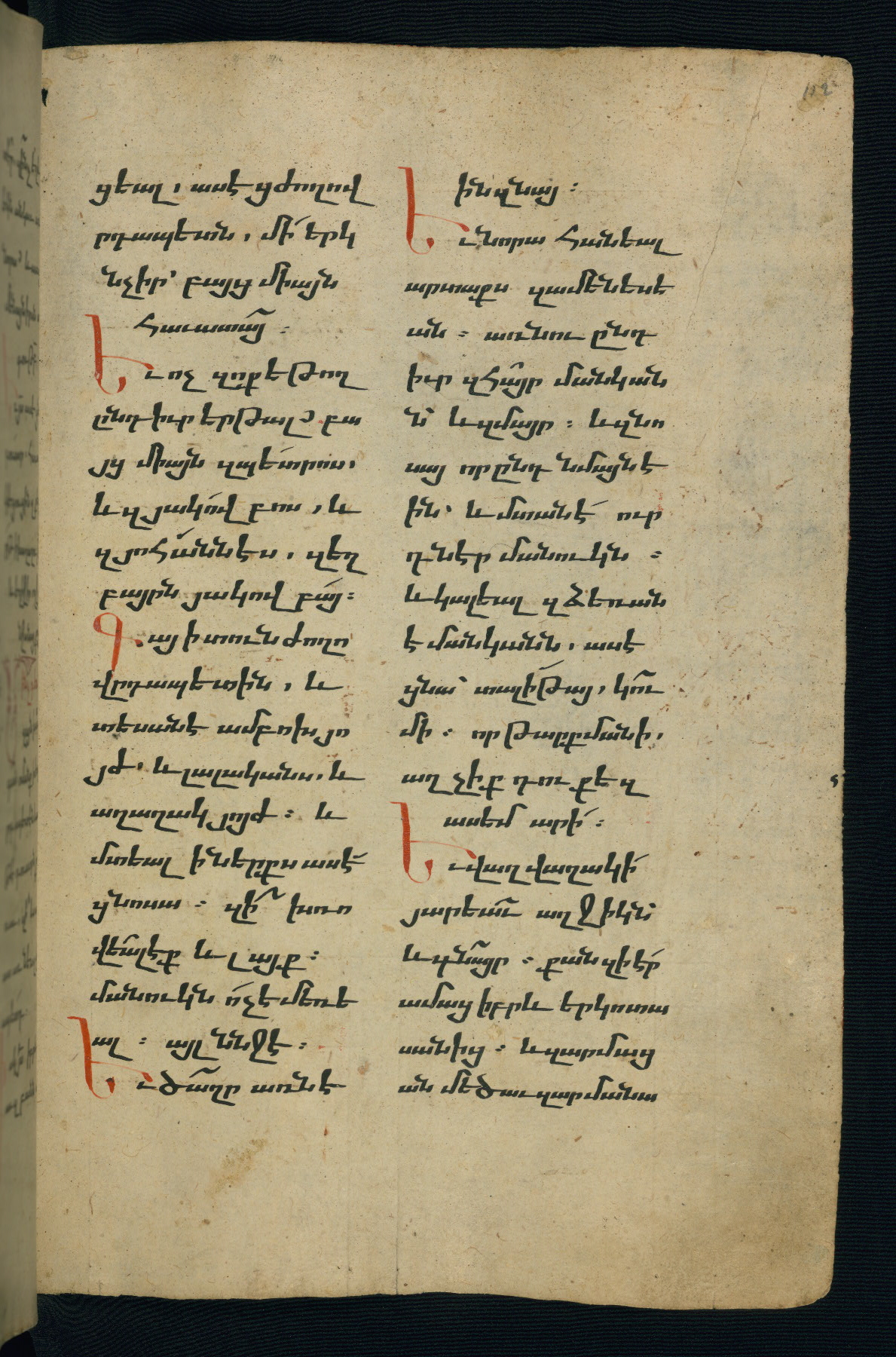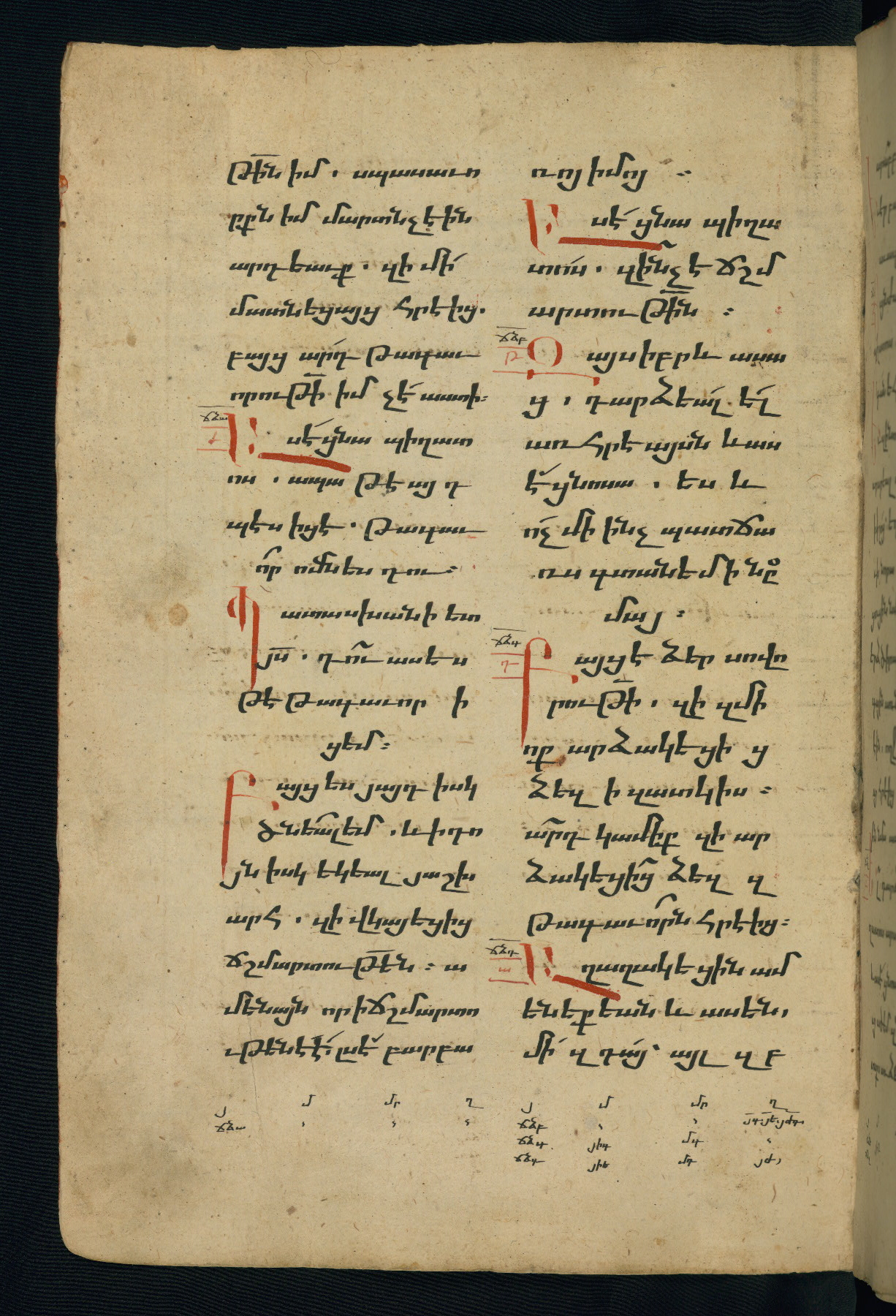 This Armenian Gospel book was produced in 904 of the Armenian era (1455 CE) at the monastery of Gamałiēl in Xizan by the scribe Yohannēs Vardapet, son of Vardan and Dilšat, and was illuminated by the priest Xačʿatur. The priest Pʿilipos commissioned the manuscript as a memorial to himself, his parents Łazar and Xutʿlumēlikʿ, and other relatives listed in the colophon on fols. 300r to 301v. Pʿilipos is depicted on fol. 14v alongside his brothers Yusēpʿ and Sultanša, as they kneel before the Virgin and Child enthroned (Theotokos). The book contains twenty-six full-page polychrome miniatures, including four Evangelist portraits; ornately designed canon tables; four decorated incipit pages; numerous marginal miniatures of floral and faunal motifs; and nineteen marginal miniatures of biblical characters or allusions to biblical narratives.