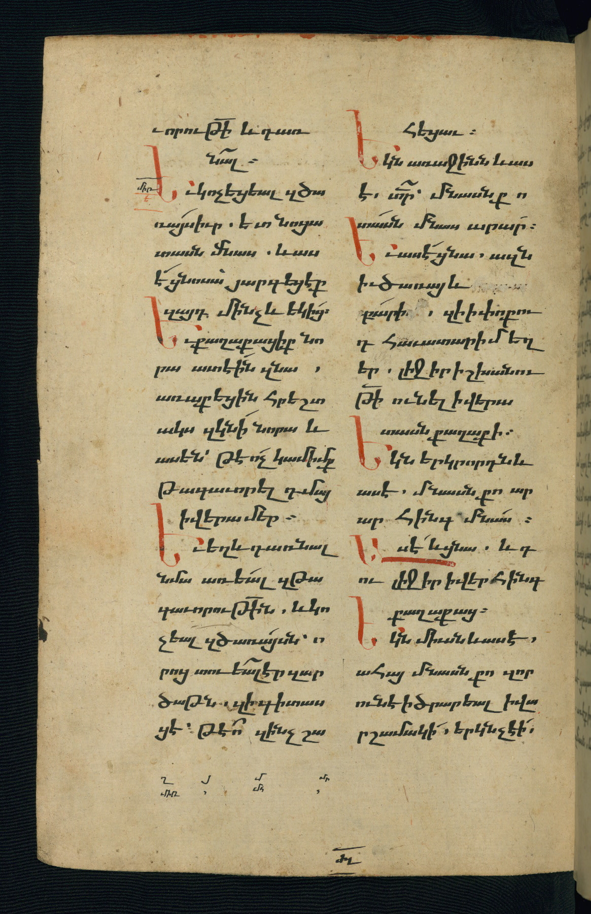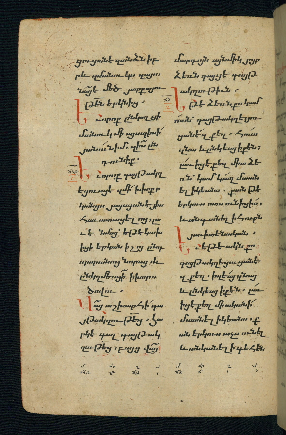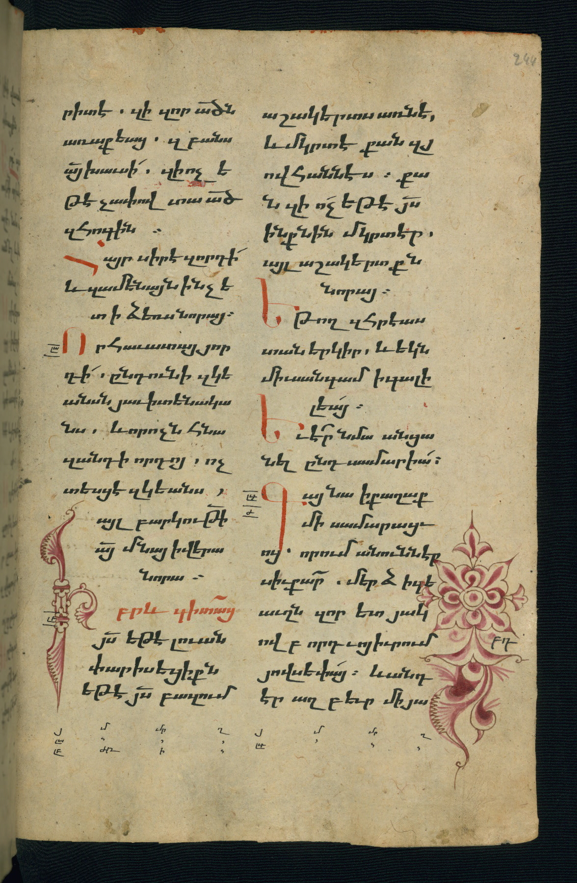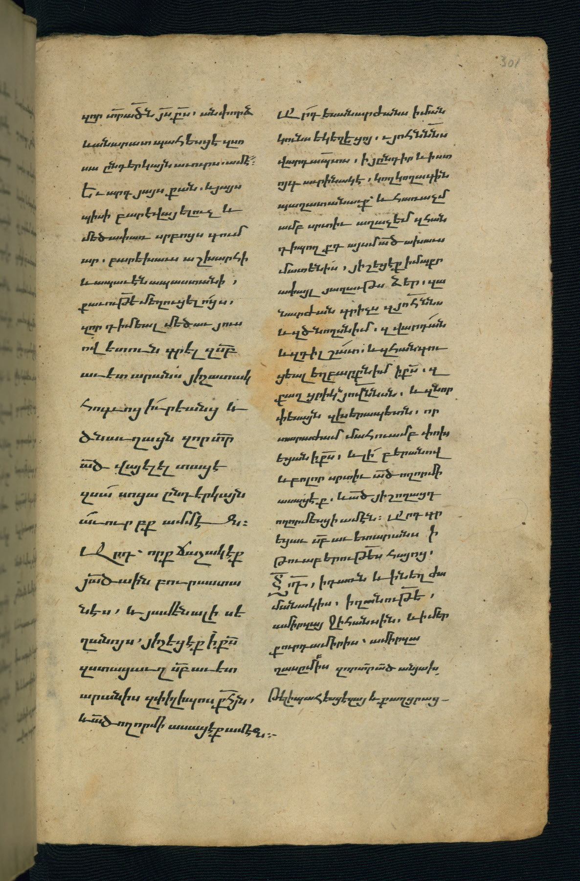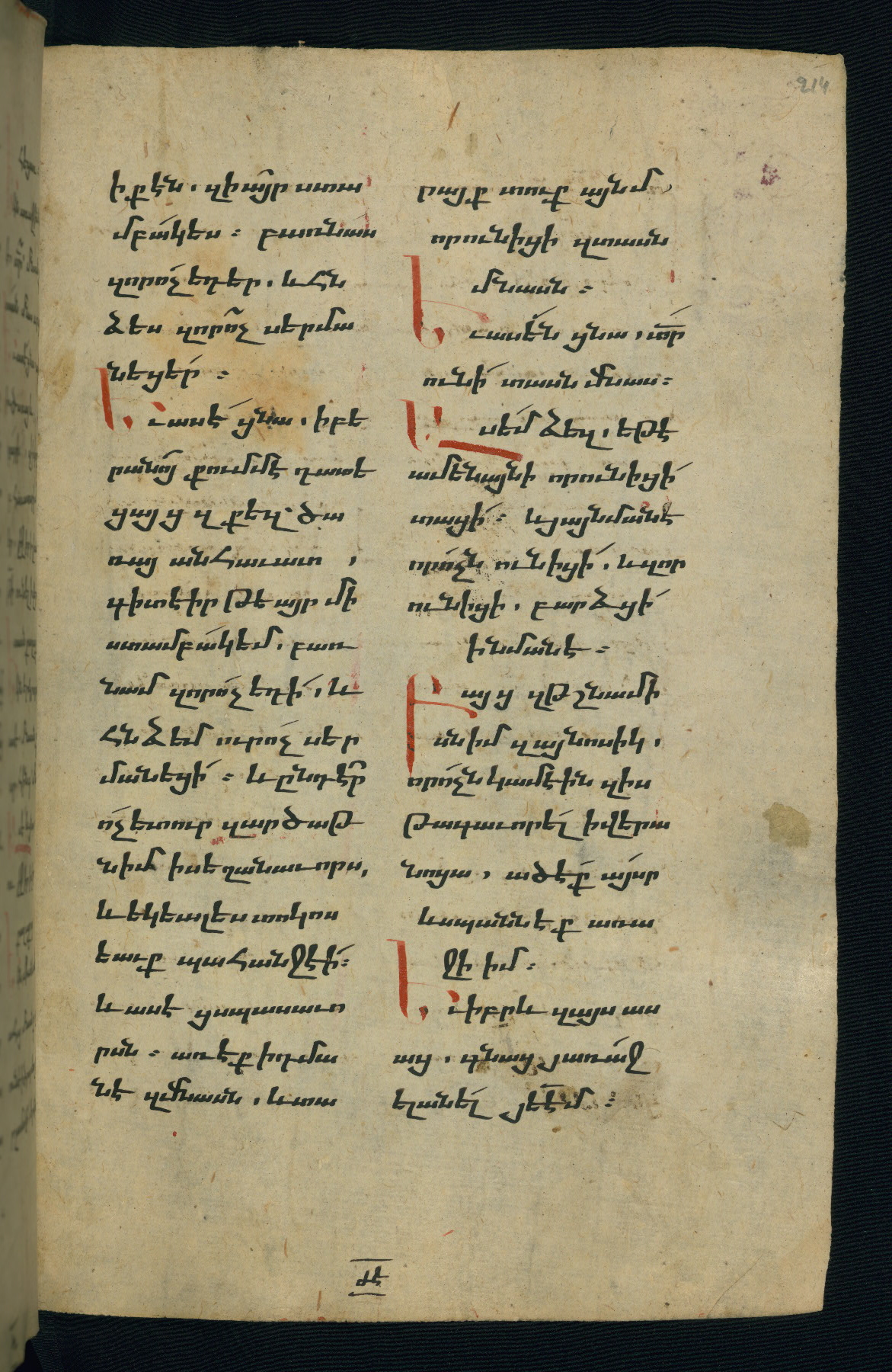 This Armenian Gospel book was produced in 904 of the Armenian era (1455 CE) at the monastery of Gamałiēl in Xizan by the scribe Yohannēs Vardapet, son of Vardan and Dilšat, and was illuminated by the priest Xačʿatur. The priest Pʿilipos commissioned the manuscript as a memorial to himself, his parents Łazar and Xutʿlumēlikʿ, and other relatives listed in the colophon on fols. 300r to 301v. Pʿilipos is depicted on fol. 14v alongside his brothers Yusēpʿ and Sultanša, as they kneel before the Virgin and Child enthroned (Theotokos). The book contains twenty-six full-page polychrome miniatures, including four Evangelist portraits; ornately designed canon tables; four decorated incipit pages; numerous marginal miniatures of floral and faunal motifs; and nineteen marginal miniatures of biblical characters or allusions to biblical narratives.