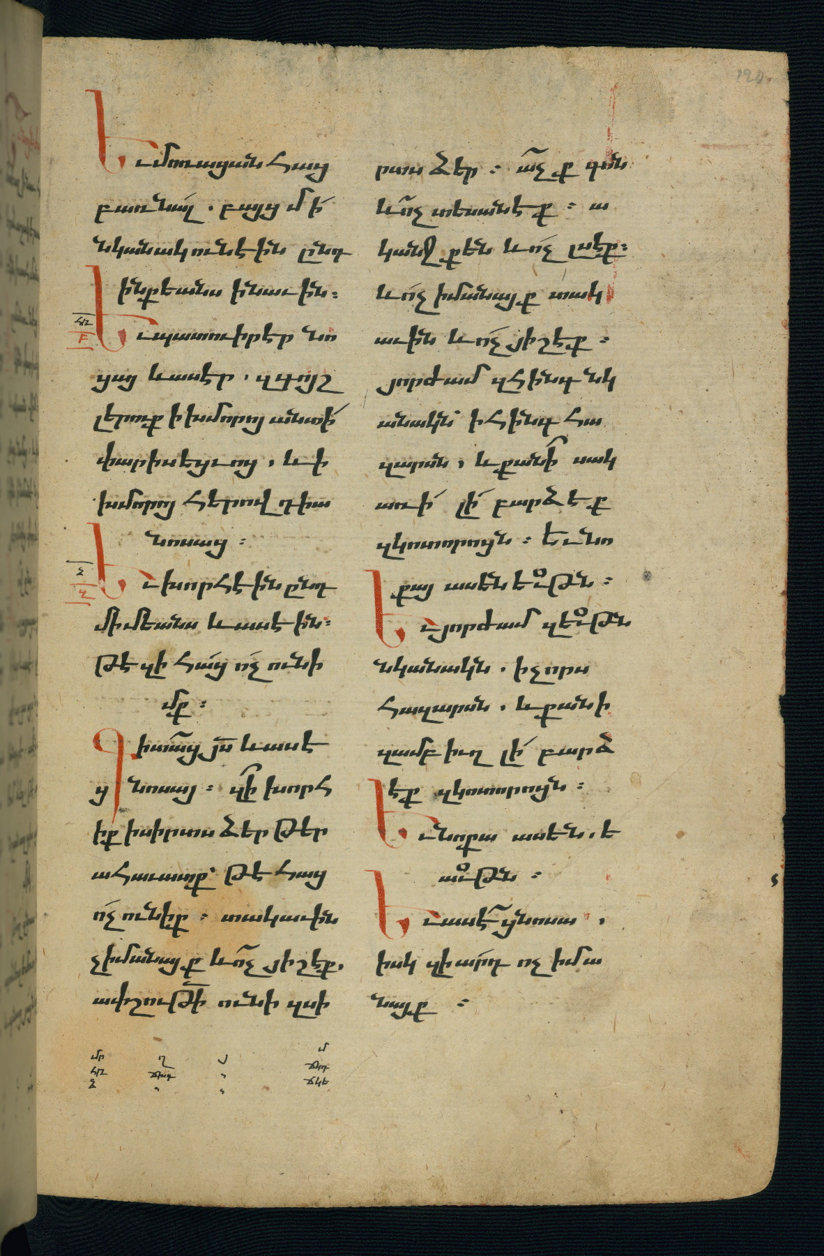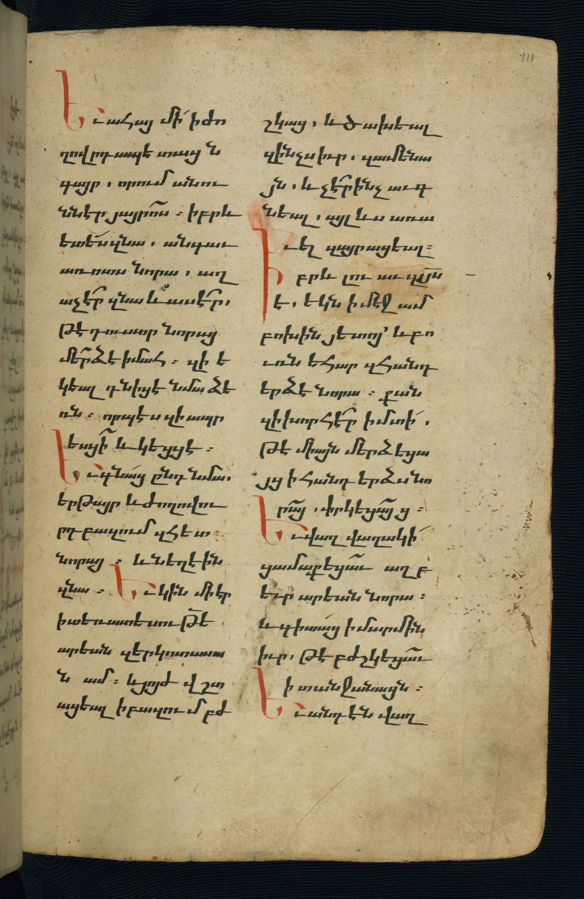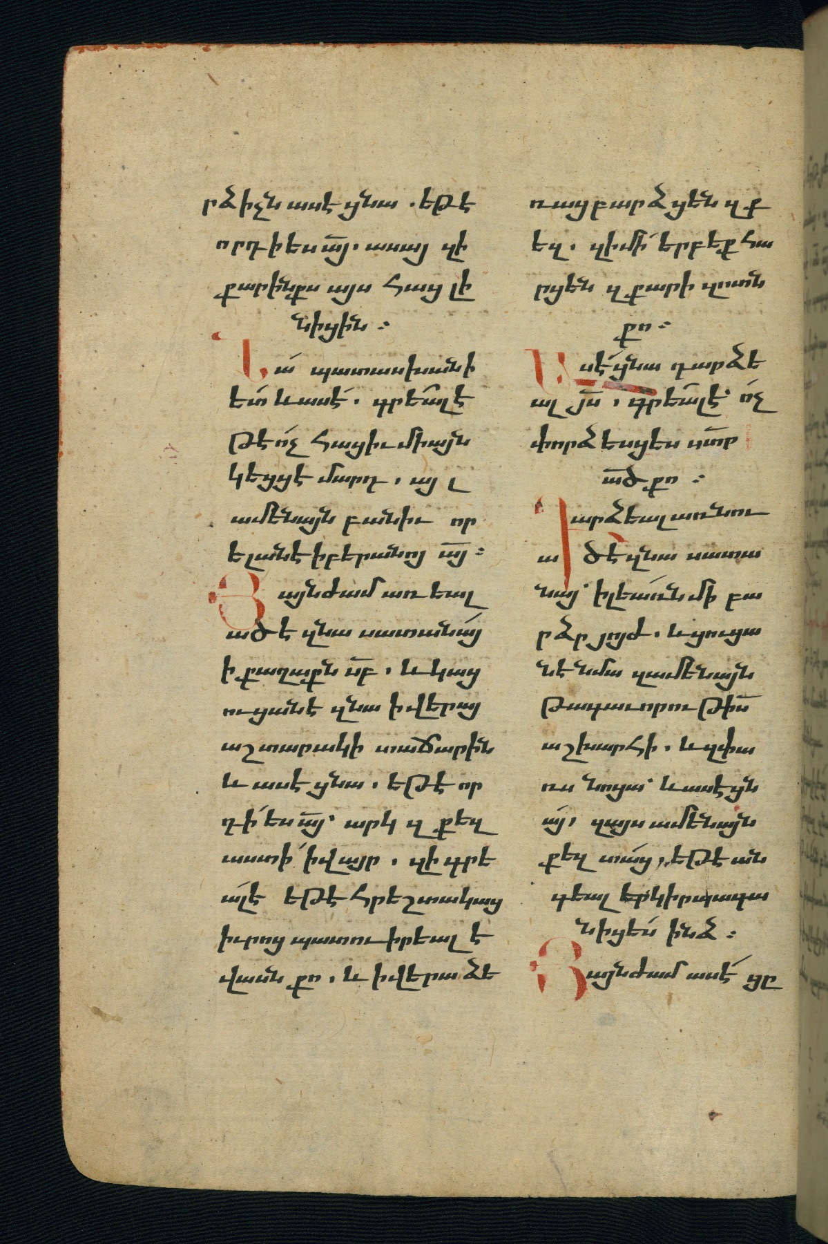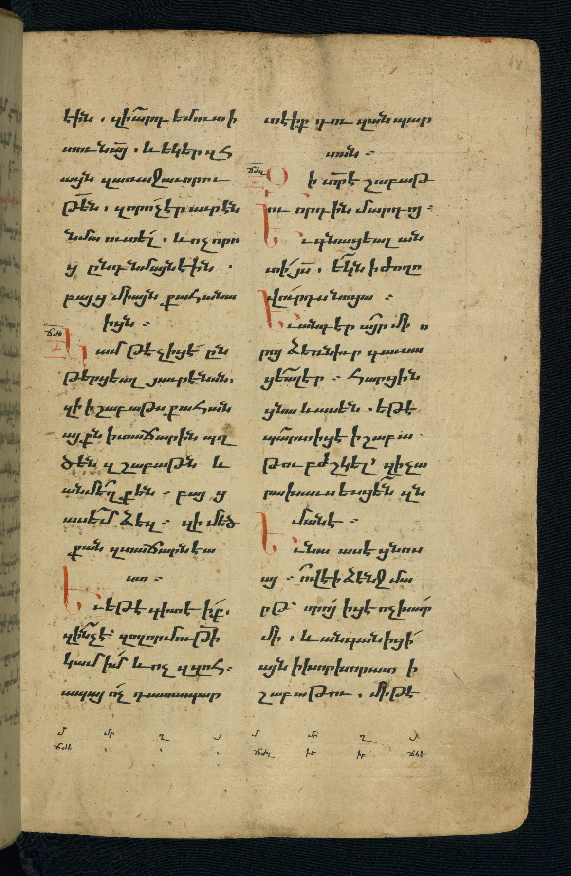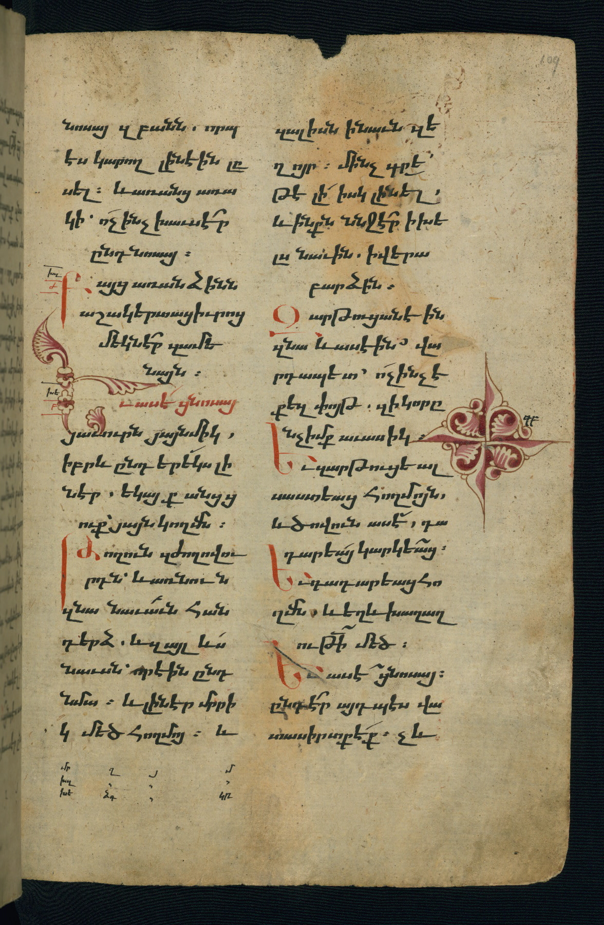 This Armenian Gospel book was produced in 904 of the Armenian era (1455 CE) at the monastery of Gamałiēl in Xizan by the scribe Yohannēs Vardapet, son of Vardan and Dilšat, and was illuminated by the priest Xačʿatur. The priest Pʿilipos commissioned the manuscript as a memorial to himself, his parents Łazar and Xutʿlumēlikʿ, and other relatives listed in the colophon on fols. 300r to 301v. Pʿilipos is depicted on fol. 14v alongside his brothers Yusēpʿ and Sultanša, as they kneel before the Virgin and Child enthroned (Theotokos). The book contains twenty-six full-page polychrome miniatures, including four Evangelist portraits; ornately designed canon tables; four decorated incipit pages; numerous marginal miniatures of floral and faunal motifs; and nineteen marginal miniatures of biblical characters or allusions to biblical narratives.