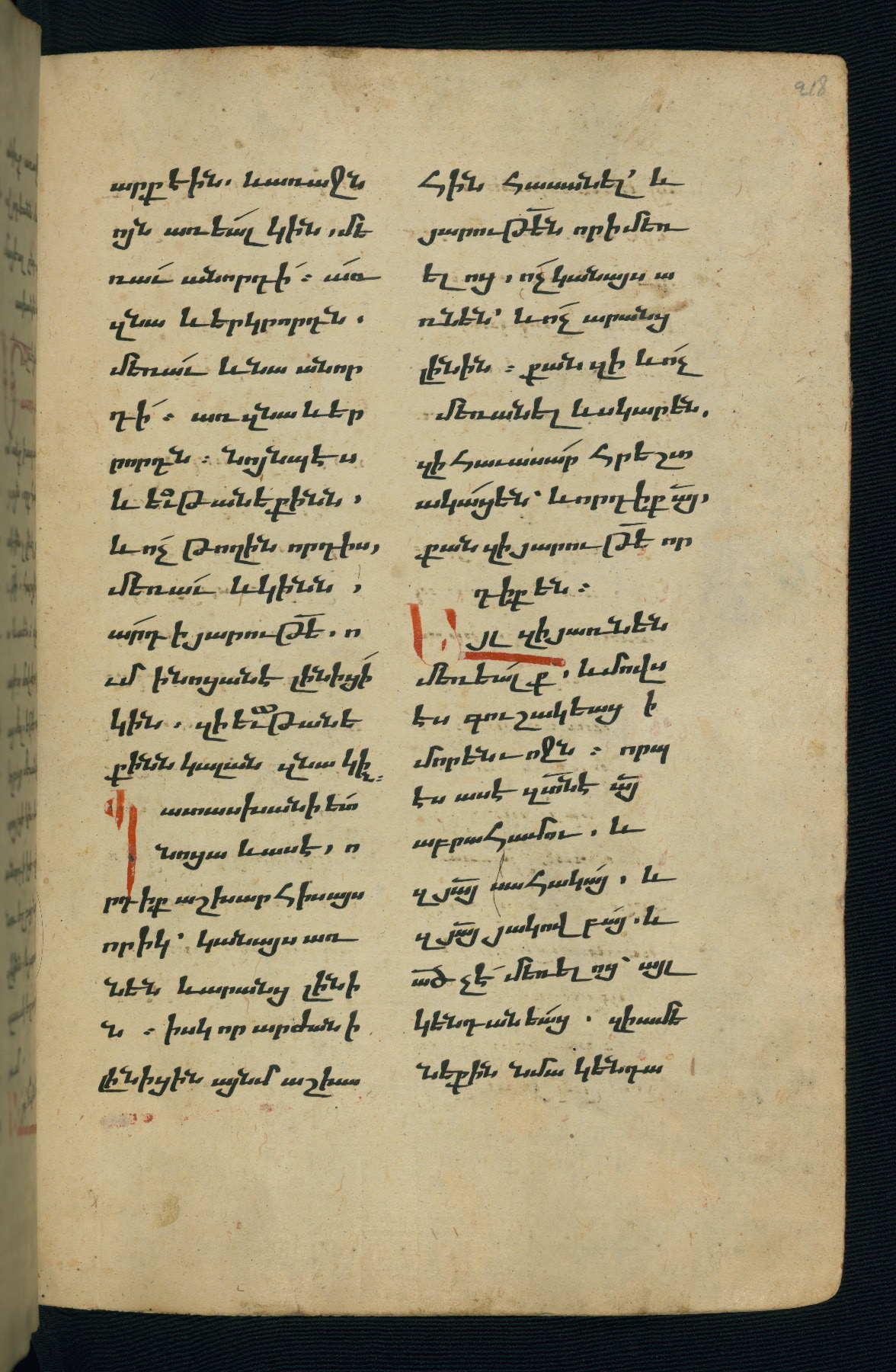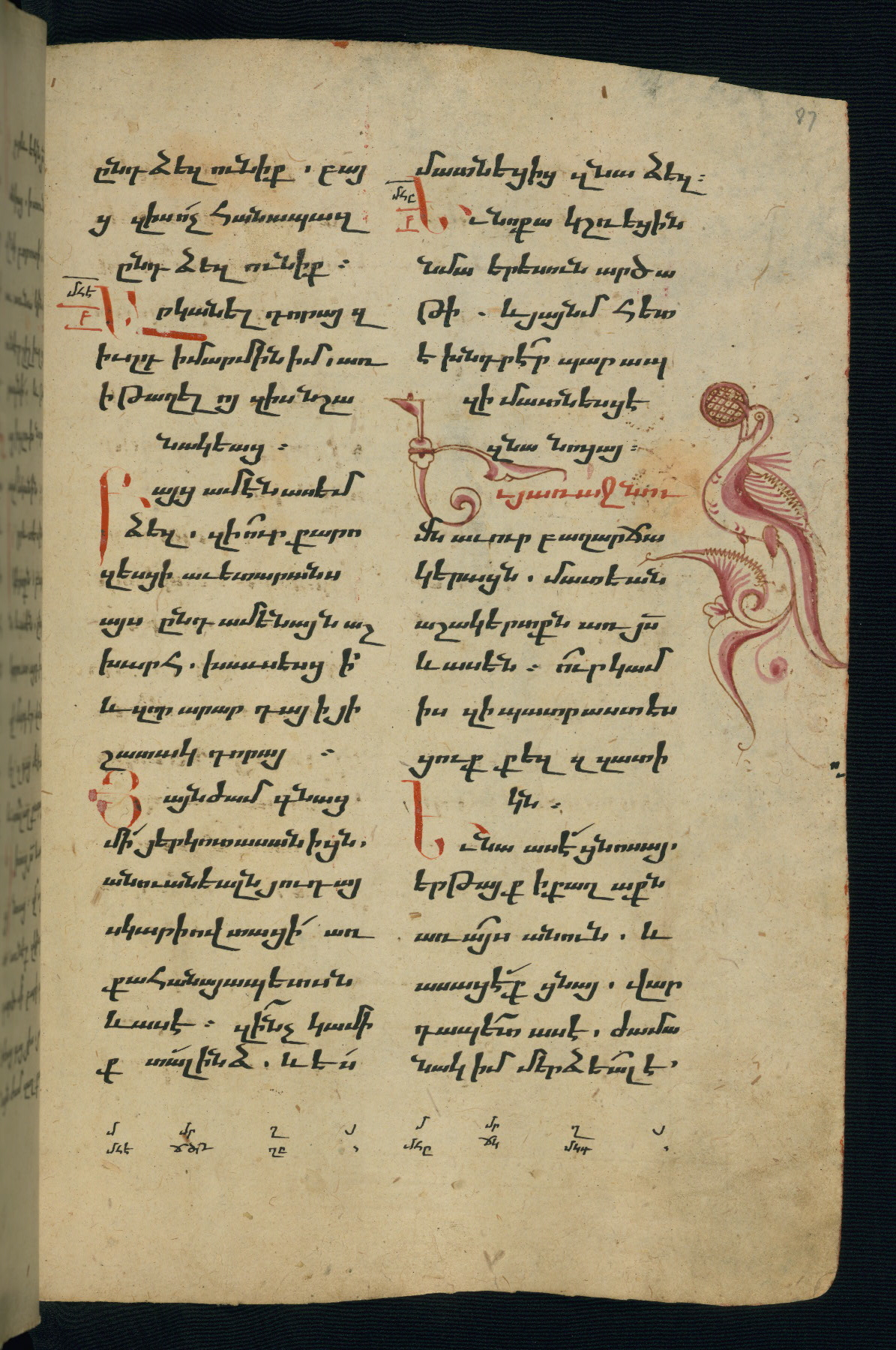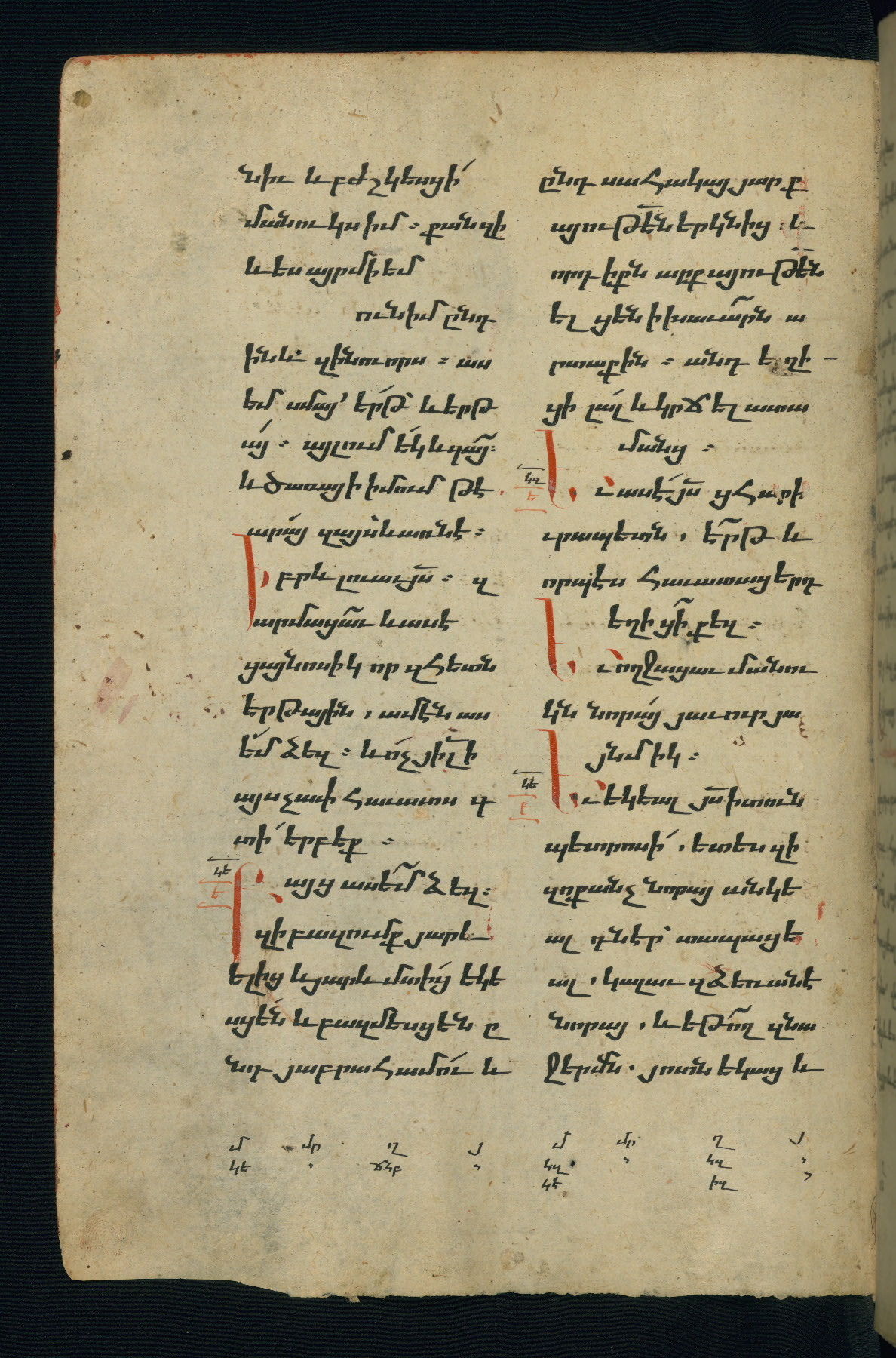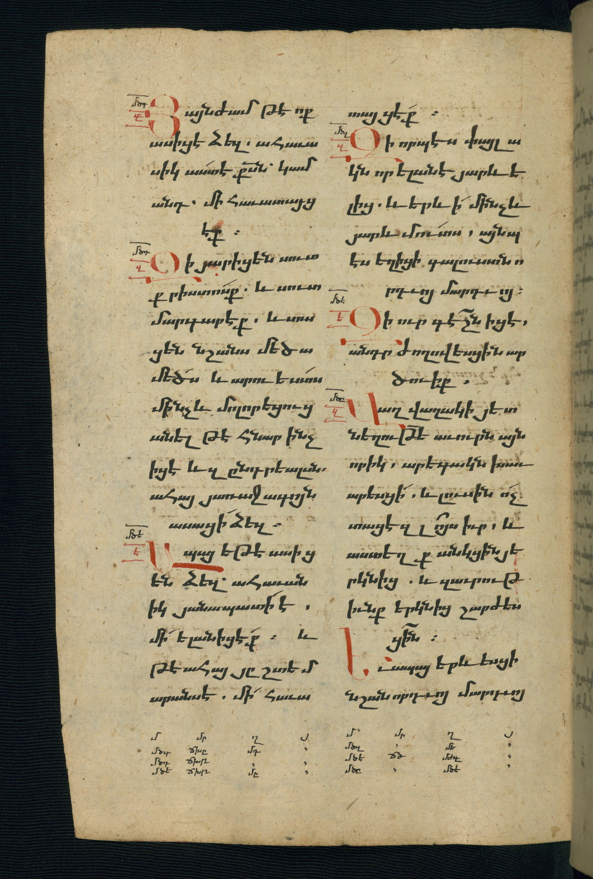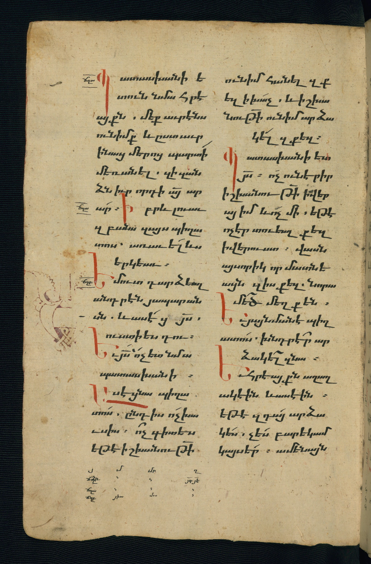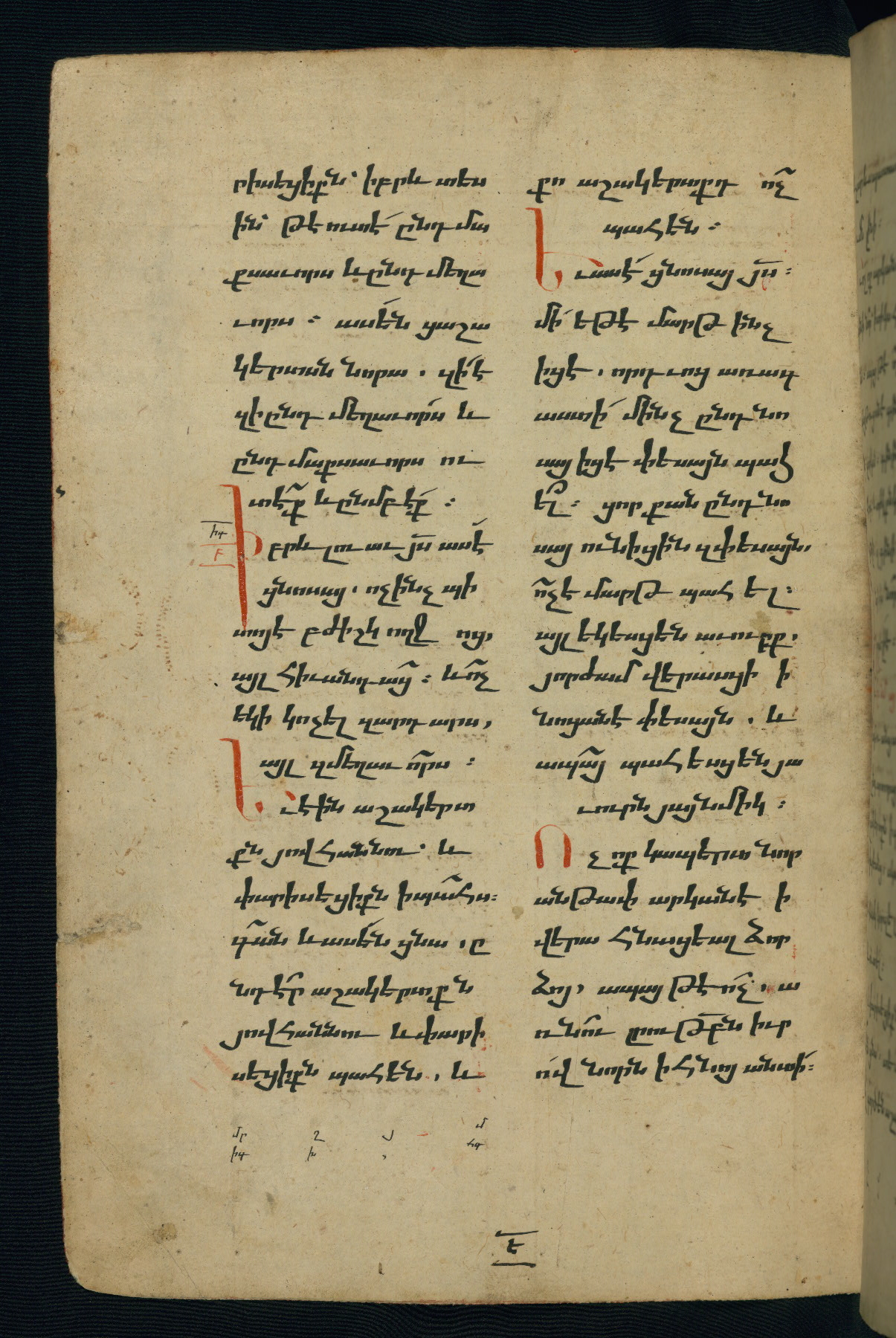 This Armenian Gospel book was produced in 904 of the Armenian era (1455 CE) at the monastery of Gamałiēl in Xizan by the scribe Yohannēs Vardapet, son of Vardan and Dilšat, and was illuminated by the priest Xačʿatur. The priest Pʿilipos commissioned the manuscript as a memorial to himself, his parents Łazar and Xutʿlumēlikʿ, and other relatives listed in the colophon on fols. 300r to 301v. Pʿilipos is depicted on fol. 14v alongside his brothers Yusēpʿ and Sultanša, as they kneel before the Virgin and Child enthroned (Theotokos). The book contains twenty-six full-page polychrome miniatures, including four Evangelist portraits; ornately designed canon tables; four decorated incipit pages; numerous marginal miniatures of floral and faunal motifs; and nineteen marginal miniatures of biblical characters or allusions to biblical narratives.