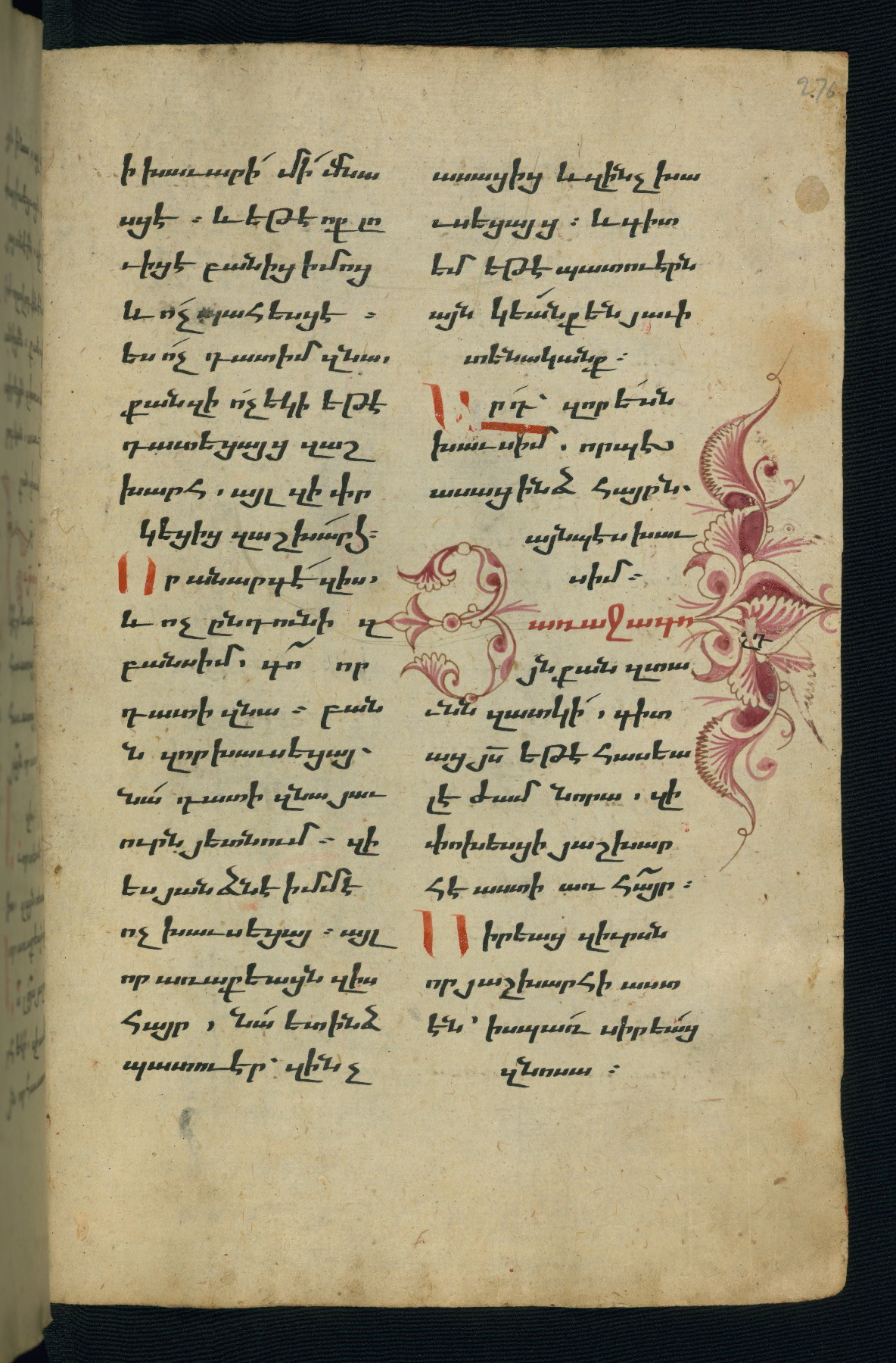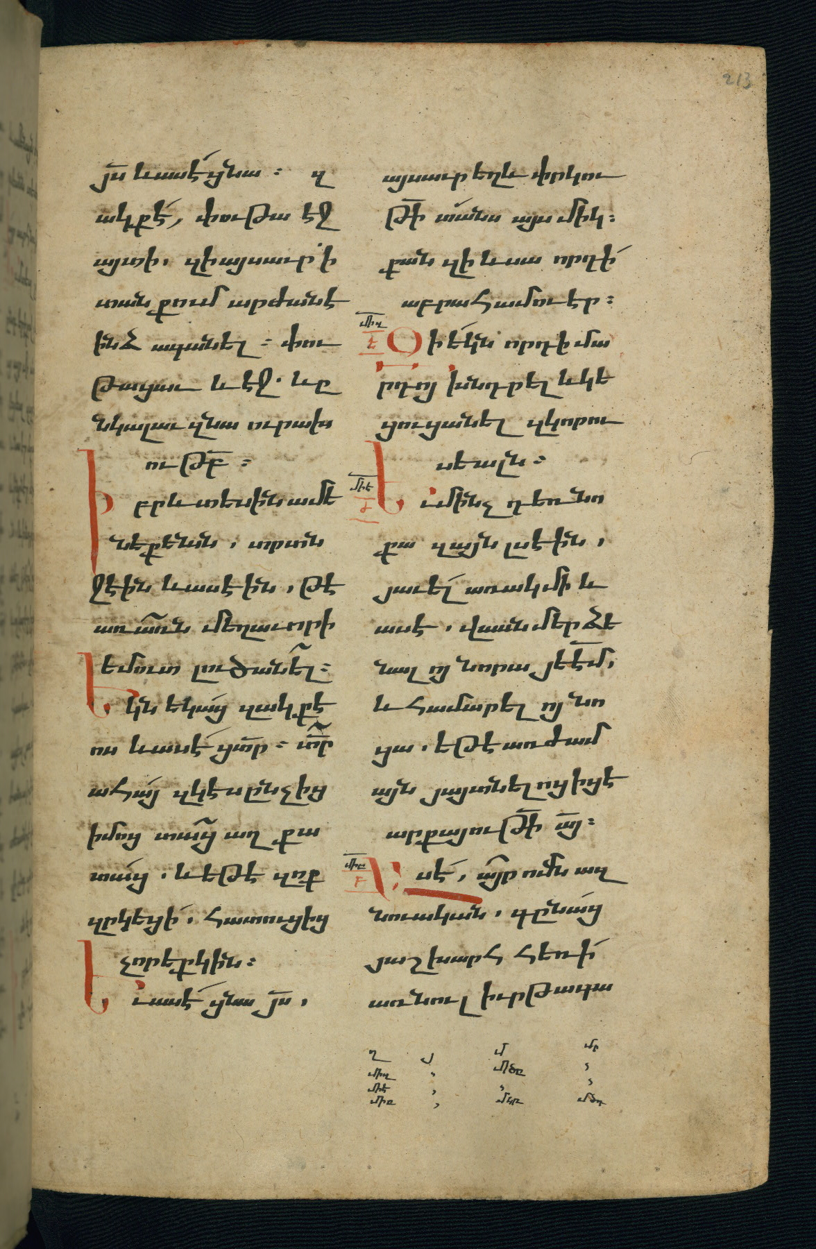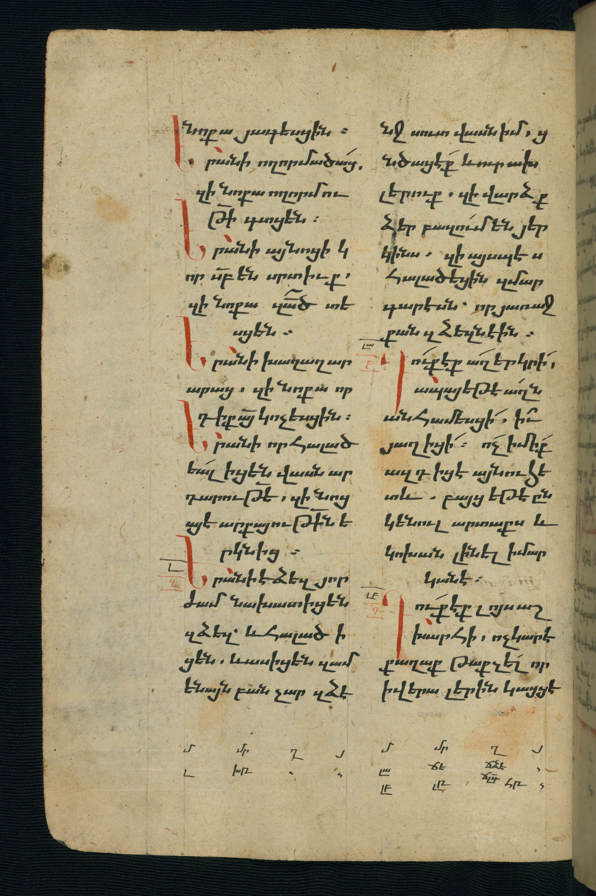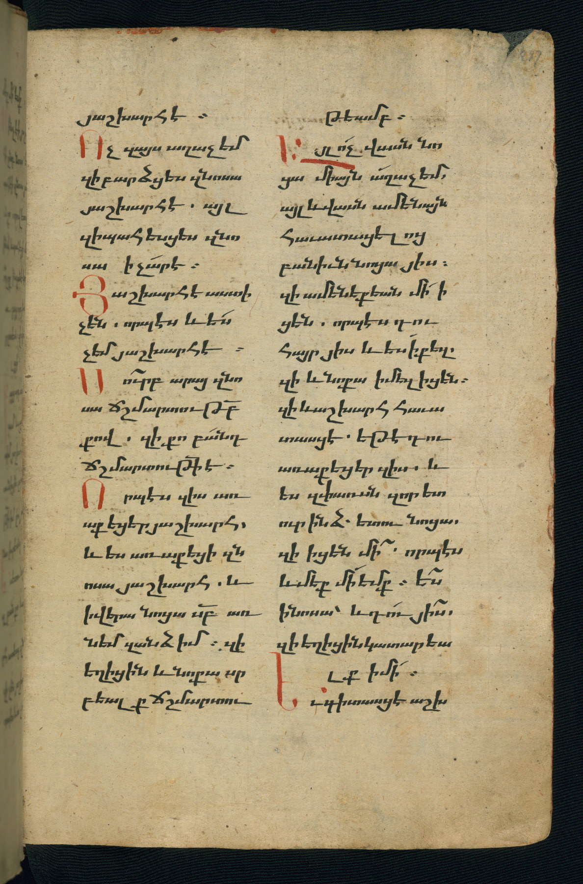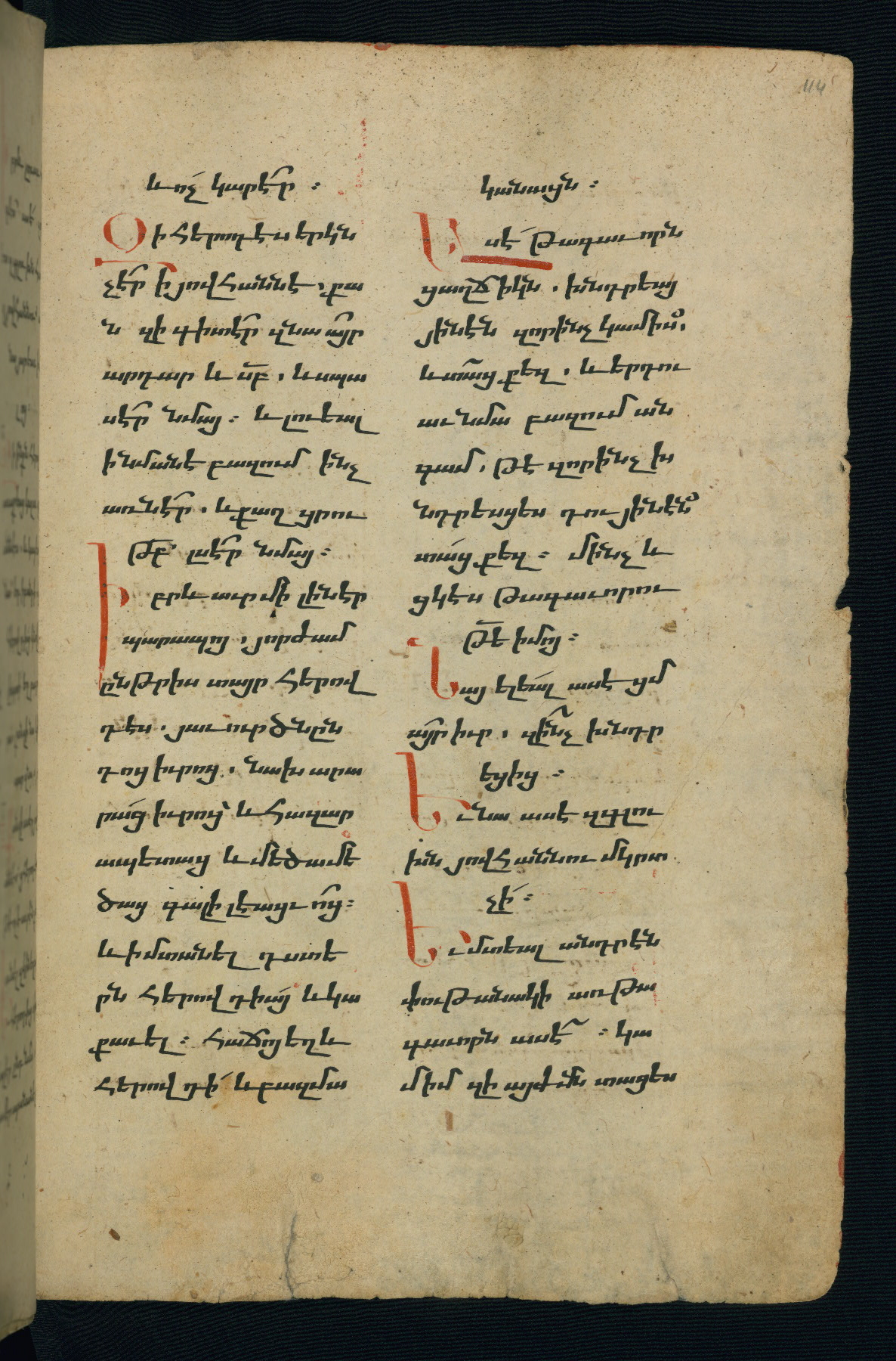 This Armenian Gospel book was produced in 904 of the Armenian era (1455 CE) at the monastery of Gamałiēl in Xizan by the scribe Yohannēs Vardapet, son of Vardan and Dilšat, and was illuminated by the priest Xačʿatur. The priest Pʿilipos commissioned the manuscript as a memorial to himself, his parents Łazar and Xutʿlumēlikʿ, and other relatives listed in the colophon on fols. 300r to 301v. Pʿilipos is depicted on fol. 14v alongside his brothers Yusēpʿ and Sultanša, as they kneel before the Virgin and Child enthroned (Theotokos). The book contains twenty-six full-page polychrome miniatures, including four Evangelist portraits; ornately designed canon tables; four decorated incipit pages; numerous marginal miniatures of floral and faunal motifs; and nineteen marginal miniatures of biblical characters or allusions to biblical narratives.