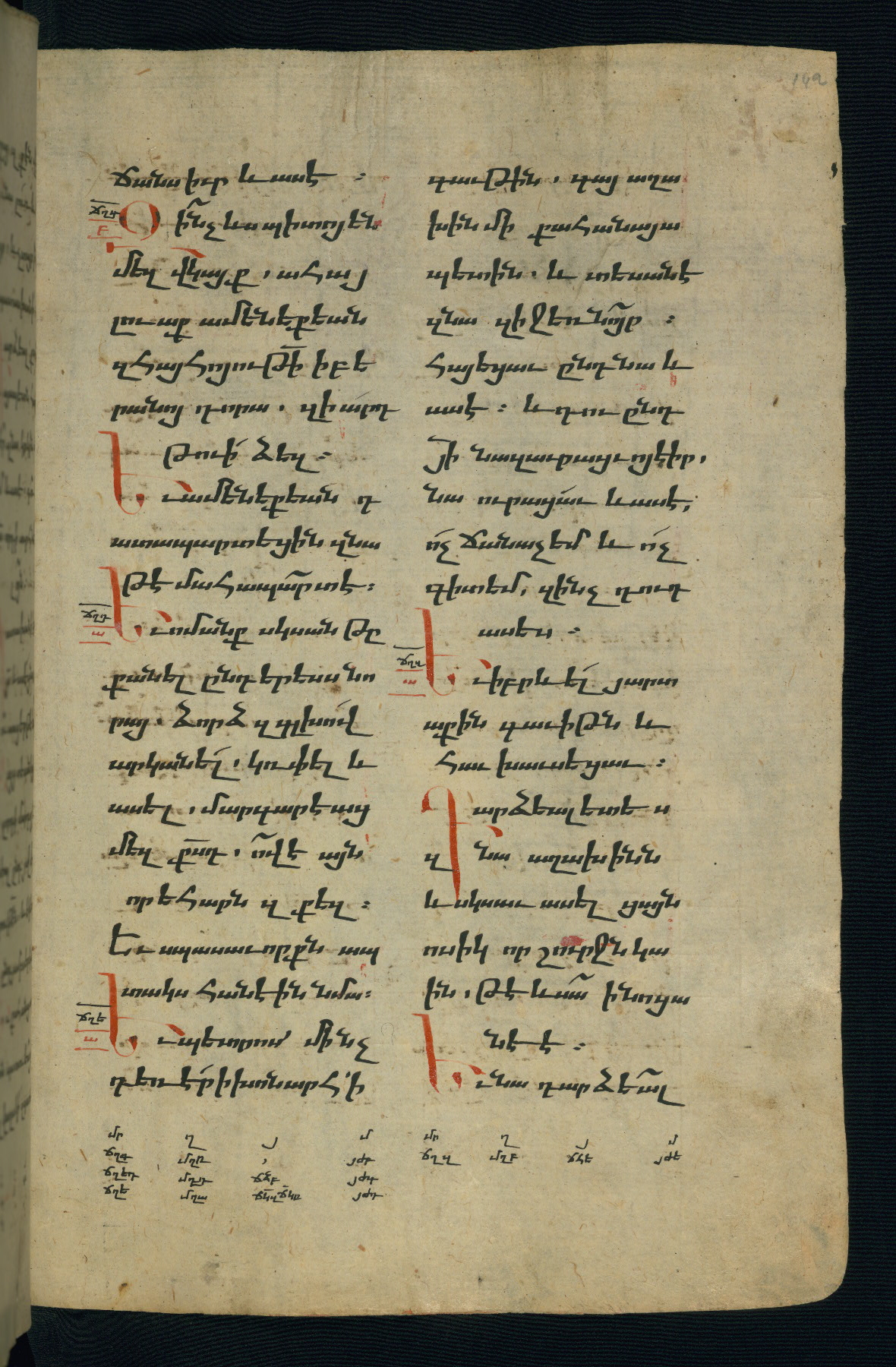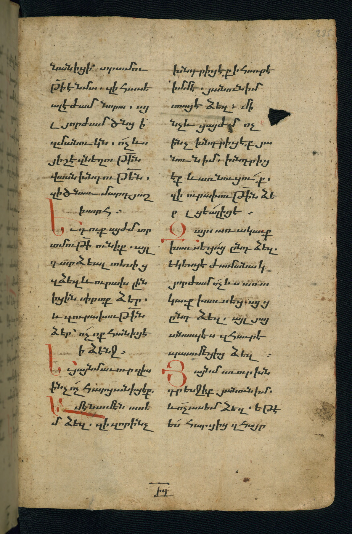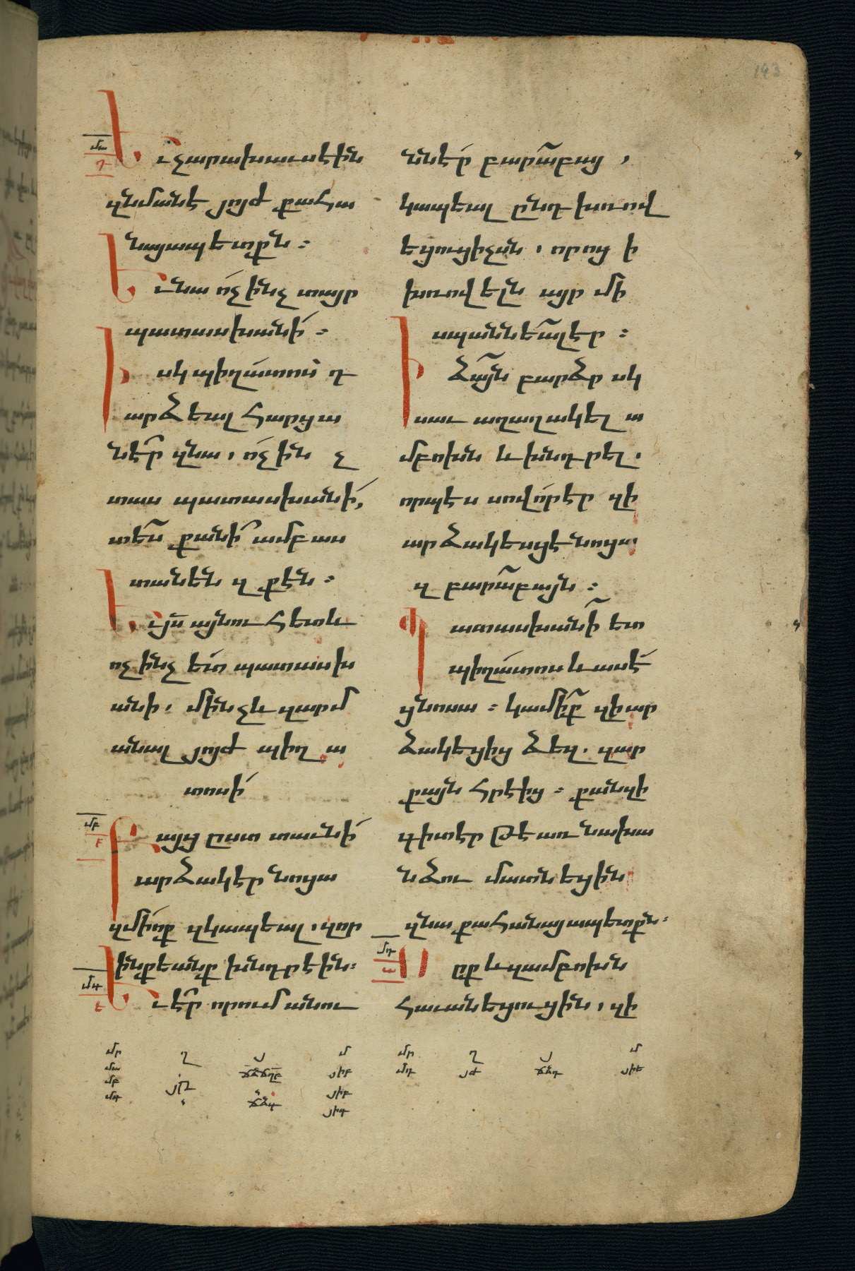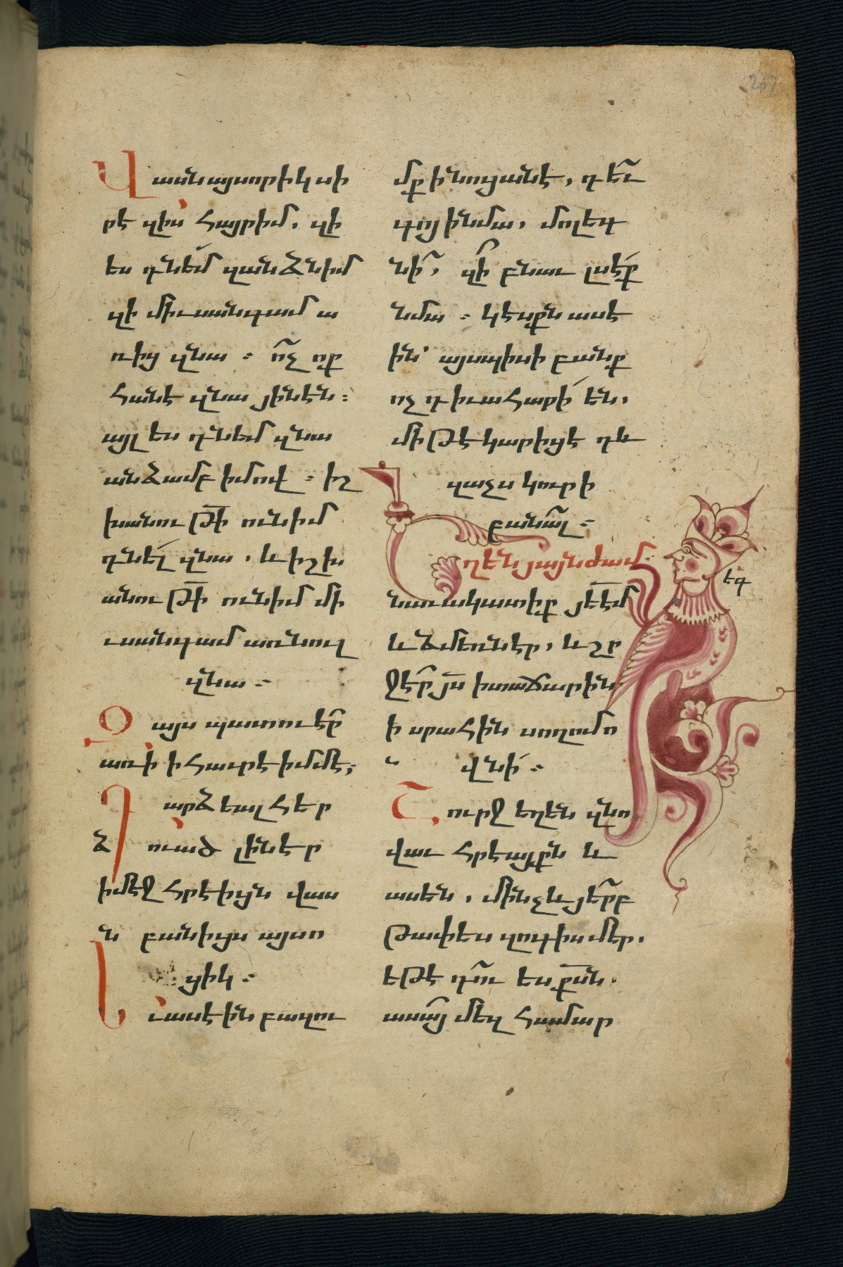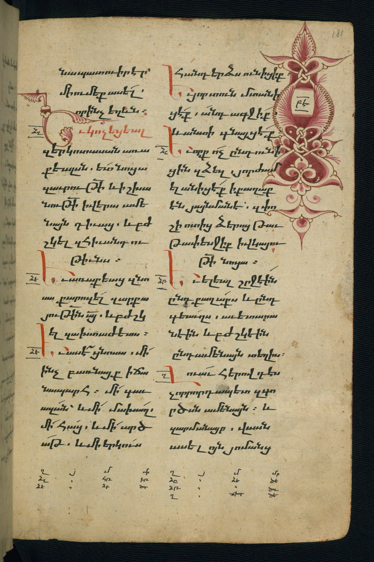 This Armenian Gospel book was produced in 904 of the Armenian era (1455 CE) at the monastery of Gamałiēl in Xizan by the scribe Yohannēs Vardapet, son of Vardan and Dilšat, and was illuminated by the priest Xačʿatur. The priest Pʿilipos commissioned the manuscript as a memorial to himself, his parents Łazar and Xutʿlumēlikʿ, and other relatives listed in the colophon on fols. 300r to 301v. Pʿilipos is depicted on fol. 14v alongside his brothers Yusēpʿ and Sultanša, as they kneel before the Virgin and Child enthroned (Theotokos). The book contains twenty-six full-page polychrome miniatures, including four Evangelist portraits; ornately designed canon tables; four decorated incipit pages; numerous marginal miniatures of floral and faunal motifs; and nineteen marginal miniatures of biblical characters or allusions to biblical narratives.