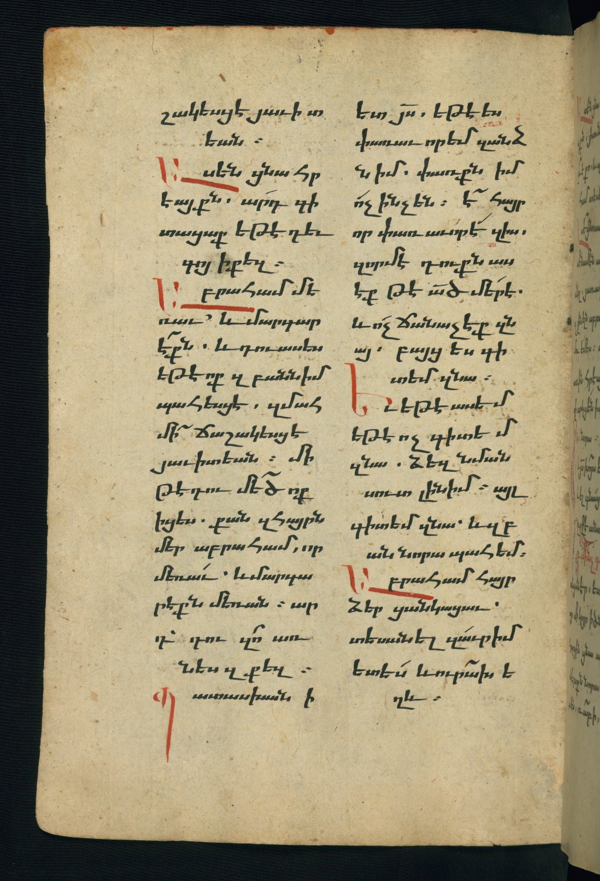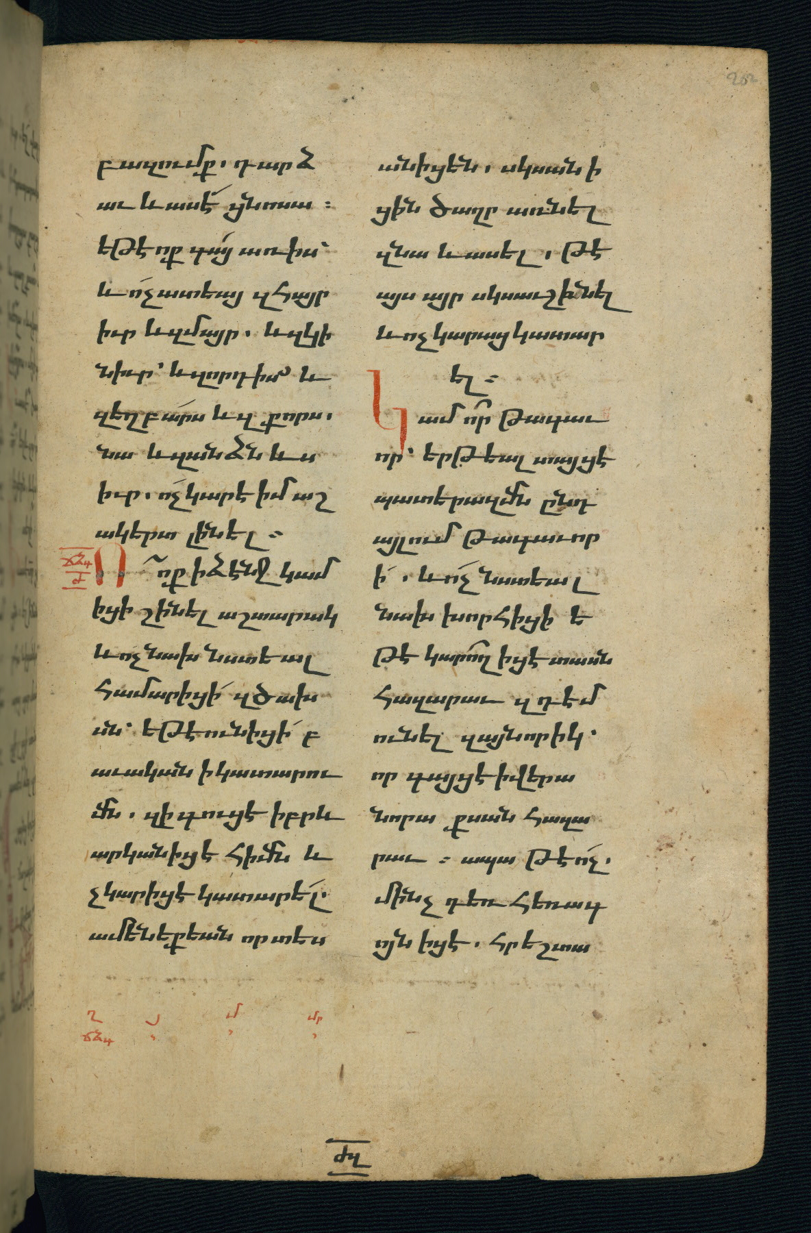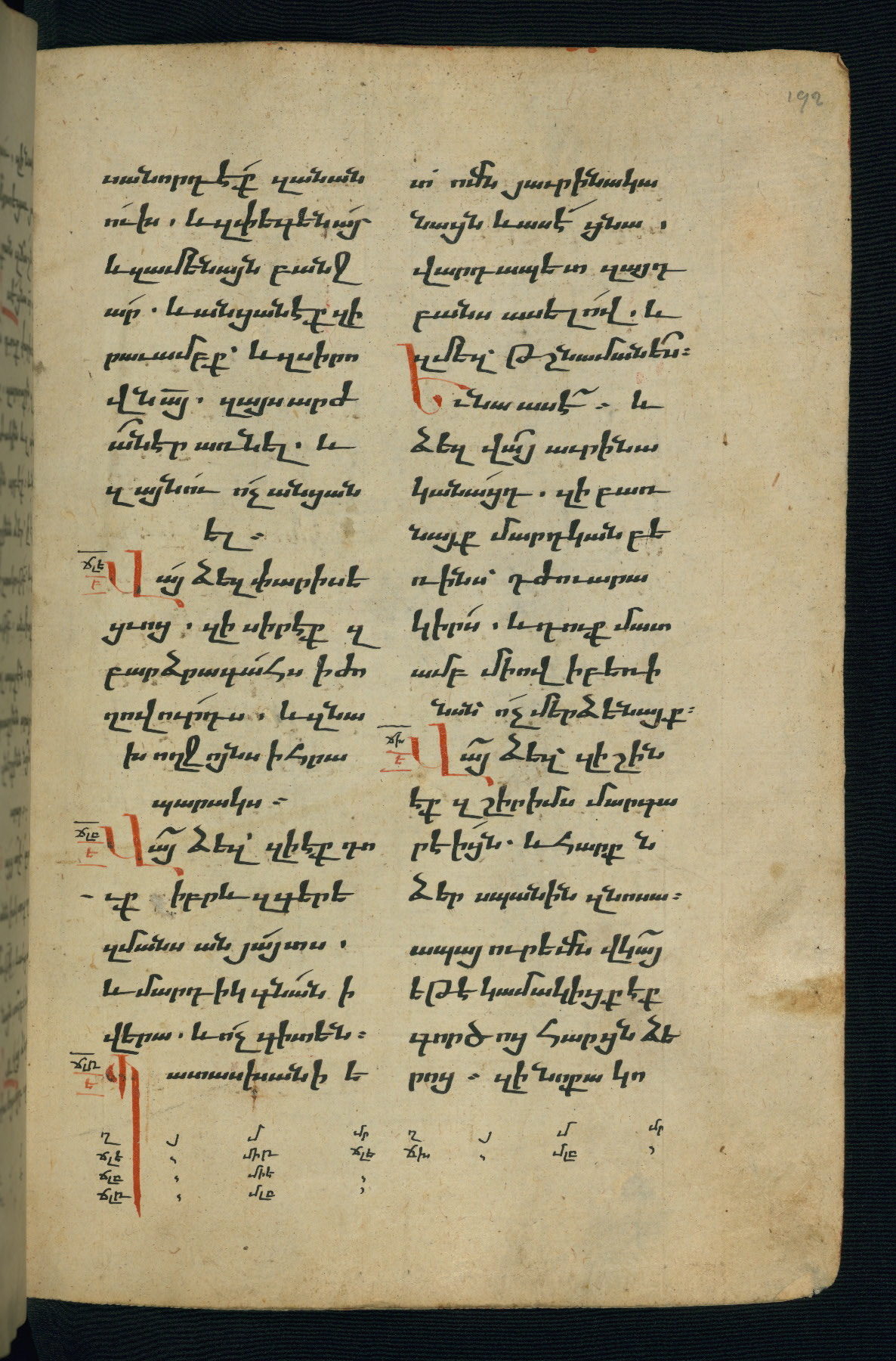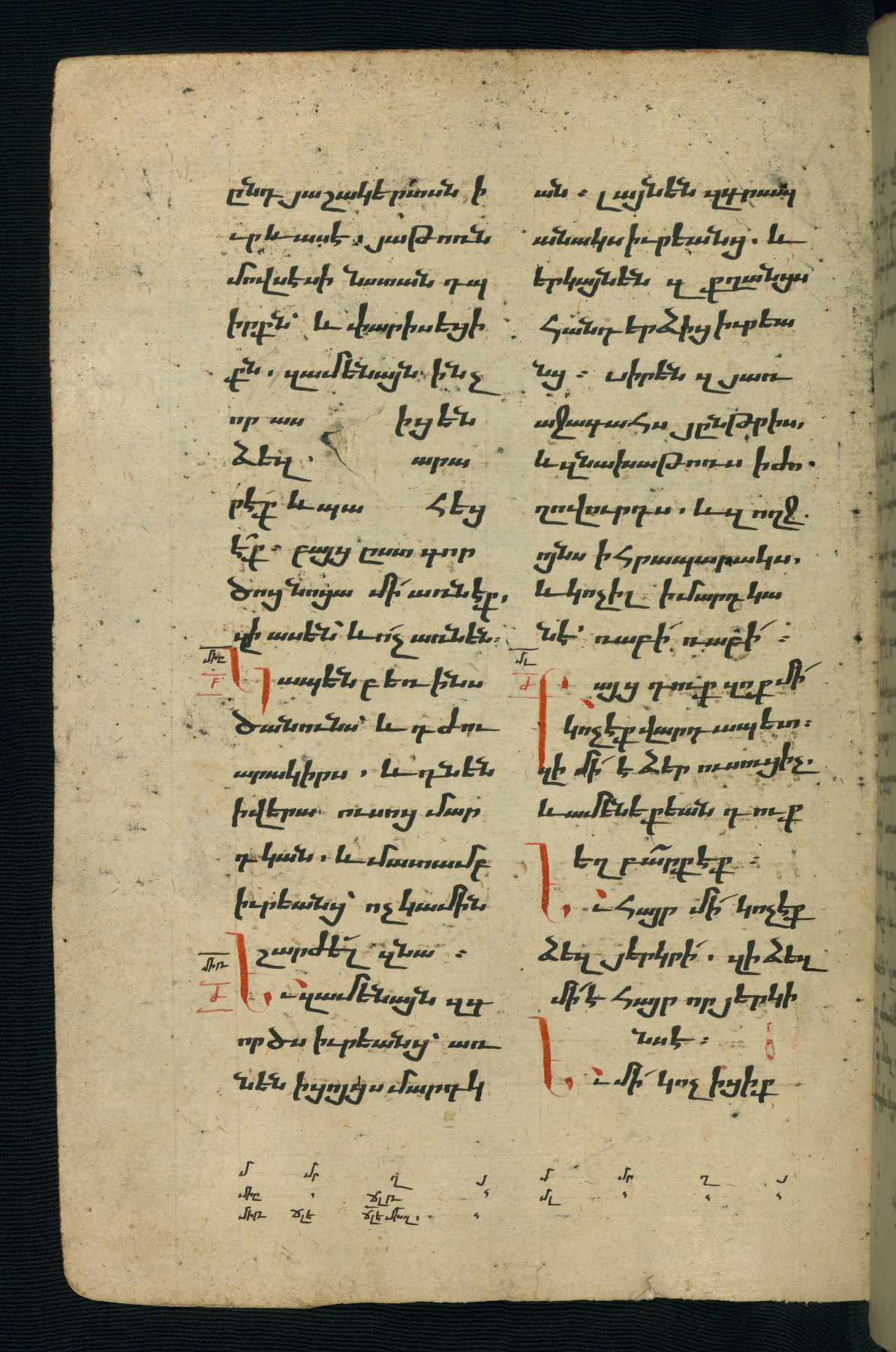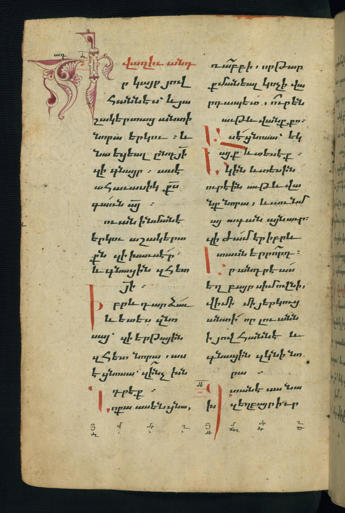 This Armenian Gospel book was produced in 904 of the Armenian era (1455 CE) at the monastery of Gamałiēl in Xizan by the scribe Yohannēs Vardapet, son of Vardan and Dilšat, and was illuminated by the priest Xačʿatur. The priest Pʿilipos commissioned the manuscript as a memorial to himself, his parents Łazar and Xutʿlumēlikʿ, and other relatives listed in the colophon on fols. 300r to 301v. Pʿilipos is depicted on fol. 14v alongside his brothers Yusēpʿ and Sultanša, as they kneel before the Virgin and Child enthroned (Theotokos). The book contains twenty-six full-page polychrome miniatures, including four Evangelist portraits; ornately designed canon tables; four decorated incipit pages; numerous marginal miniatures of floral and faunal motifs; and nineteen marginal miniatures of biblical characters or allusions to biblical narratives.