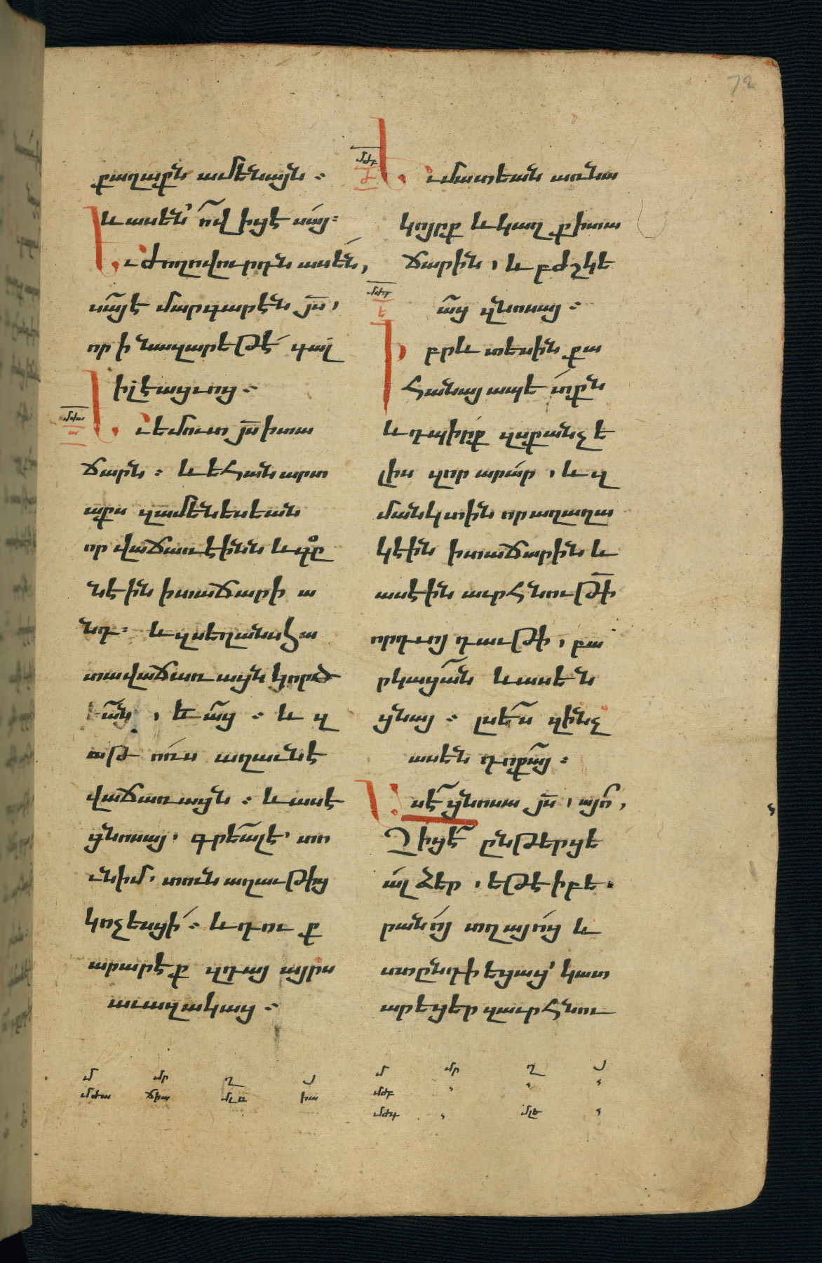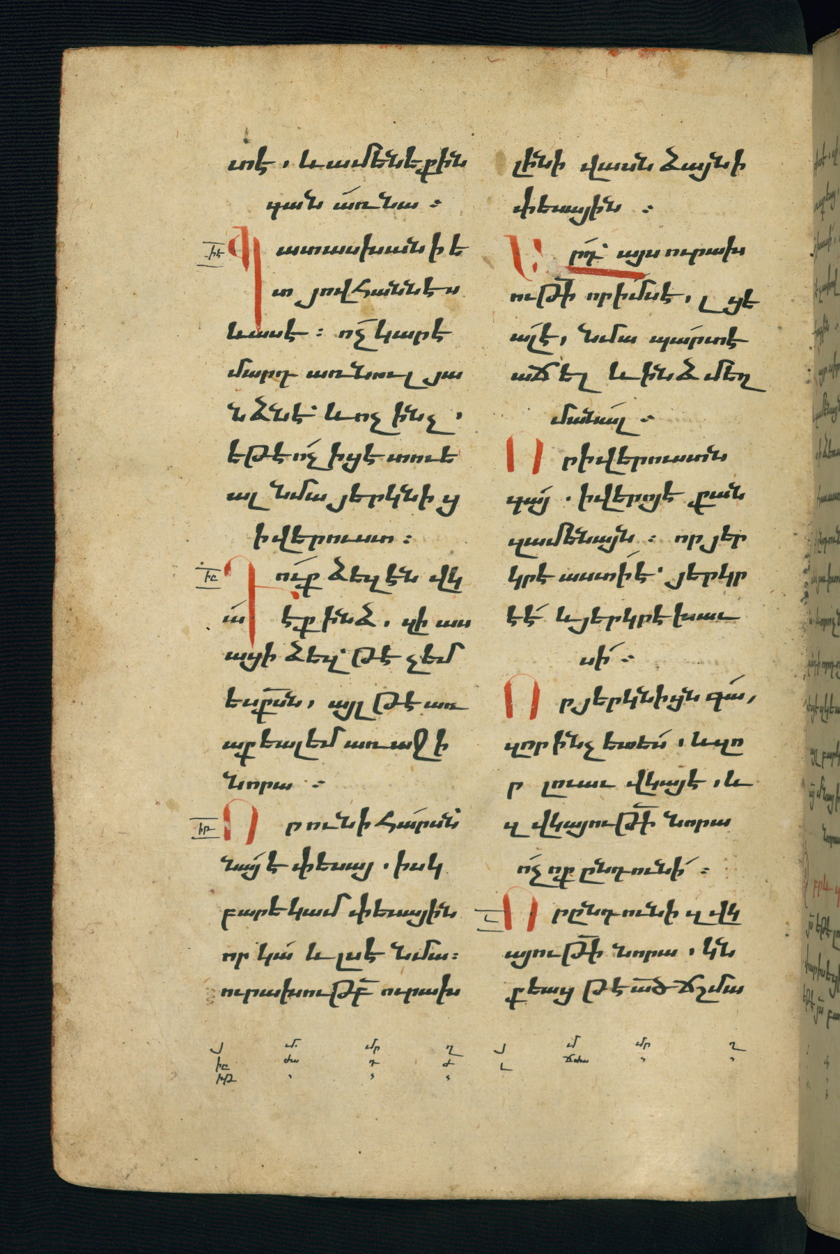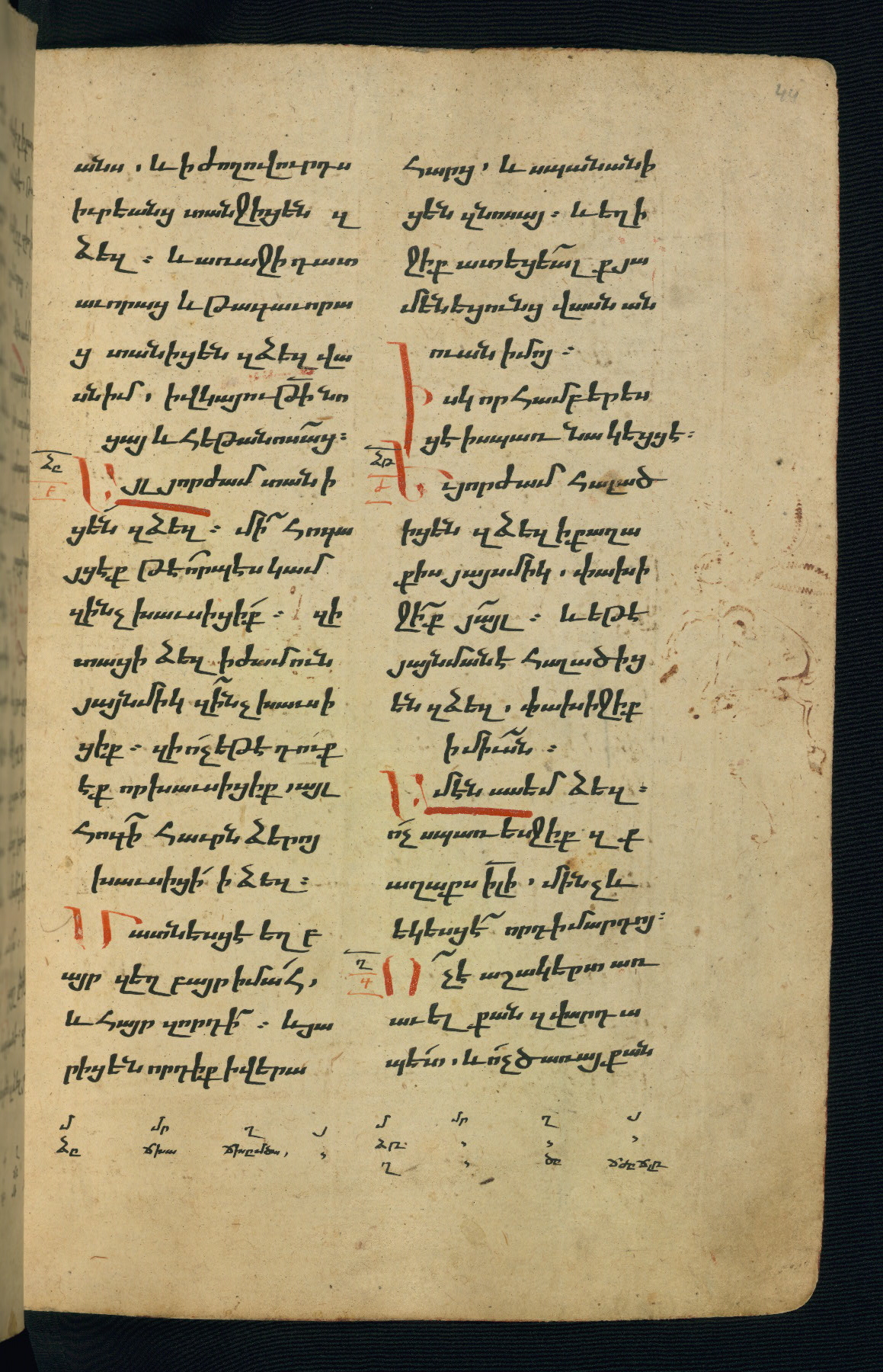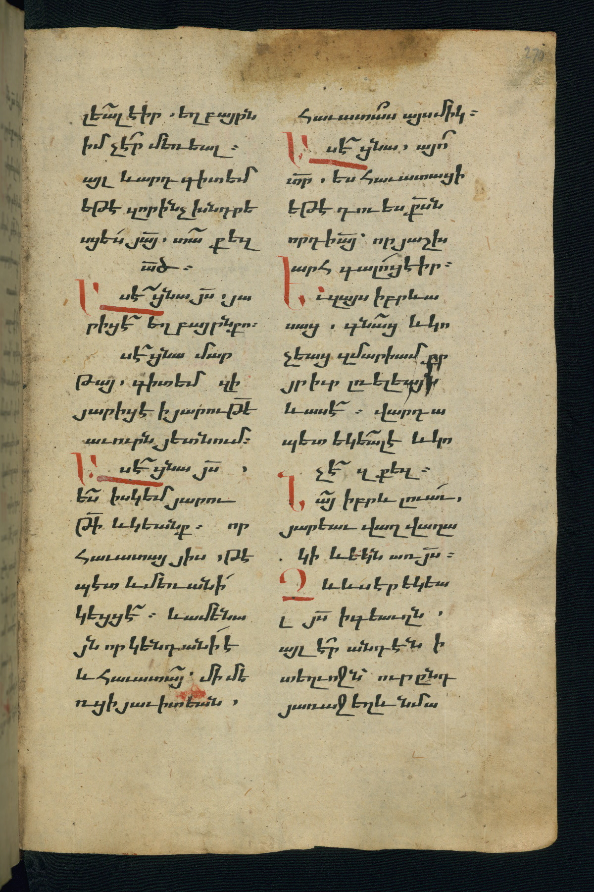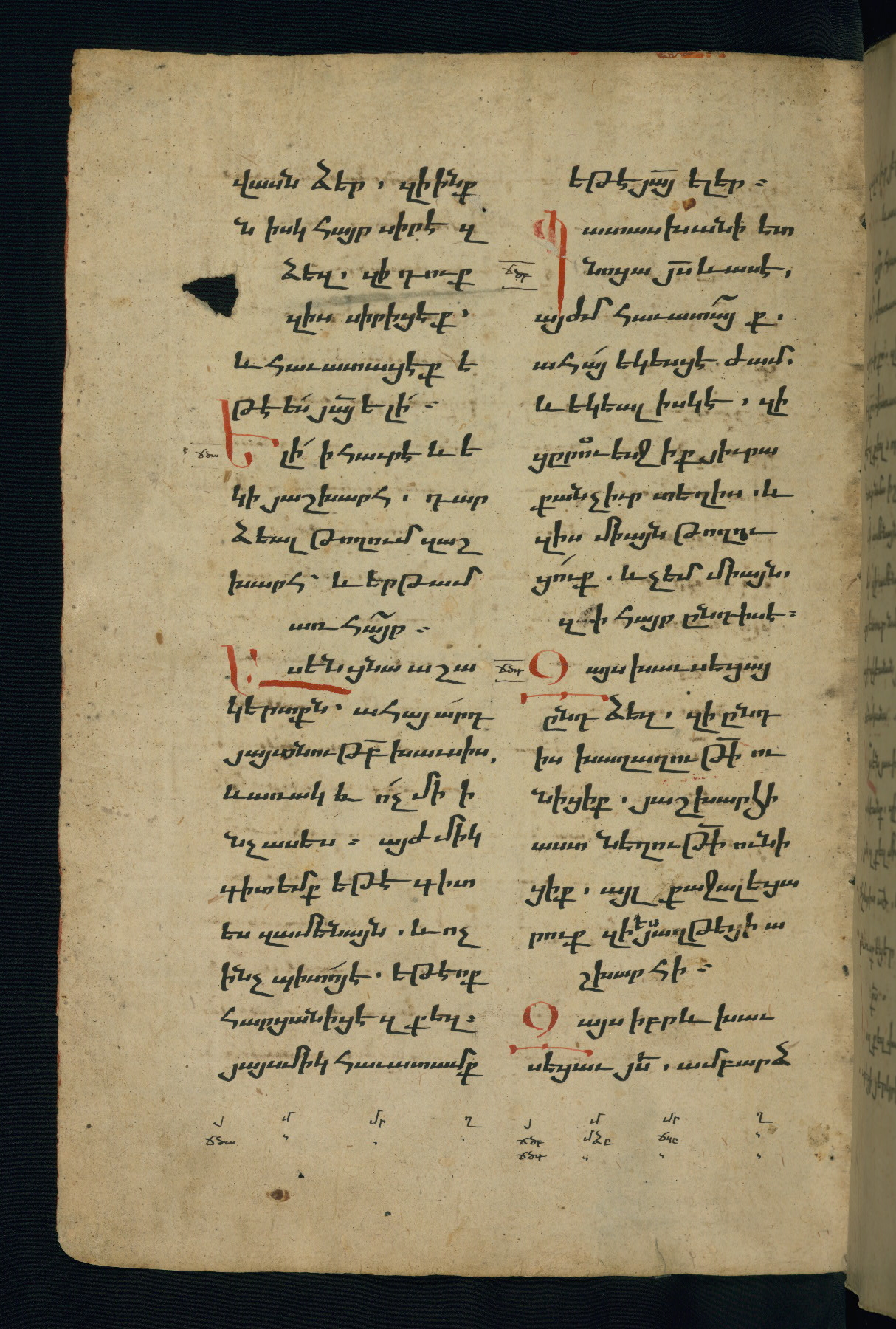 This Armenian Gospel book was produced in 904 of the Armenian era (1455 CE) at the monastery of Gamałiēl in Xizan by the scribe Yohannēs Vardapet, son of Vardan and Dilšat, and was illuminated by the priest Xačʿatur. The priest Pʿilipos commissioned the manuscript as a memorial to himself, his parents Łazar and Xutʿlumēlikʿ, and other relatives listed in the colophon on fols. 300r to 301v. Pʿilipos is depicted on fol. 14v alongside his brothers Yusēpʿ and Sultanša, as they kneel before the Virgin and Child enthroned (Theotokos). The book contains twenty-six full-page polychrome miniatures, including four Evangelist portraits; ornately designed canon tables; four decorated incipit pages; numerous marginal miniatures of floral and faunal motifs; and nineteen marginal miniatures of biblical characters or allusions to biblical narratives.