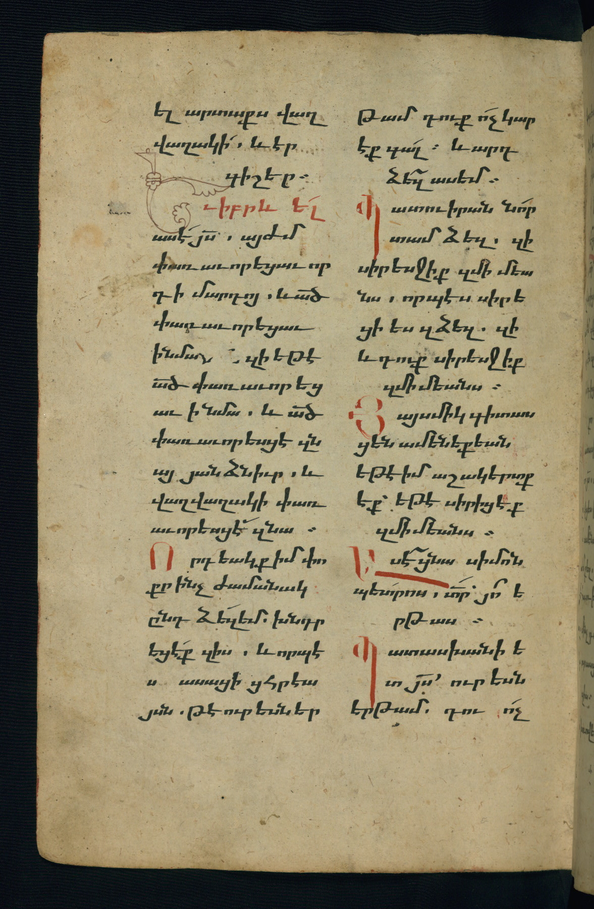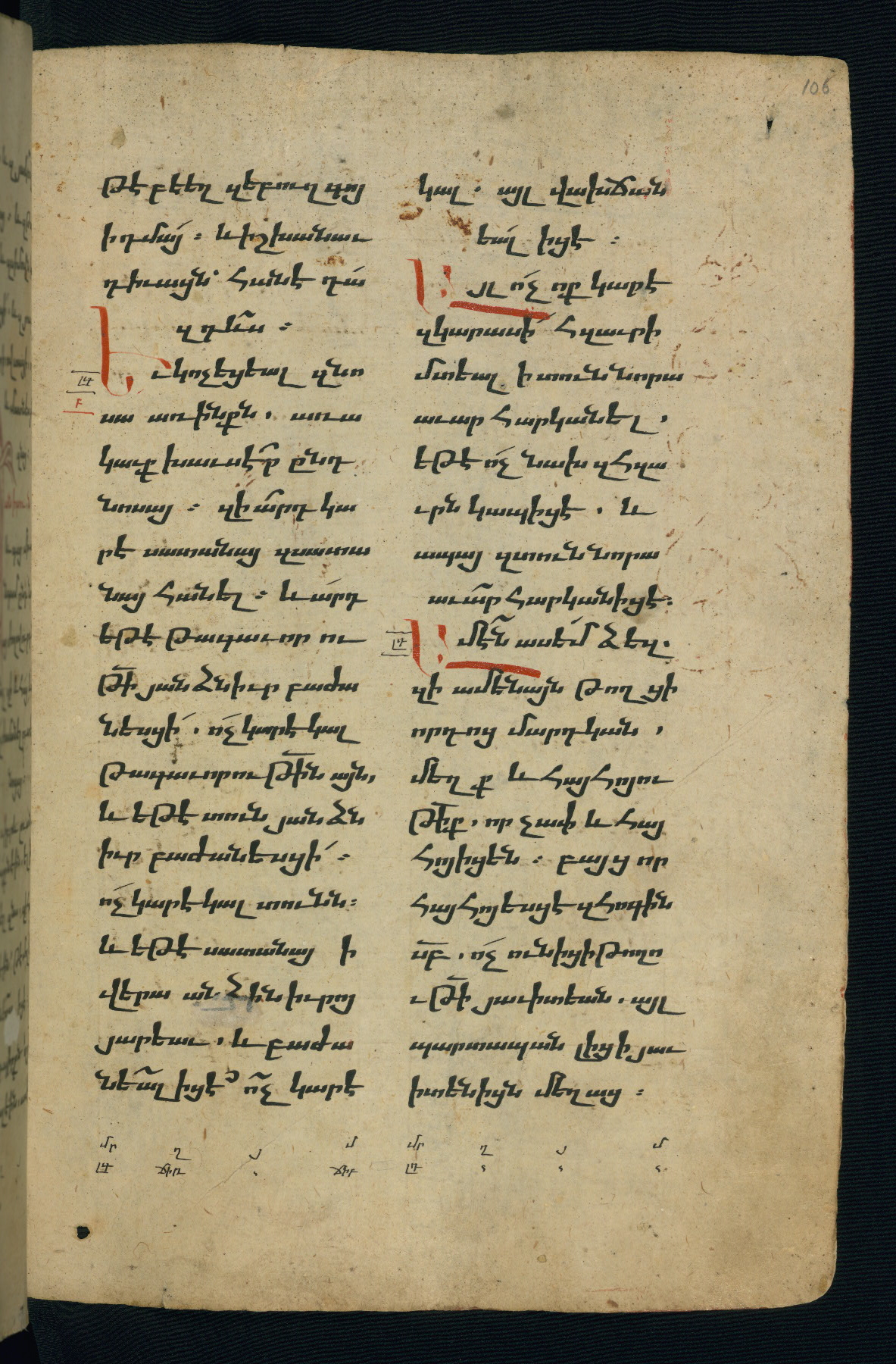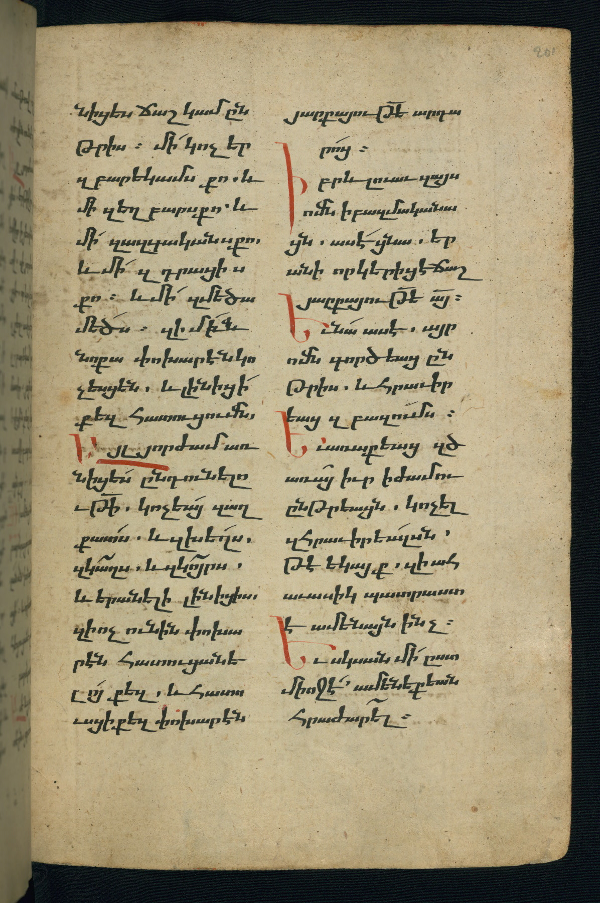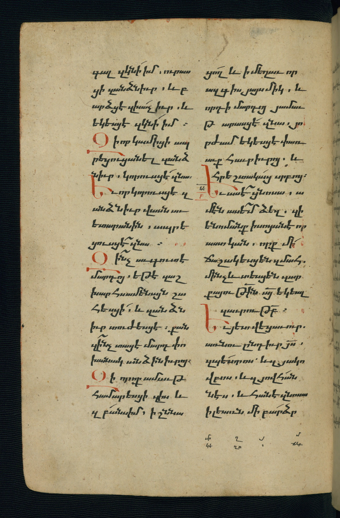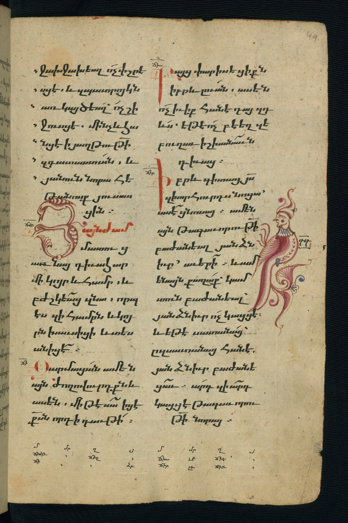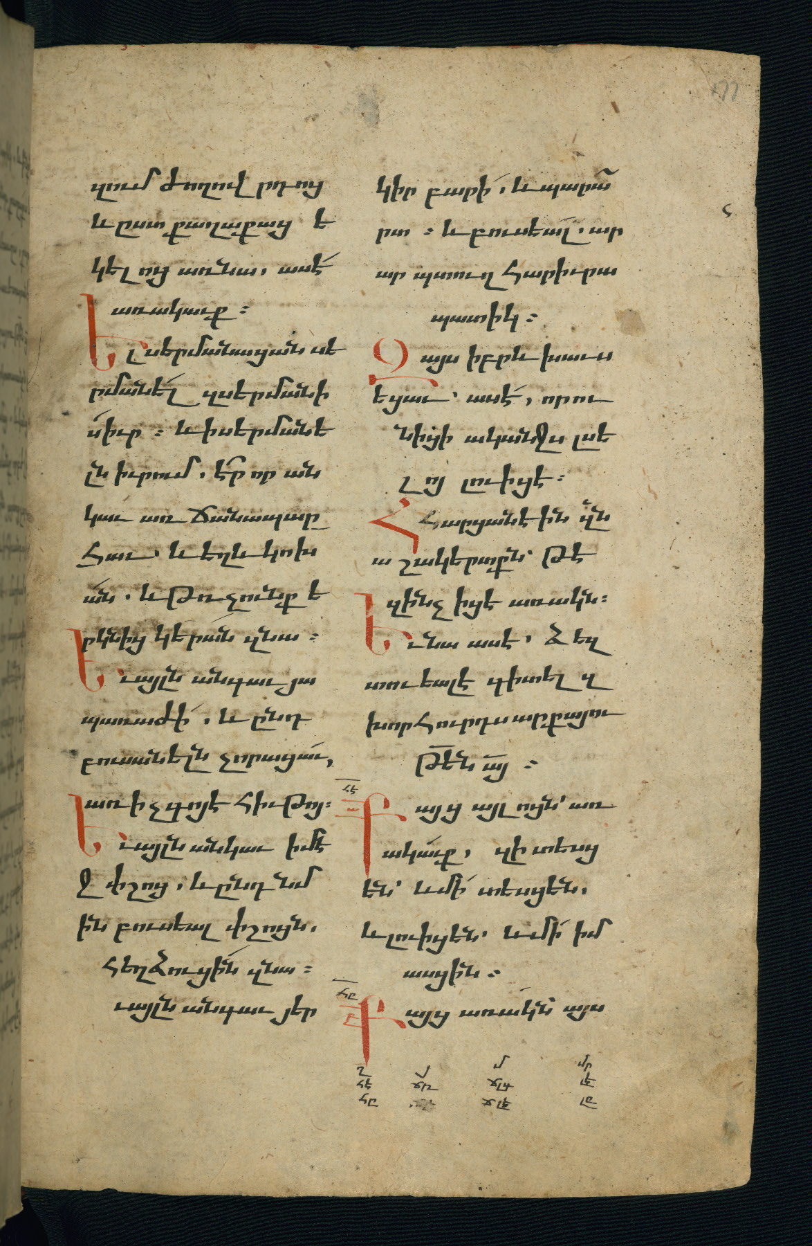 This Armenian Gospel book was produced in 904 of the Armenian era (1455 CE) at the monastery of Gamałiēl in Xizan by the scribe Yohannēs Vardapet, son of Vardan and Dilšat, and was illuminated by the priest Xačʿatur. The priest Pʿilipos commissioned the manuscript as a memorial to himself, his parents Łazar and Xutʿlumēlikʿ, and other relatives listed in the colophon on fols. 300r to 301v. Pʿilipos is depicted on fol. 14v alongside his brothers Yusēpʿ and Sultanša, as they kneel before the Virgin and Child enthroned (Theotokos). The book contains twenty-six full-page polychrome miniatures, including four Evangelist portraits; ornately designed canon tables; four decorated incipit pages; numerous marginal miniatures of floral and faunal motifs; and nineteen marginal miniatures of biblical characters or allusions to biblical narratives.